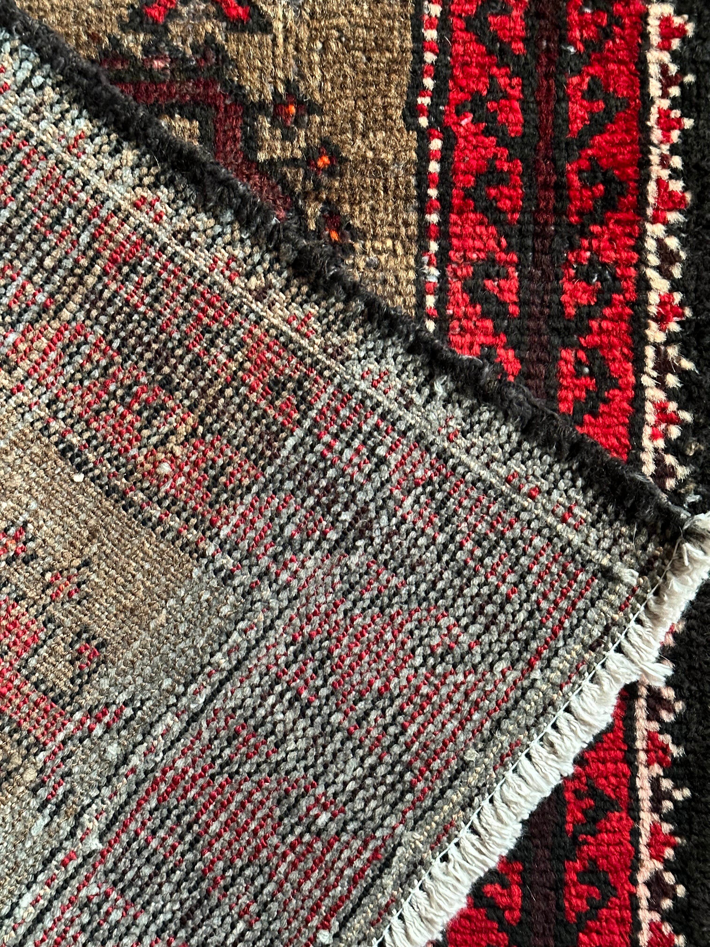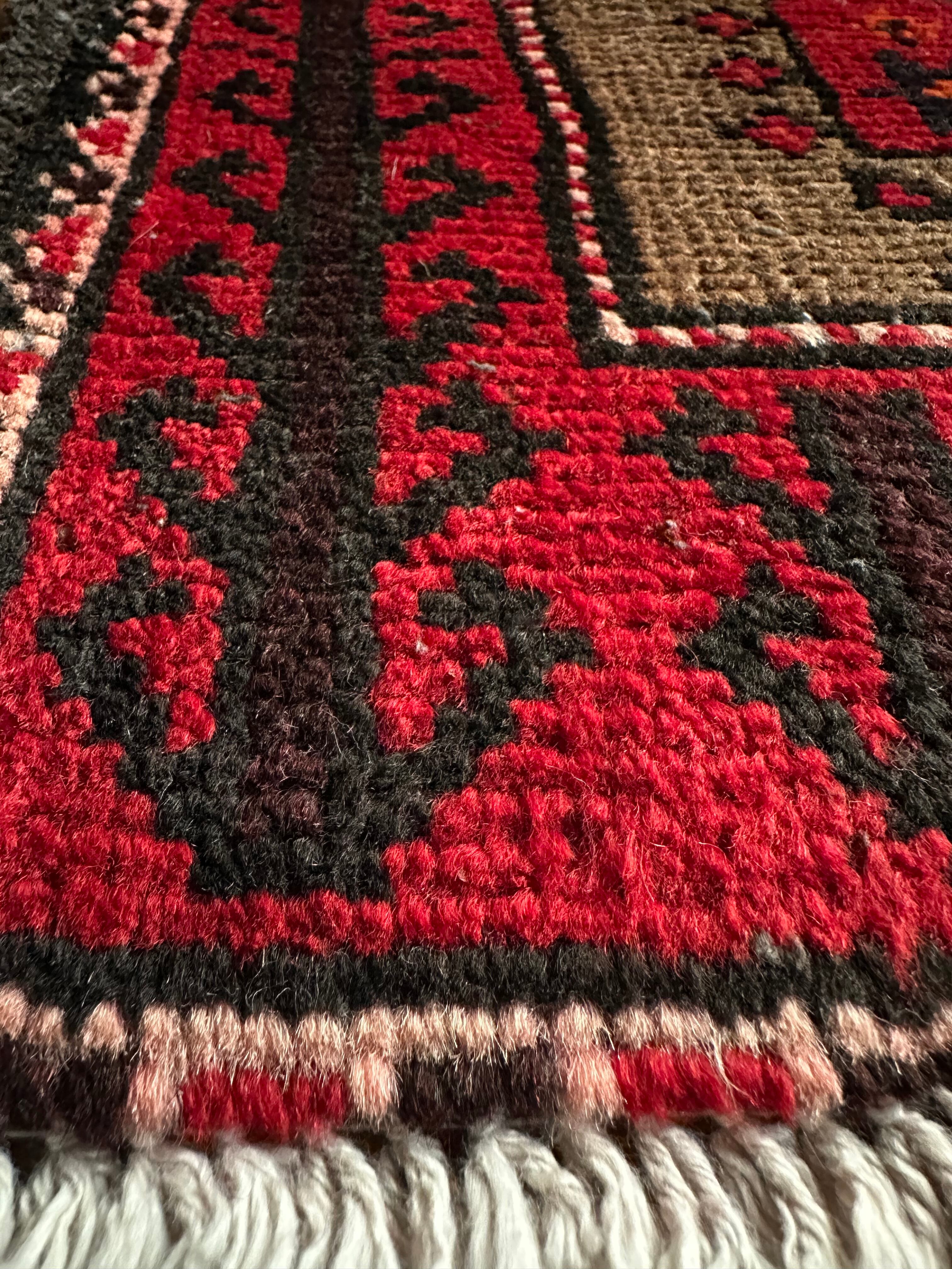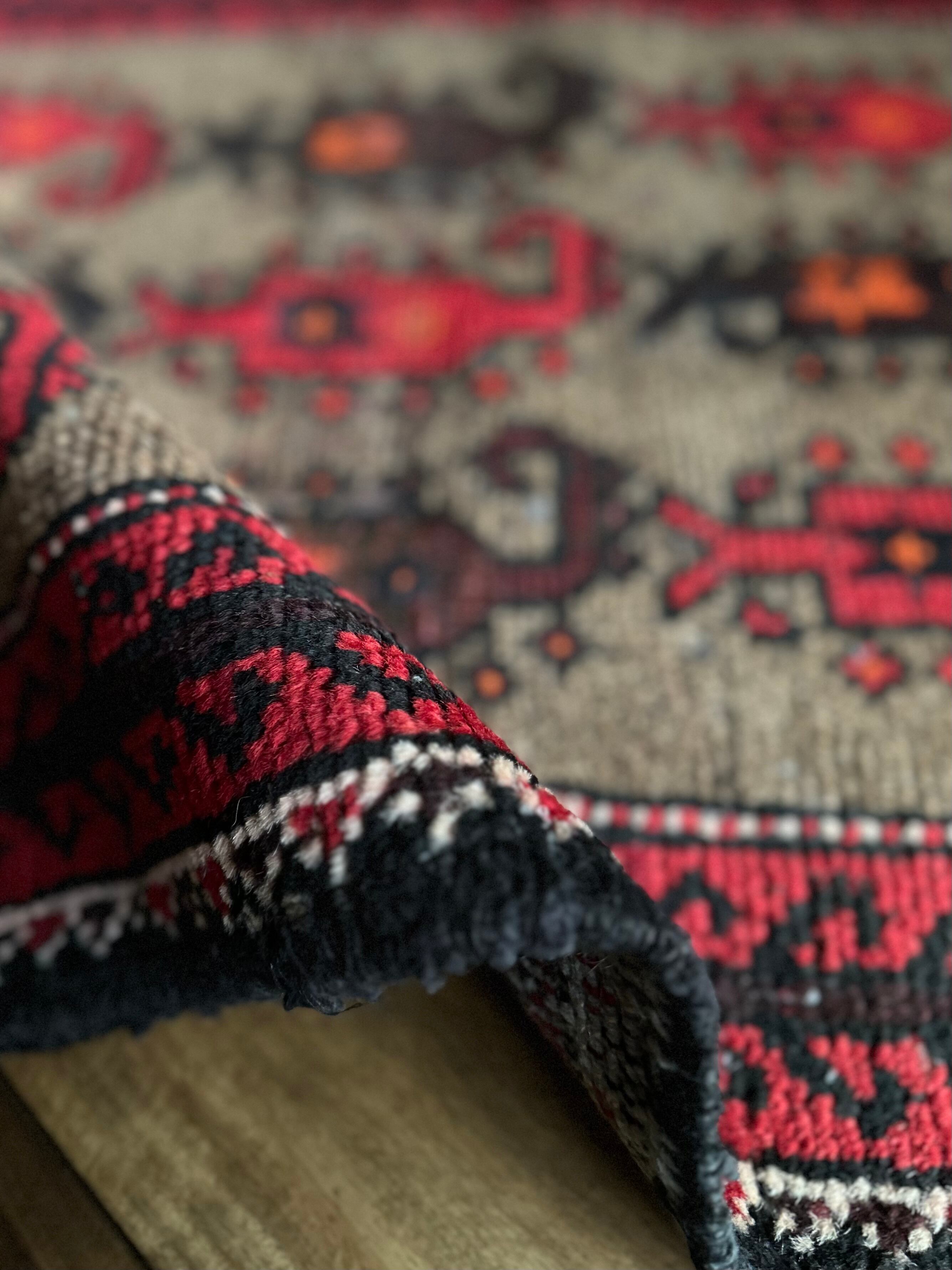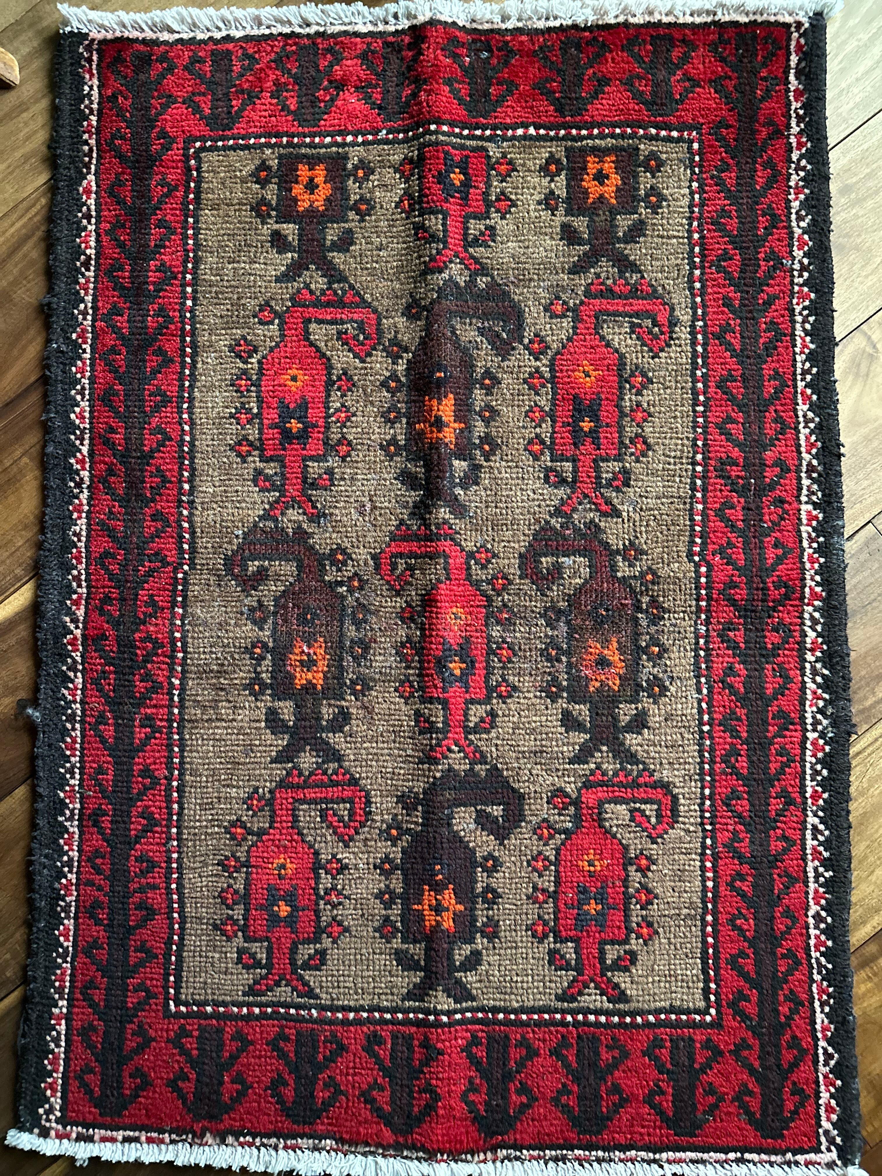 アフガン系のバルーチに見られる重厚さとは裏腹に、幼なげな印象が残るヴィレッジラグでしょうか、玄関マットに最適なサイズ感で毛足の短さもそれに適しています。
