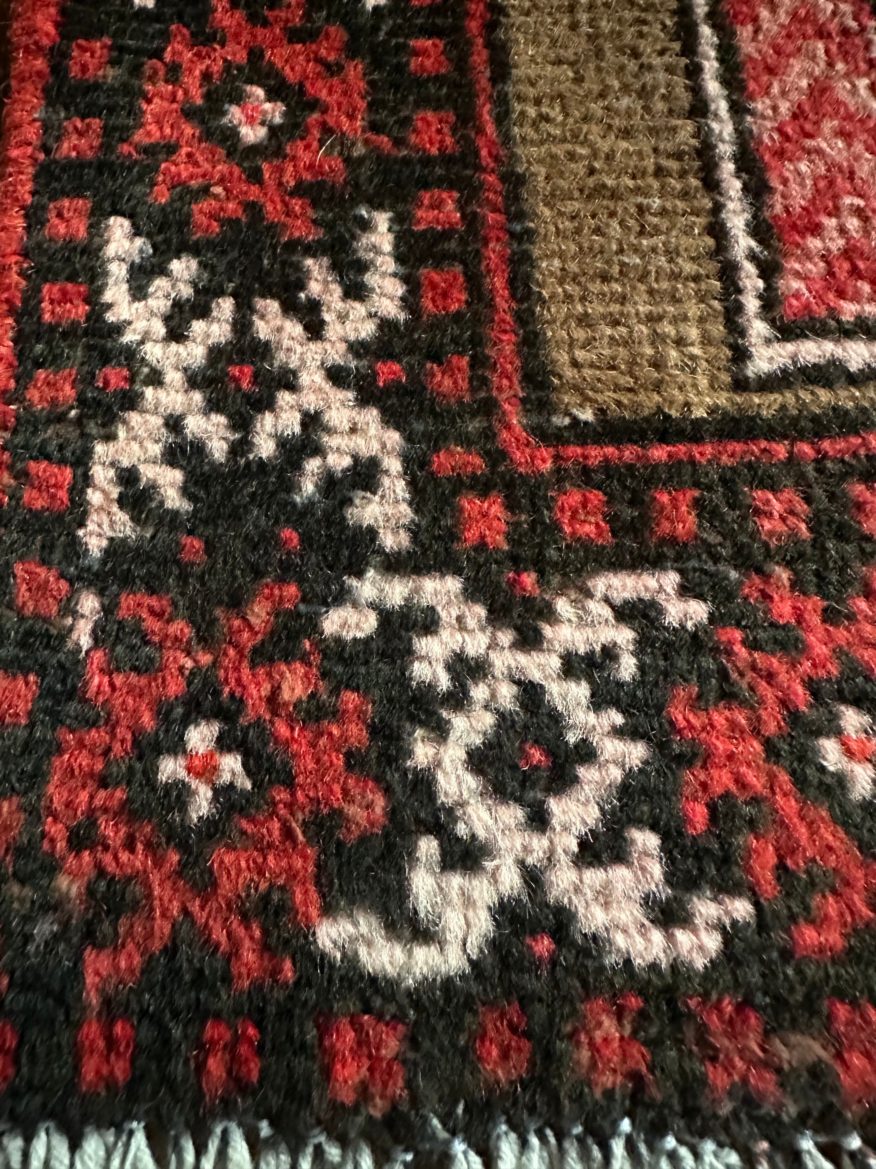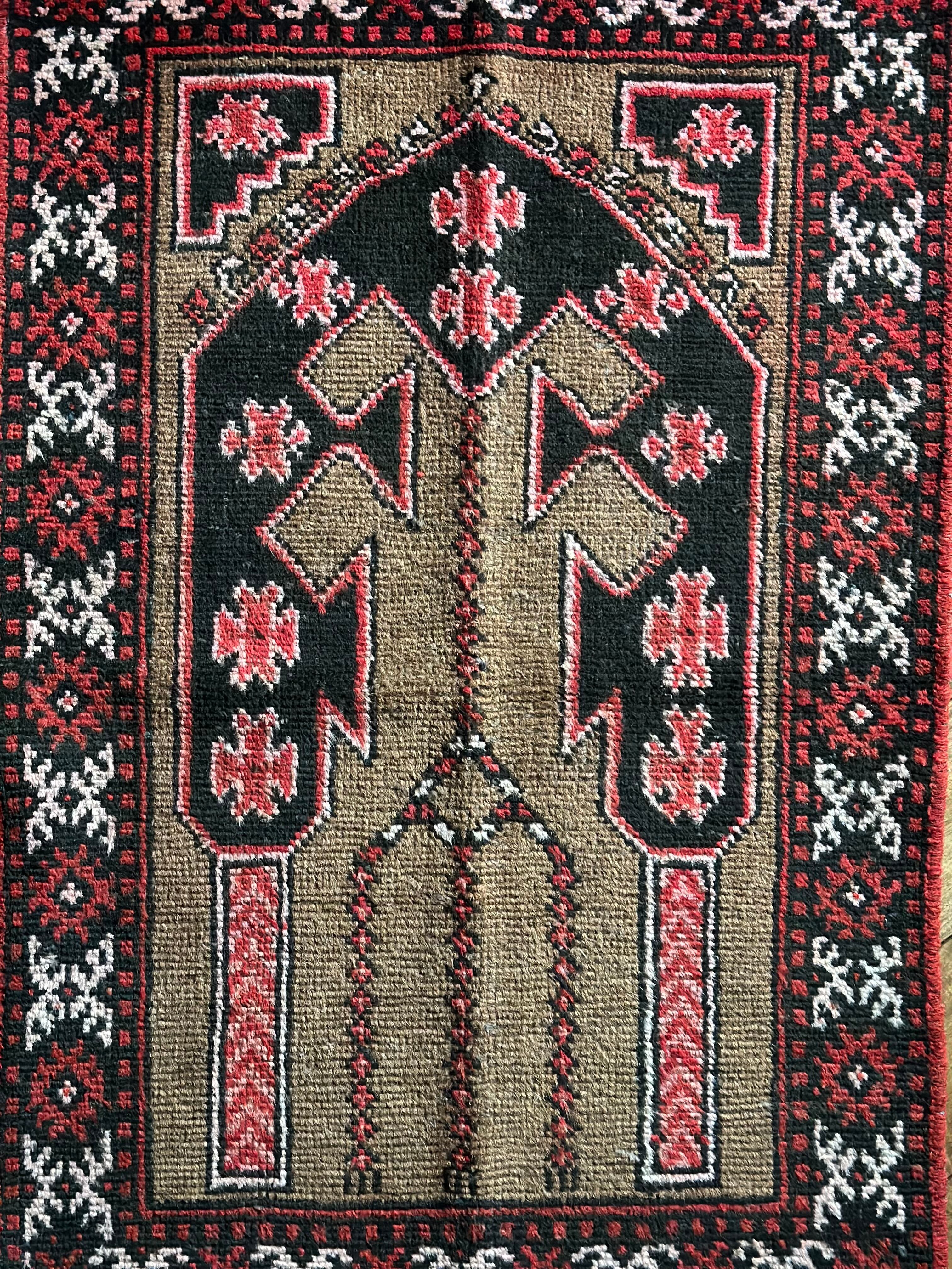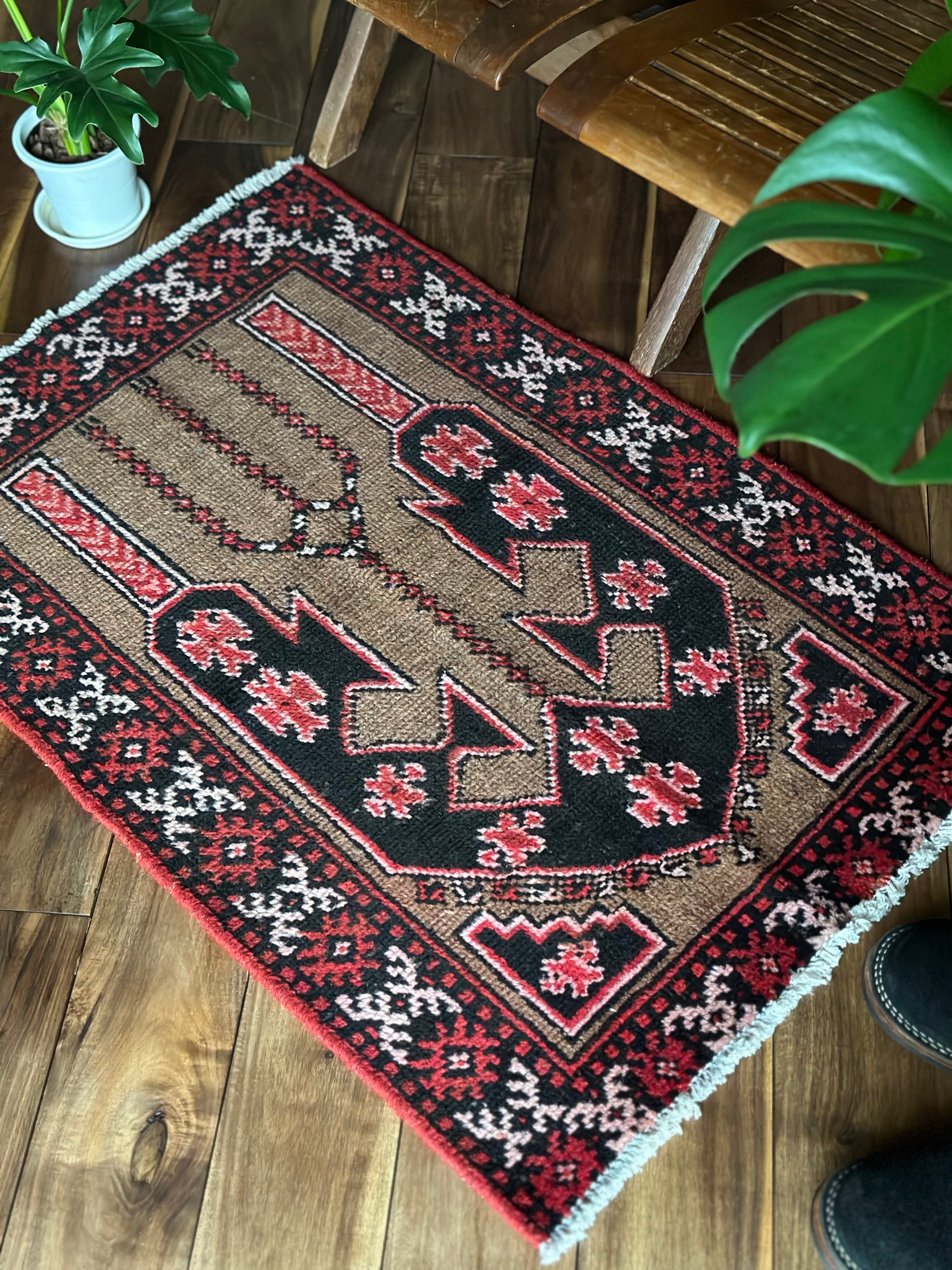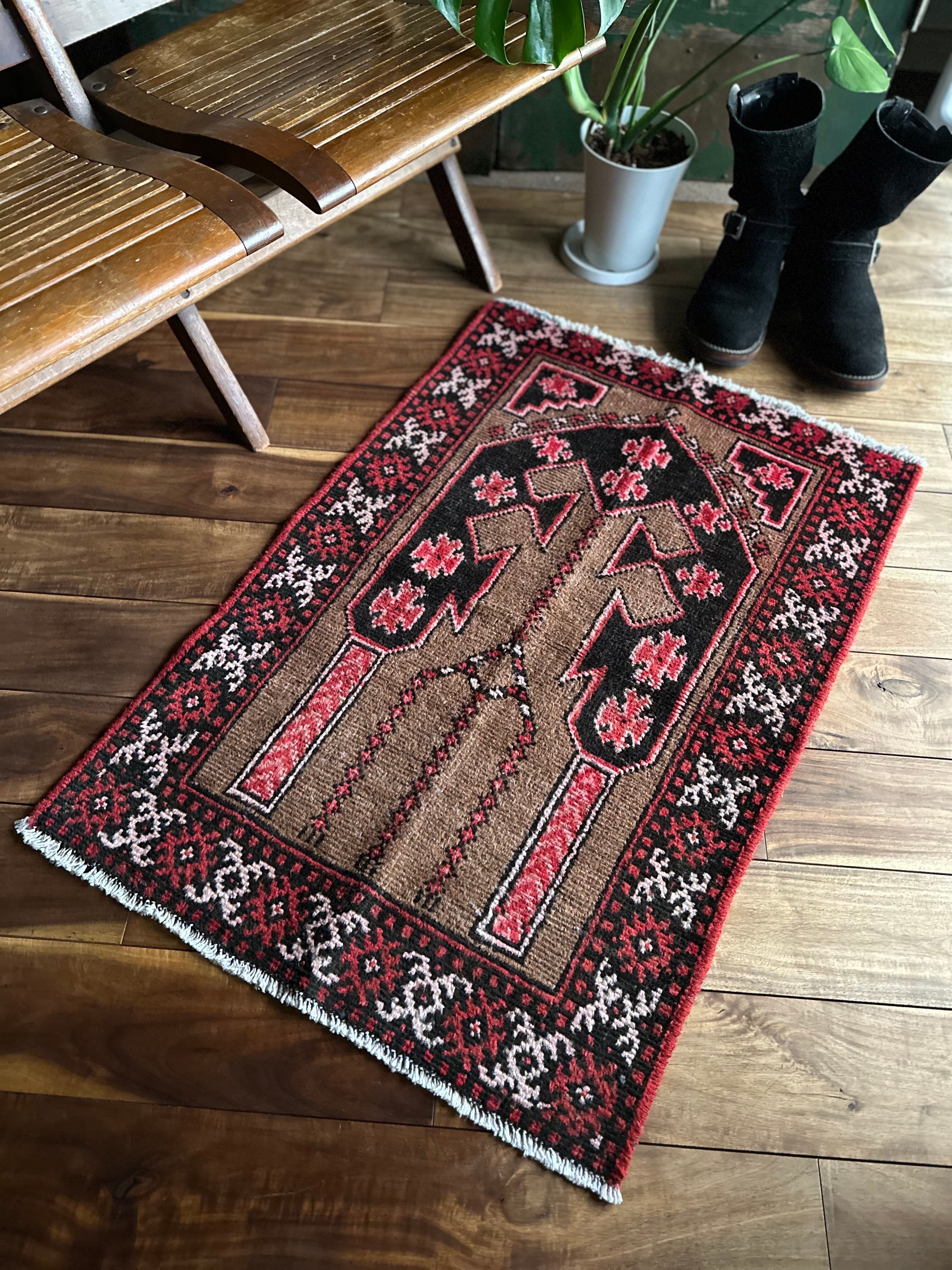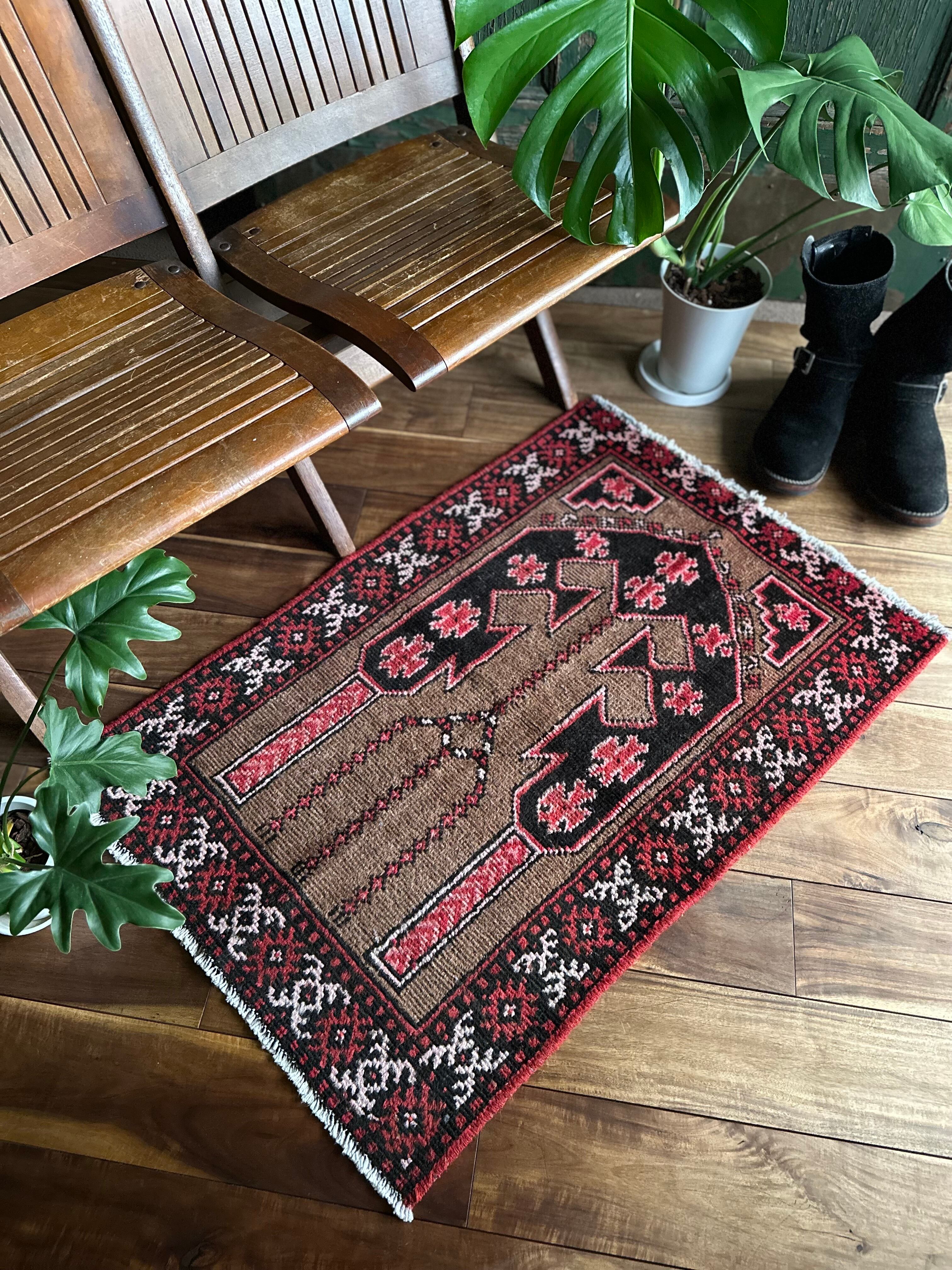 アフガン系のバルーチに見られる重厚さとは裏腹に、幼なげな印象が残るヴィレッジラグでしょうか、玄関マットに最適なサイズ感で毛足の短さもそれに適しています。