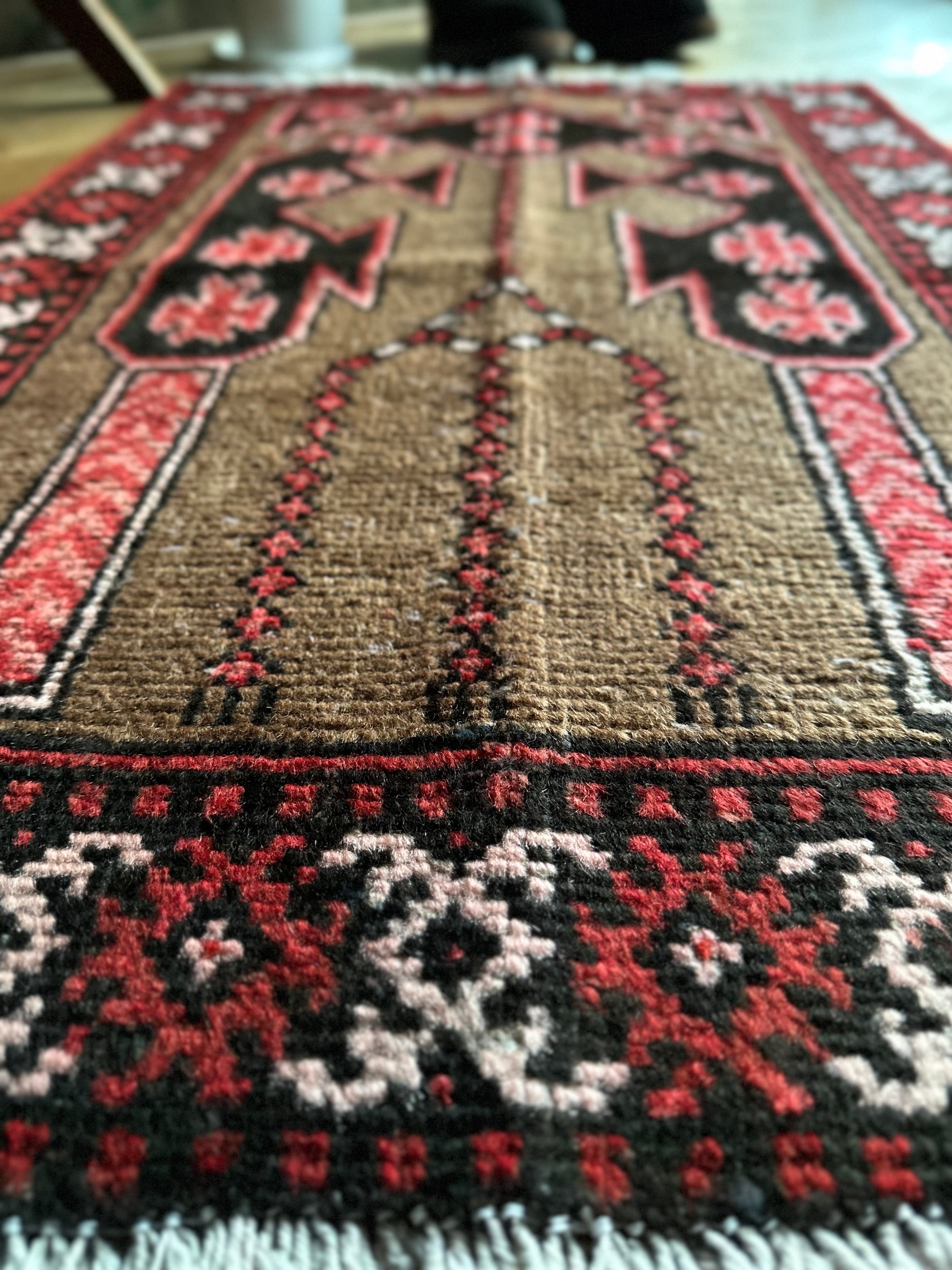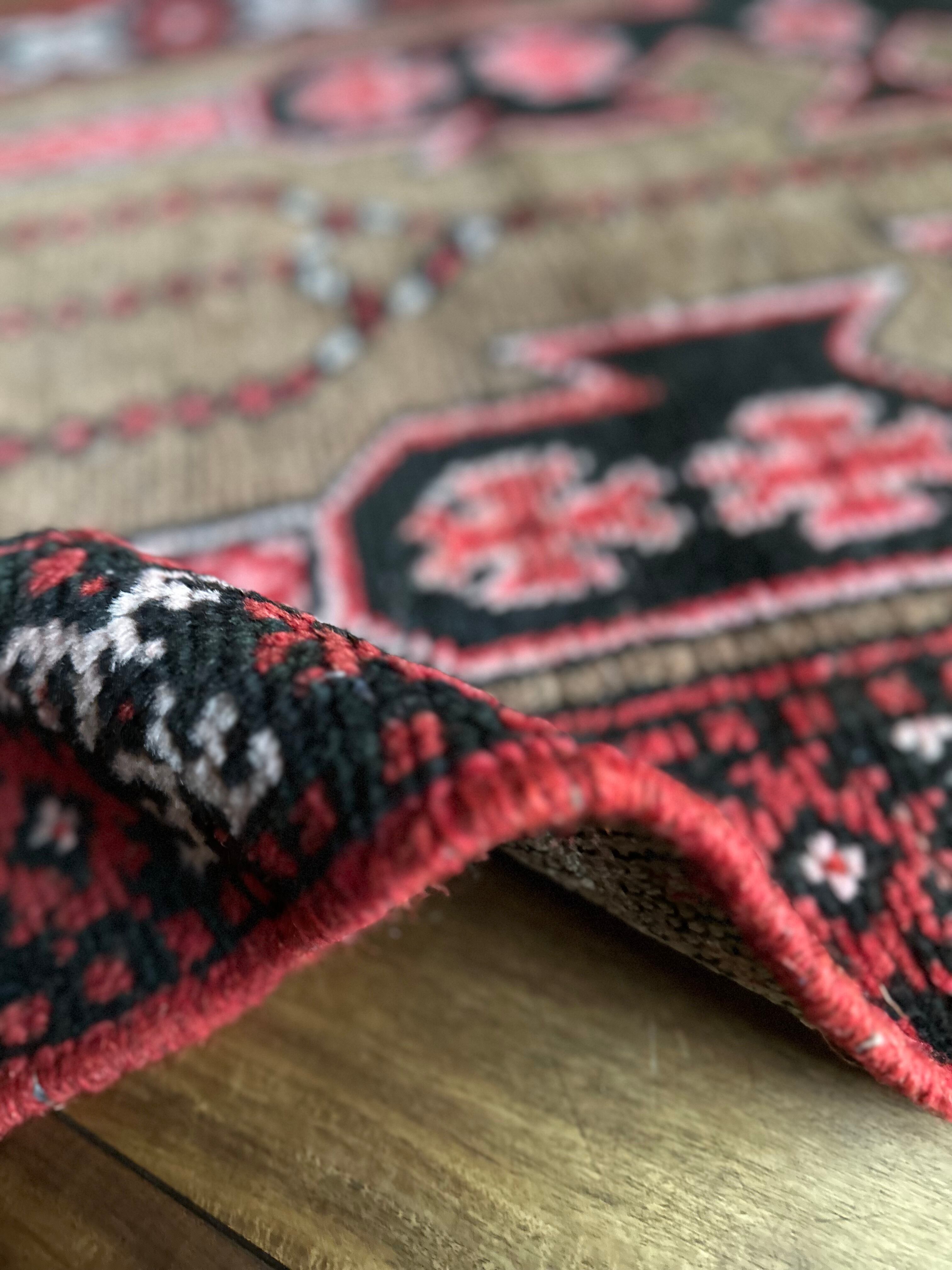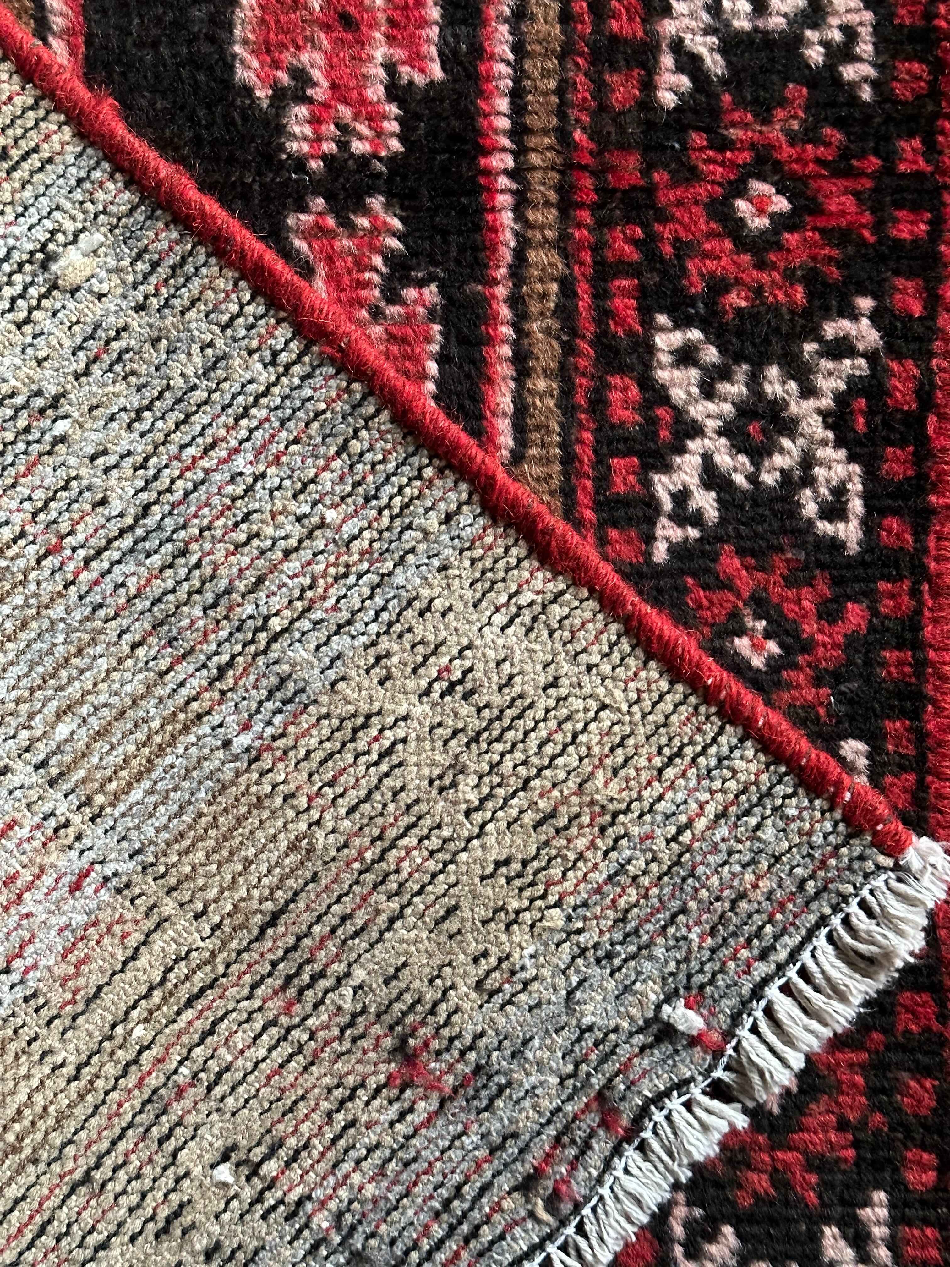 シンボリックでどこか愛らしい雰囲気の絵柄が印象的で、赤×黒×ブラウンという配色がカッコいいバルーチ系統のトライバルラグになります。