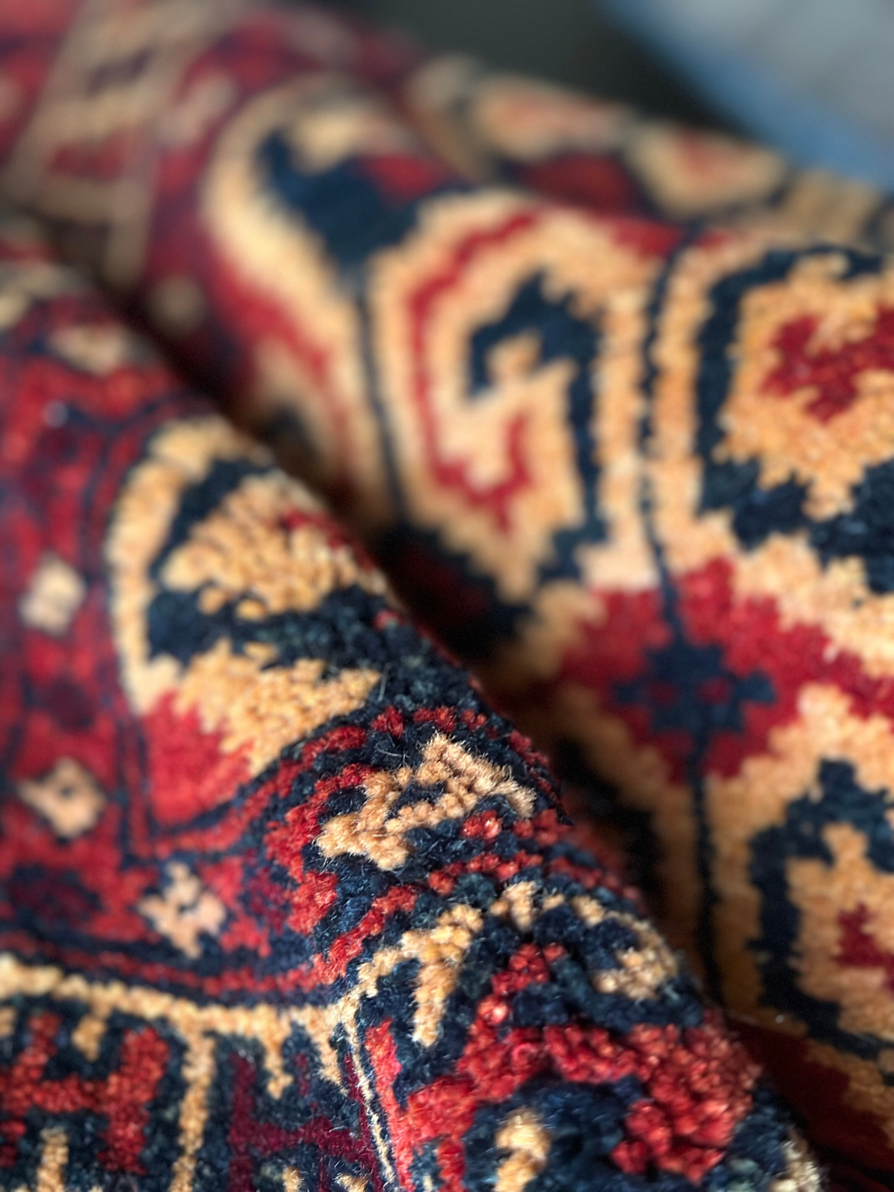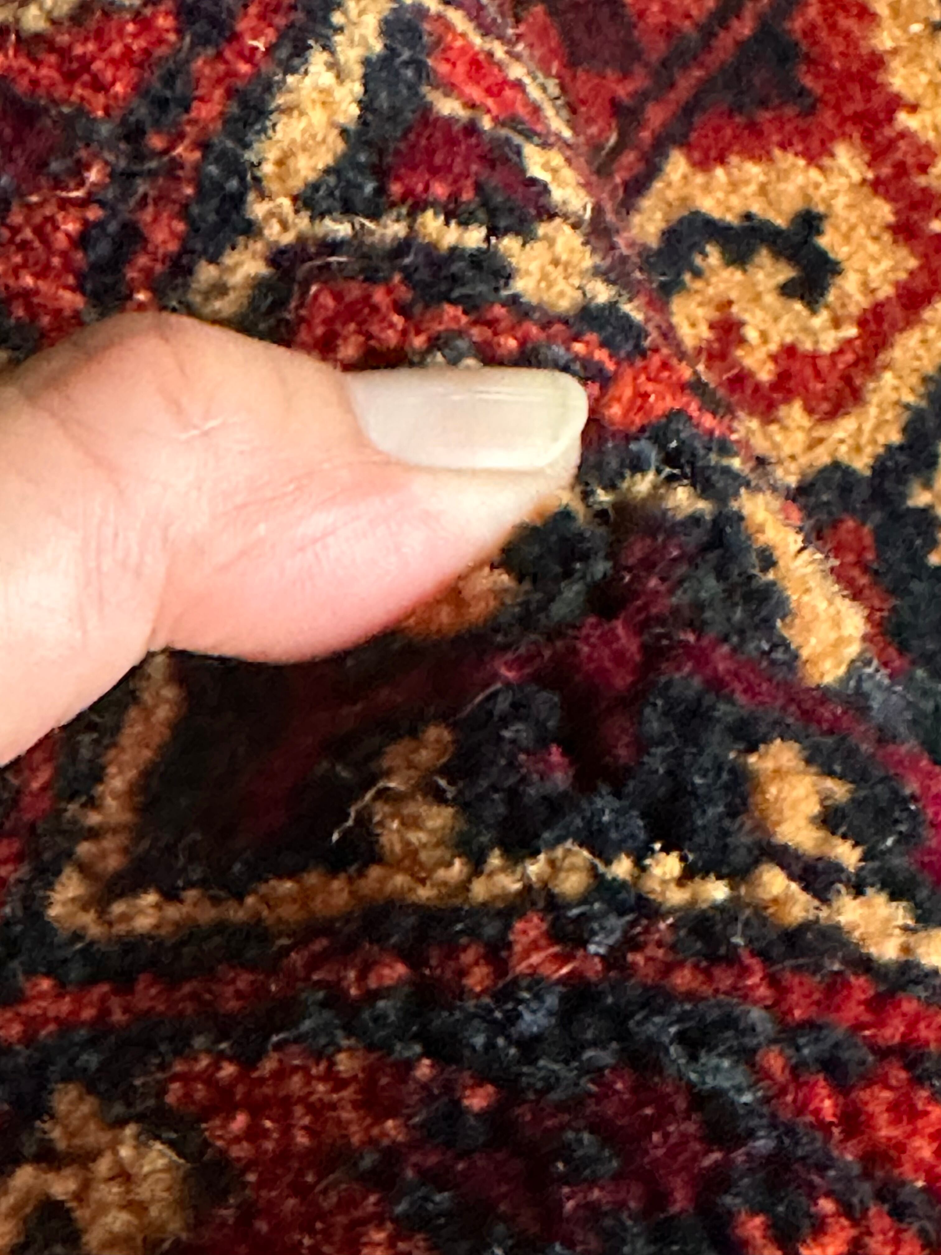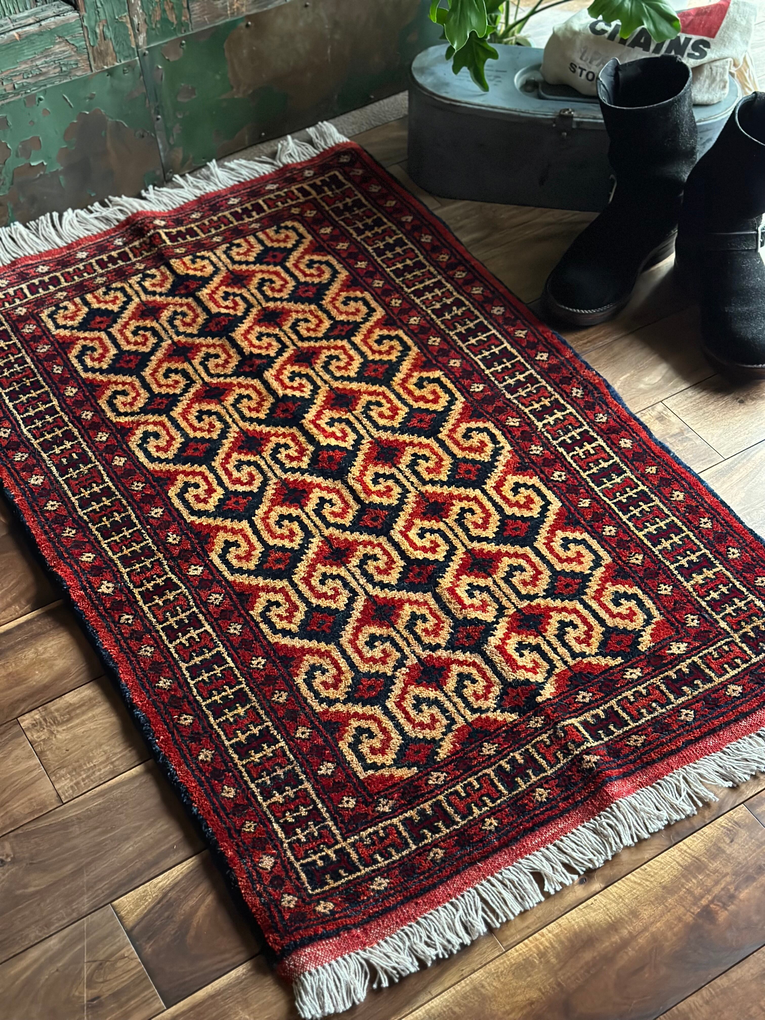 パイルの長さは充分なほどに、全体的なしなやかさもあり素足に心地よいこと間違いなし。特にリペアした箇所もなくパイル抜けなどもありませんが、色見に関しては写真では難しく赤よりもレンガ色に近いでしょうか。