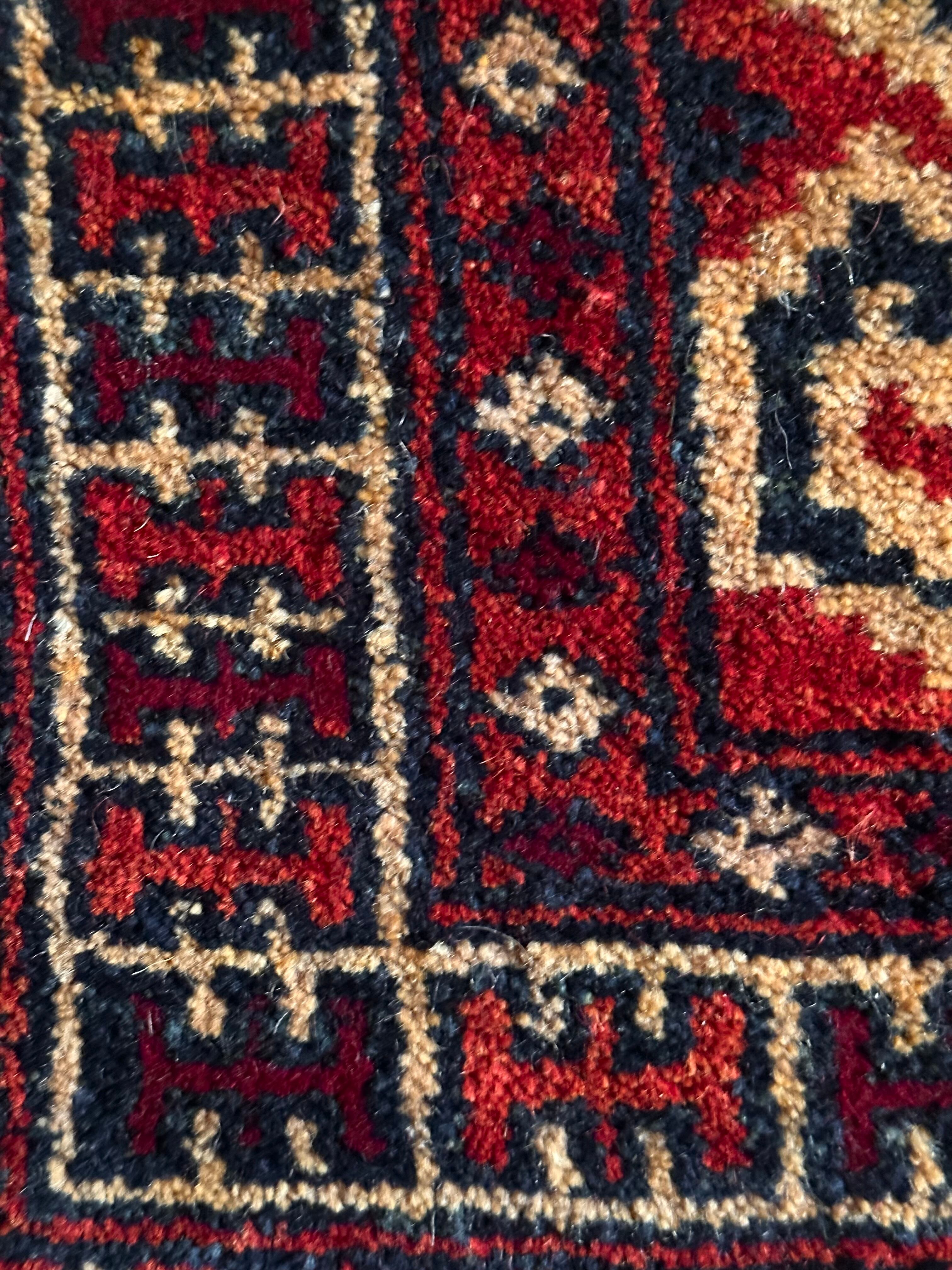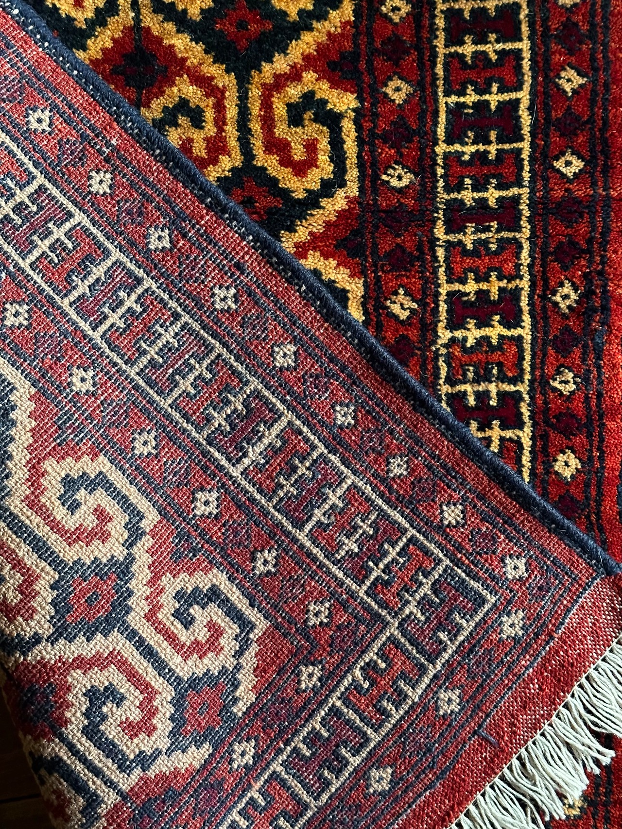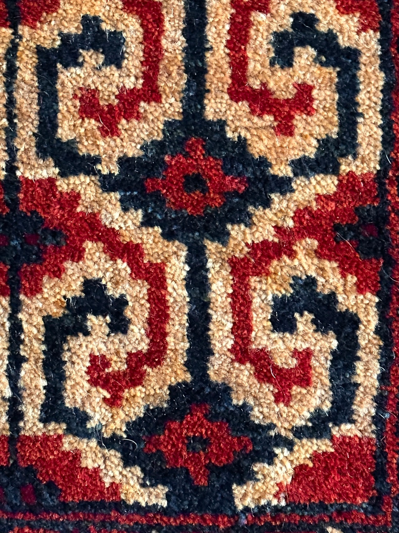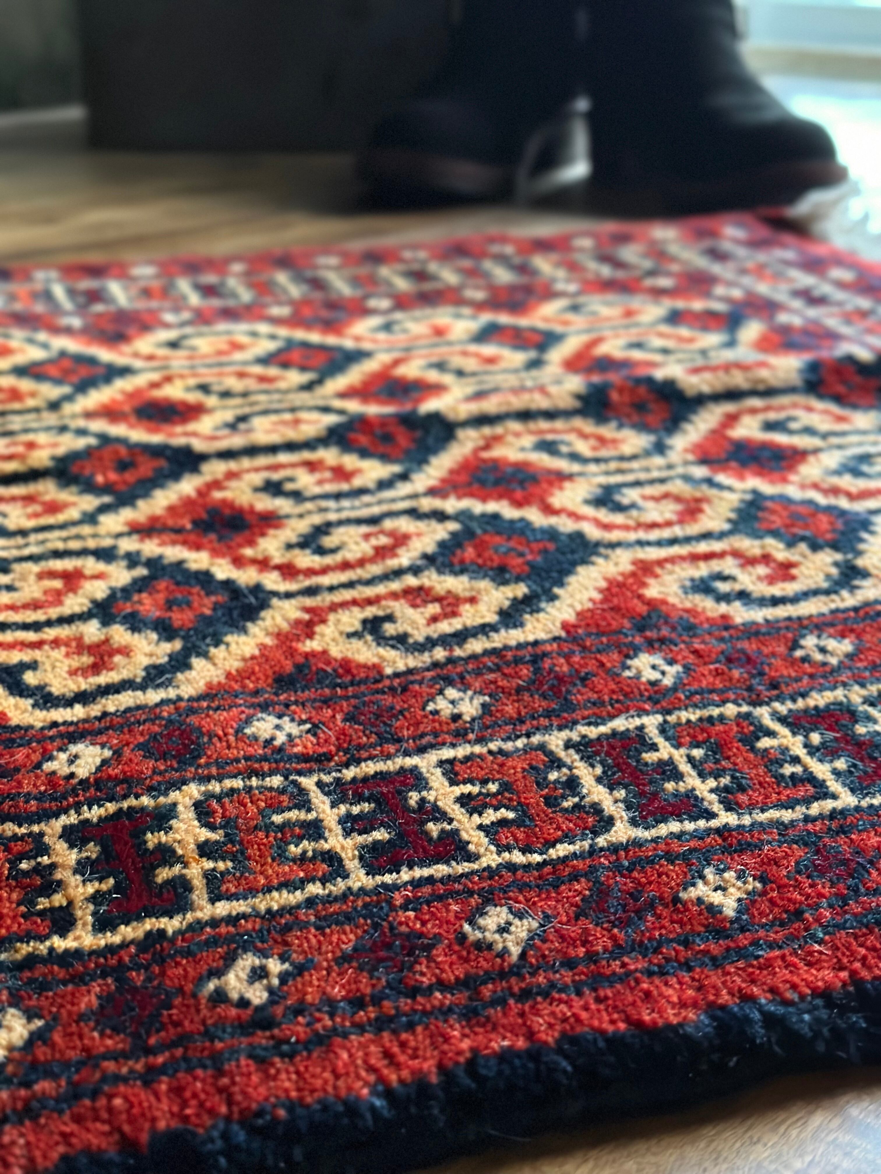 パイルの長さは充分なほどに、全体的なしなやかさもあり素足に心地よいこと間違いなし。特にリペアした箇所もなくパイル抜けなどもありませんが、色見に関しては写真では難しく赤よりもレンガ色に近いでしょうか。