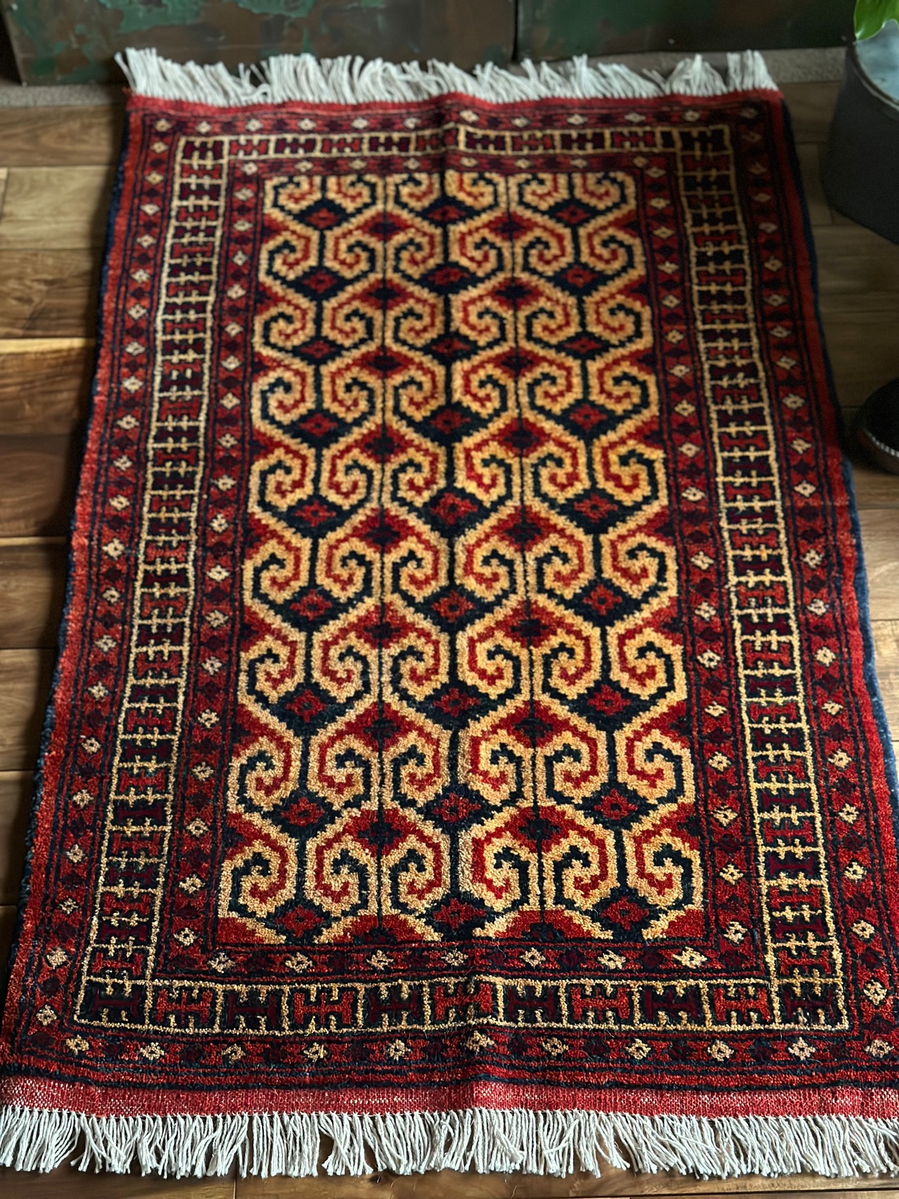またラグそのものに関しては羊毛特有の匂いがあり手織りによる歪みや経年劣化、草木染めによる色ムラなどがありますが、それもまたトライバルラグの魅力かとご理解ください。
