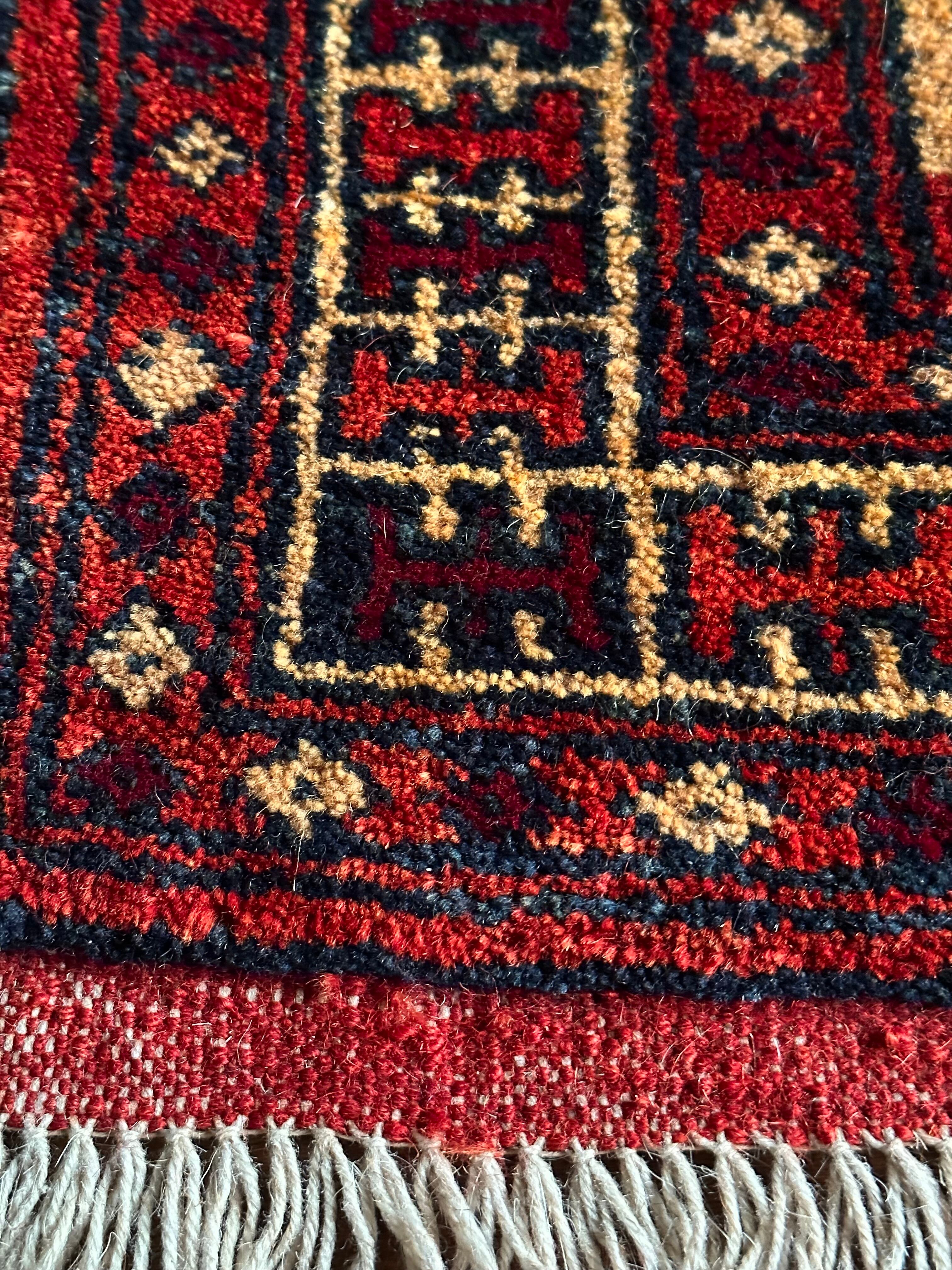 パッと目に飛び込むモダンなデザインがカッコいいトルクメンのトライバルラグになります。