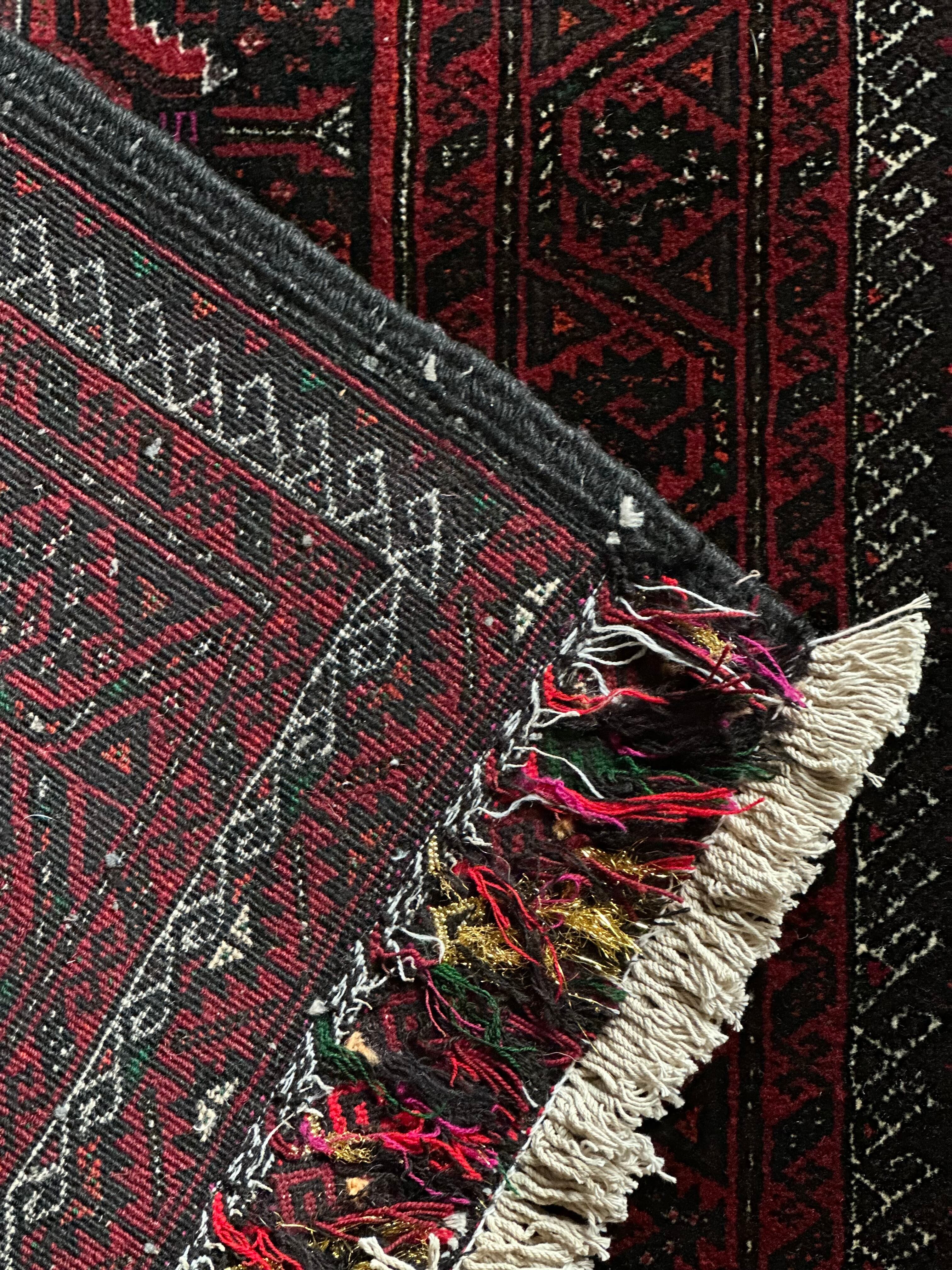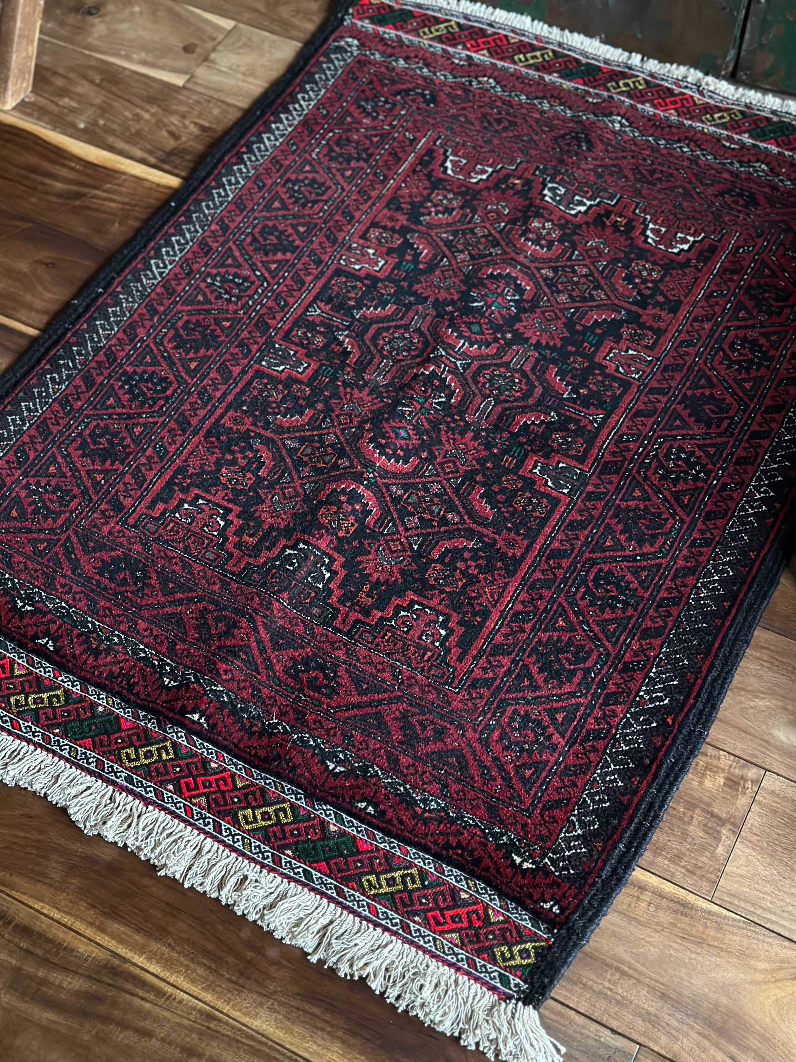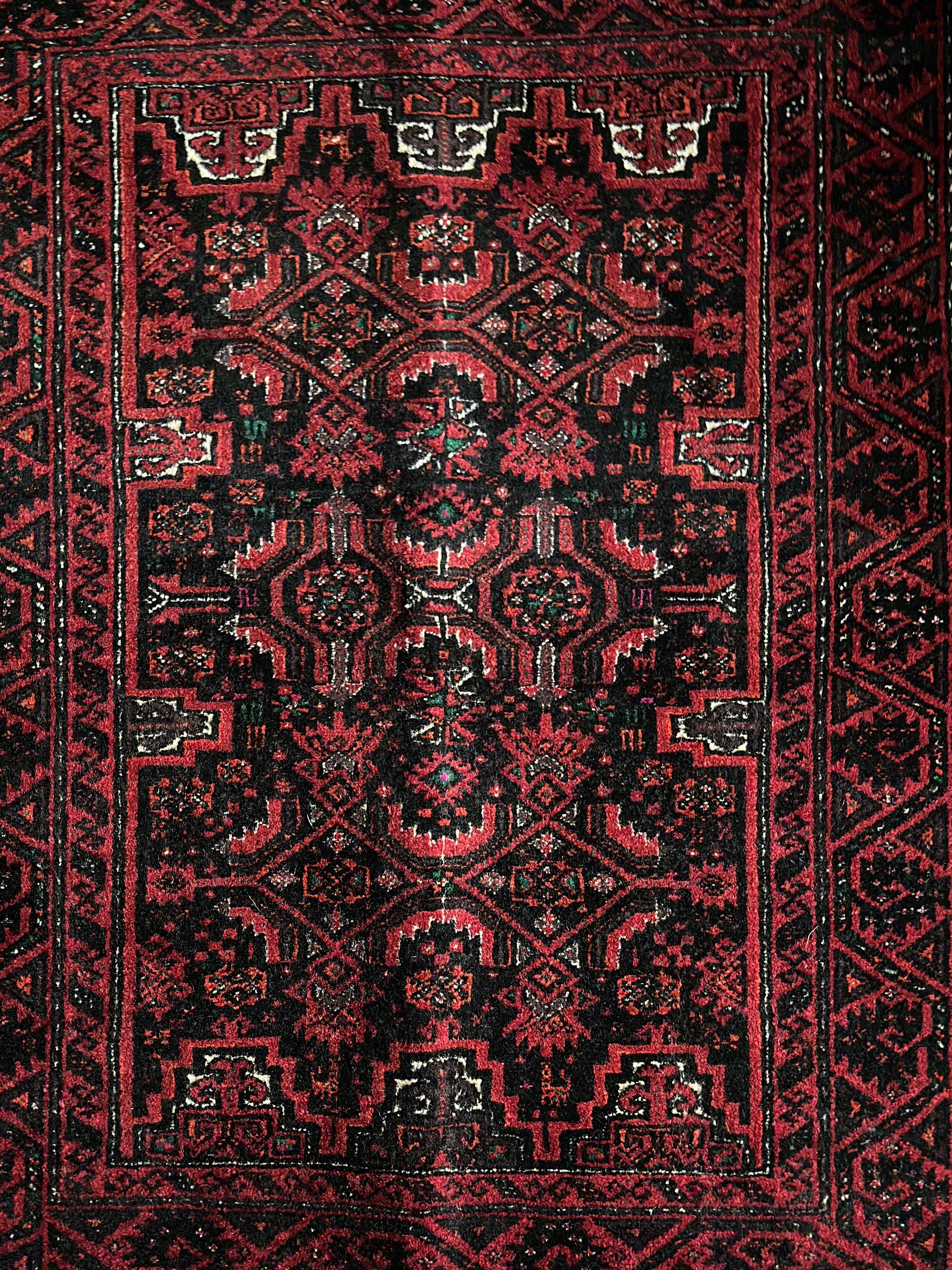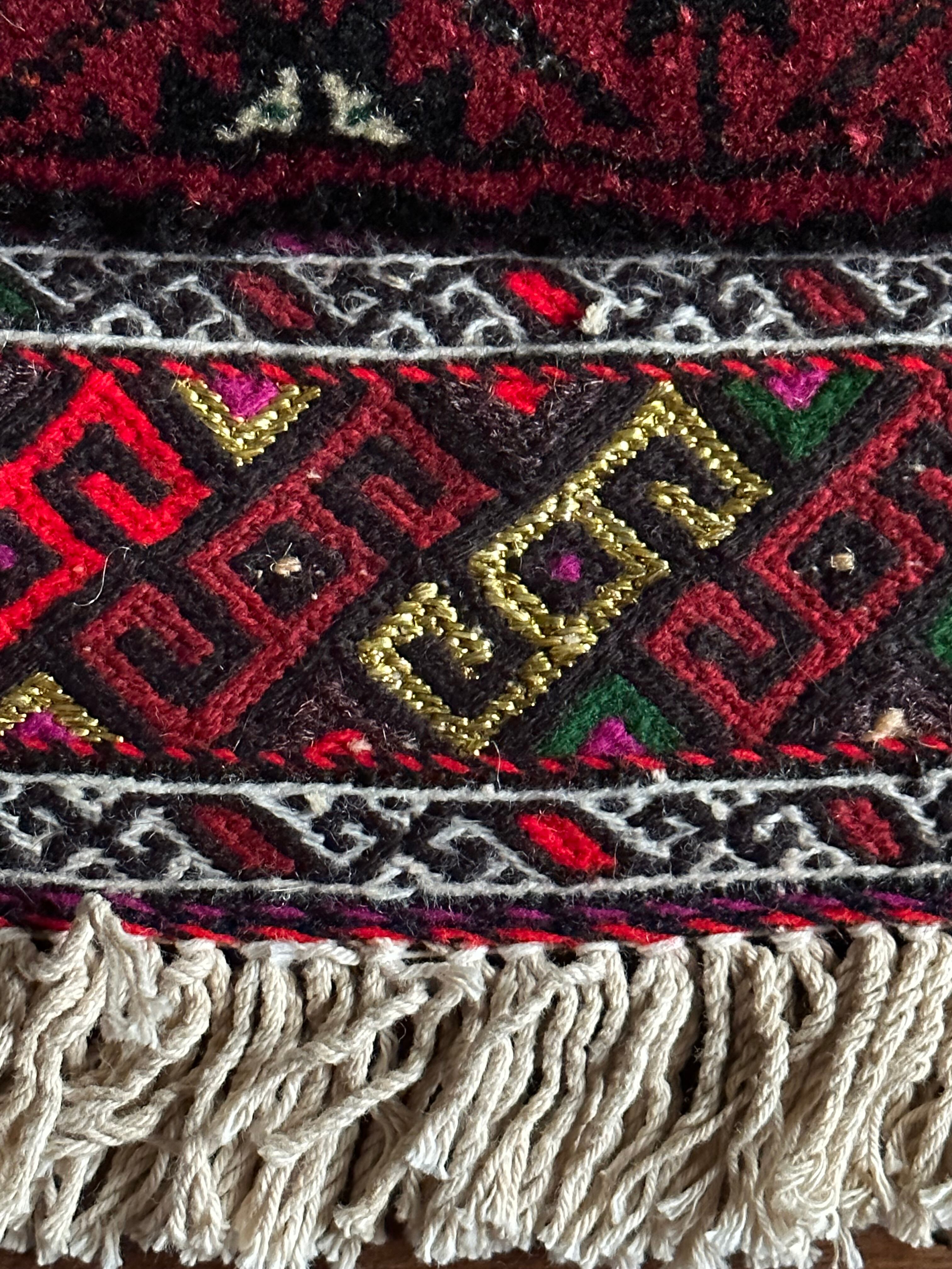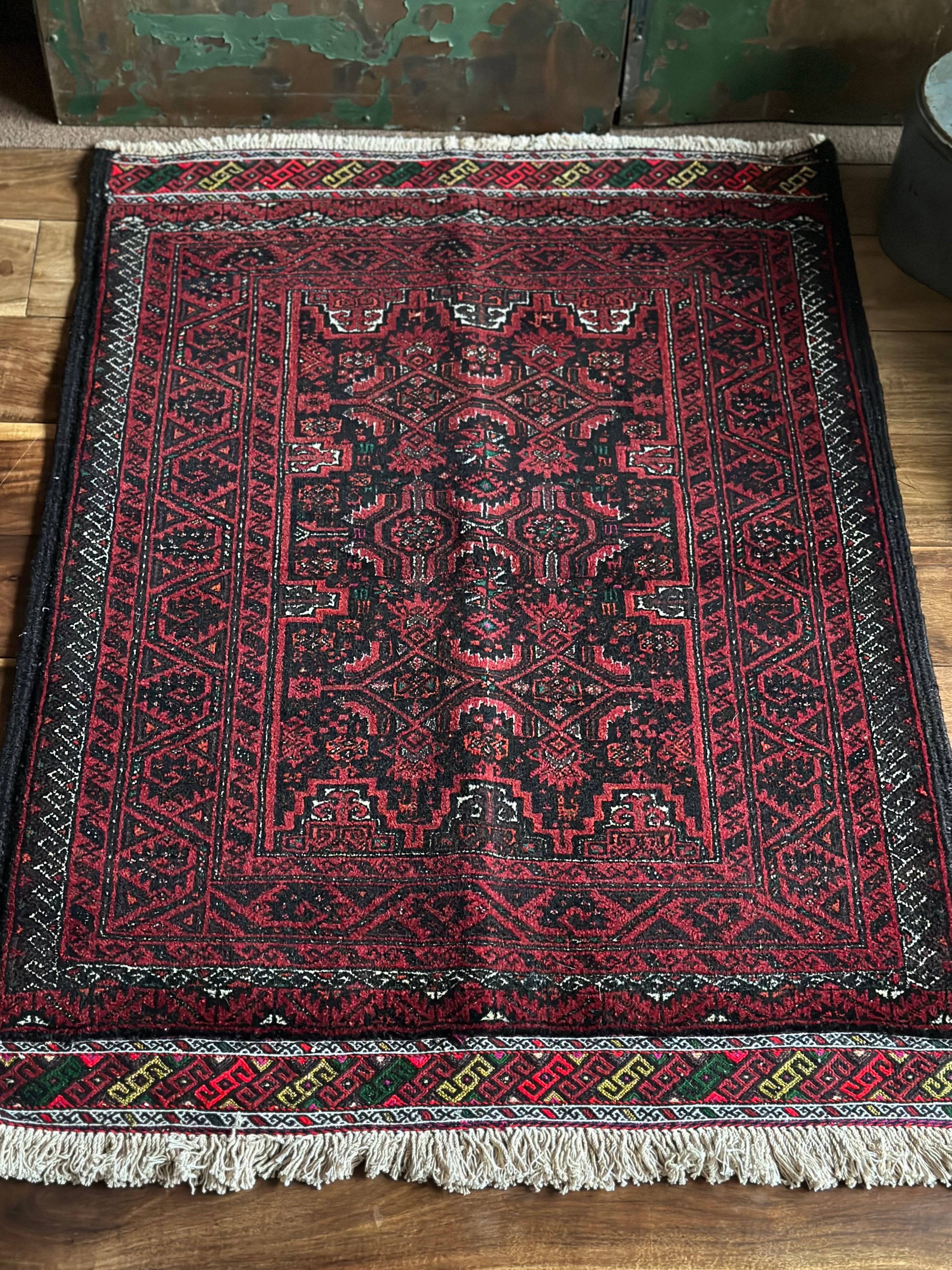 金色の糸が織り込まれたきらびやかな装飾から結婚式用として織られたラグで、バルーチ独特の深みのあるワインレッドに細かな文様が描かれたインパクトのある1枚でしょうか。買付け時に個人的にも欲しいと思ったラグになります。