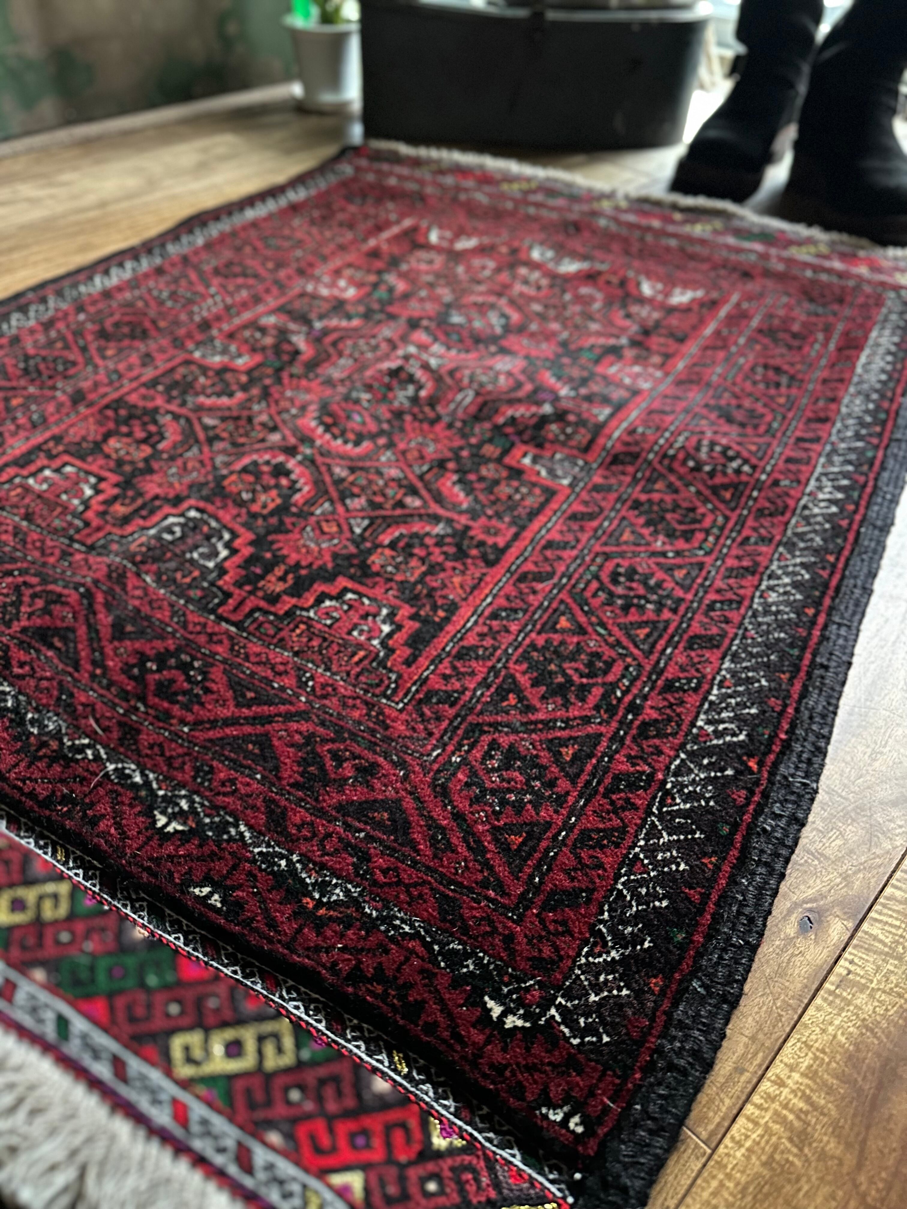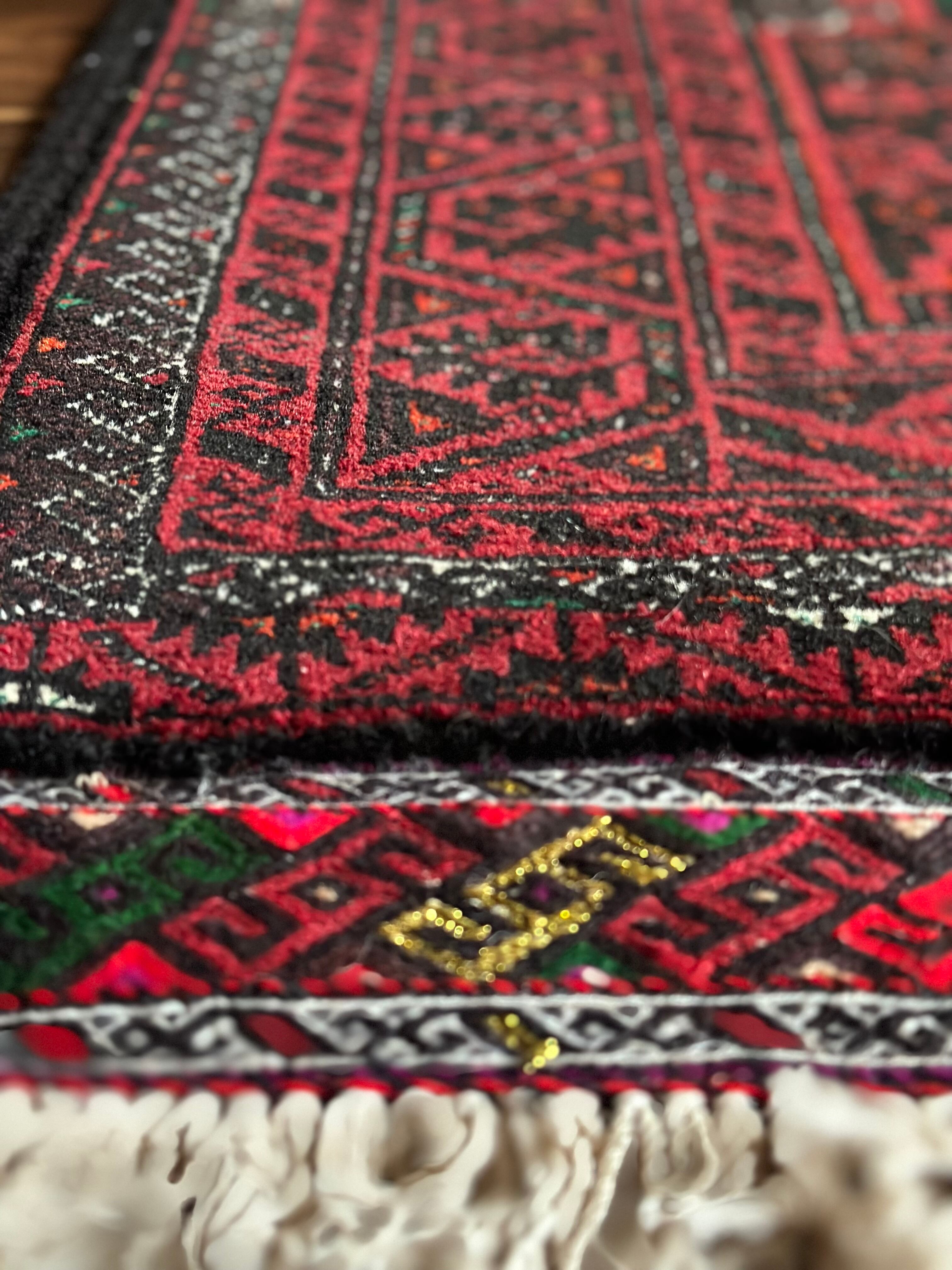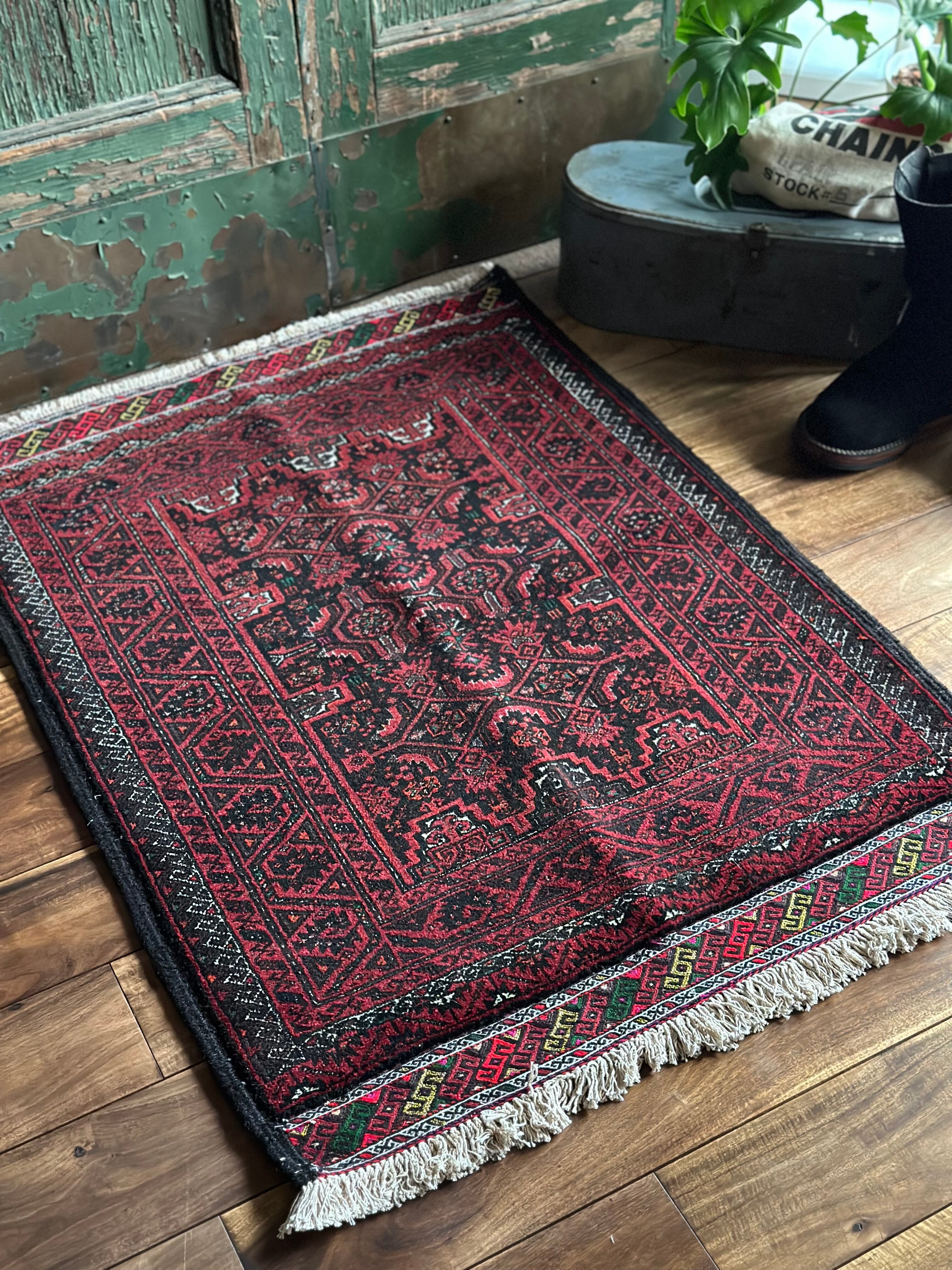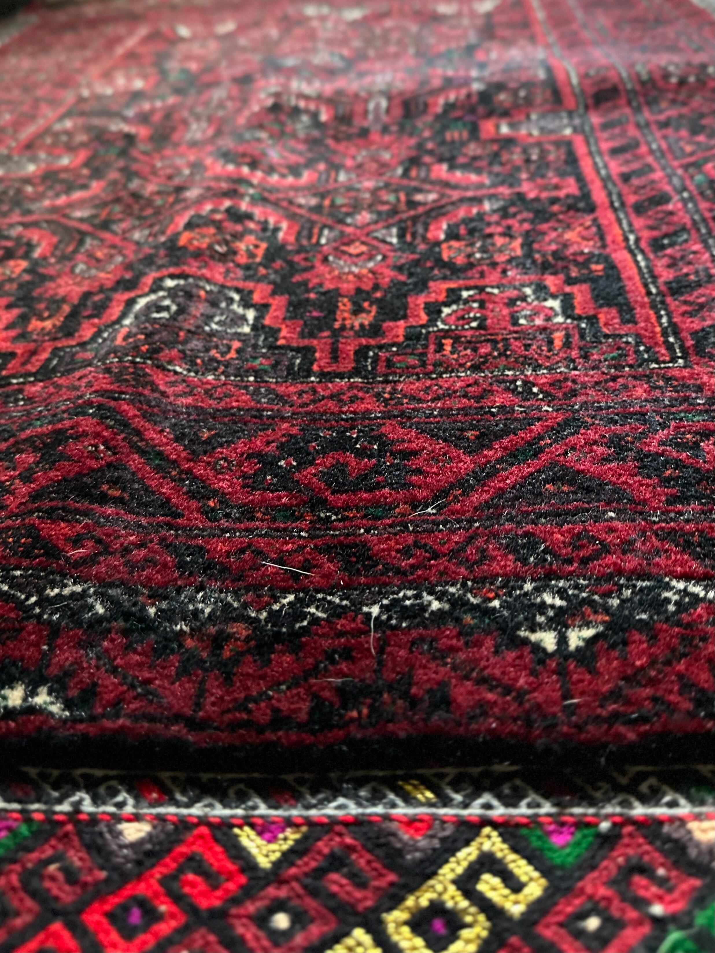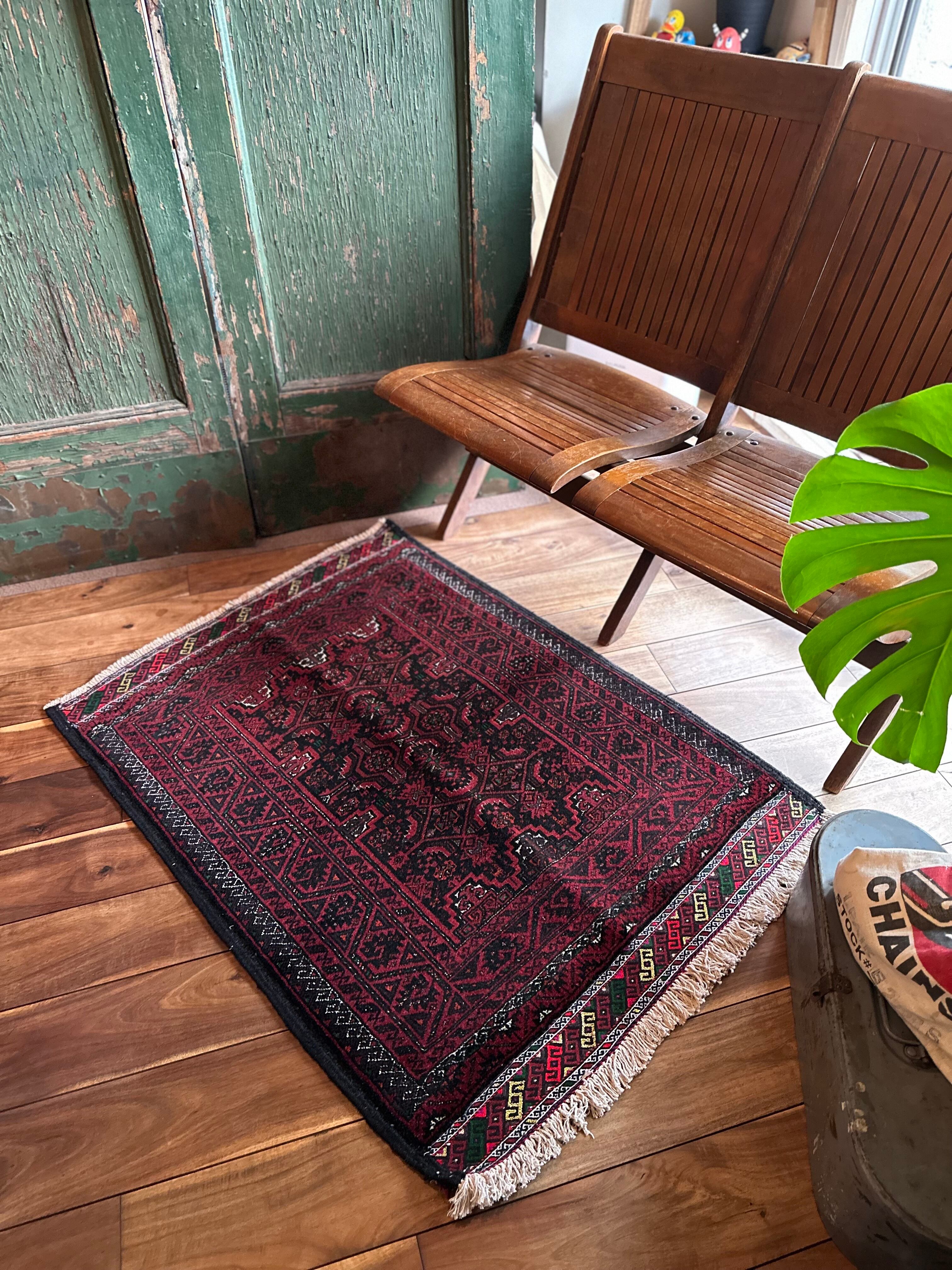 金色の糸が織り込まれたきらびやかな装飾から結婚式用として織られたラグで、バルーチ独特の深みのあるワインレッドに細かな文様が描かれたインパクトのある1枚でしょうか。買付け時に個人的にも欲しいと思ったラグになります。