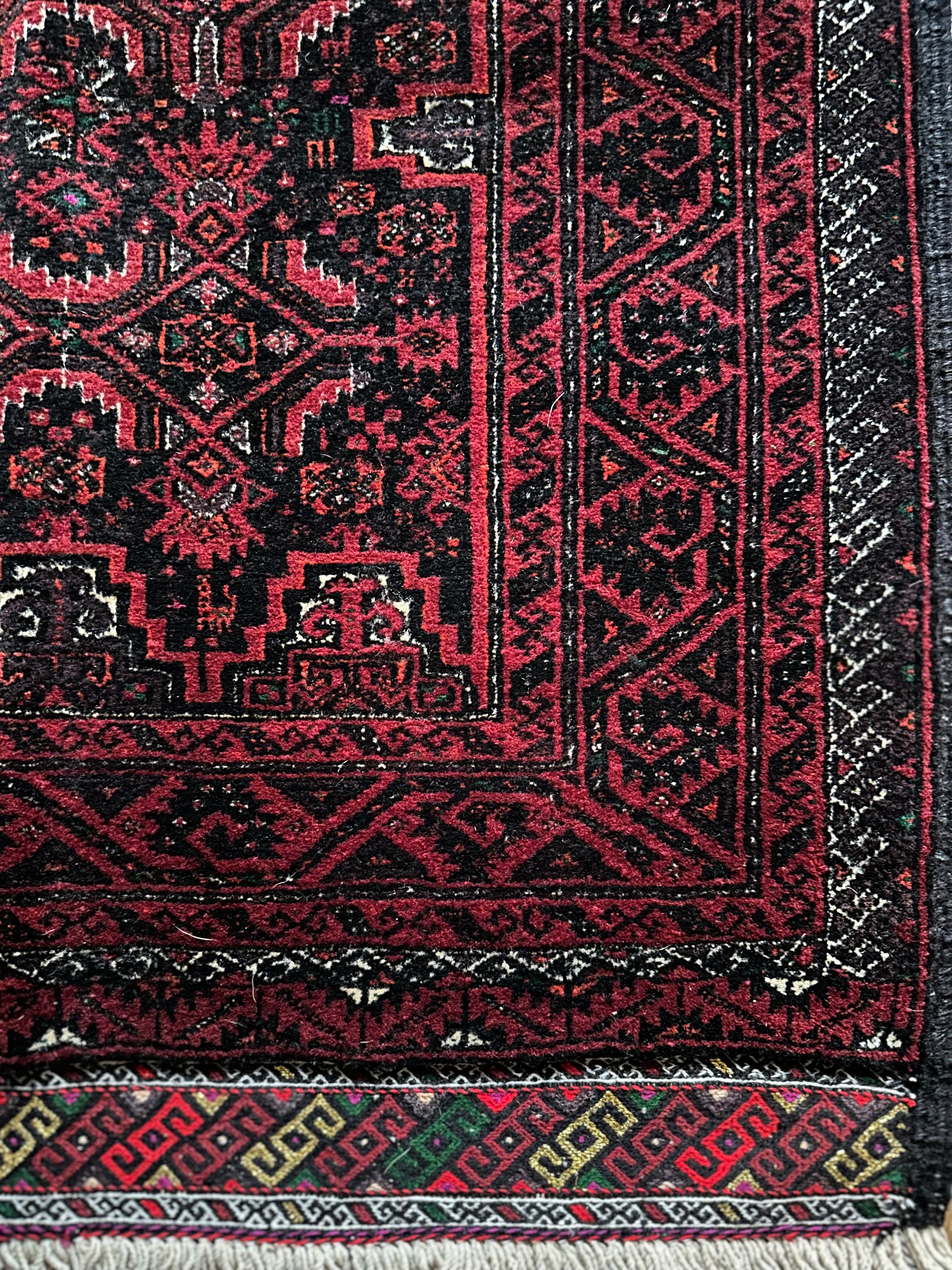 独特なキリムエンドが目を惹きつけるアフガニスタン系バルーチ族のトライバルラグになります。