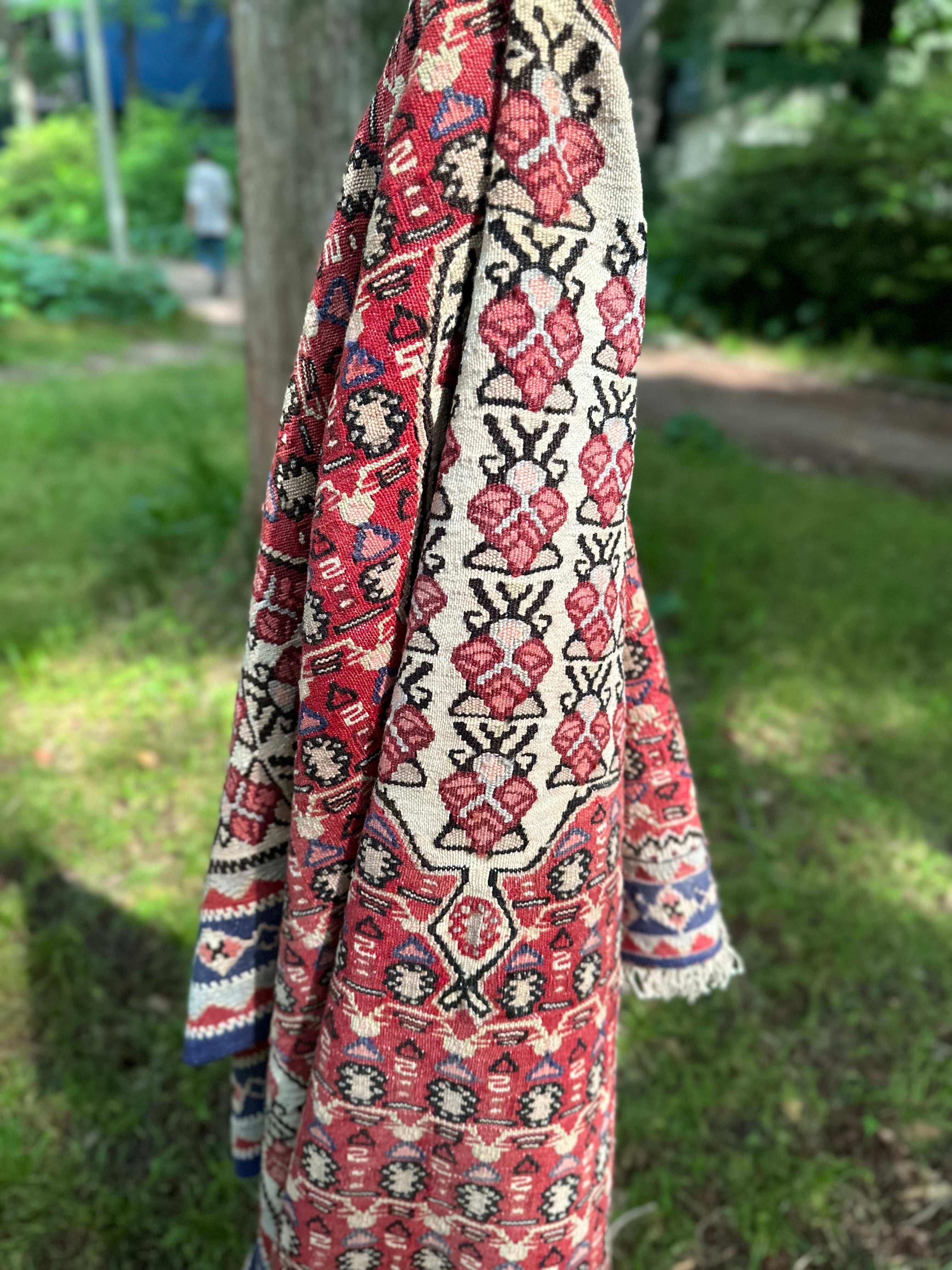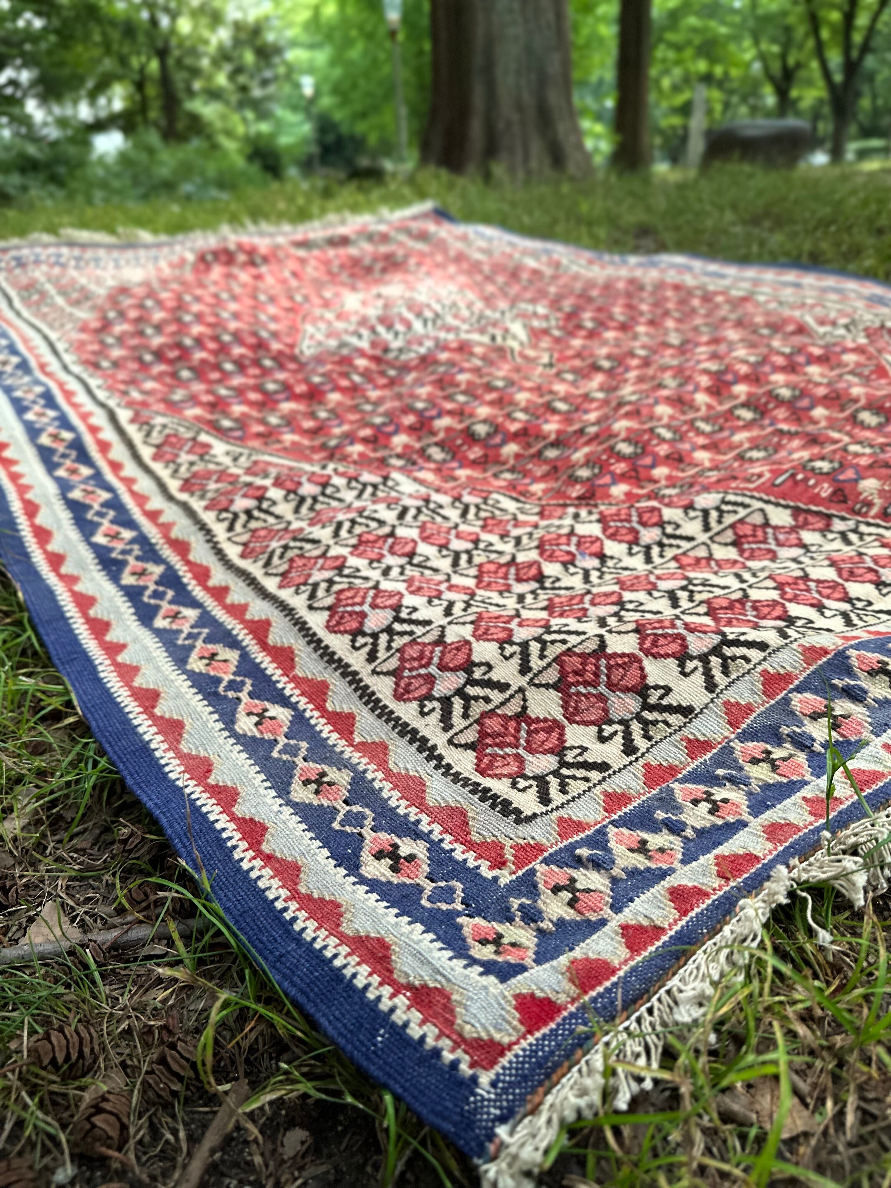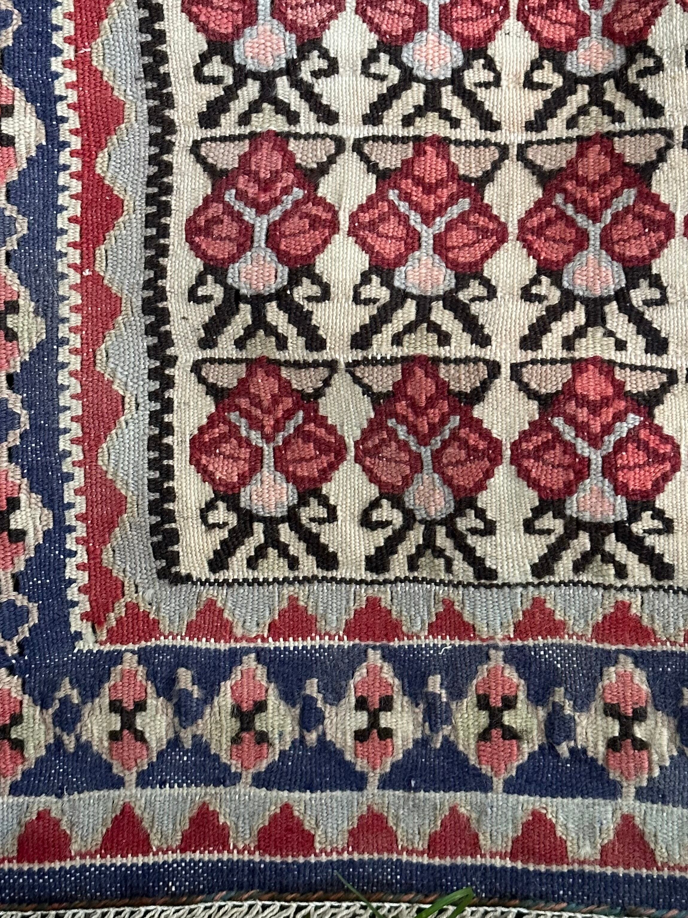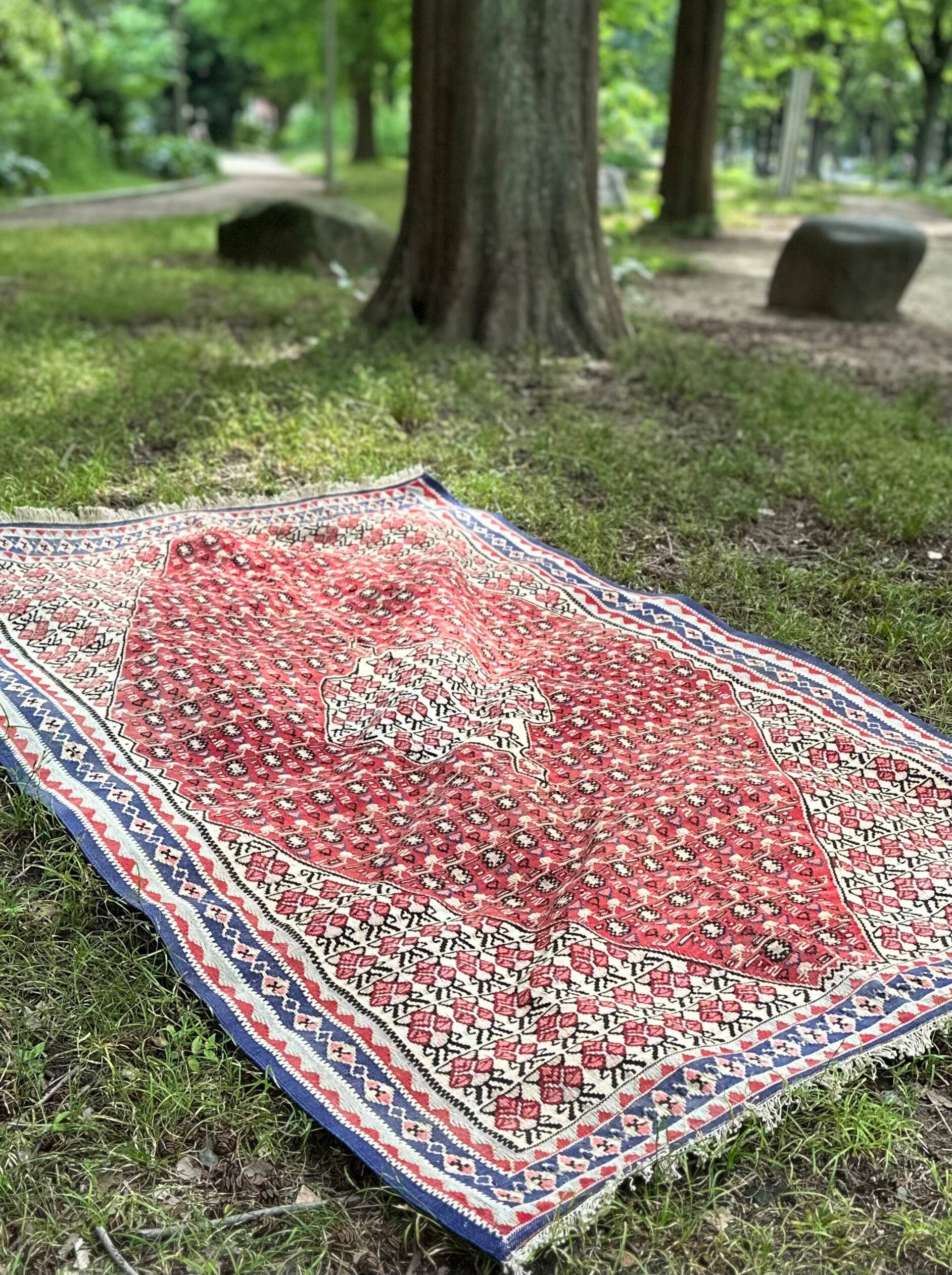 細かなイチゴが全体に描かれたパルメットの連続文様が愛らしい60年前のオールドキリムになります。