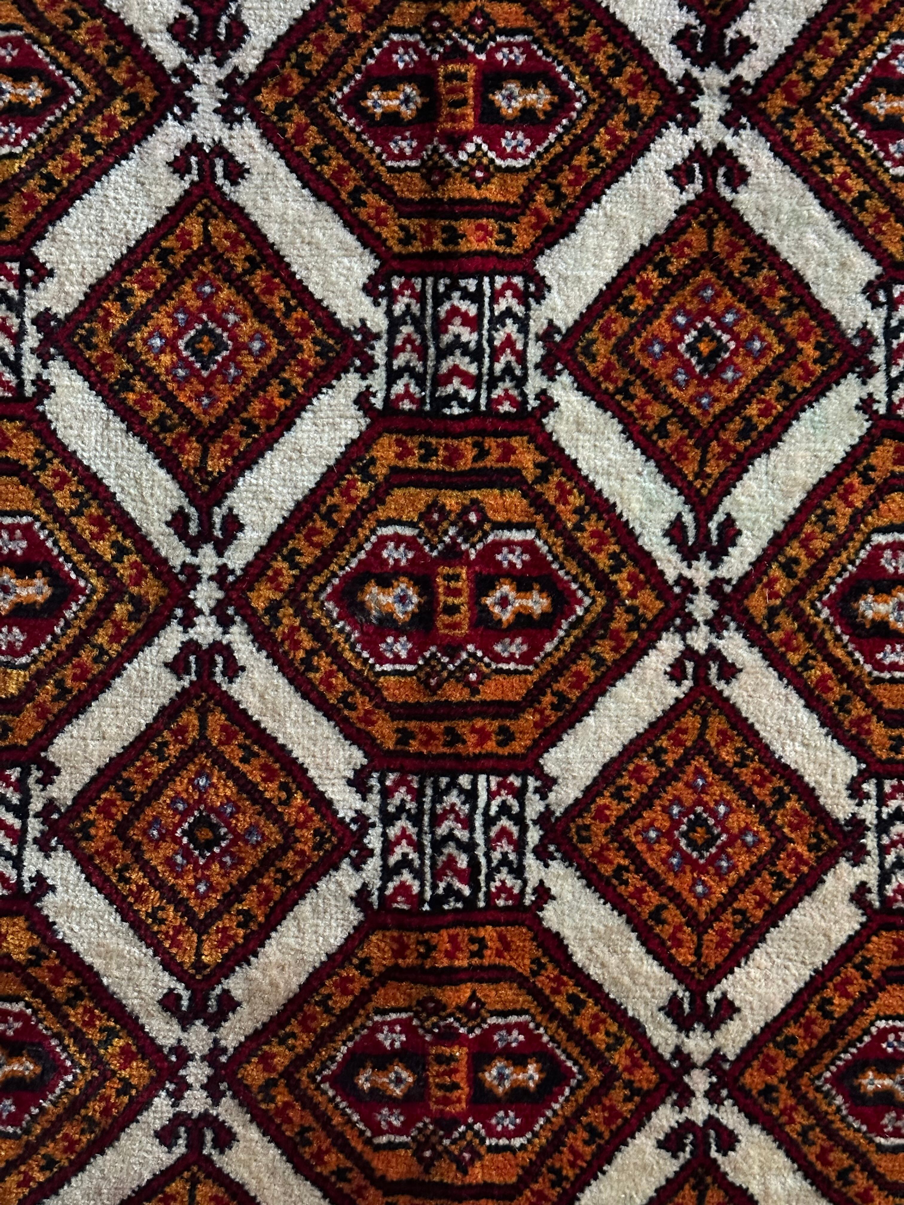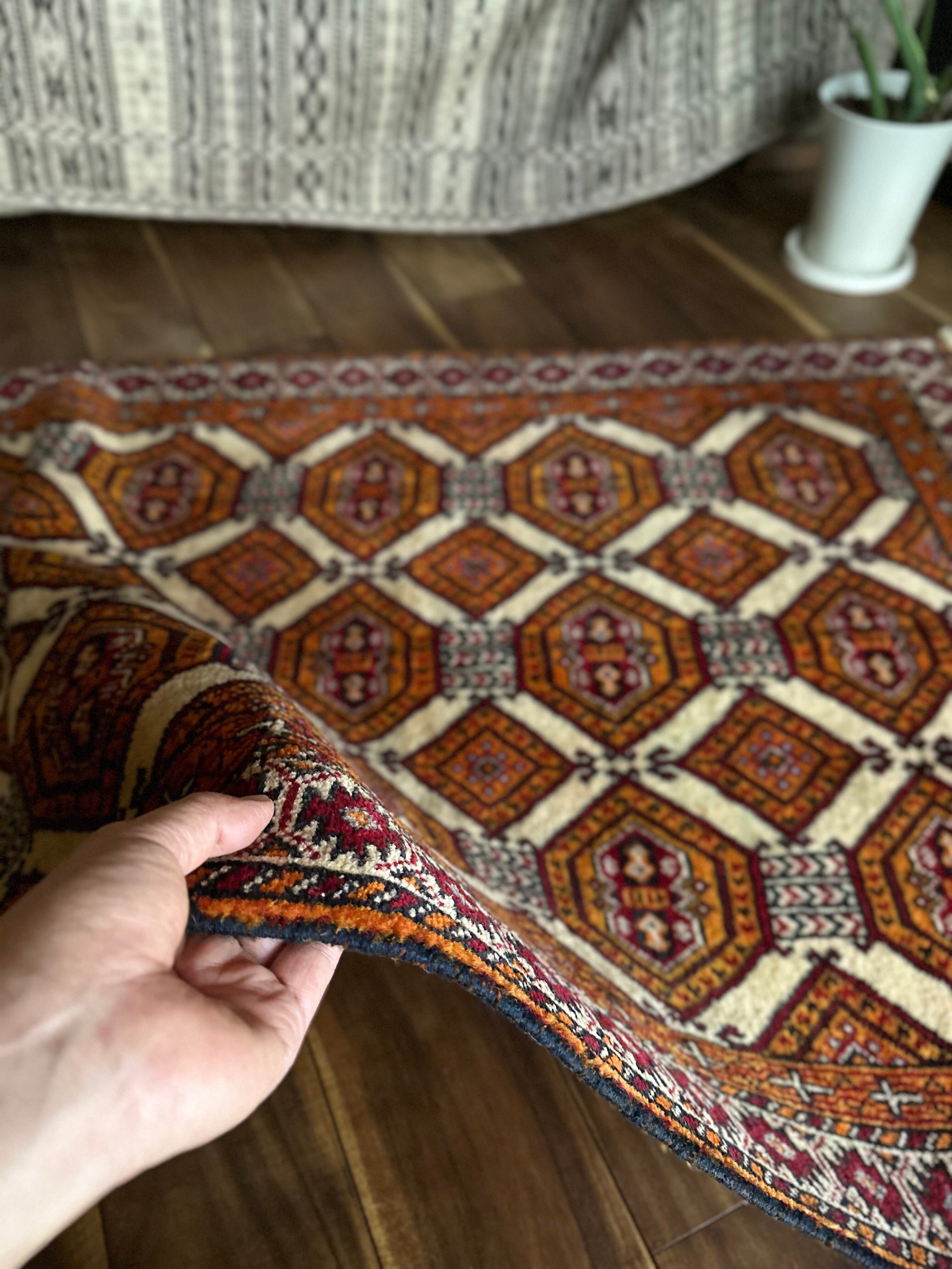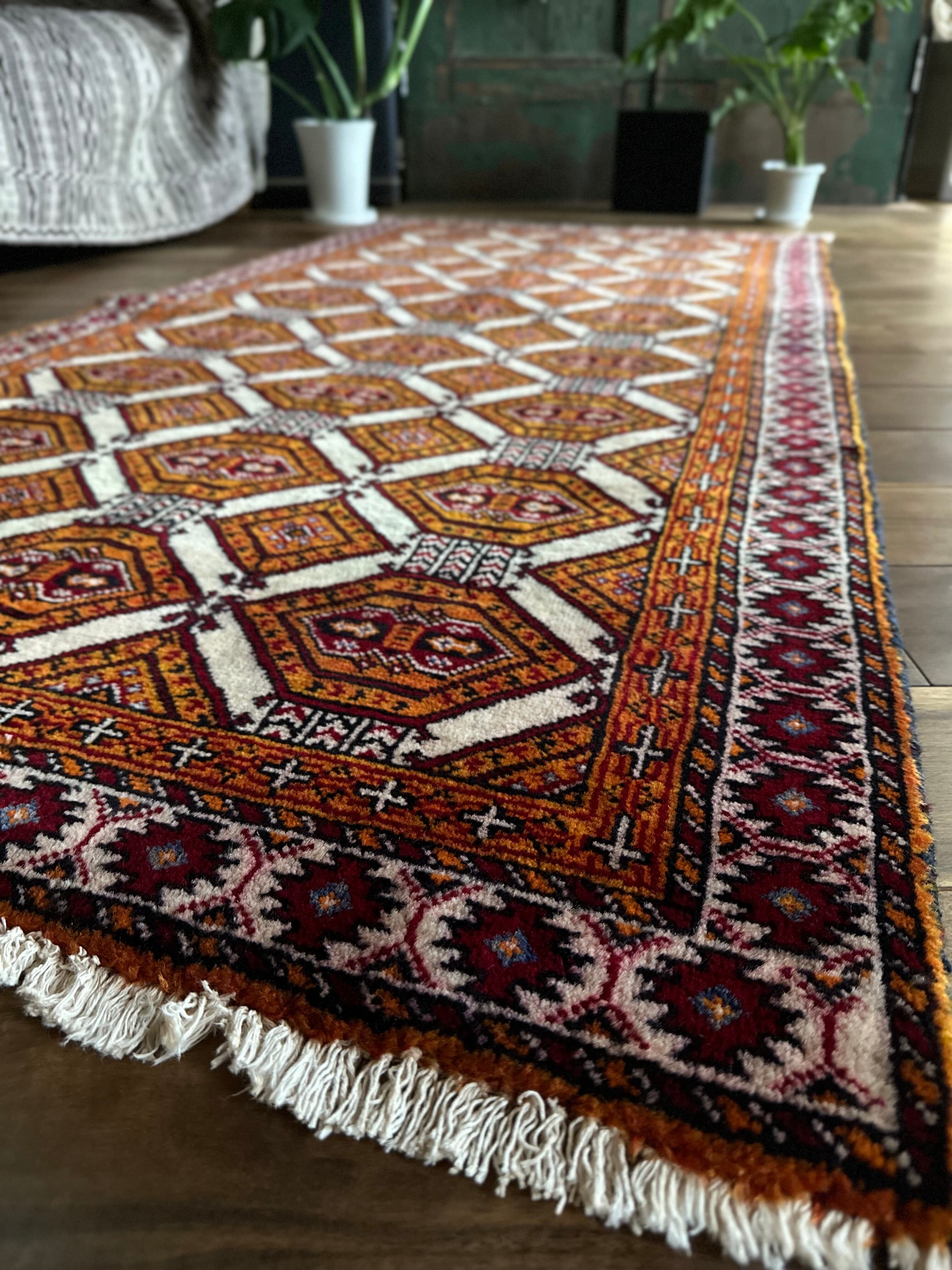 どうしても暗めでイカついラグが多いバルーチですが、後年では異部族交流のもと明るくポップなモノもちらほらと、こちらはデフォルメされたギュルの連続紋様にメインボーダーの赤が全体を引き締めています。