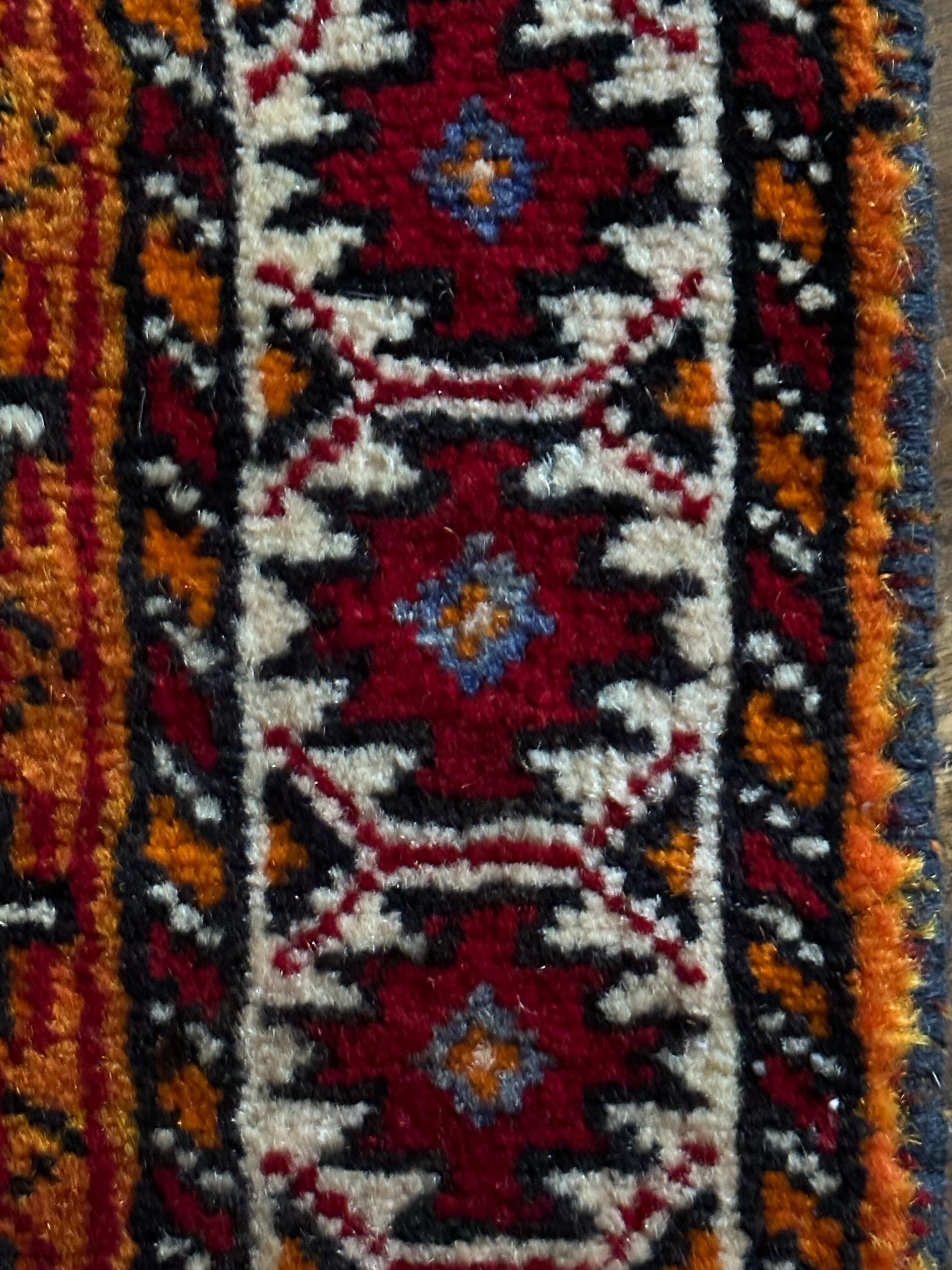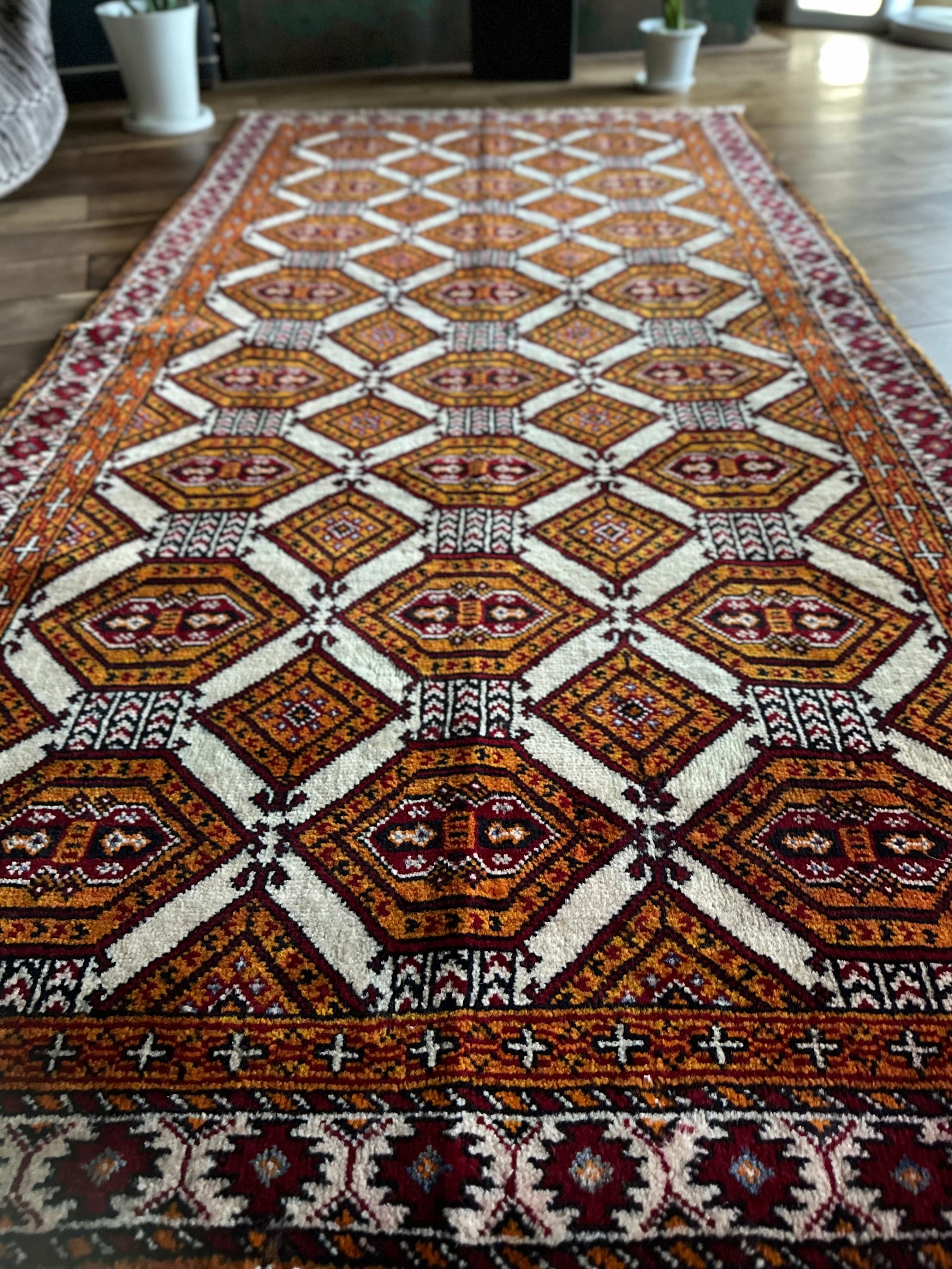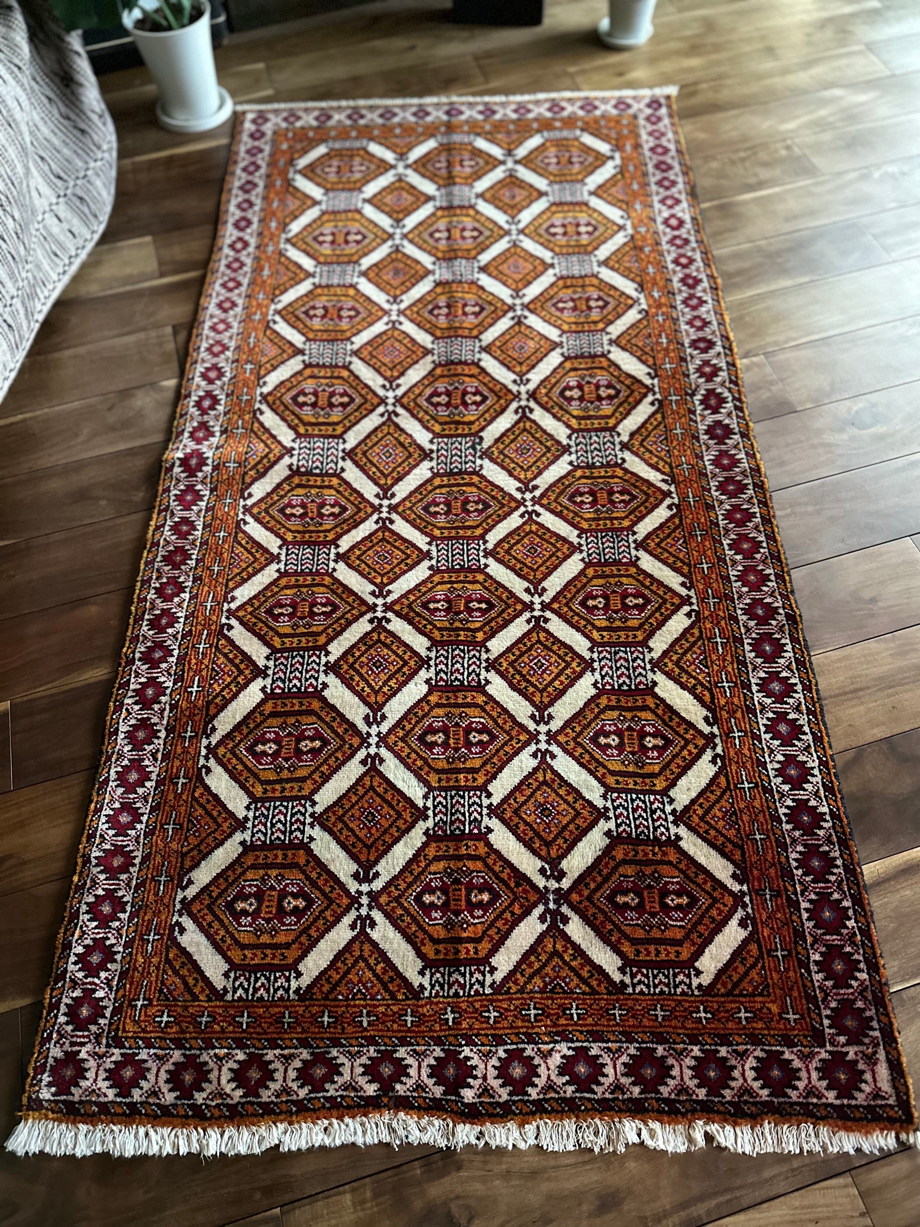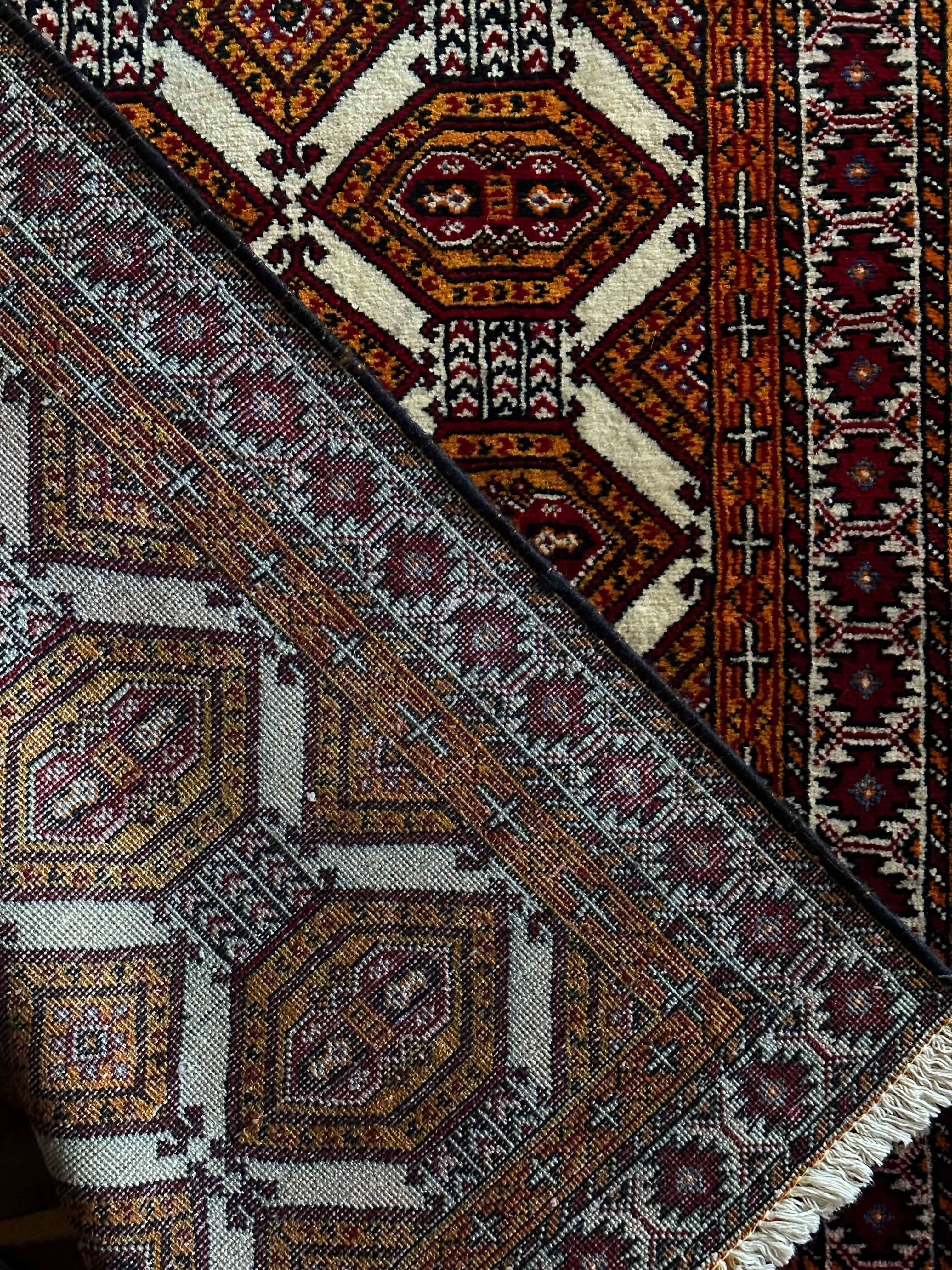 どうしても暗めでイカついラグが多いバルーチですが、後年では異部族交流のもと明るくポップなモノもちらほらと、こちらはデフォルメされたギュルの連続紋様にメインボーダーの赤が全体を引き締めています。