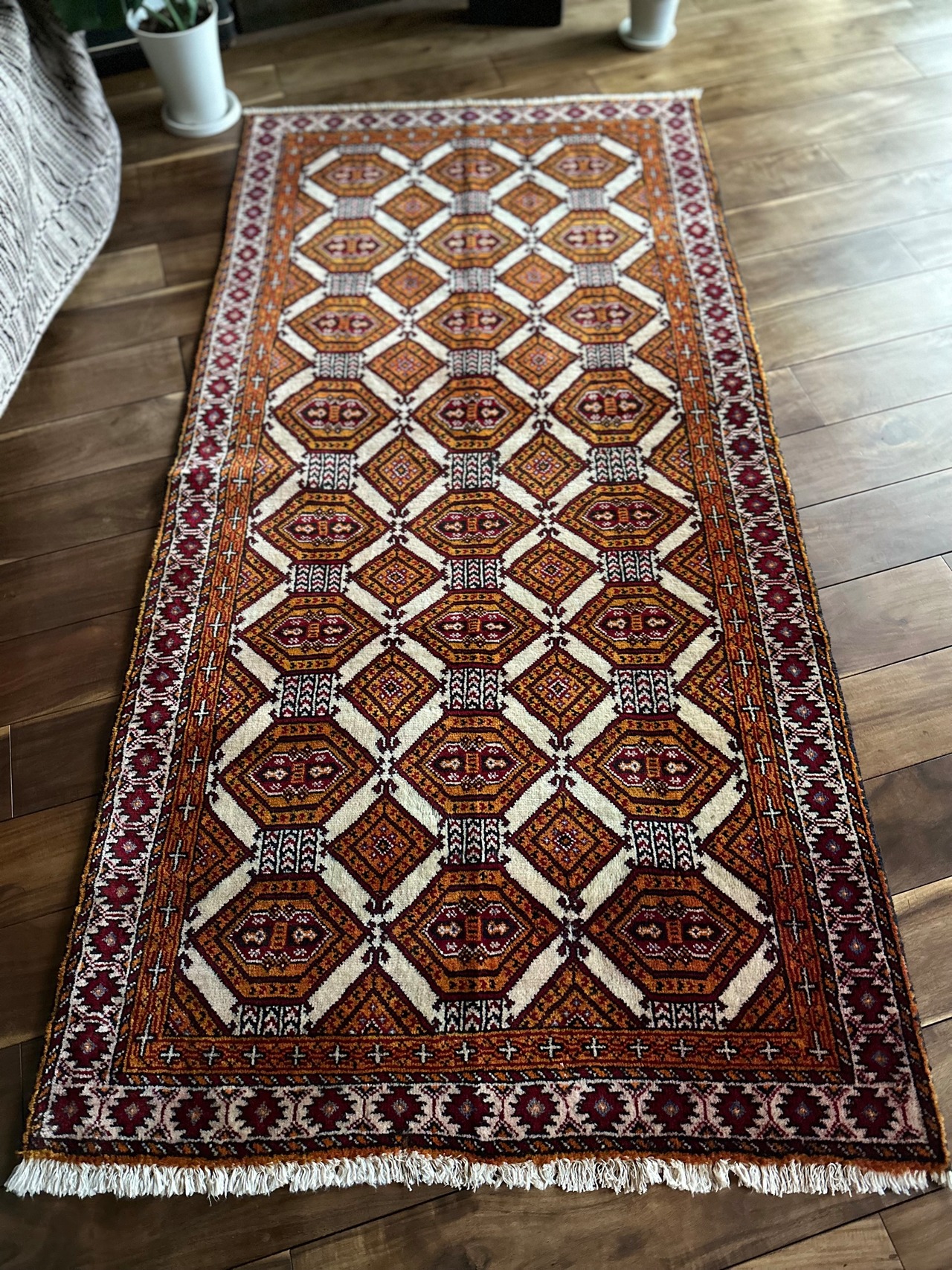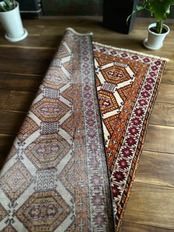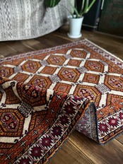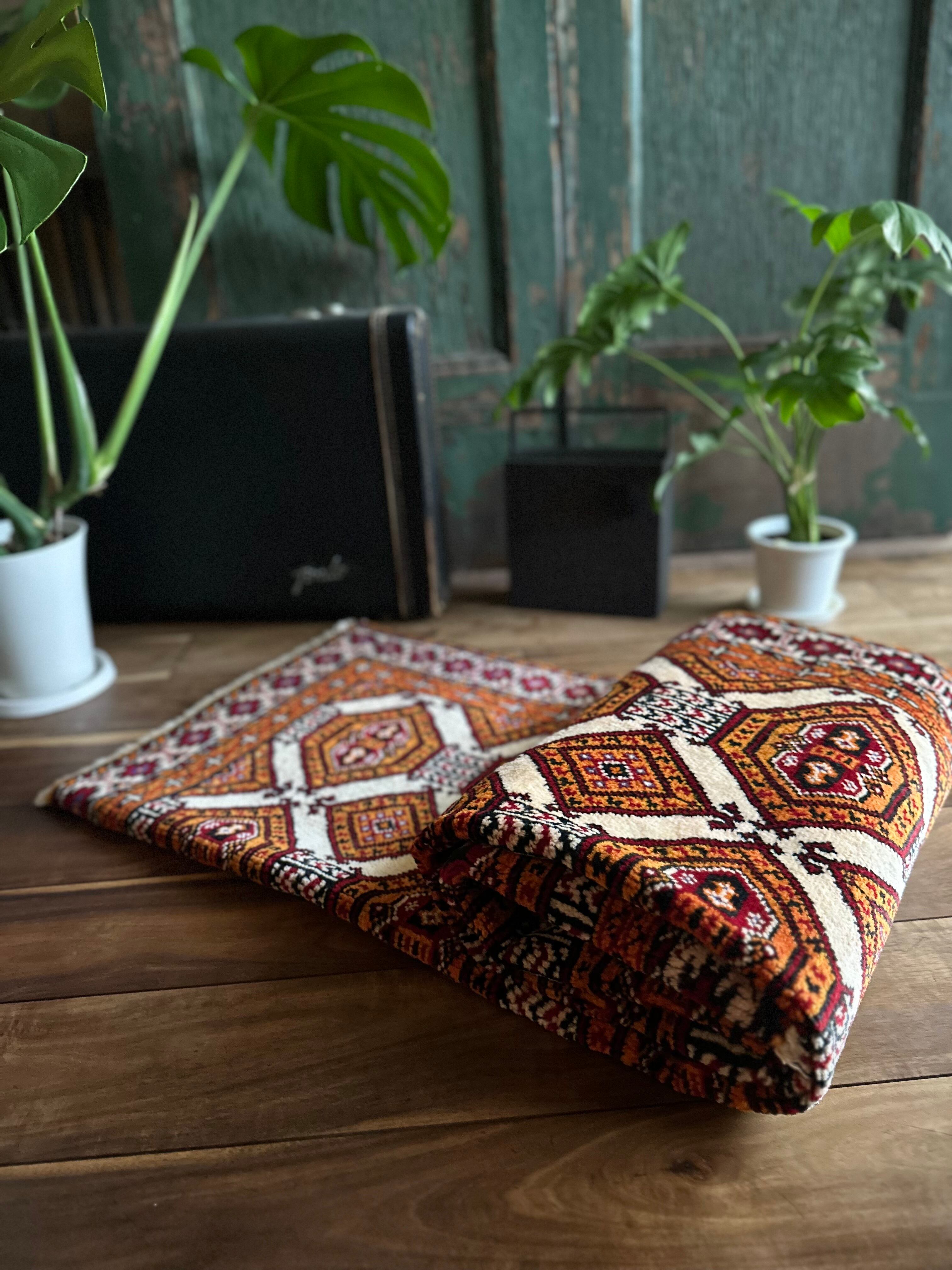 またラグそのものに関しては羊毛特有の匂いがあり手織りによる歪みや経年劣化、草木染めによる色ムラなどがありますが、それもまたトライバルラグの魅力かとご理解ください。