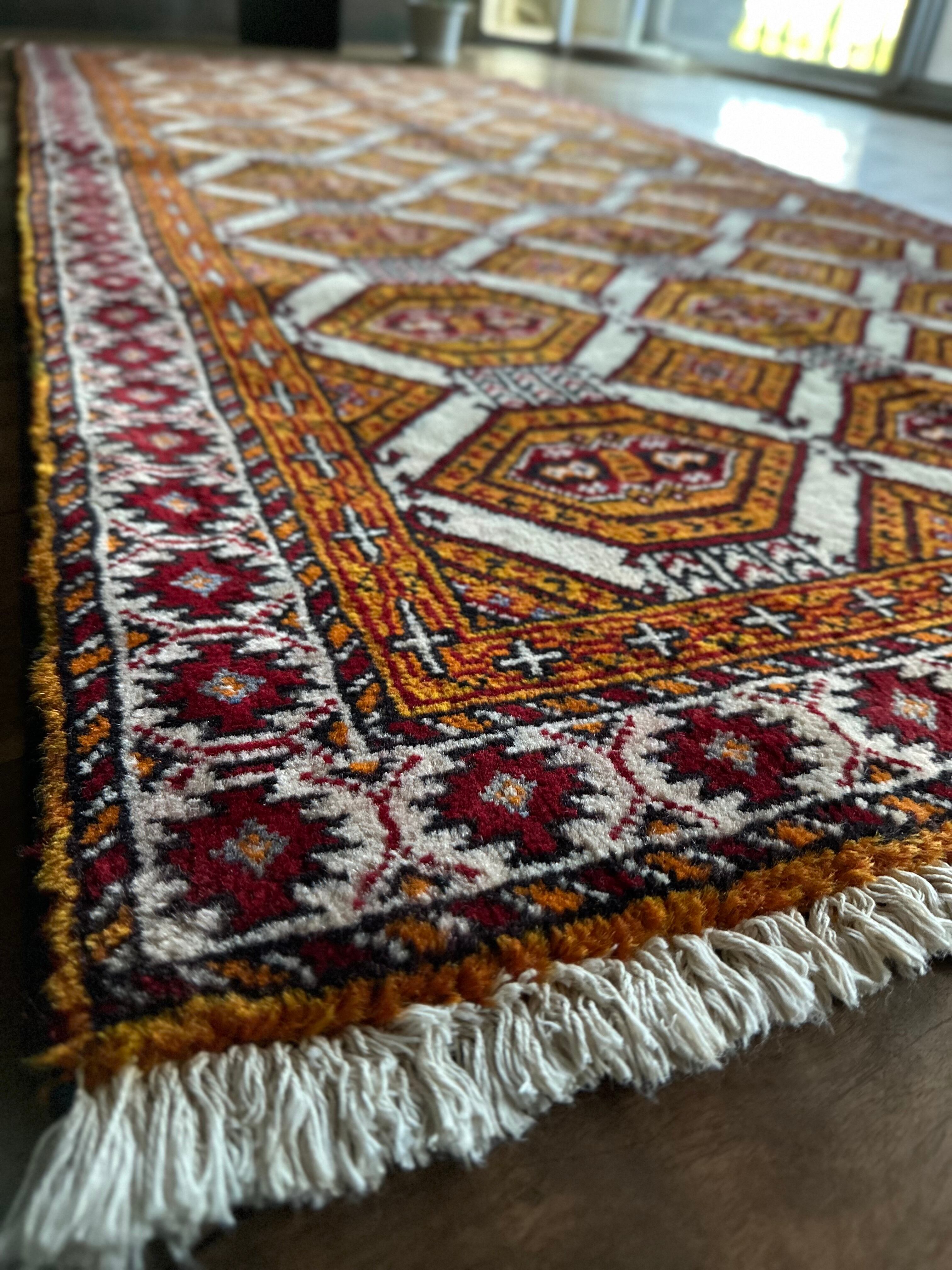 無染色な原毛のナチュラルに眩しく映えるイエローを基調とした珍しい配色のバルーチ族のトライバルラグになります。