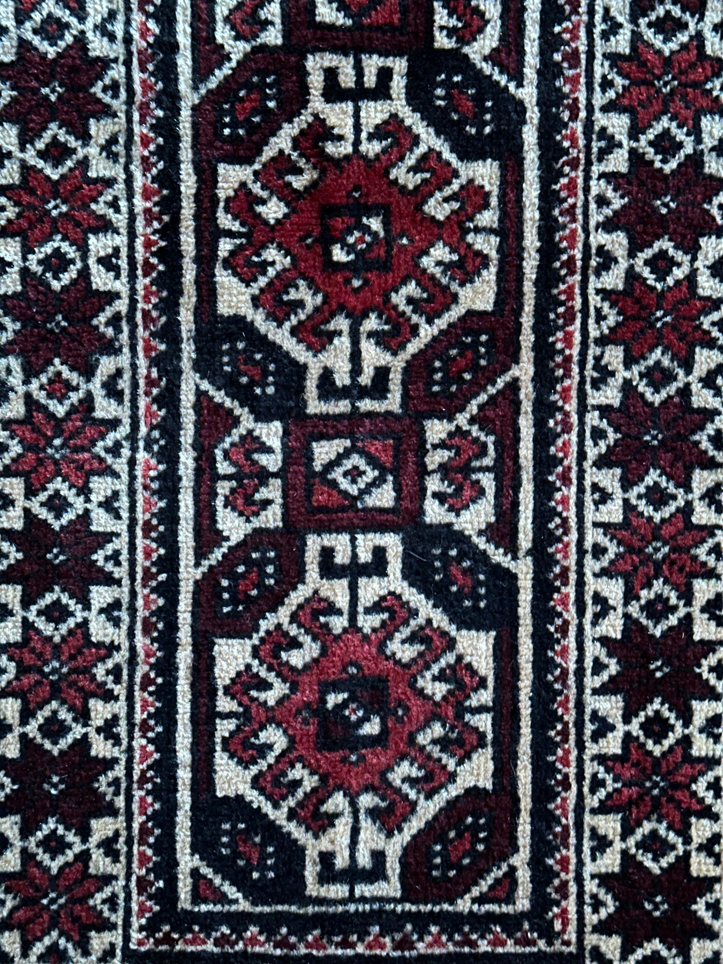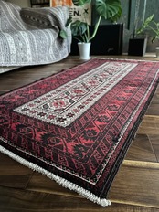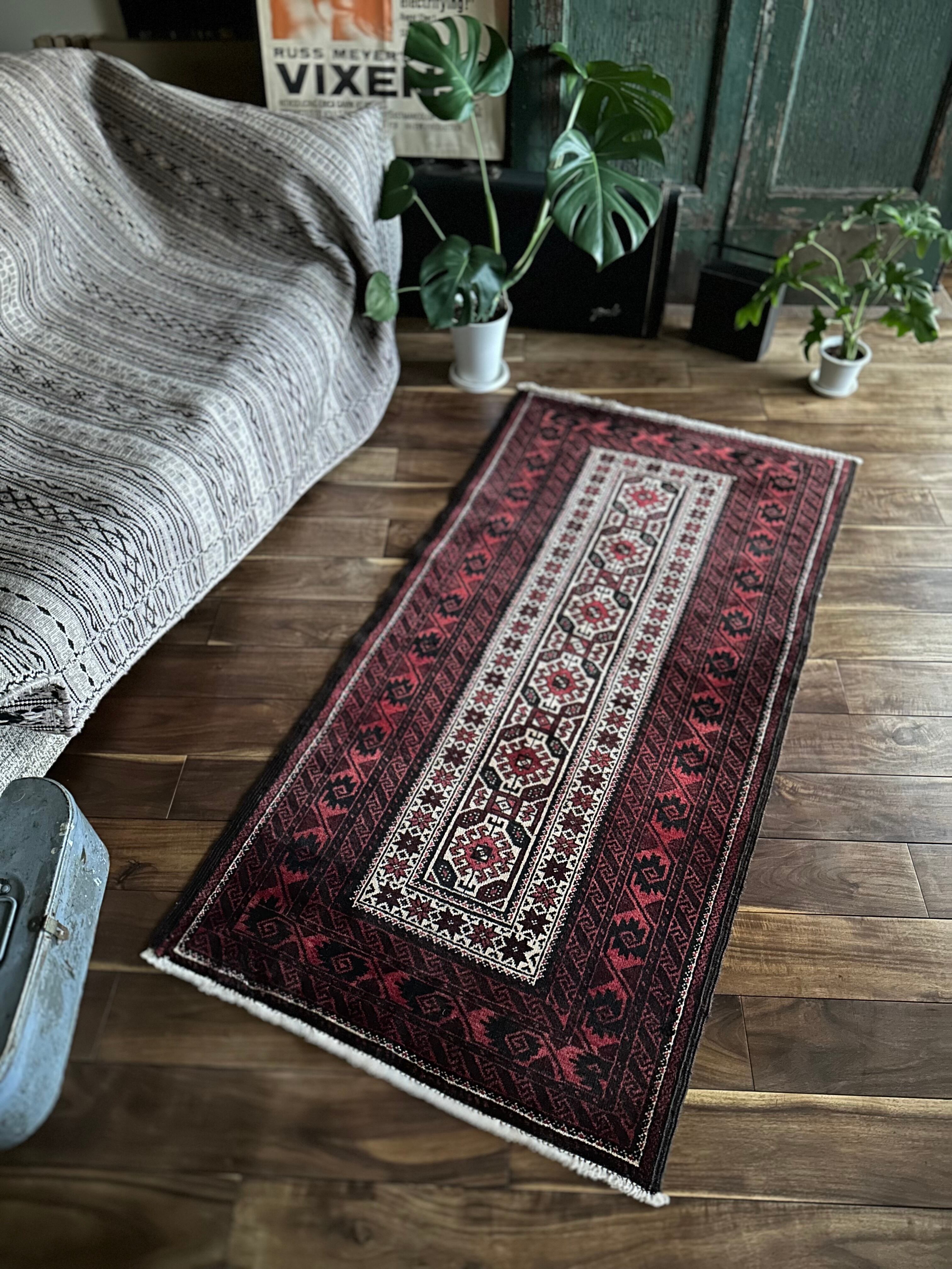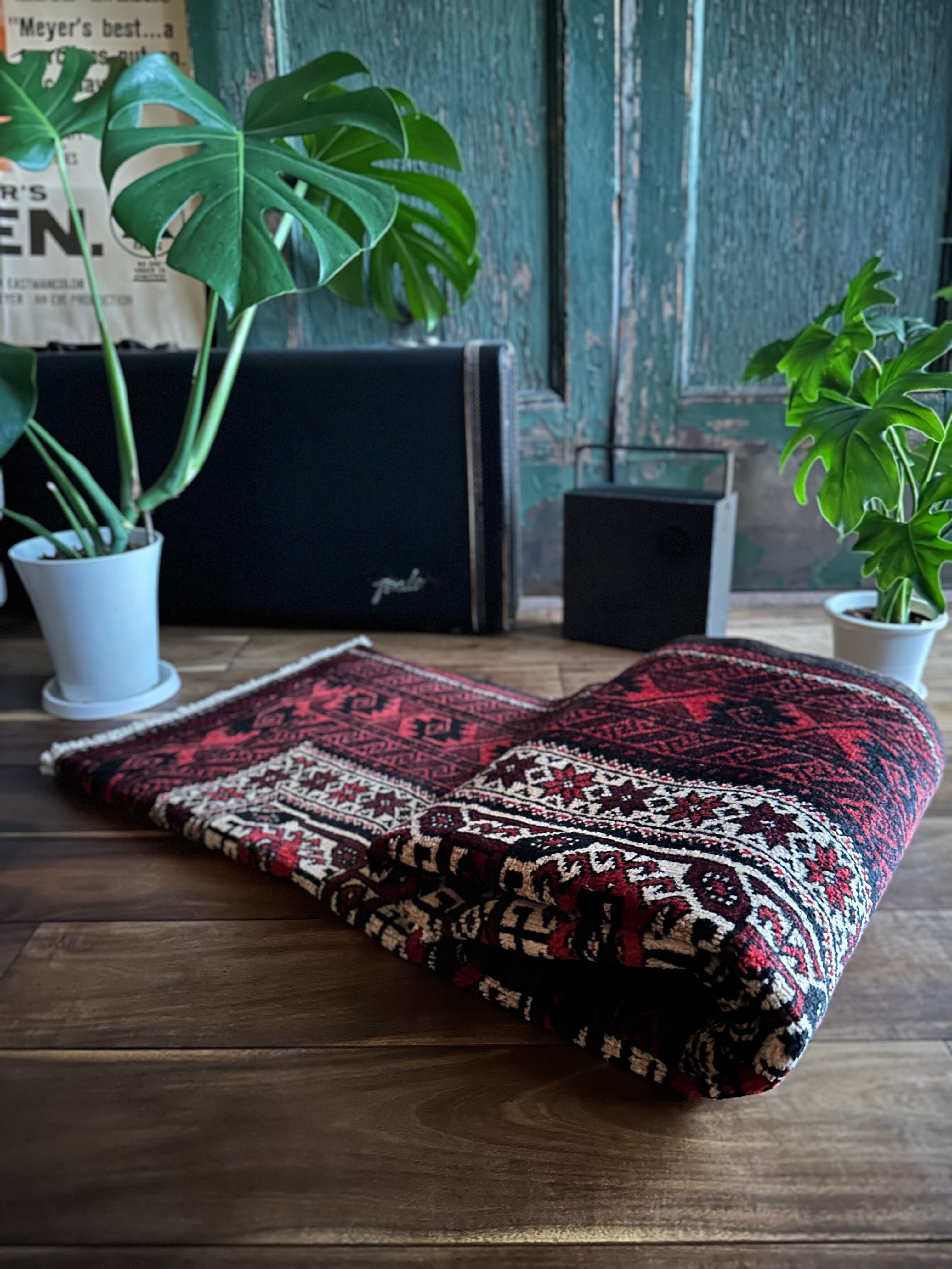 中央部分に見られる雄牛の角に見立てたフックドメダリオンの連続紋様がカッコいいバルーチ族のトライバルラグになります。