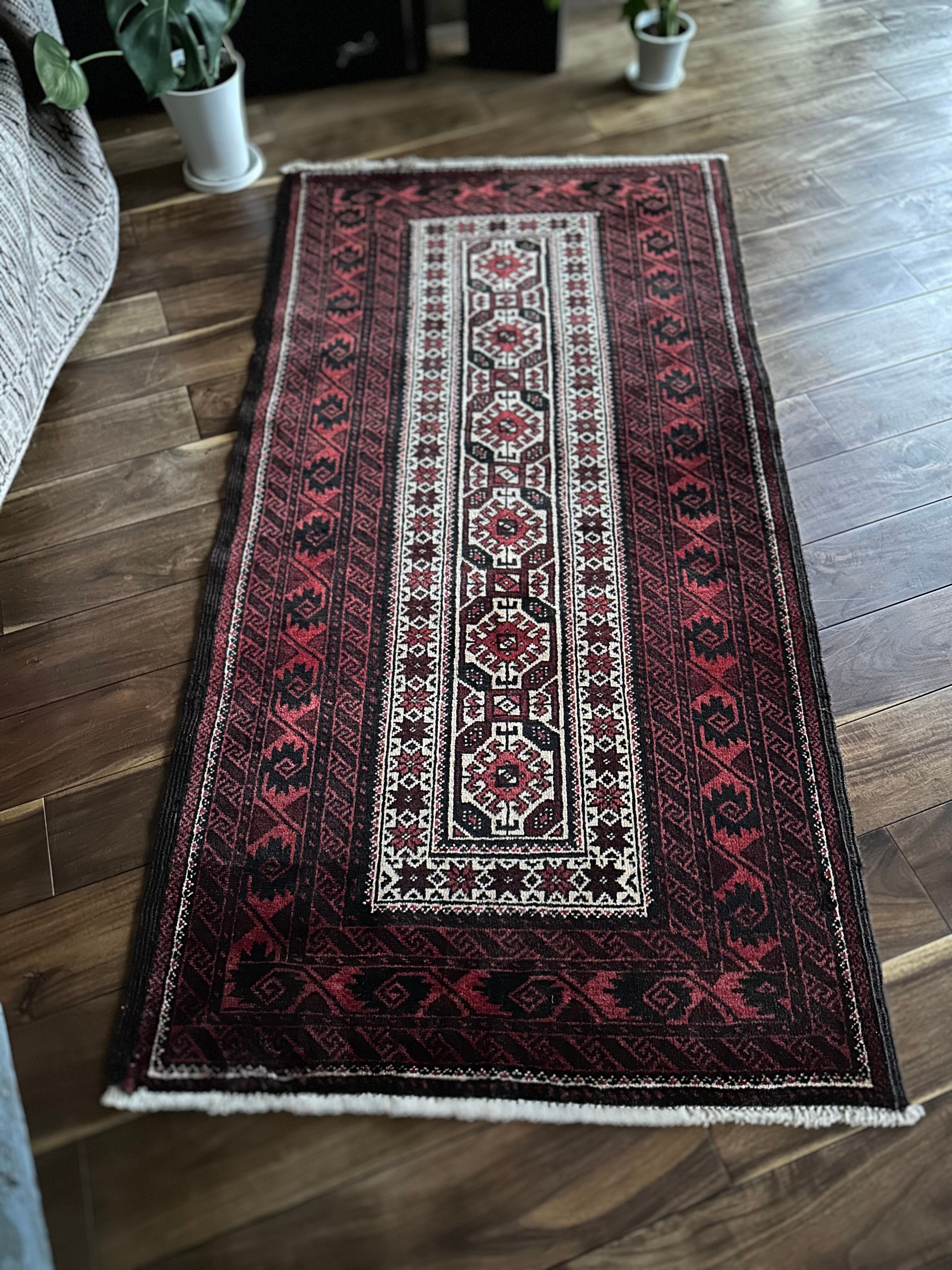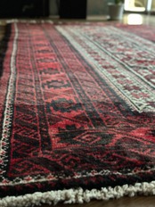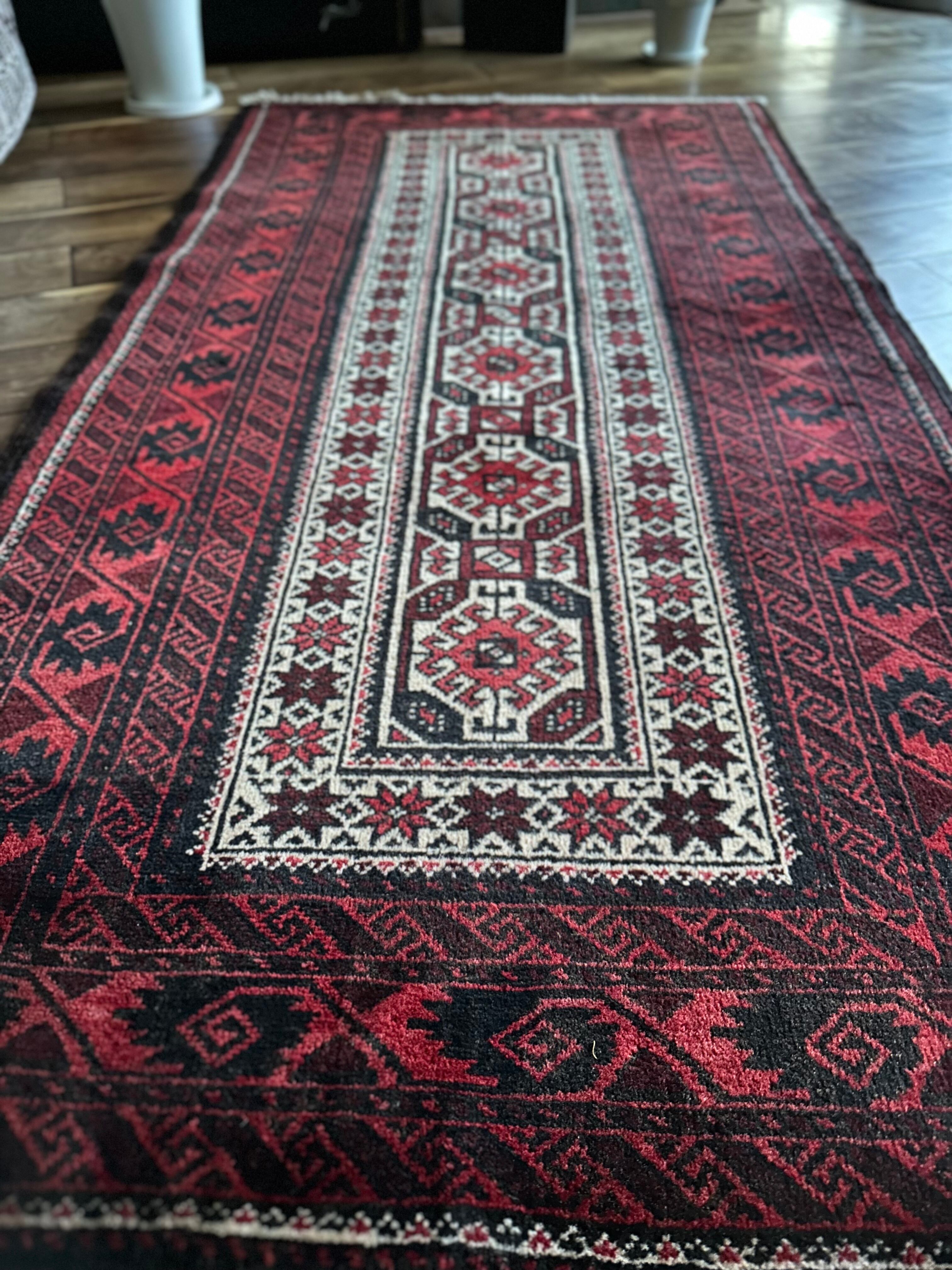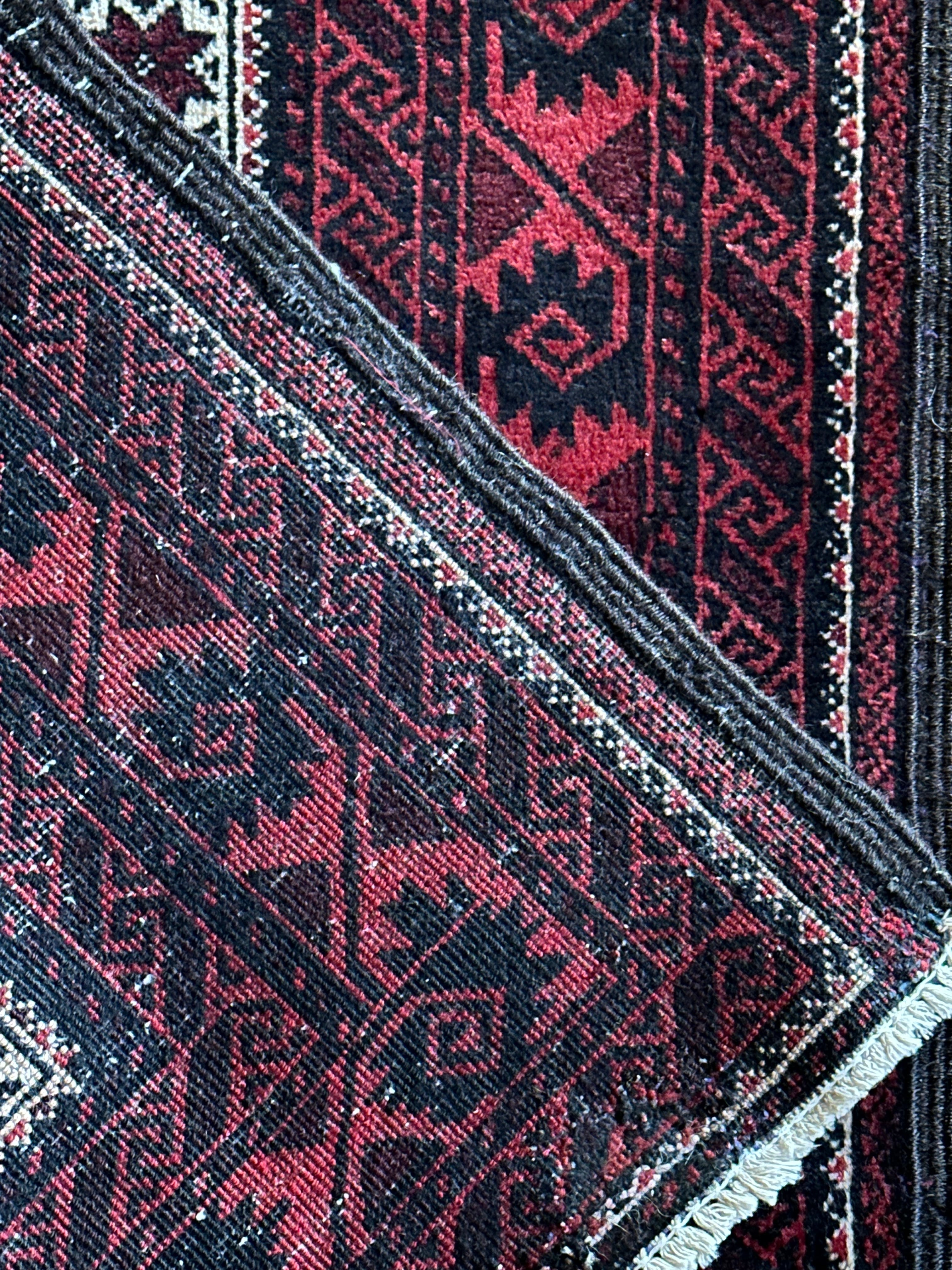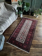 中央部分に見られる雄牛の角に見立てたフックドメダリオンの連続紋様がカッコいいバルーチ族のトライバルラグになります。