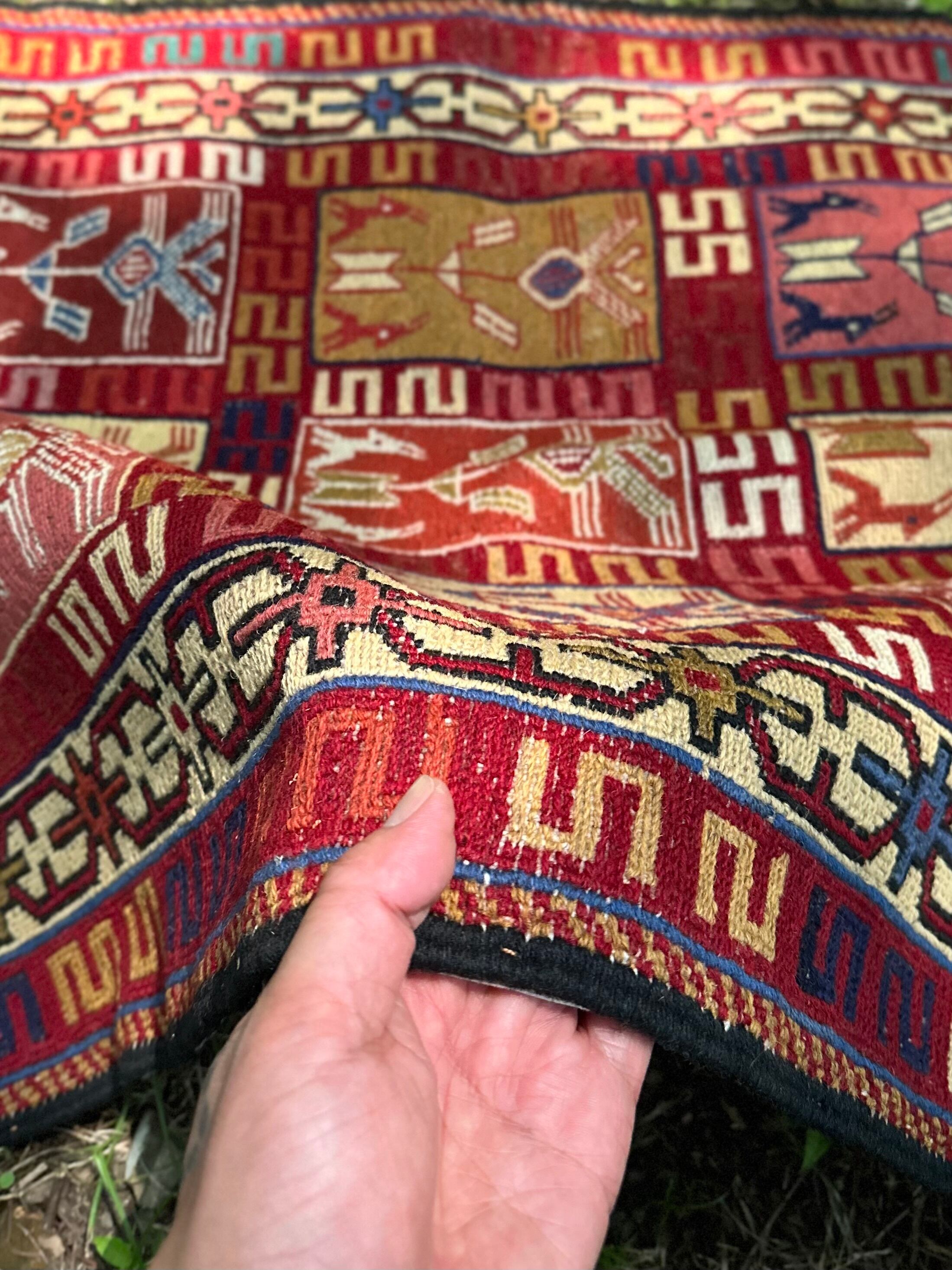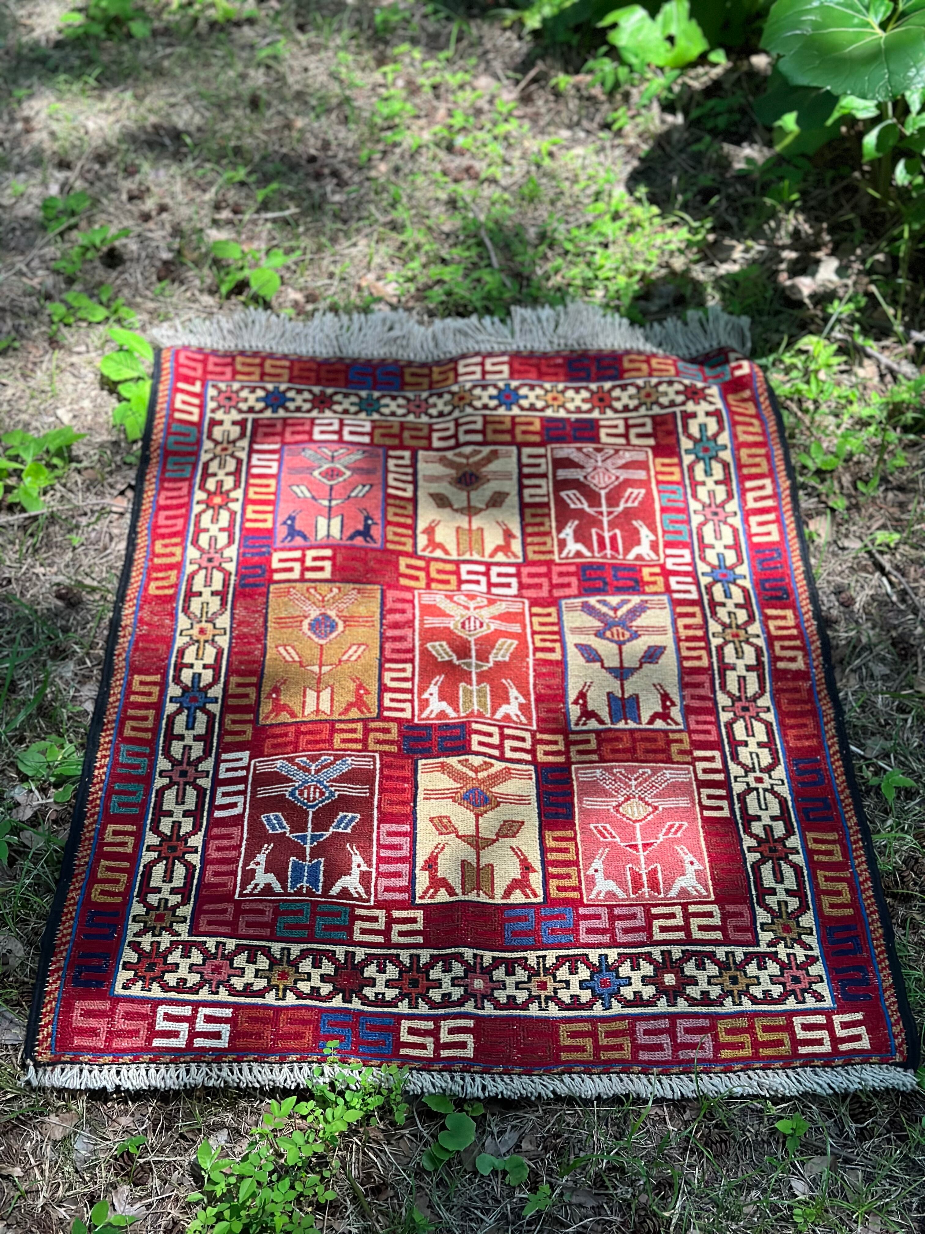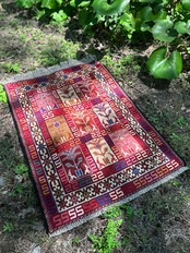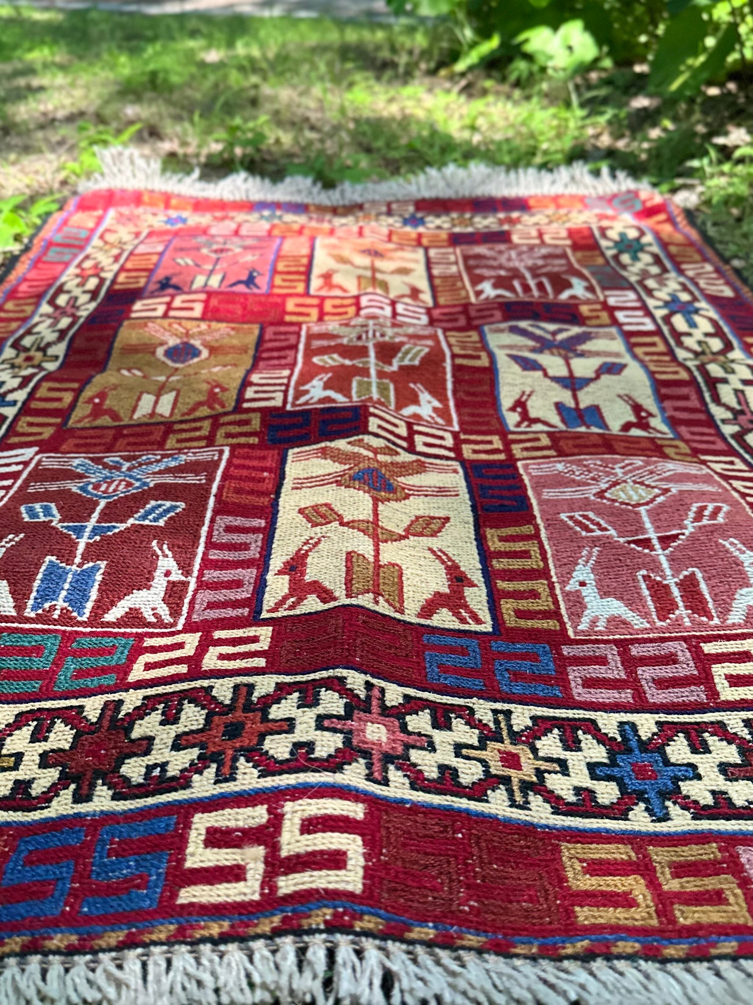 複雑なスマック織りが伝統的なこの地方ならではのキリムですが、小さなコースターサイズを見かける方も多いでしょうか、こちら植物と可愛らしい動物がパネル柄に描かれた1枚でタペストリーとして壁に飾るのも良いですね。