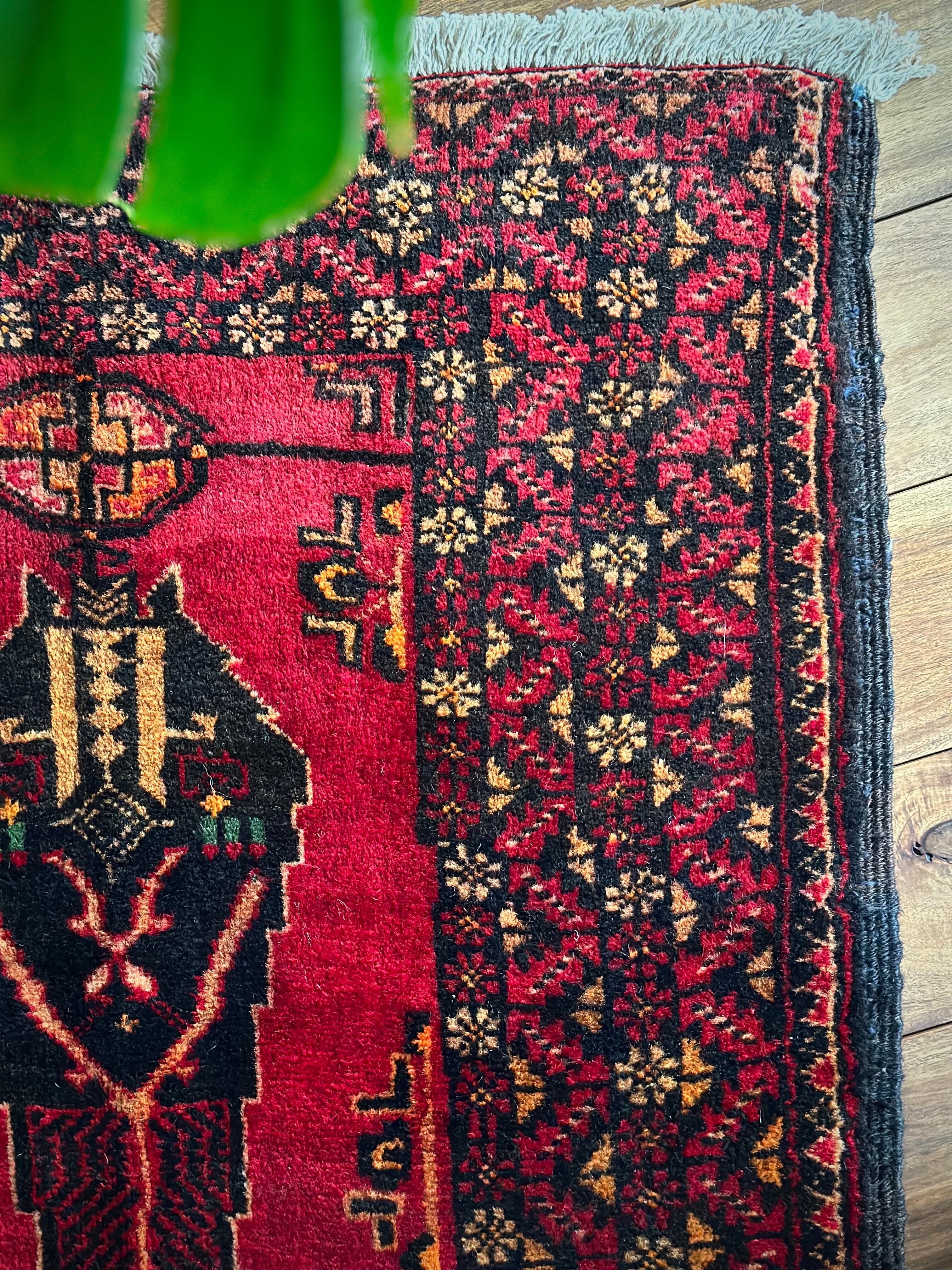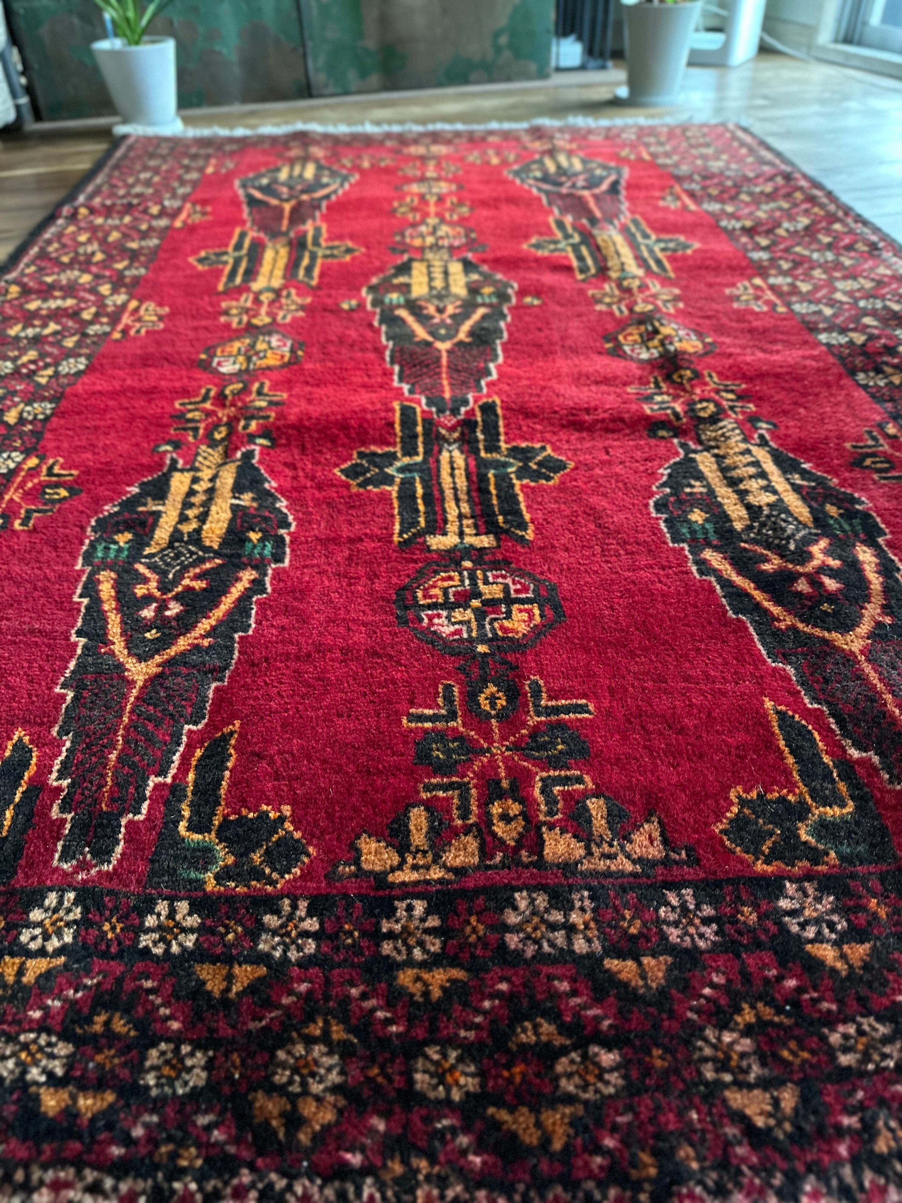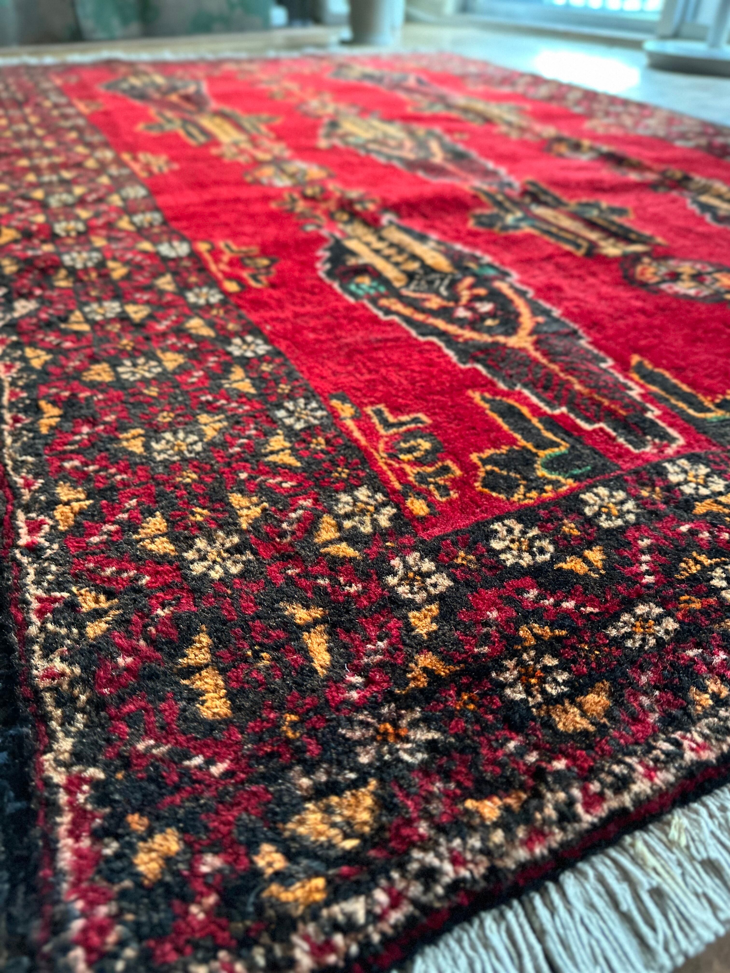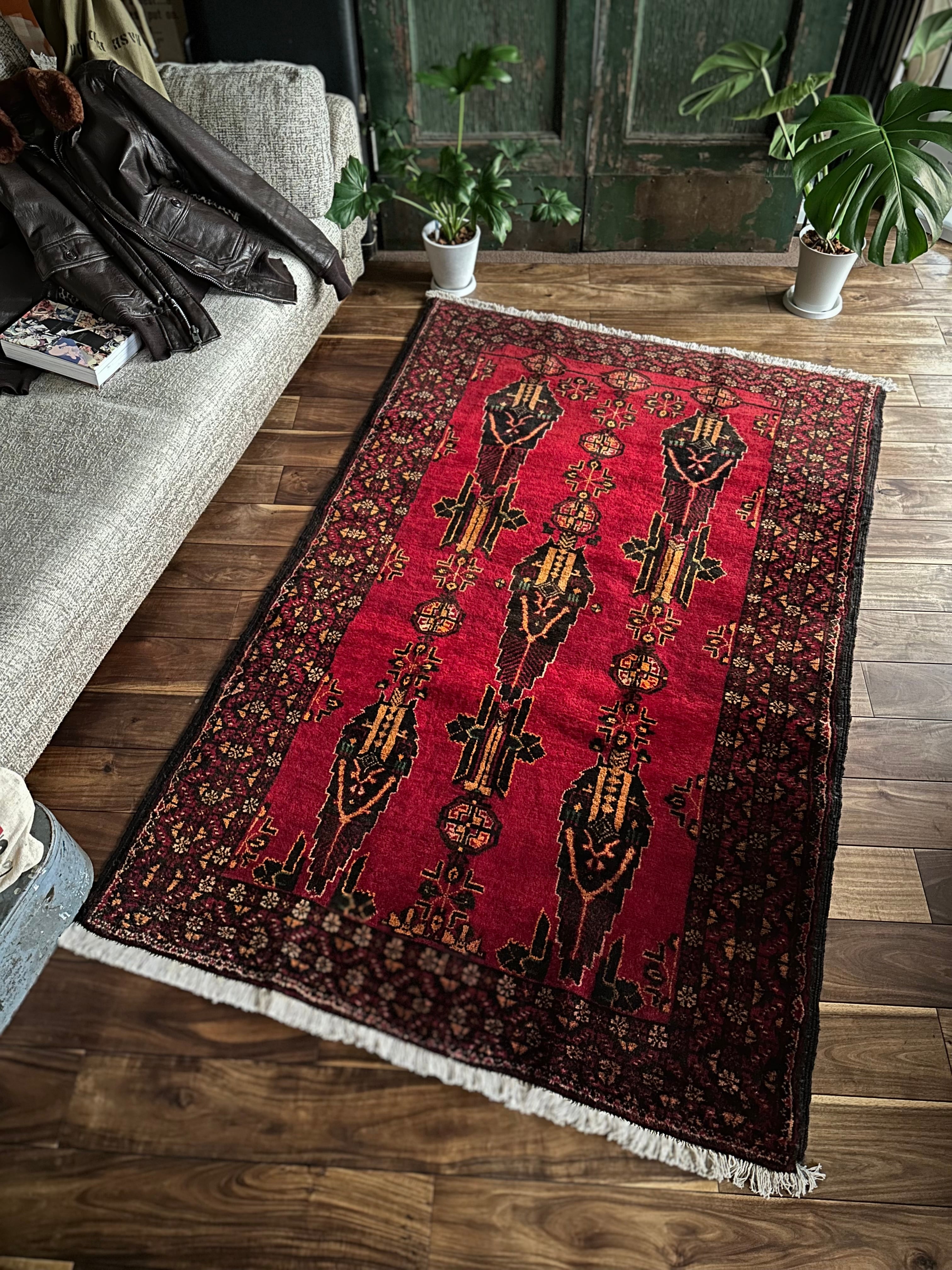 シャイニーなレッドにイエローとグリーンが織り混ざった色合いが、何故かラスタカラーを連想させるバルーチ族のトライバルラグになります。