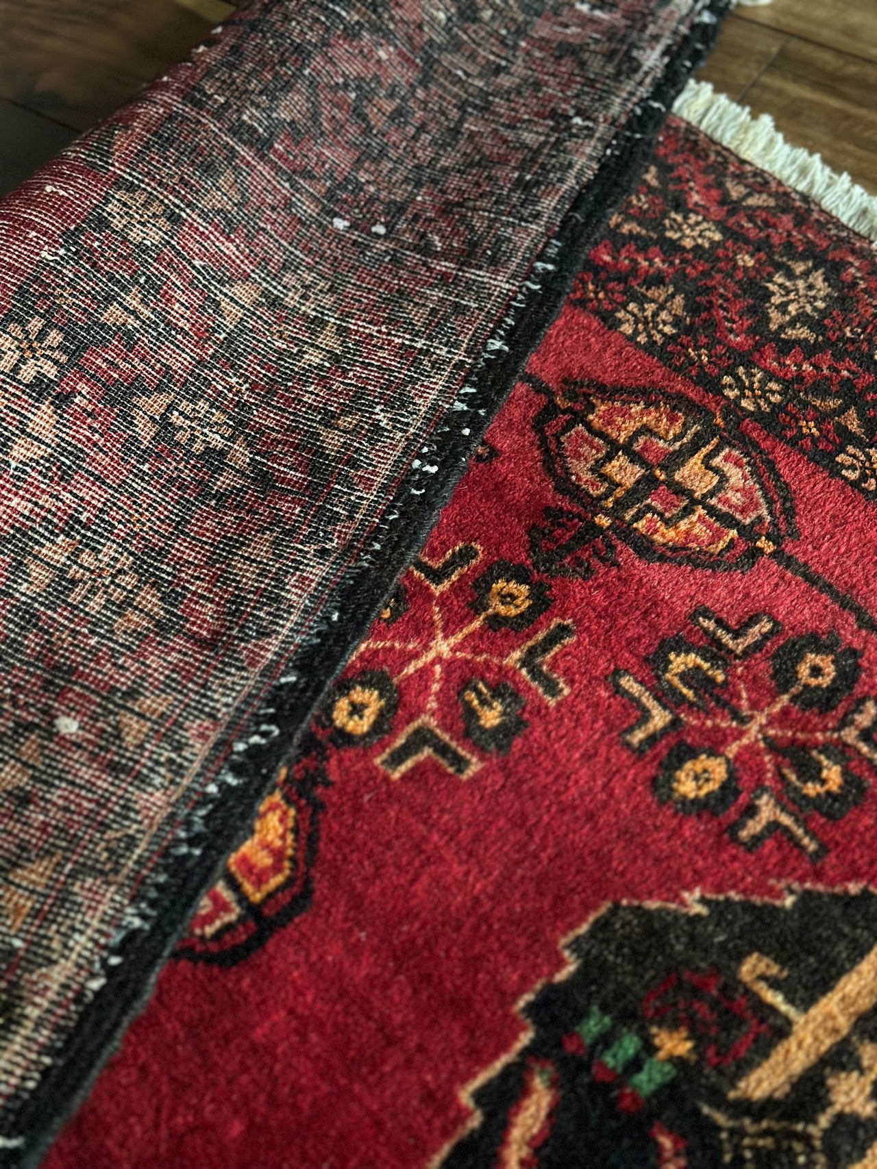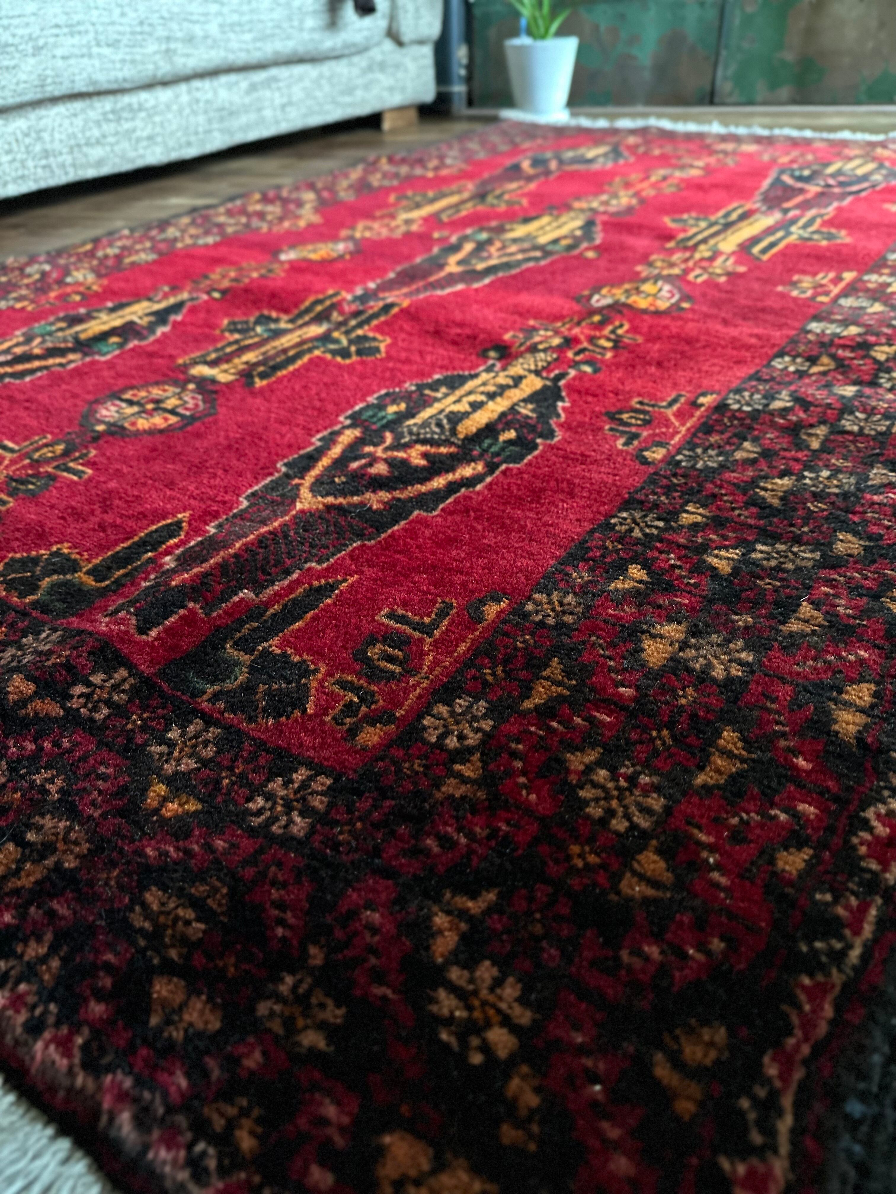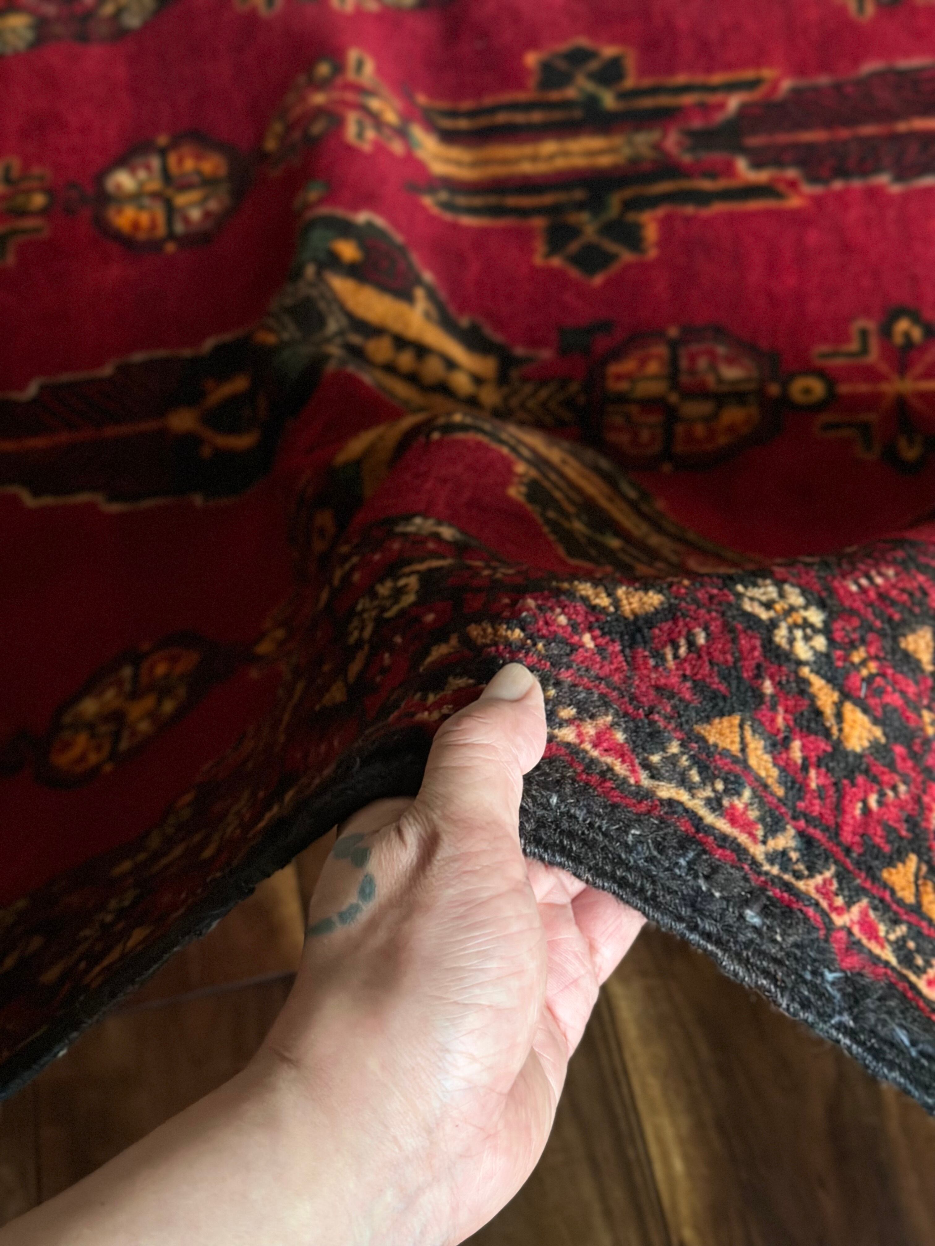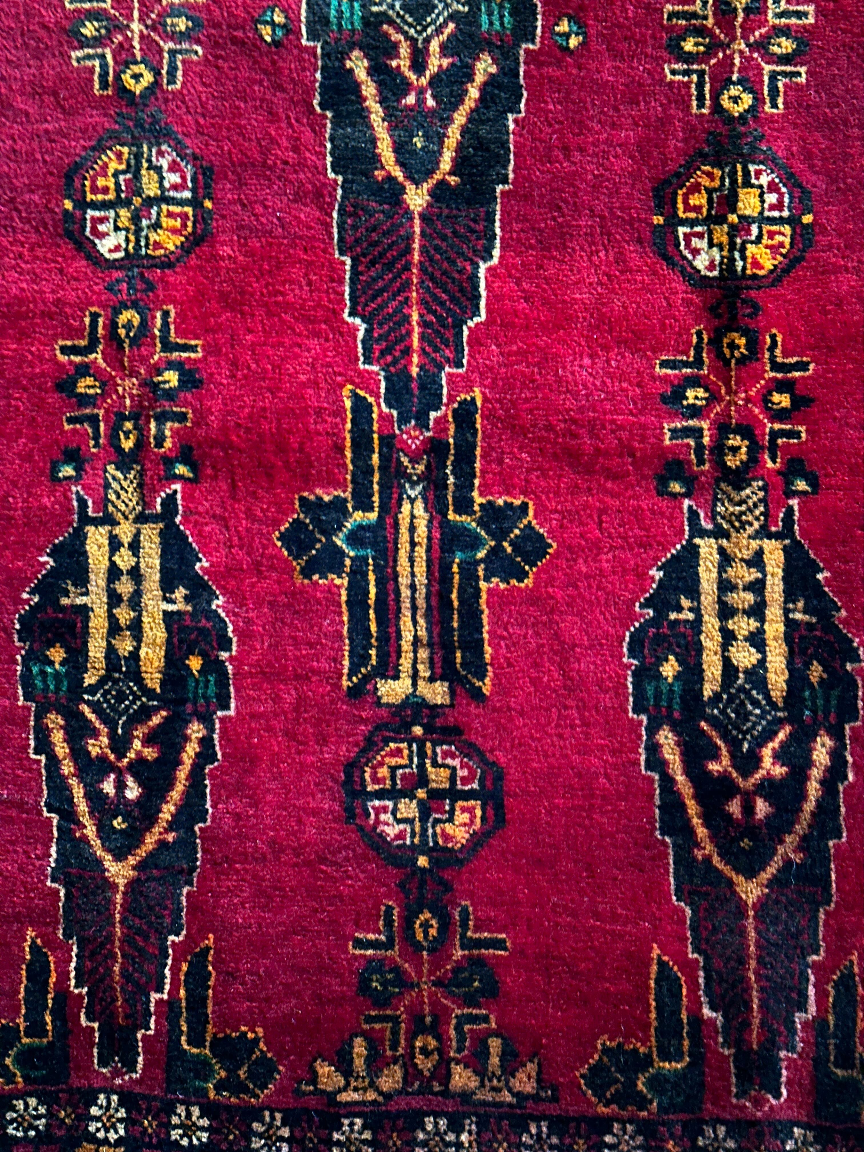 シャイニーなレッドにイエローとグリーンが織り混ざった色合いが、何故かラスタカラーを連想させるバルーチ族のトライバルラグになります。