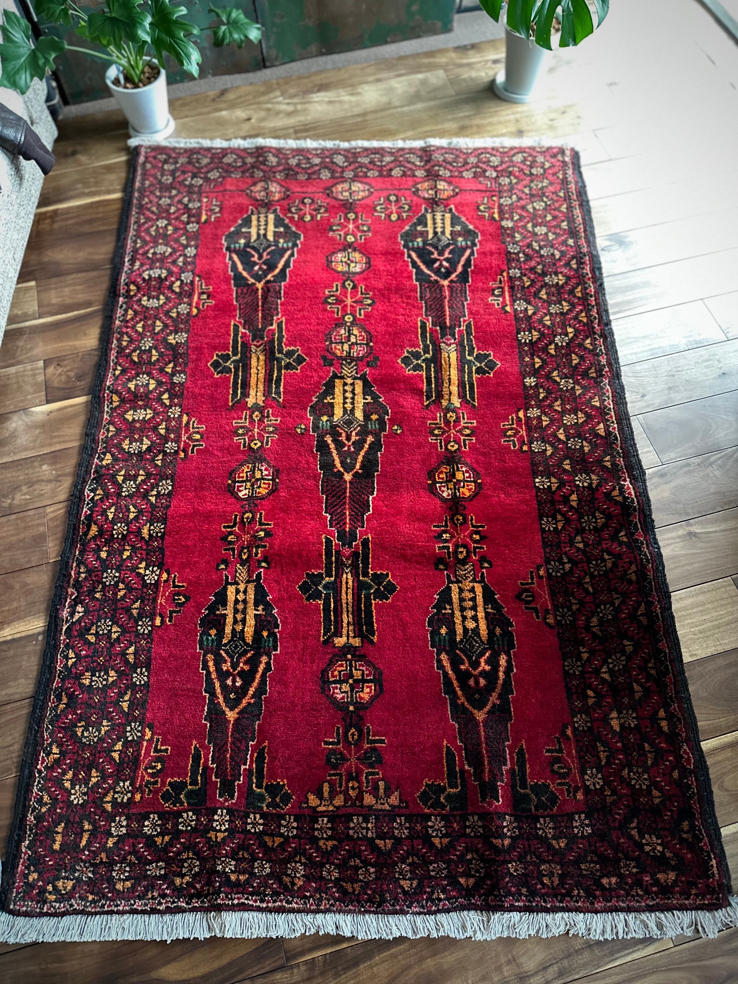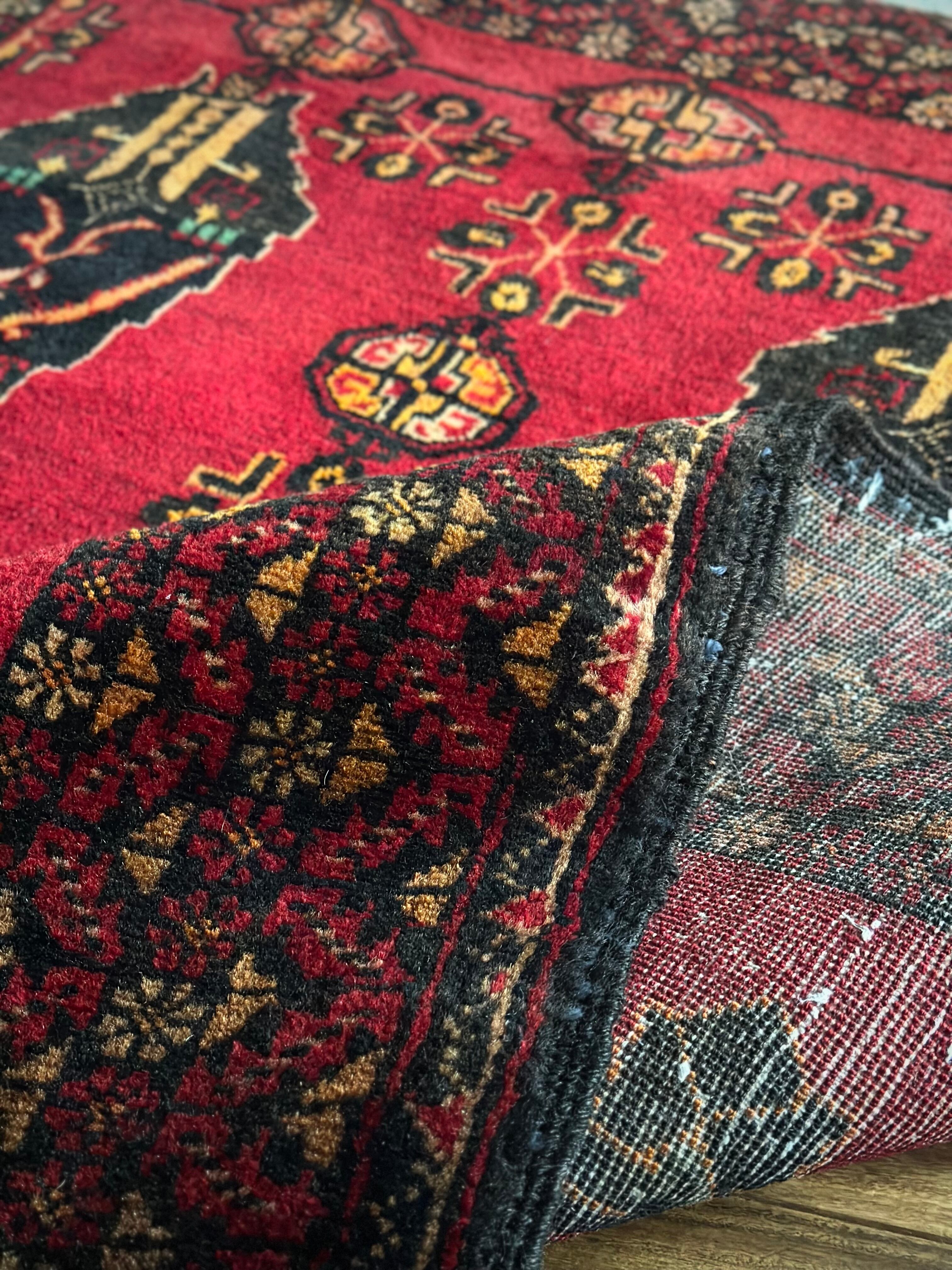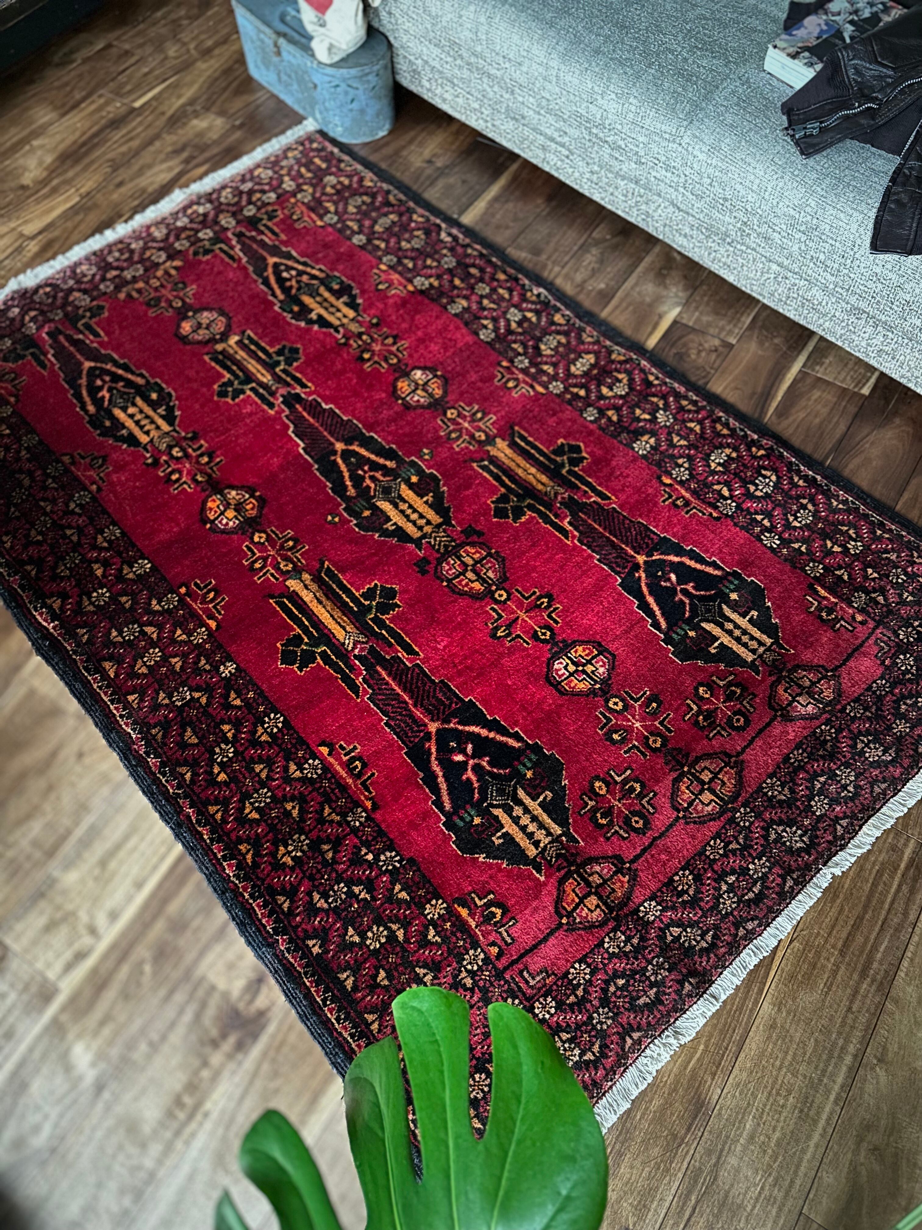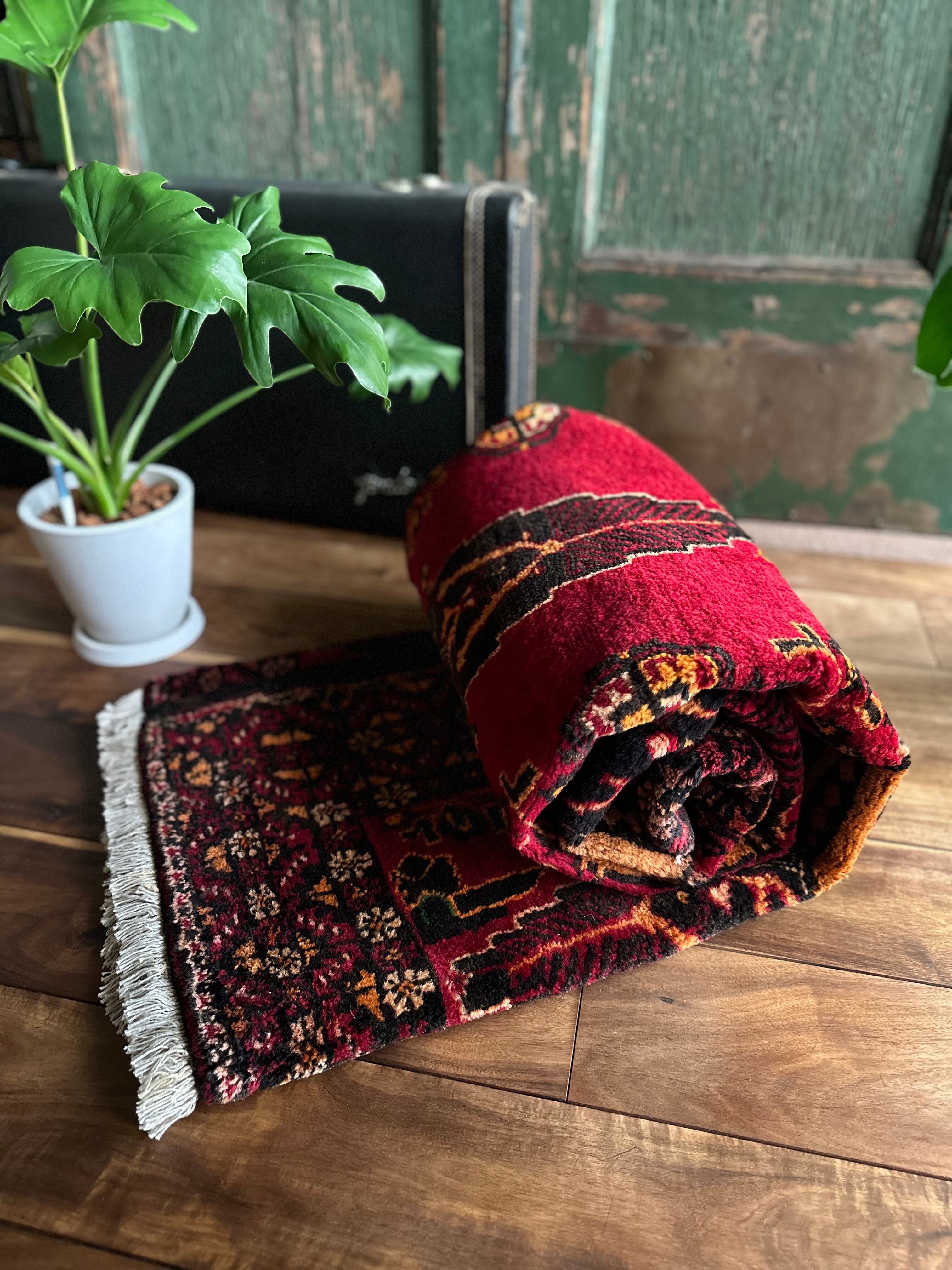 シャイニーなレッドにイエローとグリーンが織り混ざった色合いが、何故かラスタカラーを連想させるバルーチ族のトライバルラグになります。