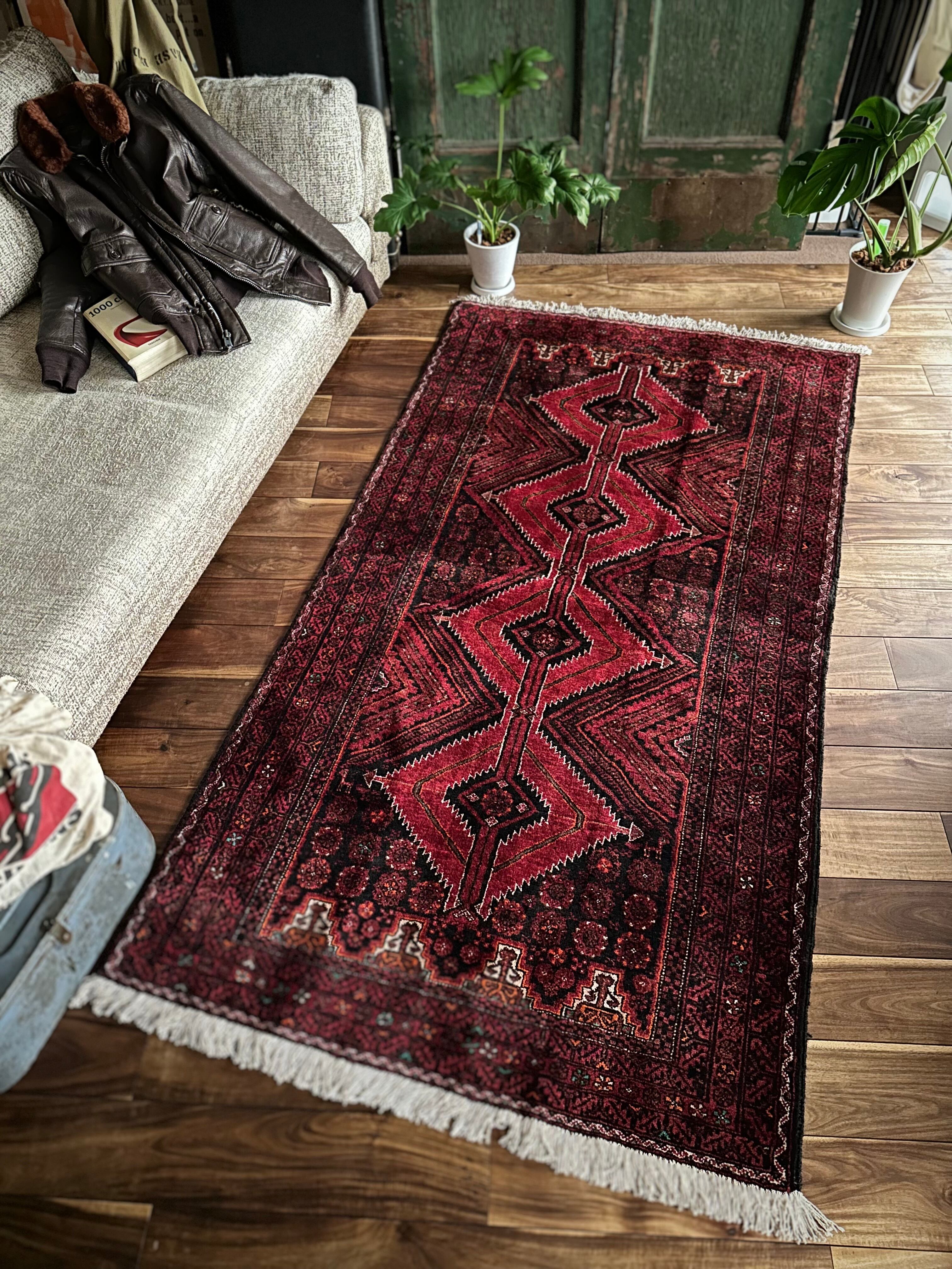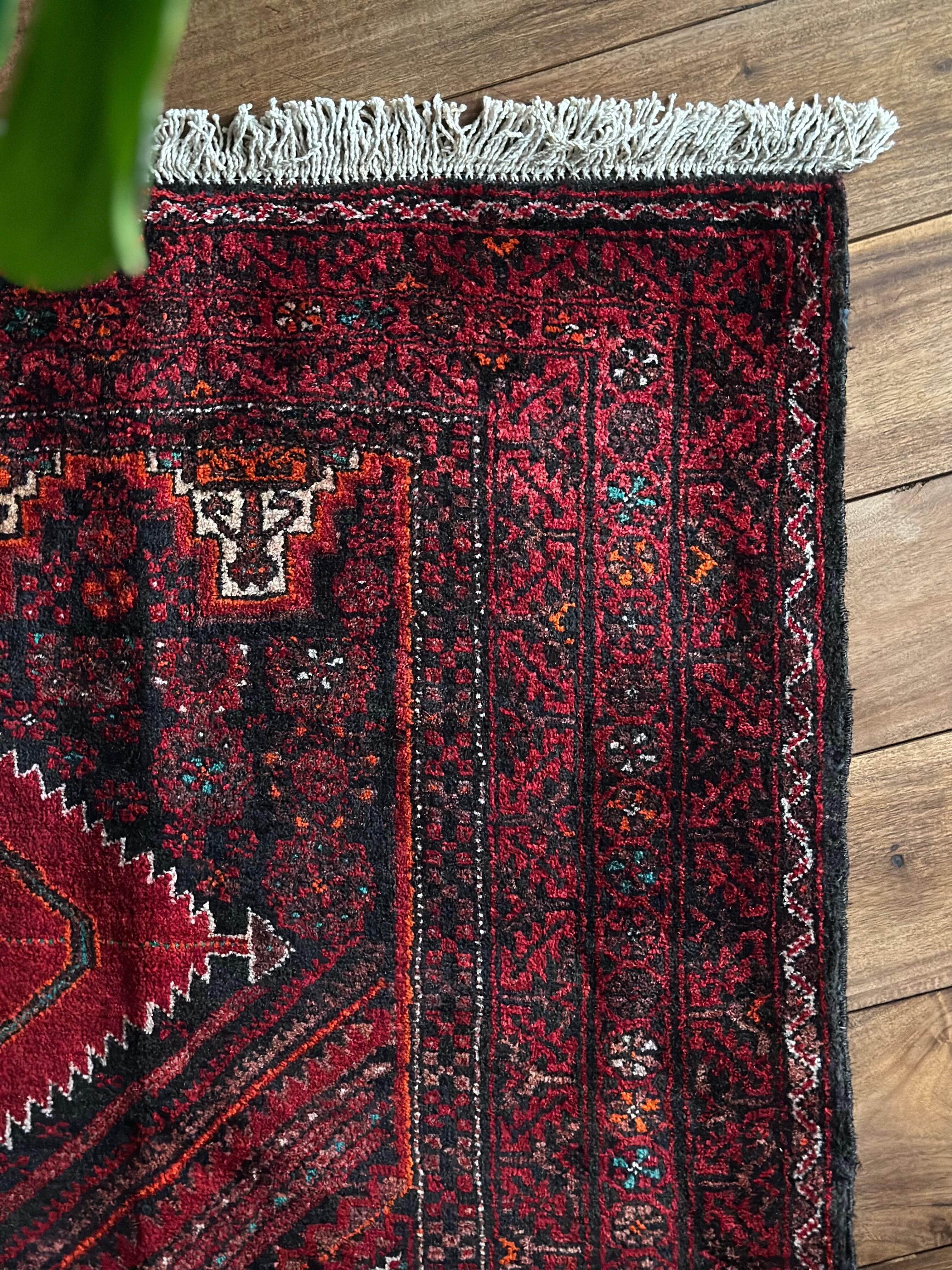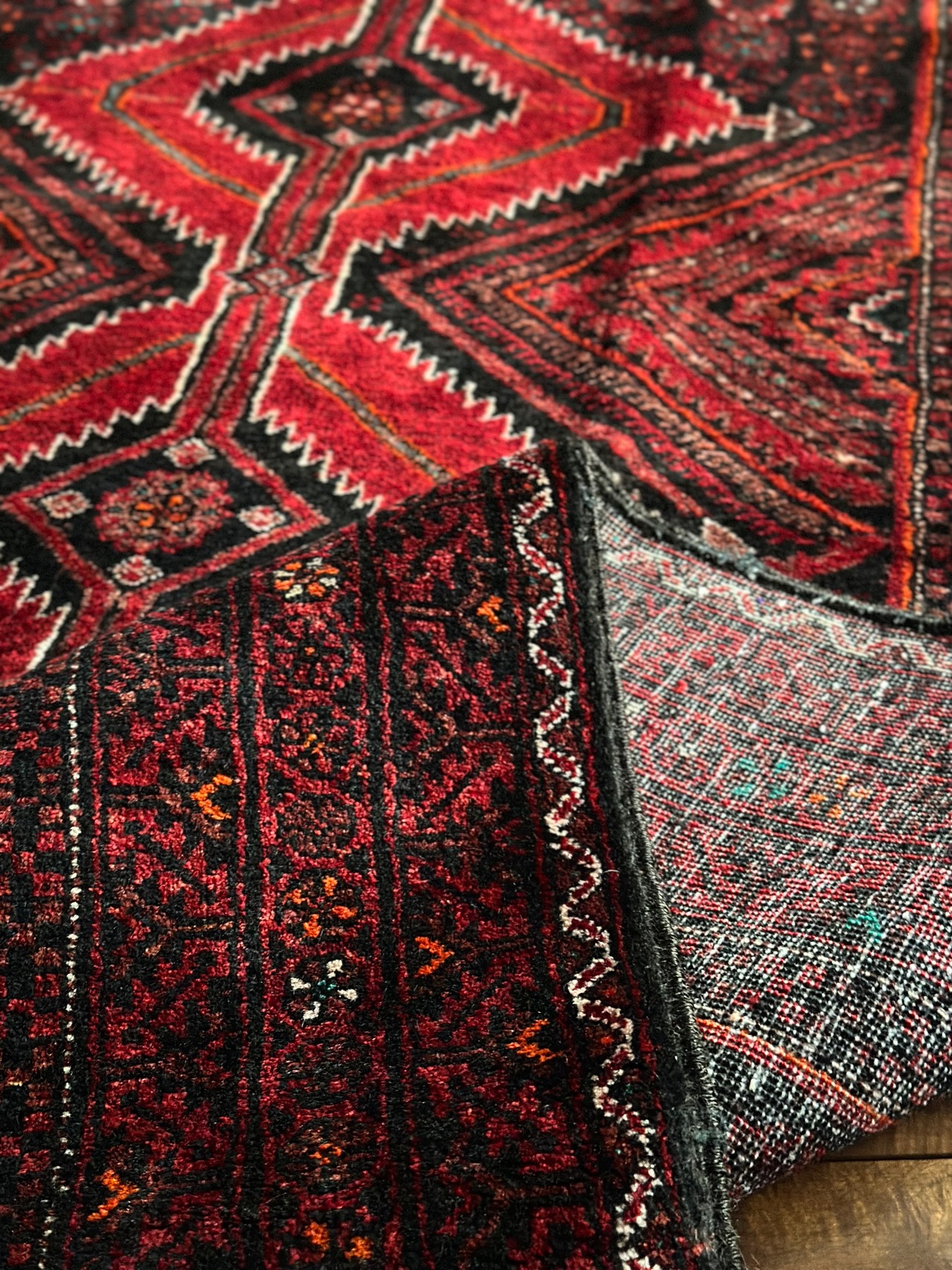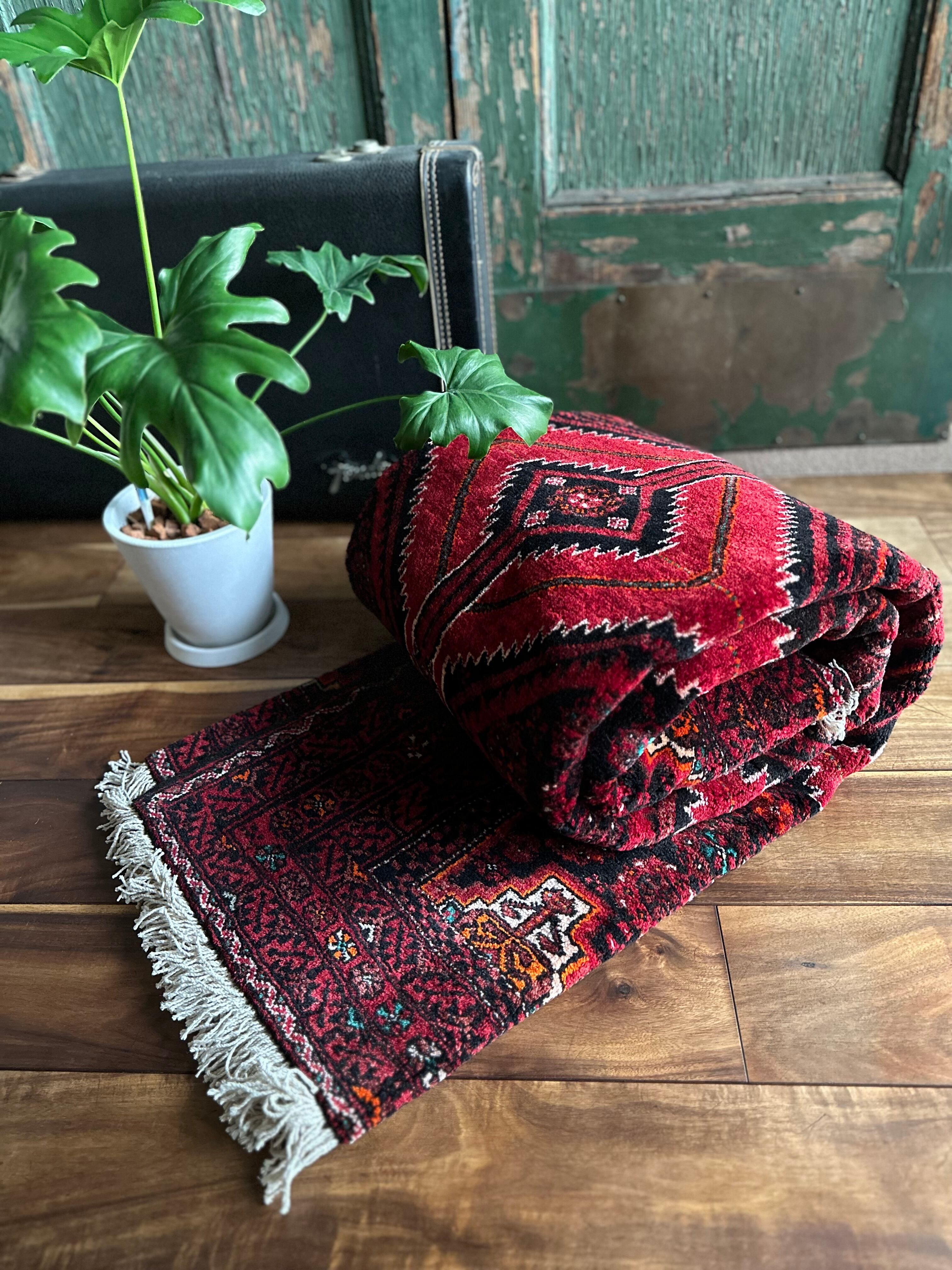 なんとも形容し難い漆黒のブラック&レッドが男前でカッコいいバルーチ族のトライバルラグになります。