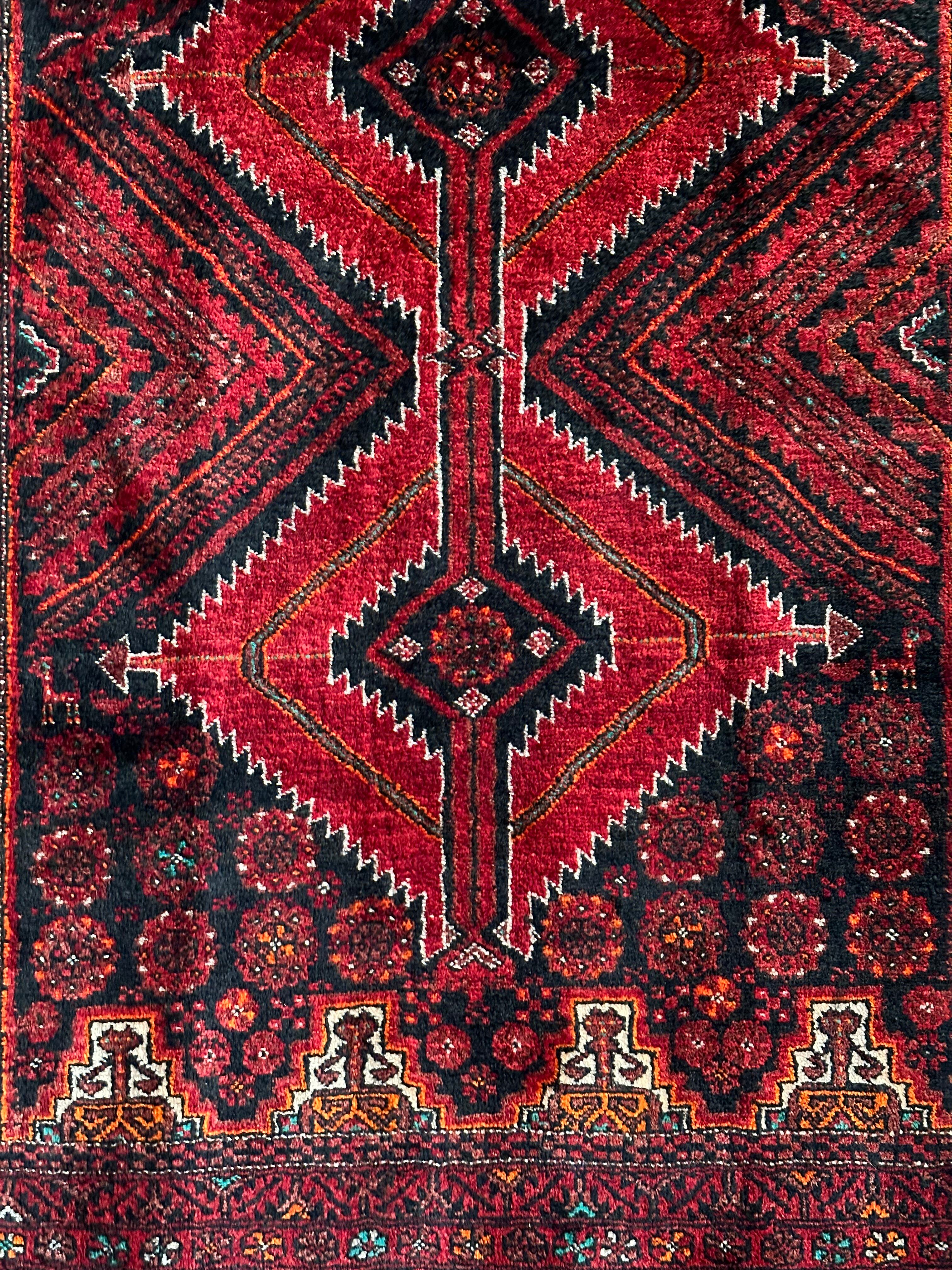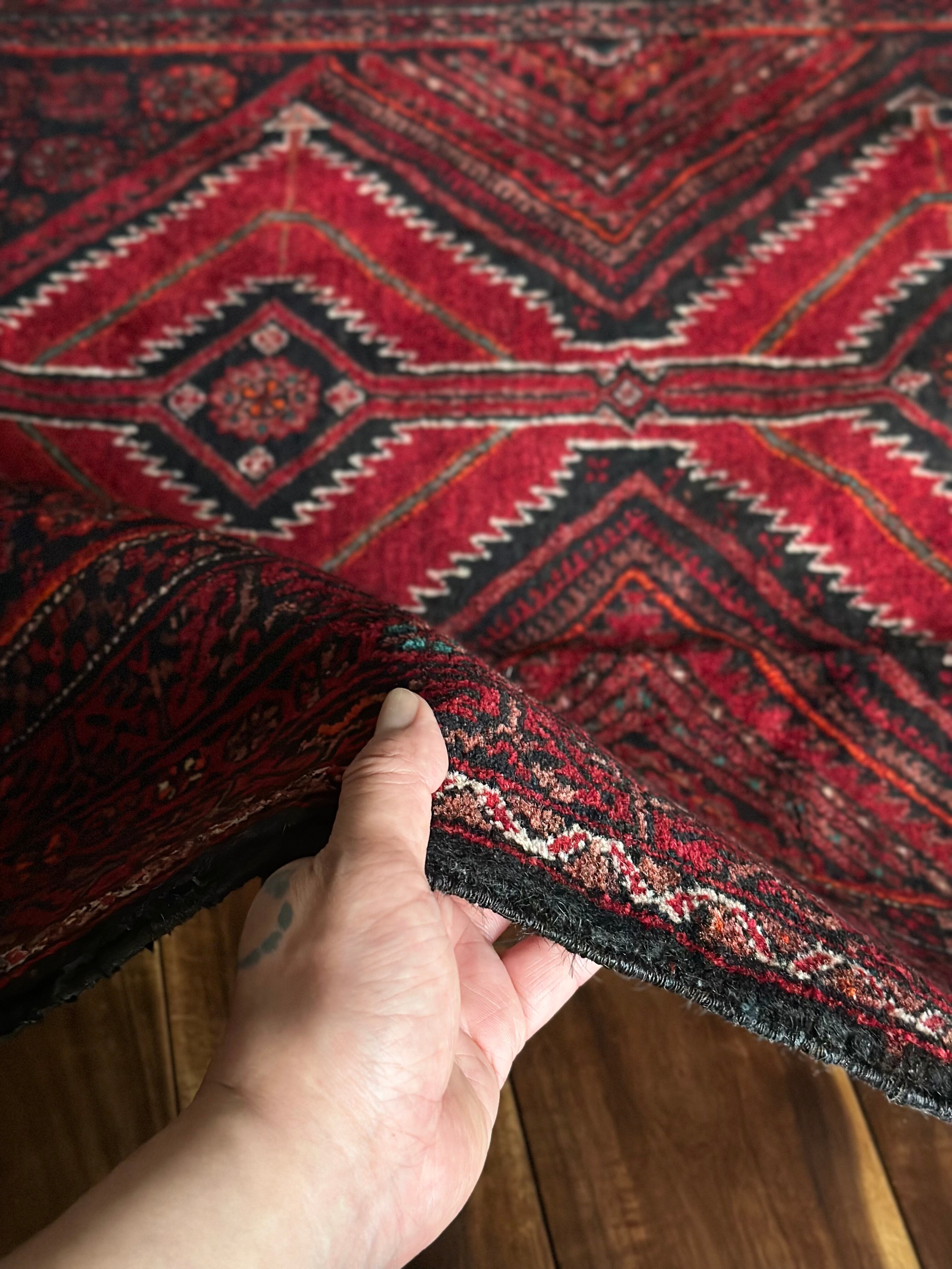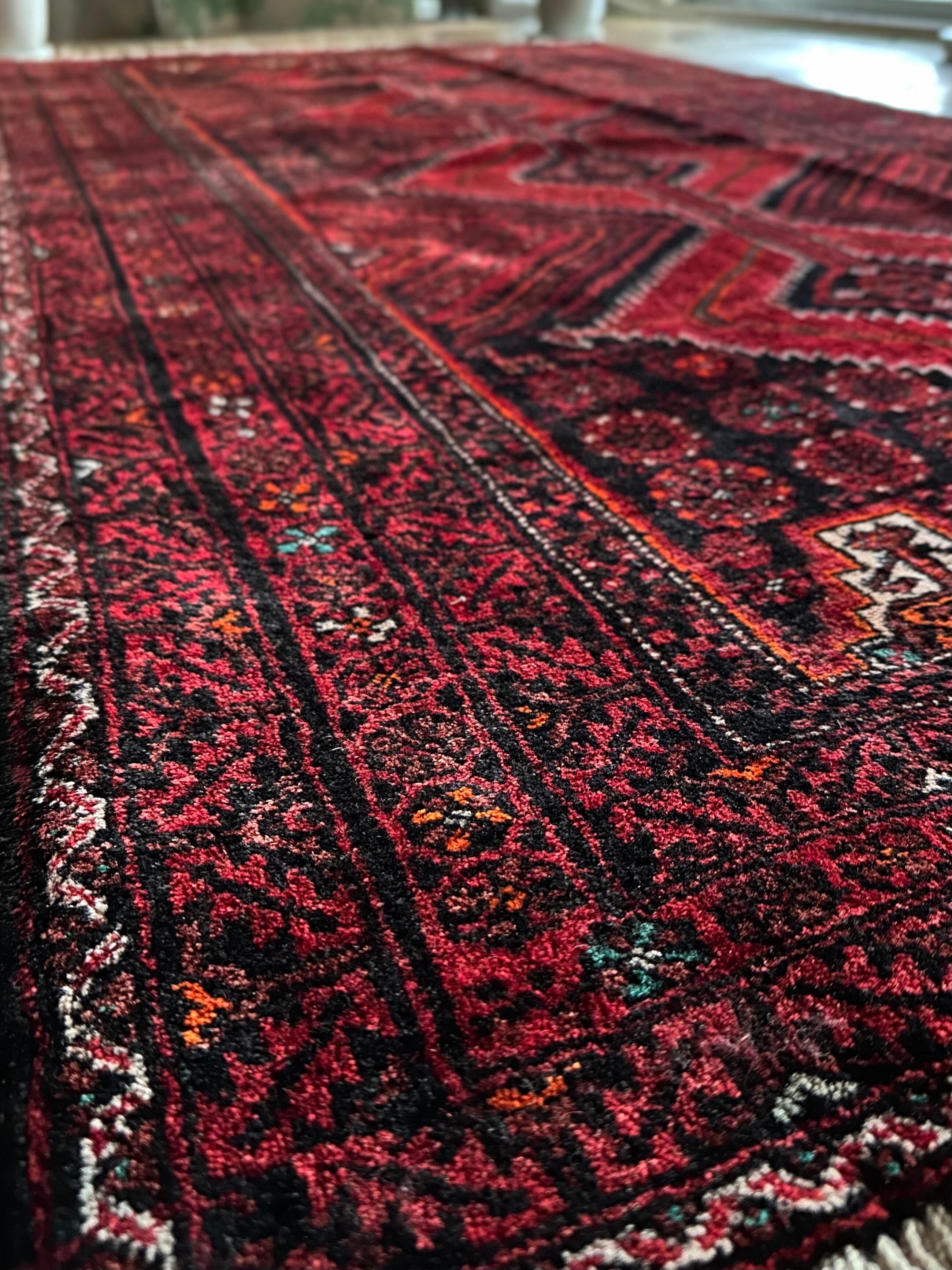 なんとも形容し難い漆黒のブラック&レッドが男前でカッコいいバルーチ族のトライバルラグになります。