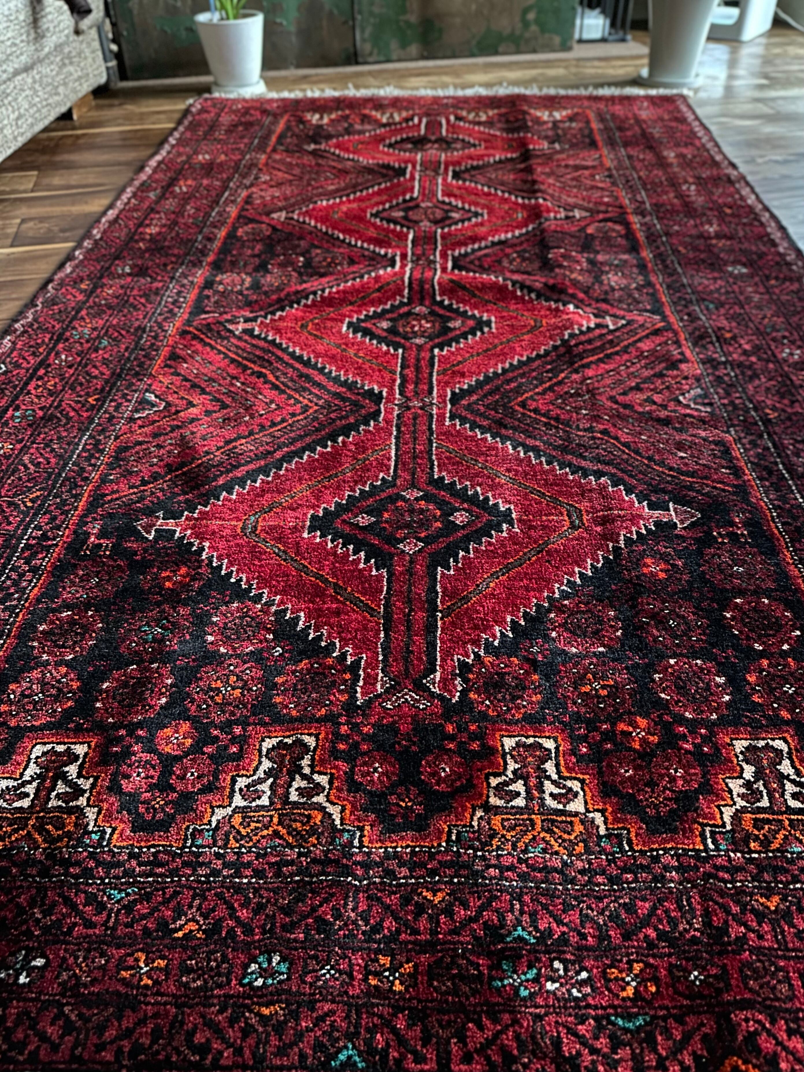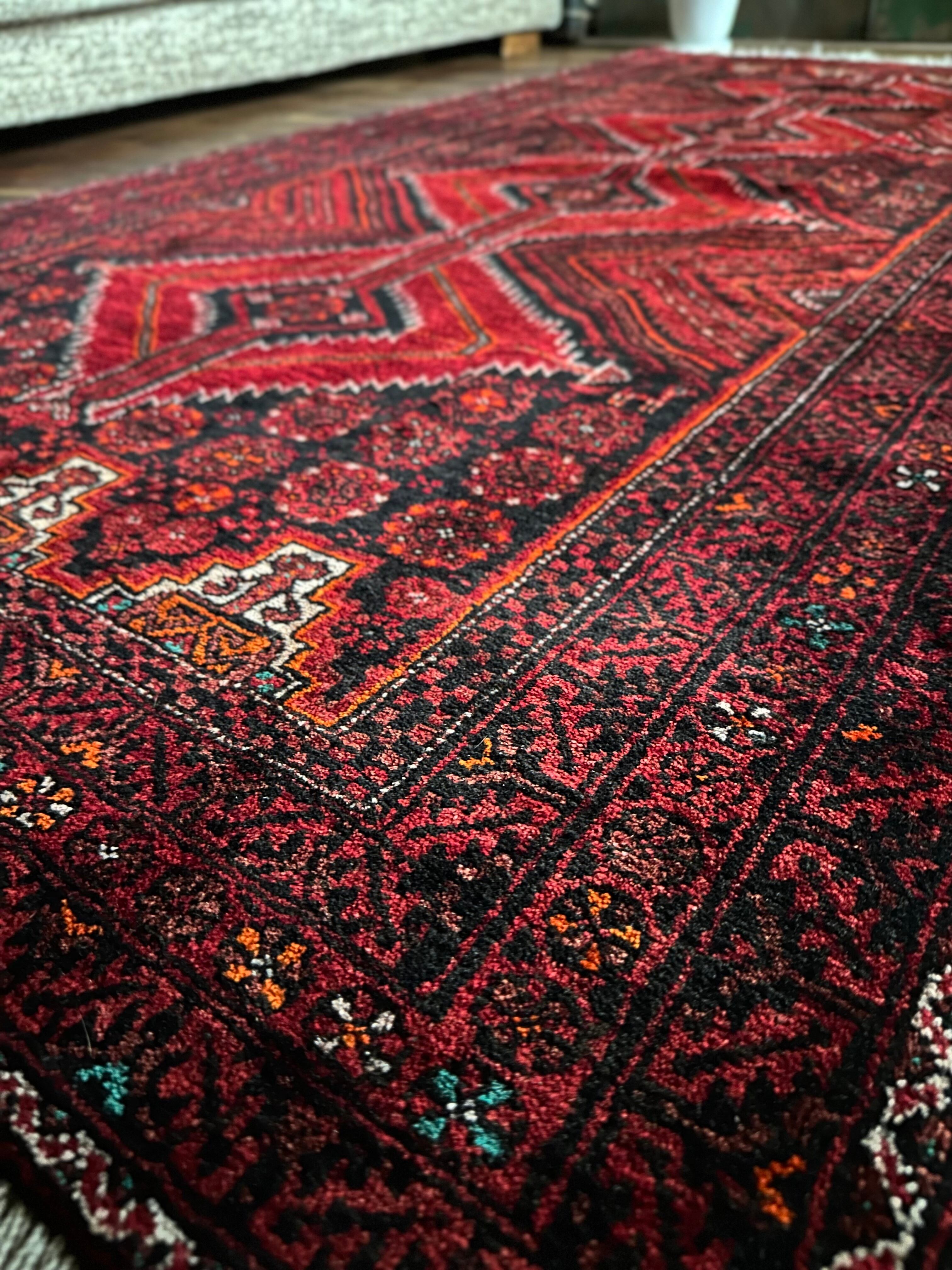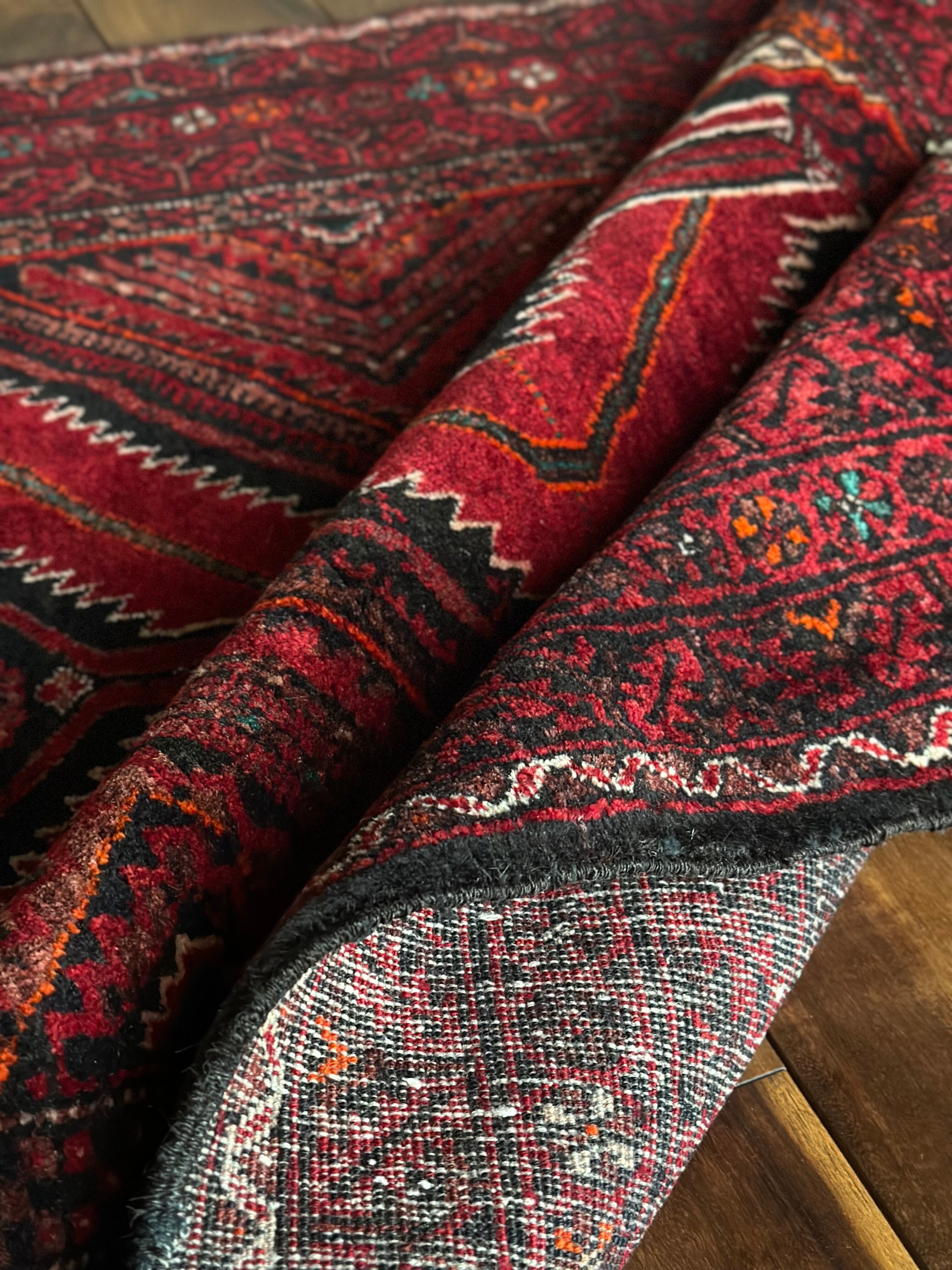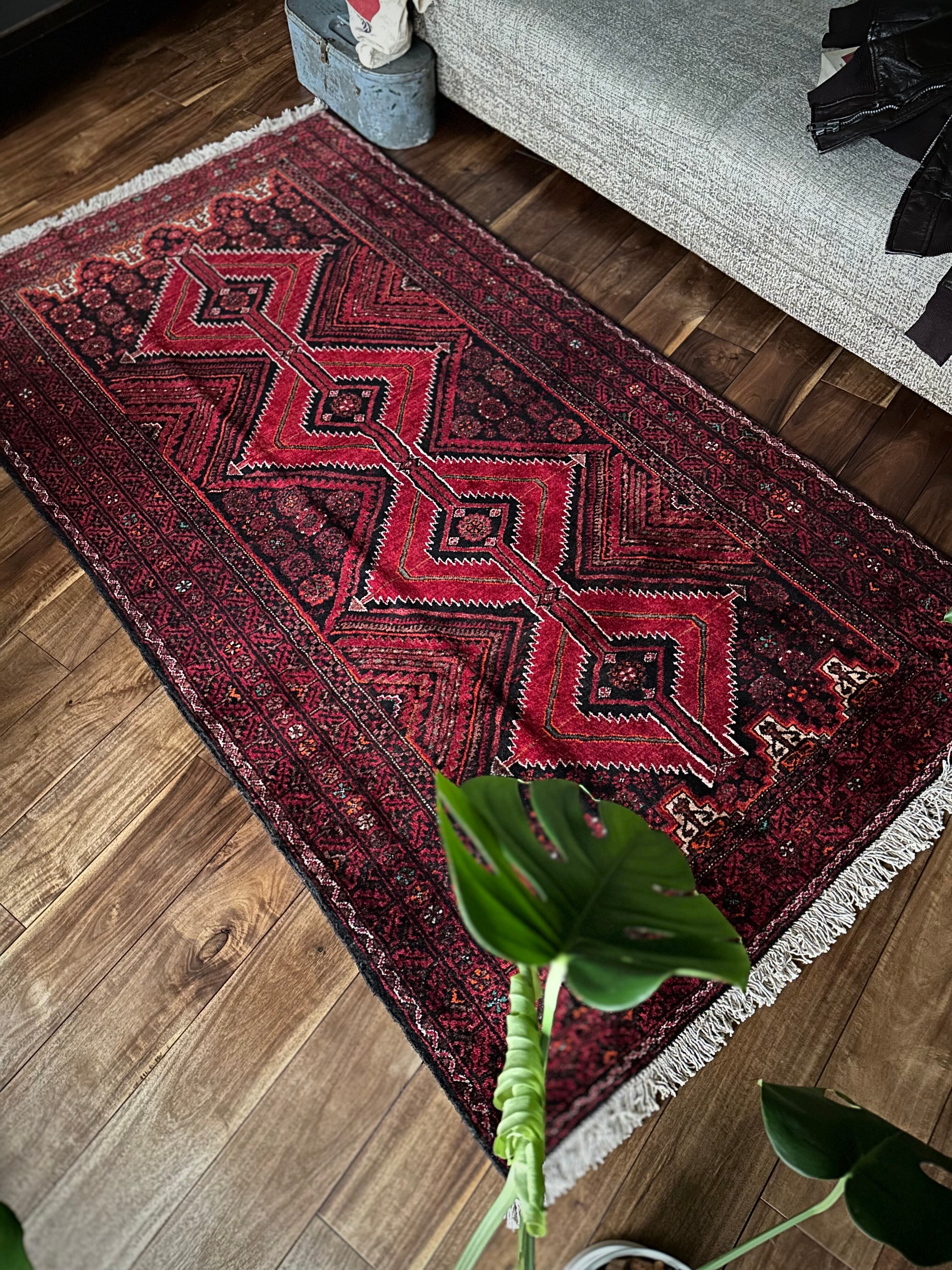 なんとも形容し難い漆黒のブラック&レッドが男前でカッコいいバルーチ族のトライバルラグになります。