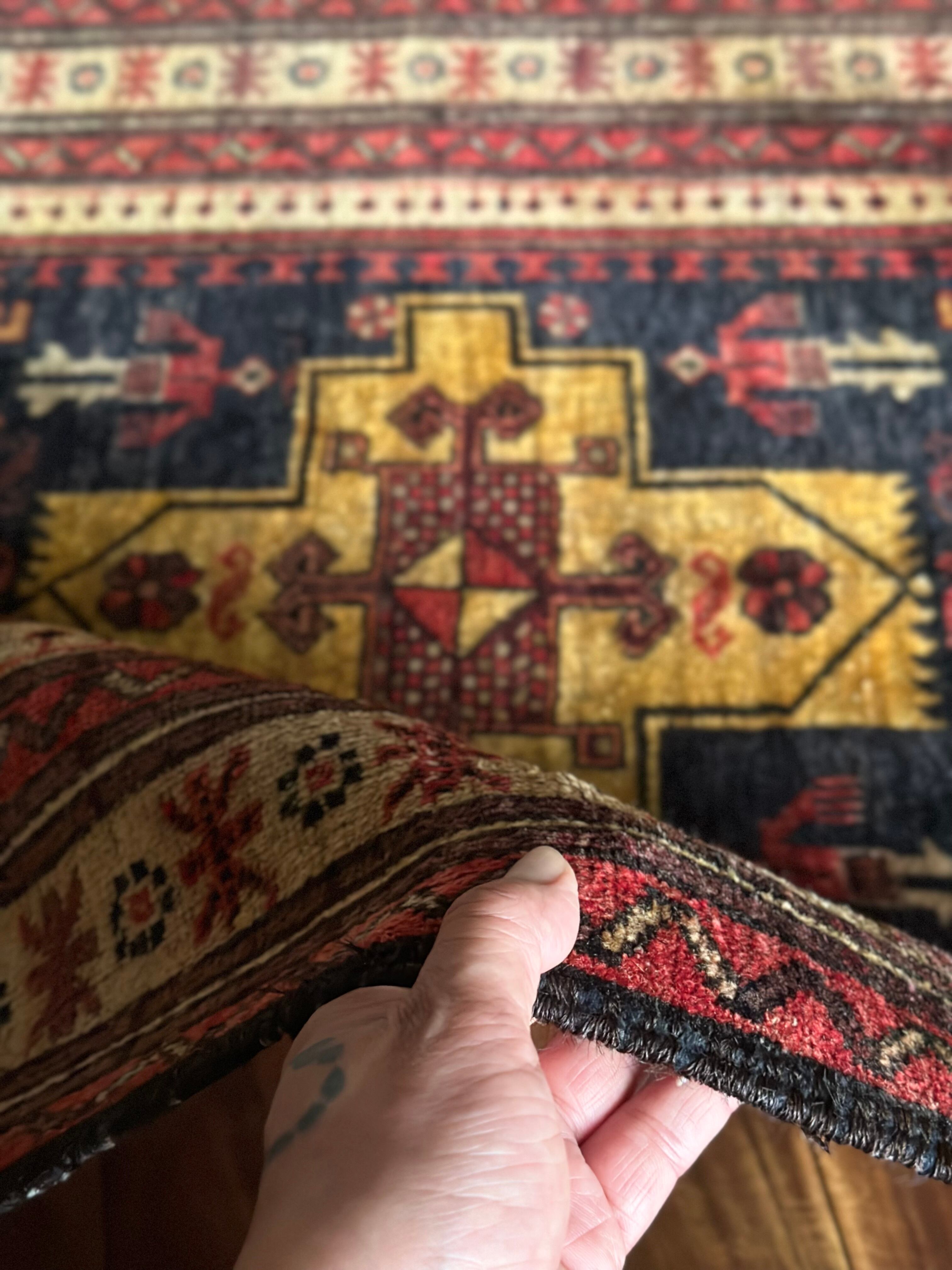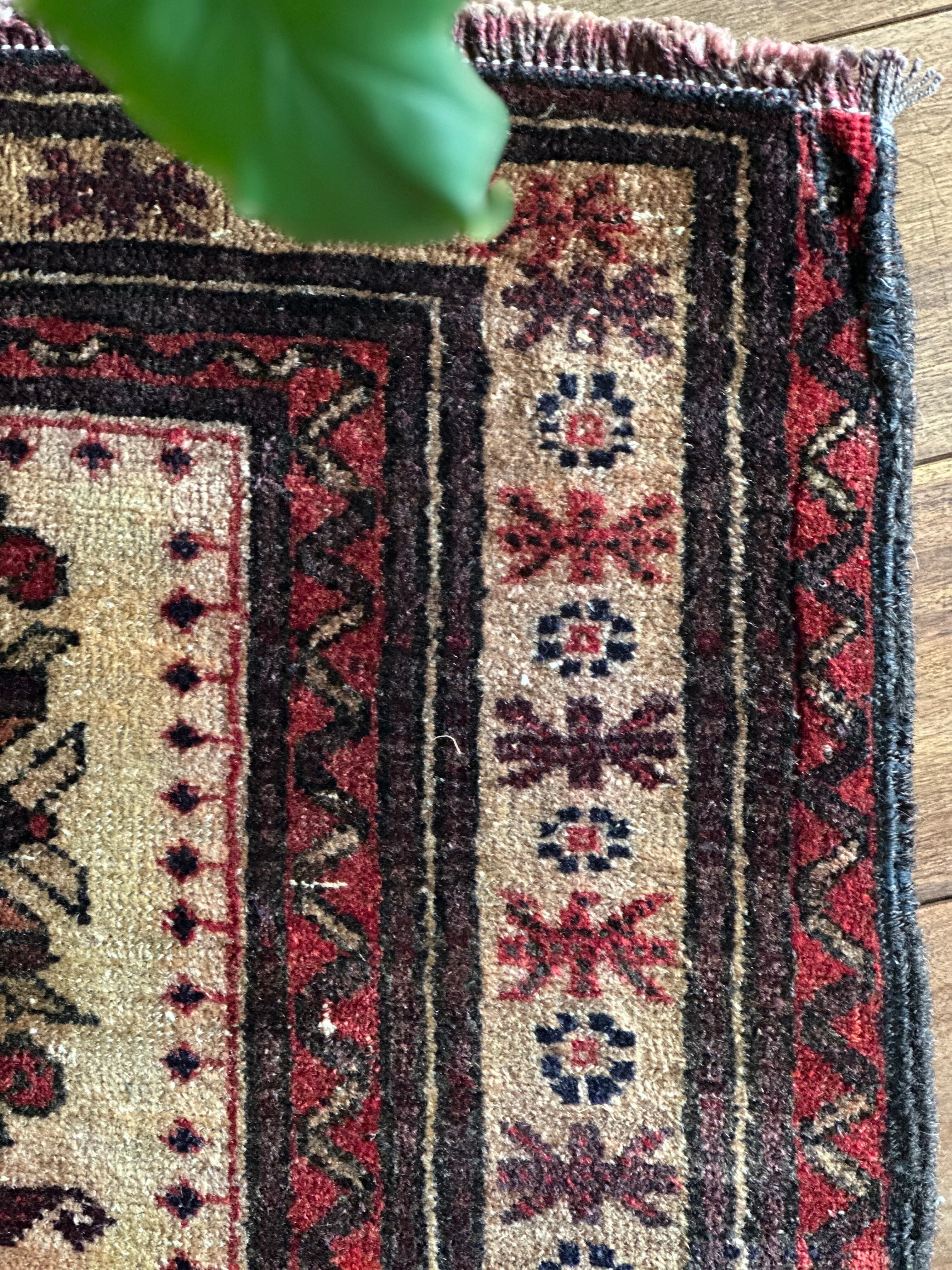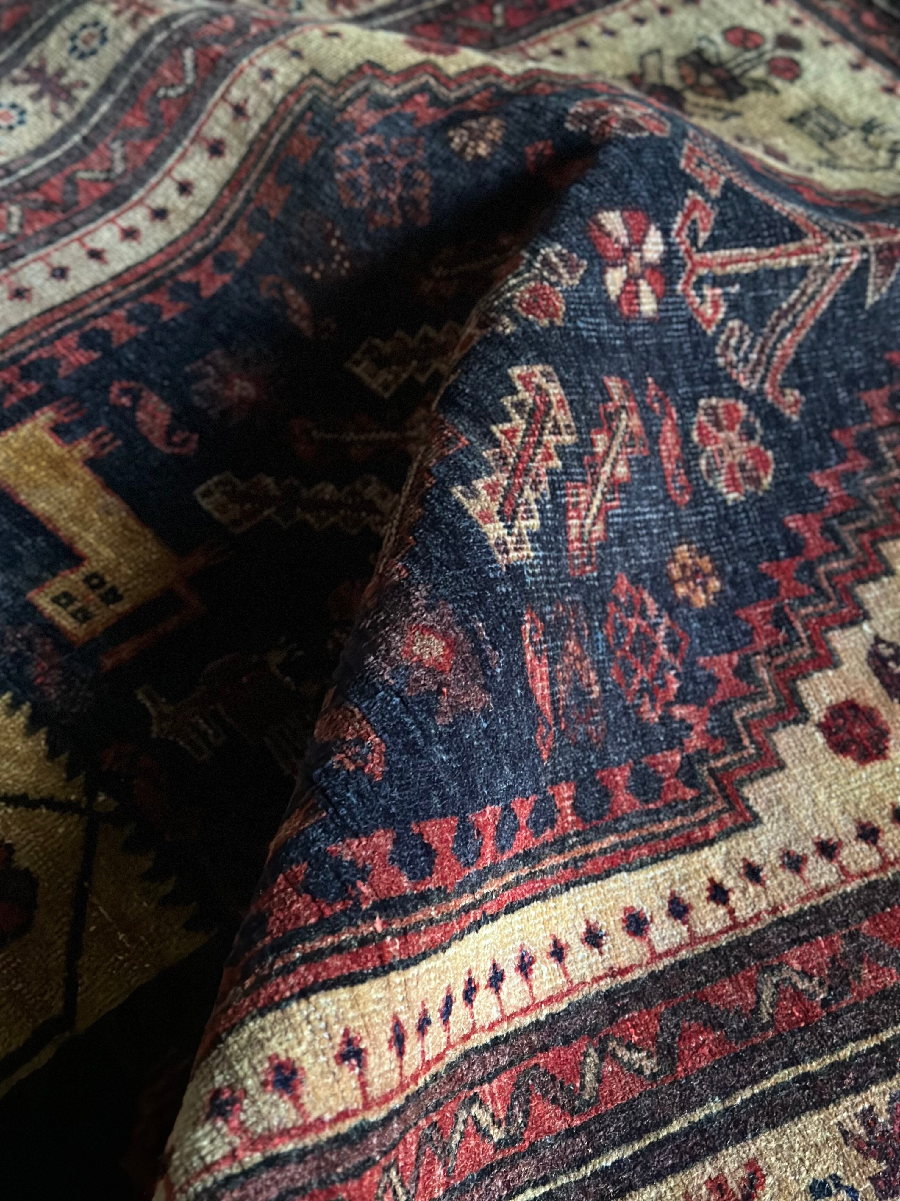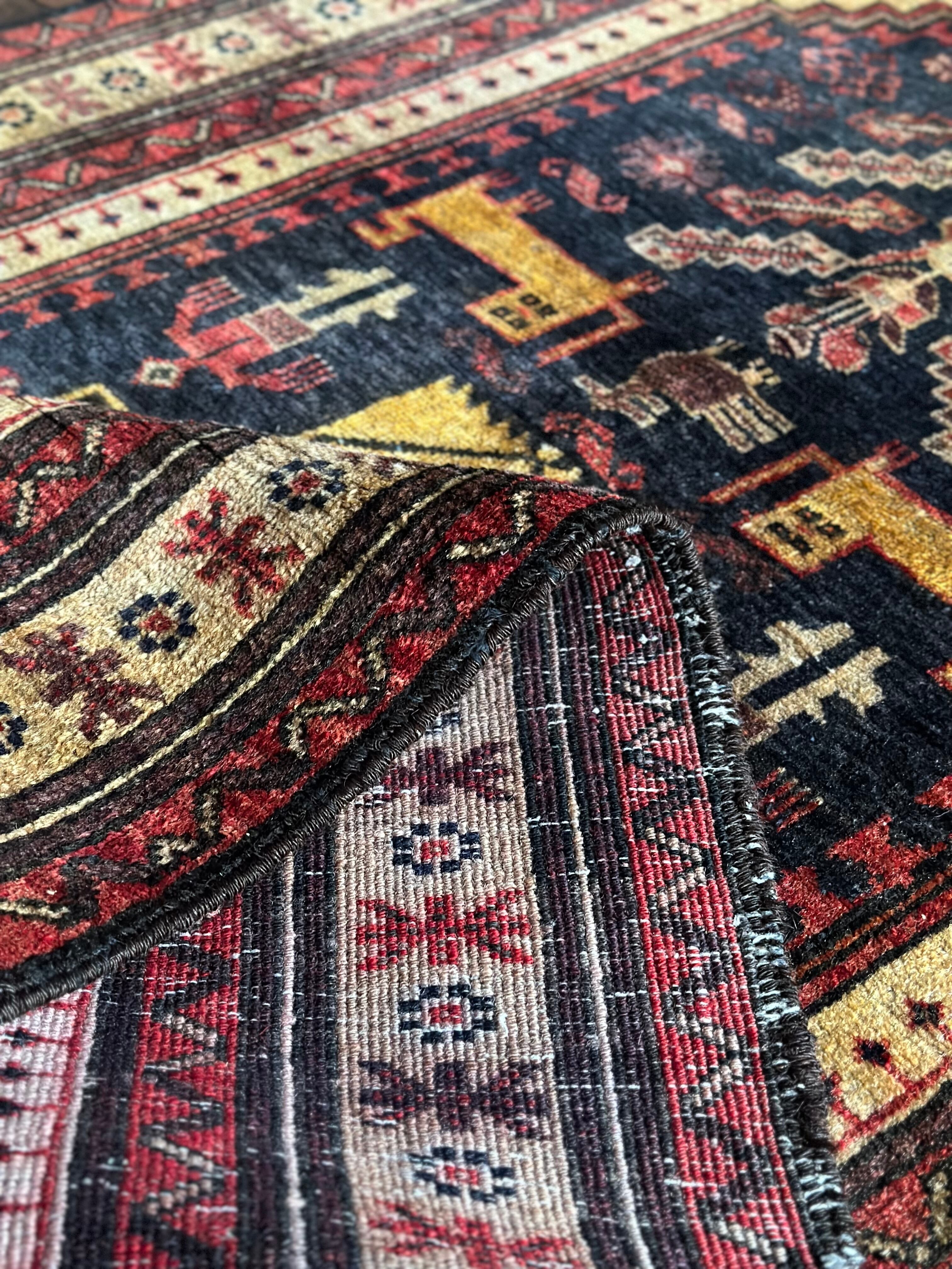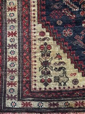 バルーチによく見られる漆黒な印象とは裏腹に色合いもそうですが、絵柄も中央のグルバゲギュル(十字形紋様)を取り囲む人にライオン、羊に鳥や植物といったあたかも地球の歴史を垣間見るようなスケール感が伝わる1枚になります。