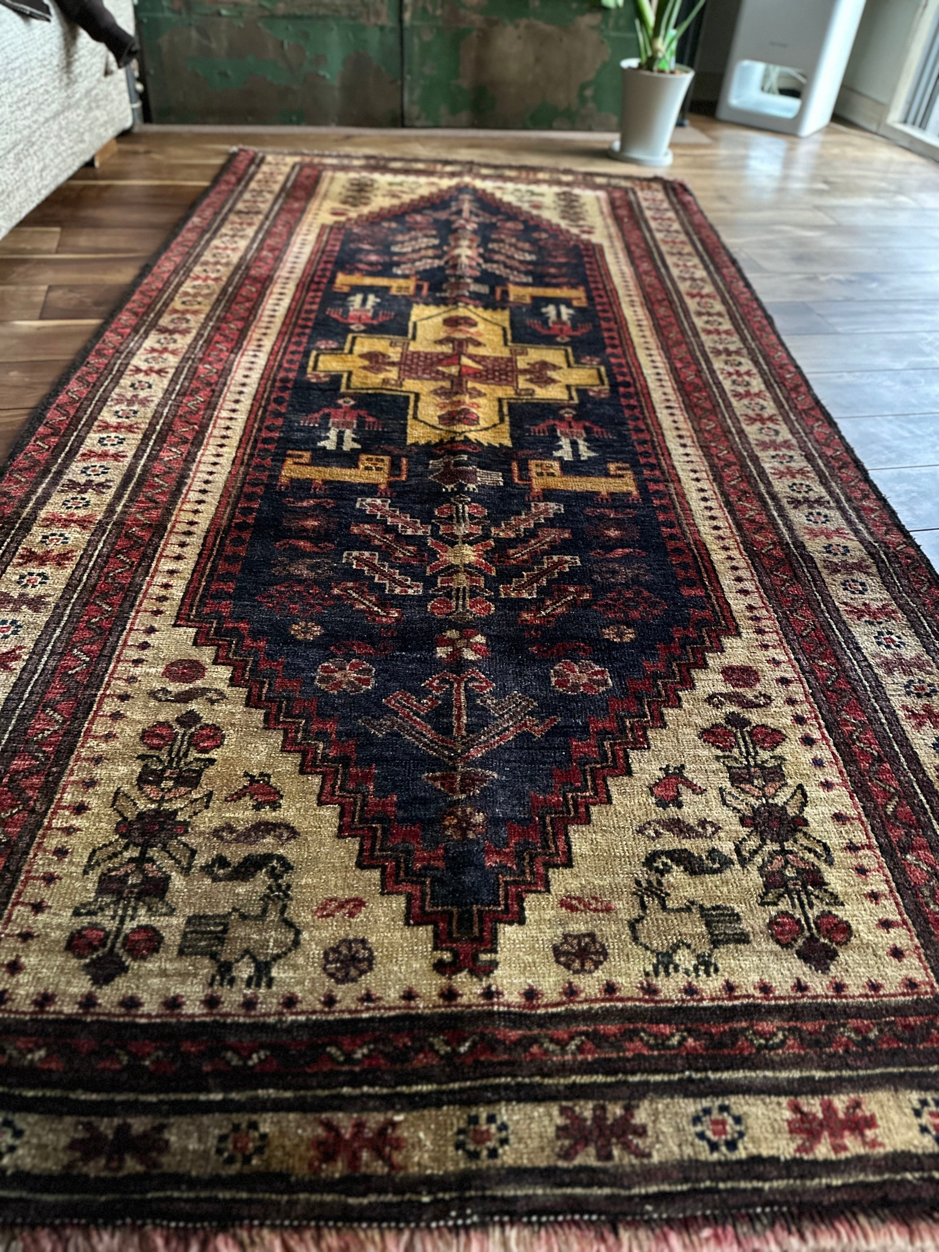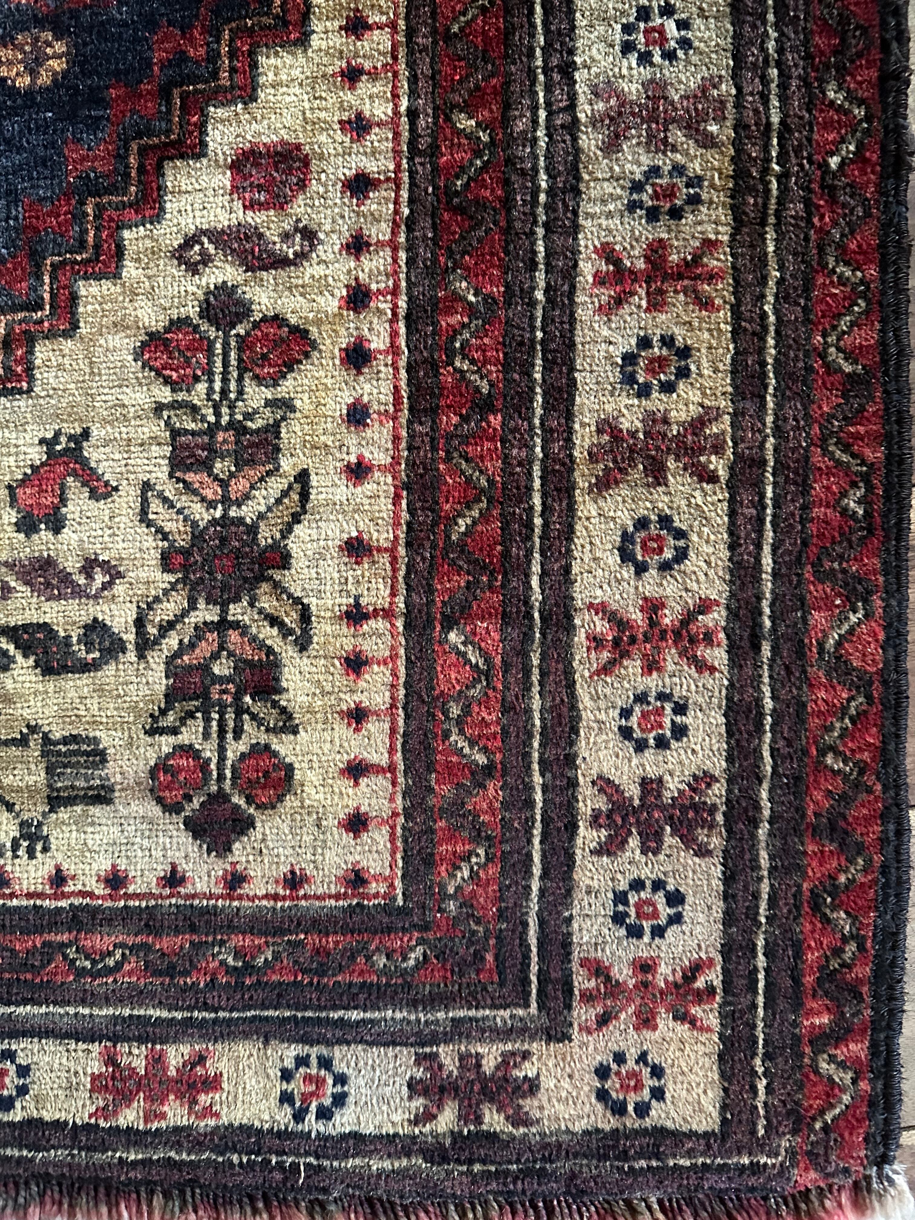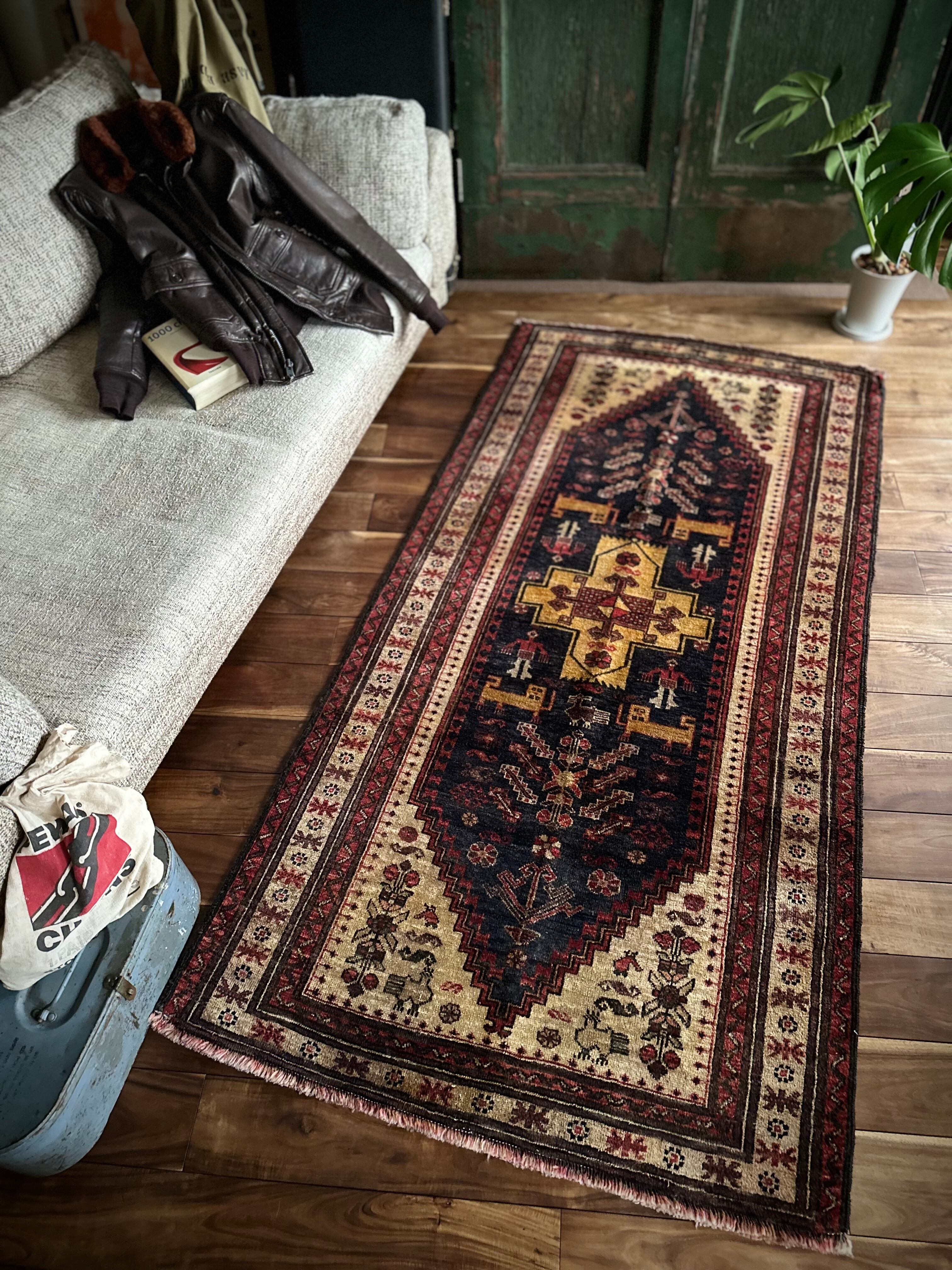 素晴らしくてカッコいい‼︎という形容詞しか思い浮かばなく、ベージュと色褪せたネイビーのカラーリングが堪らない70年ほど前に織られたバルーチ族のお古なトライバルラグになります。