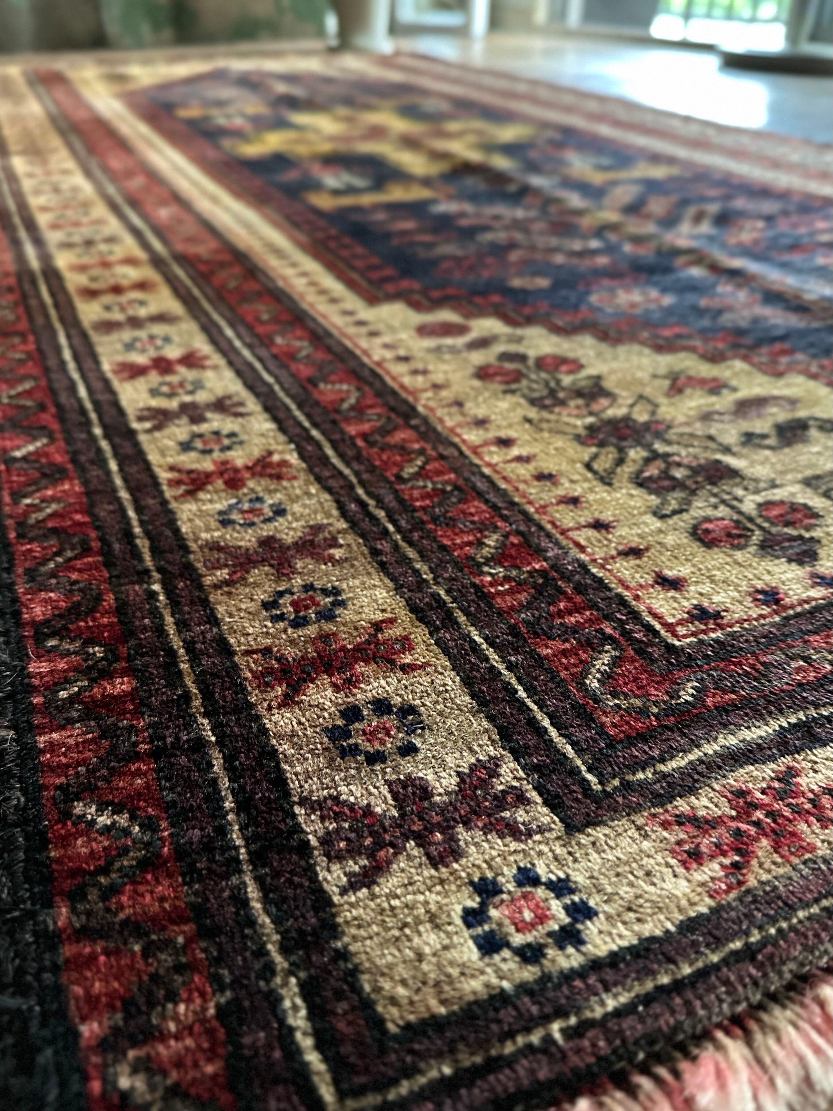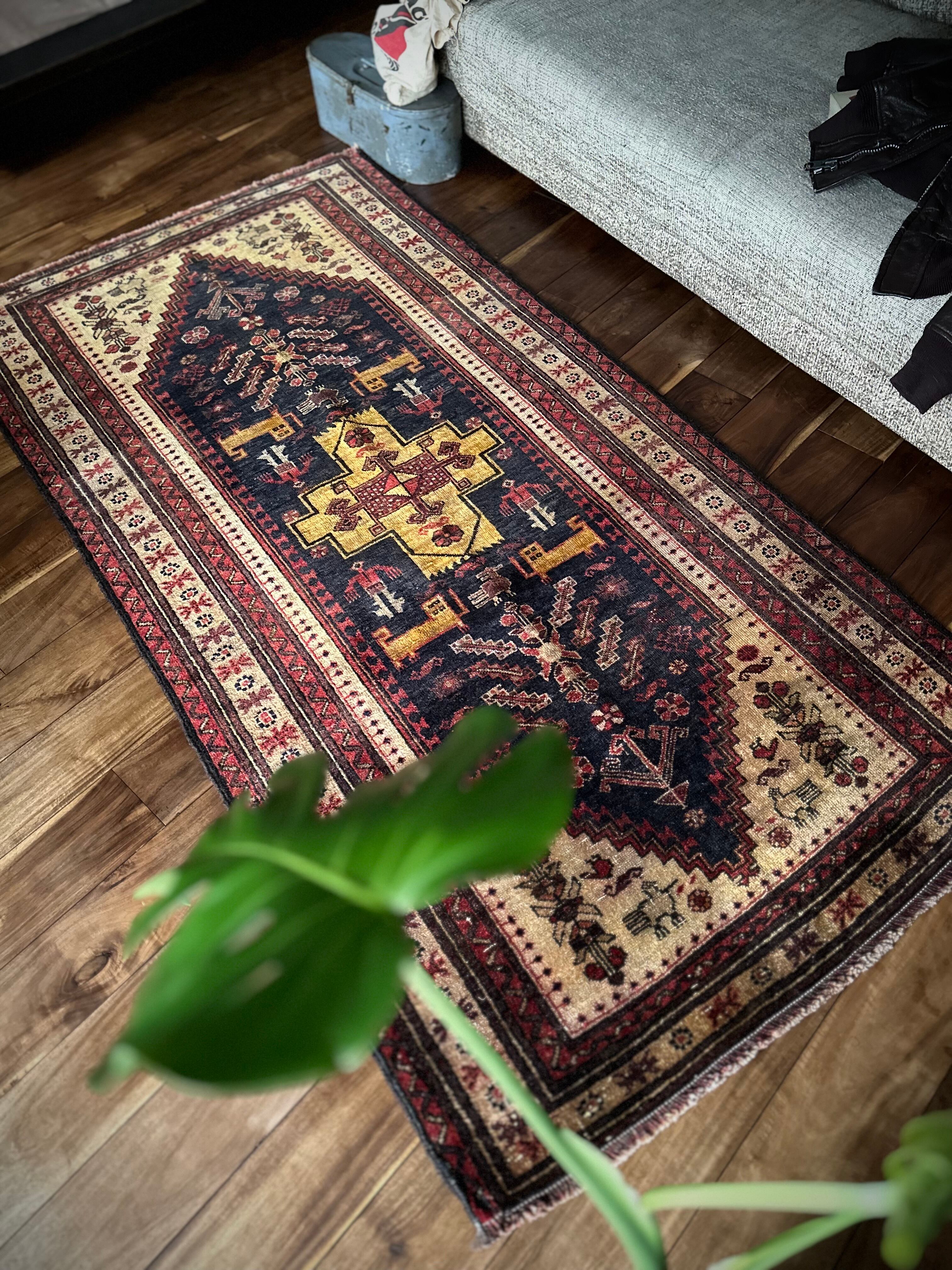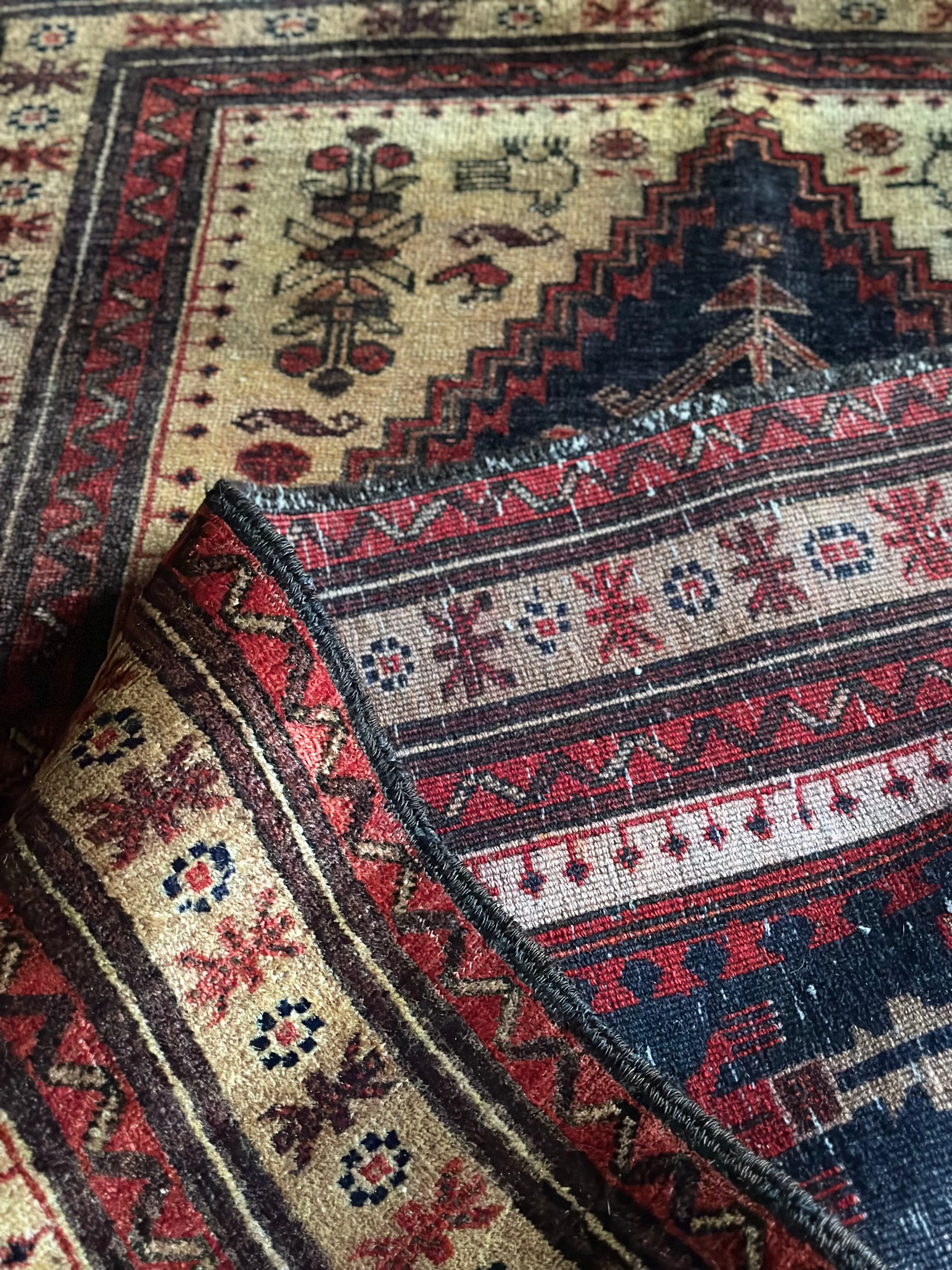 素晴らしくてカッコいい‼︎という形容詞しか思い浮かばなく、ベージュと色褪せたネイビーのカラーリングが堪らない70年ほど前に織られたバルーチ族のお古なトライバルラグになります。