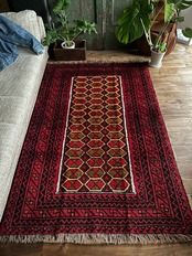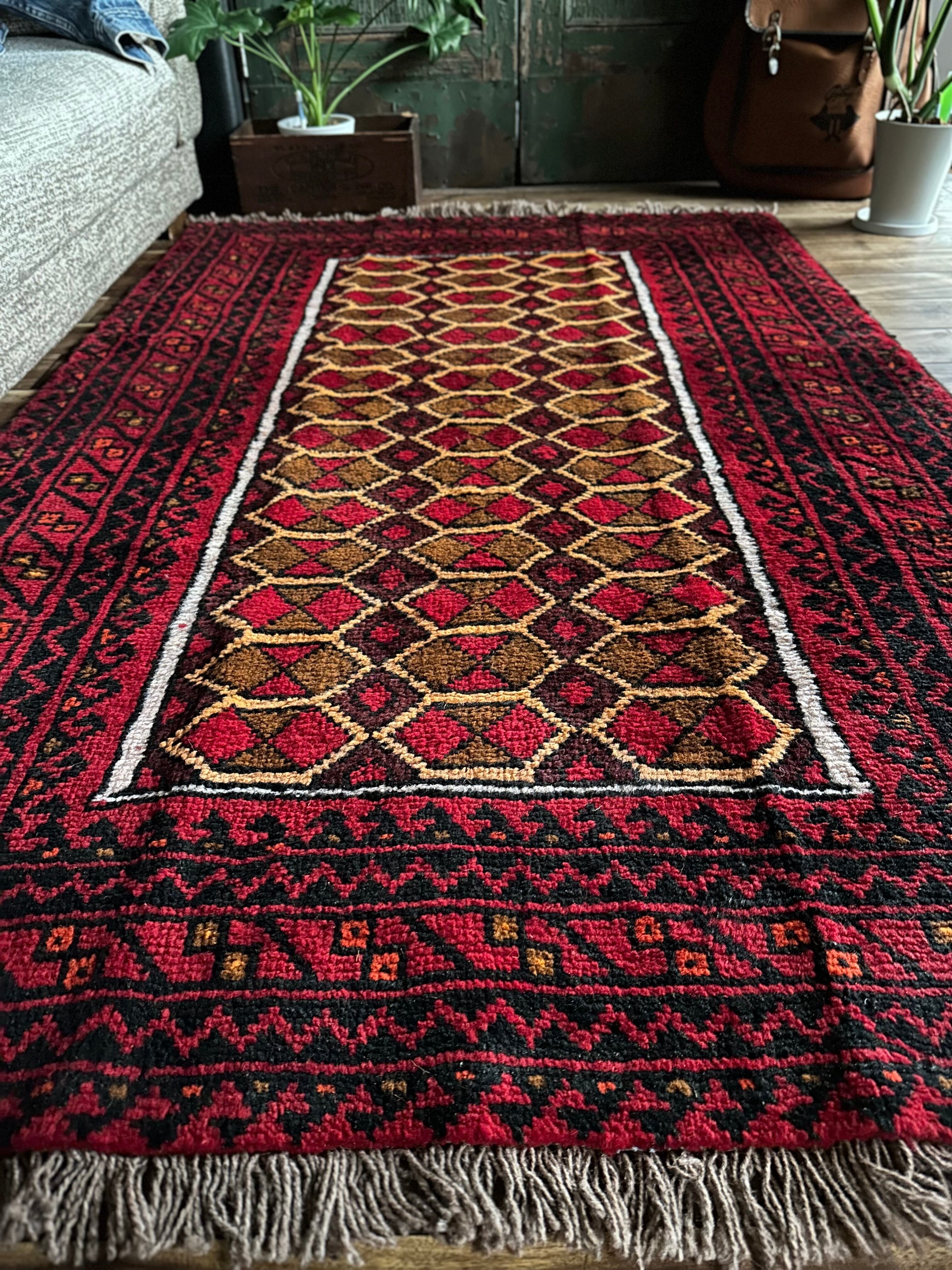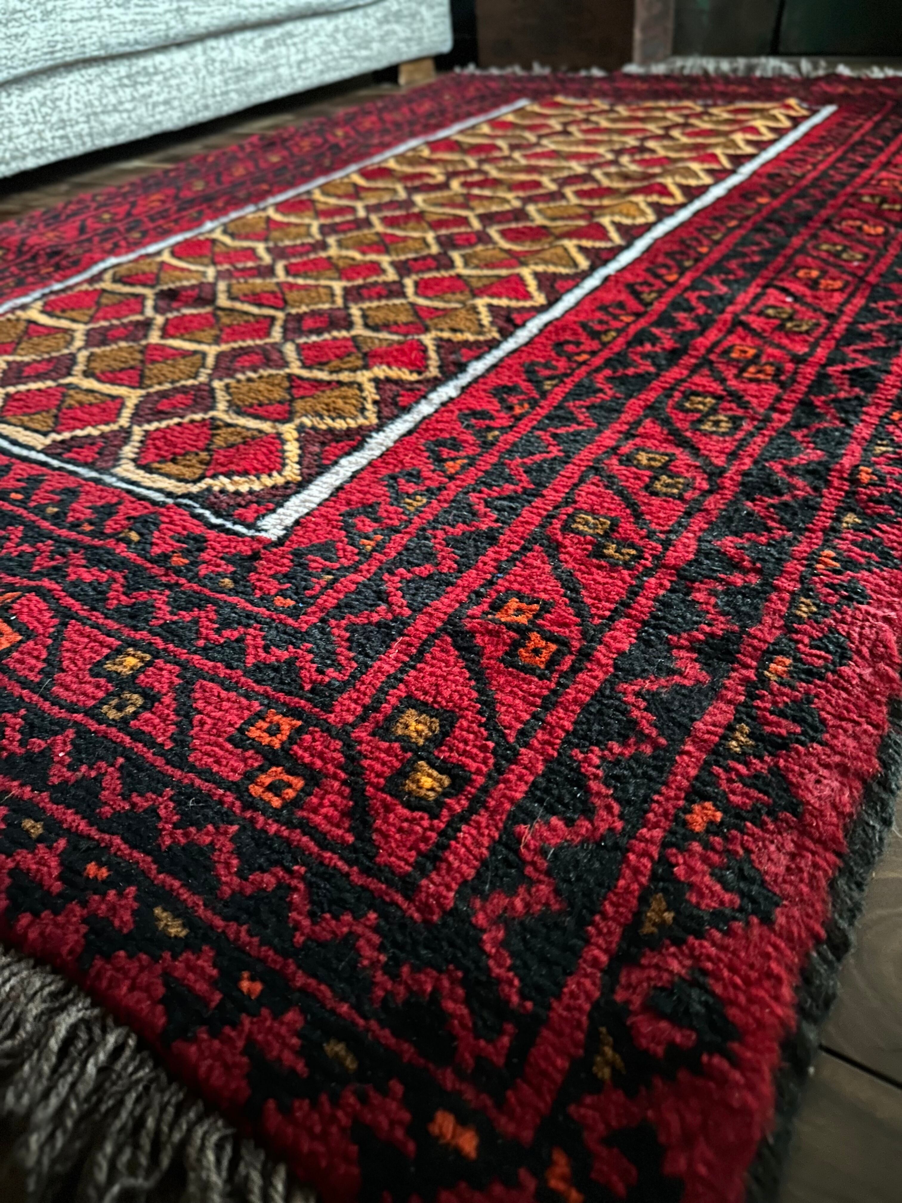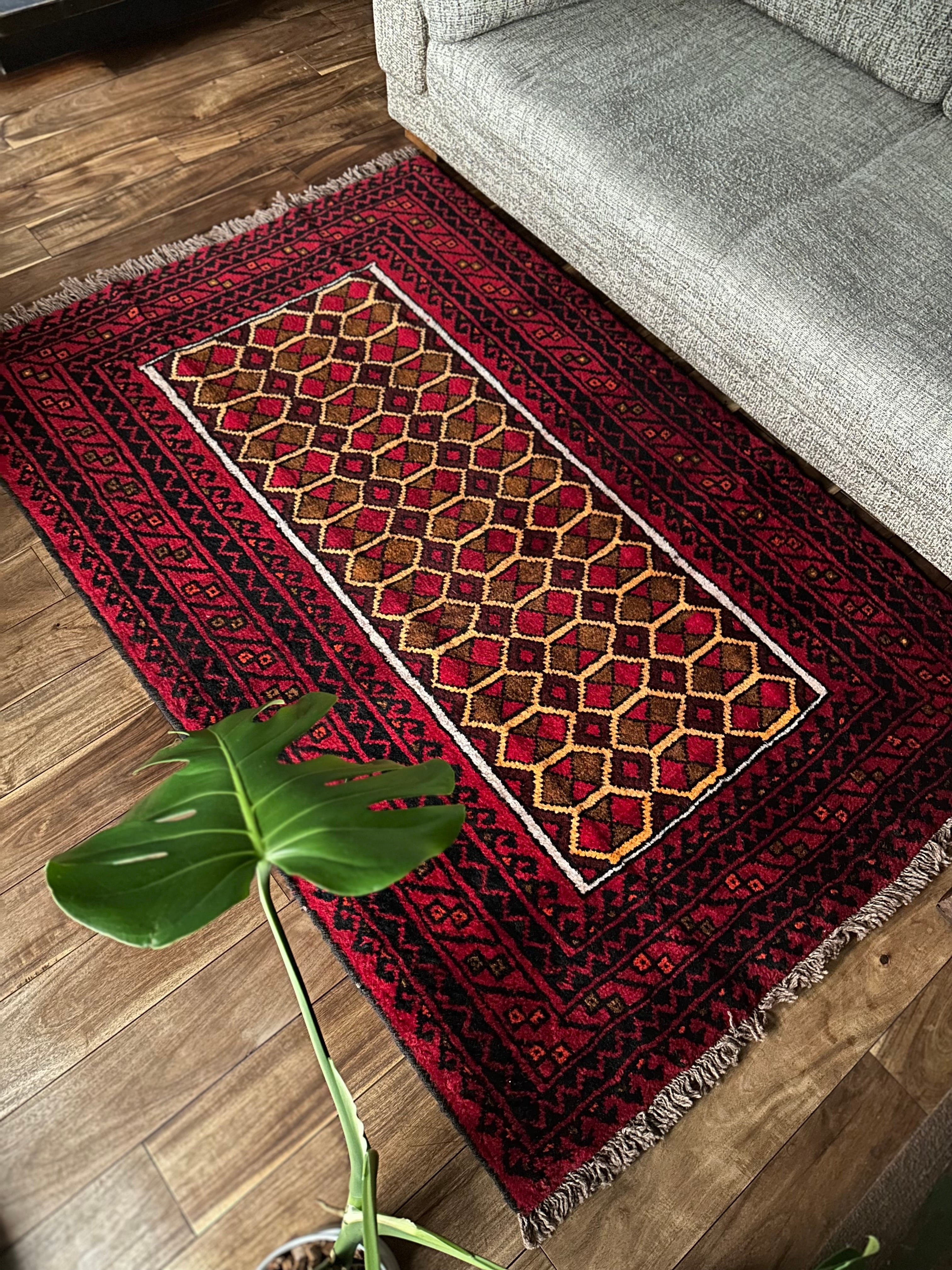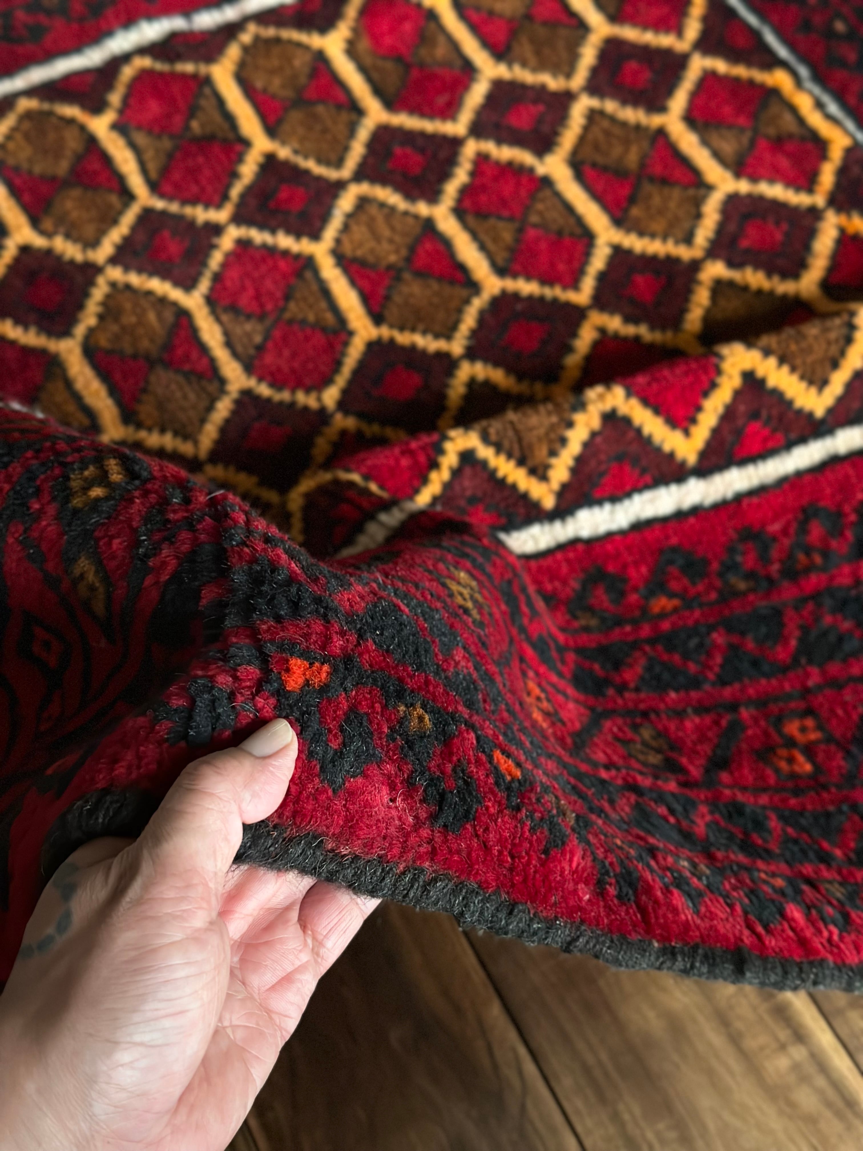 そんな彼らの織りなすラグは色彩豊かで、こちらは一見してバルーチのような見た目ですが、グーチャンの証であるボーダー部分のギザギザ模様にフィールドのイエローな縁取りがビシっと引き締まって見えます。