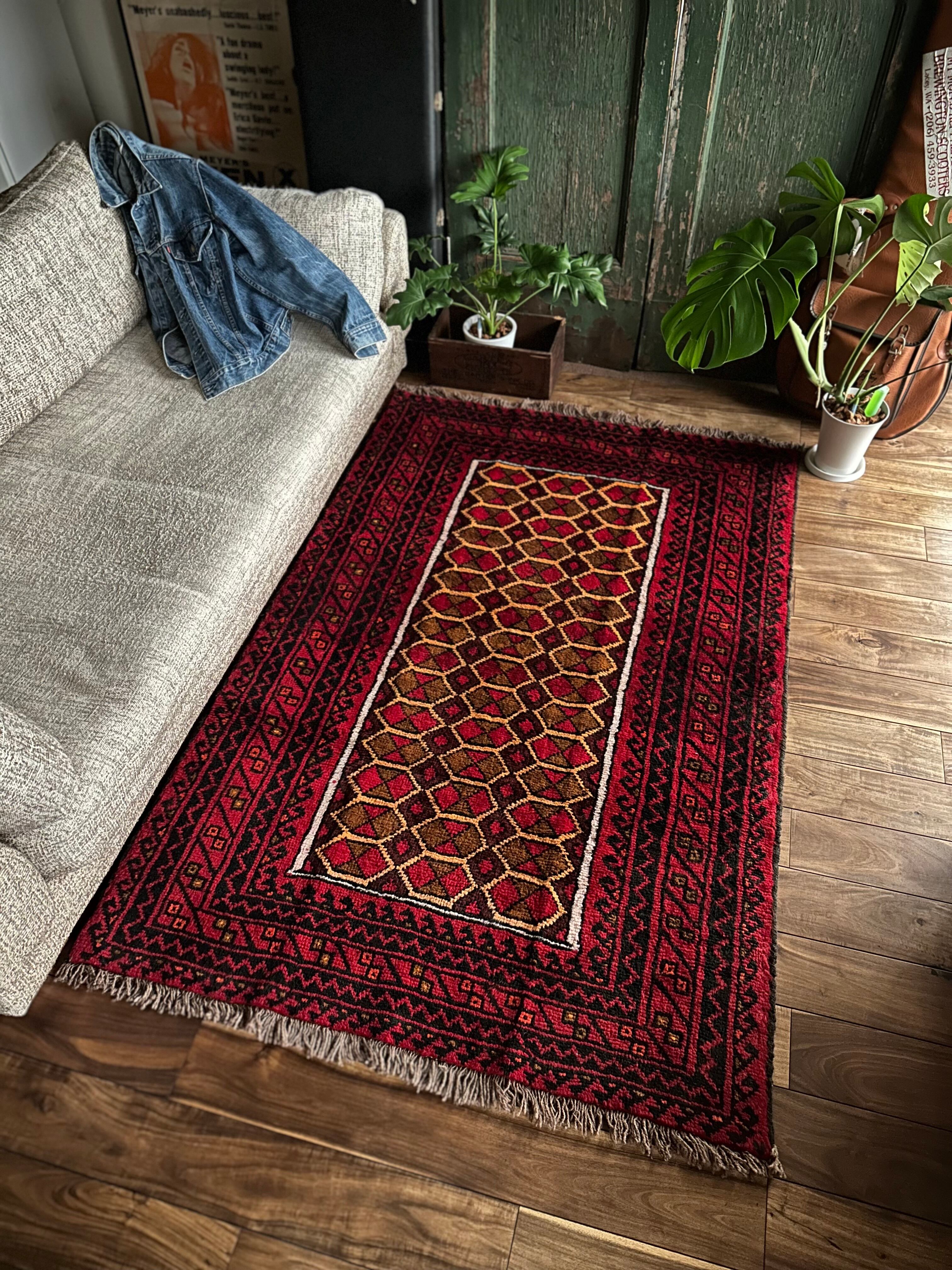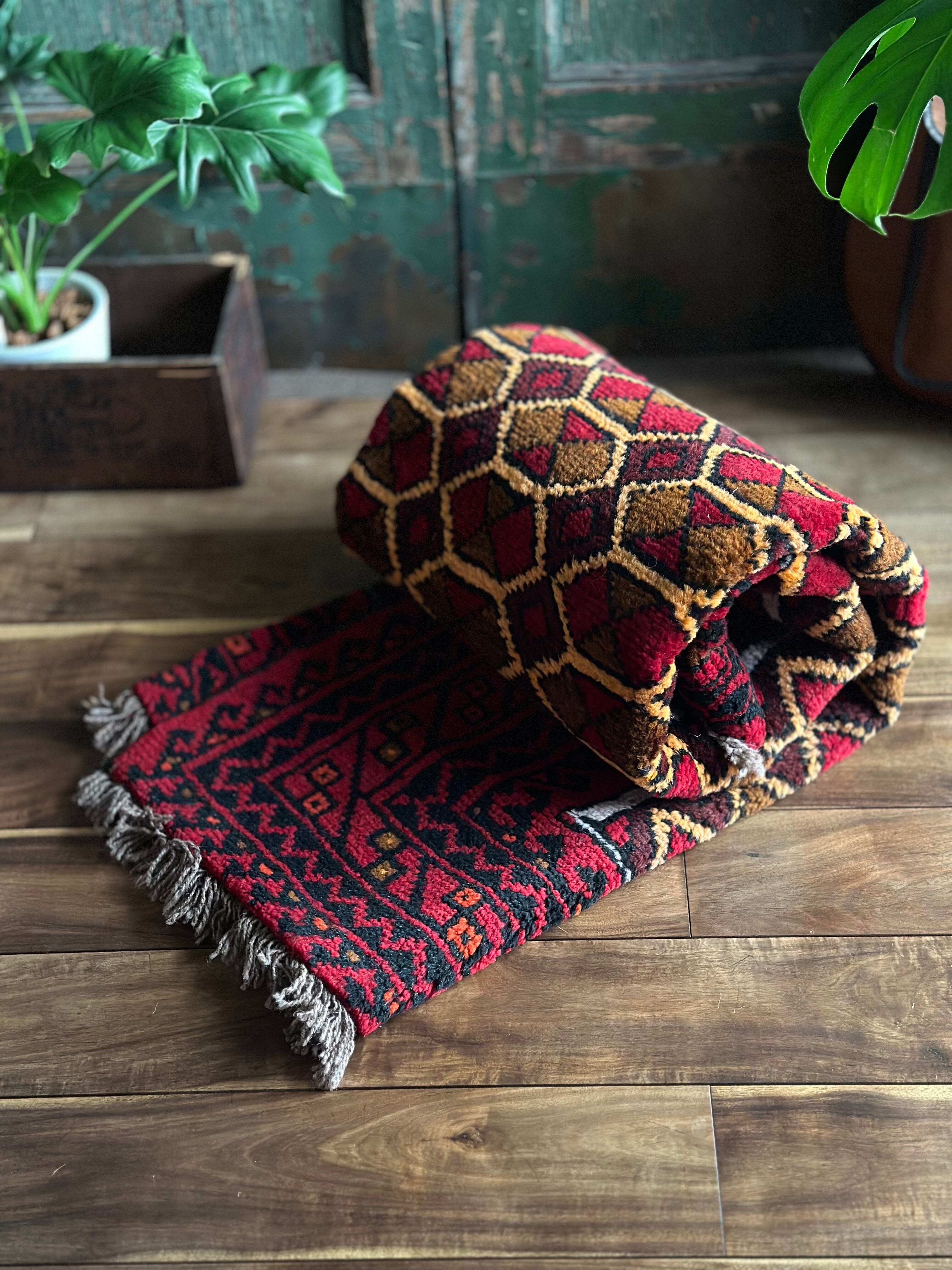 またラグそのものに関しては羊毛特有の匂いがあり手織りによる歪みや経年劣化、草木染めによる色ムラなどがありますが、それもまたトライバルラグの魅力かとご理解ください。