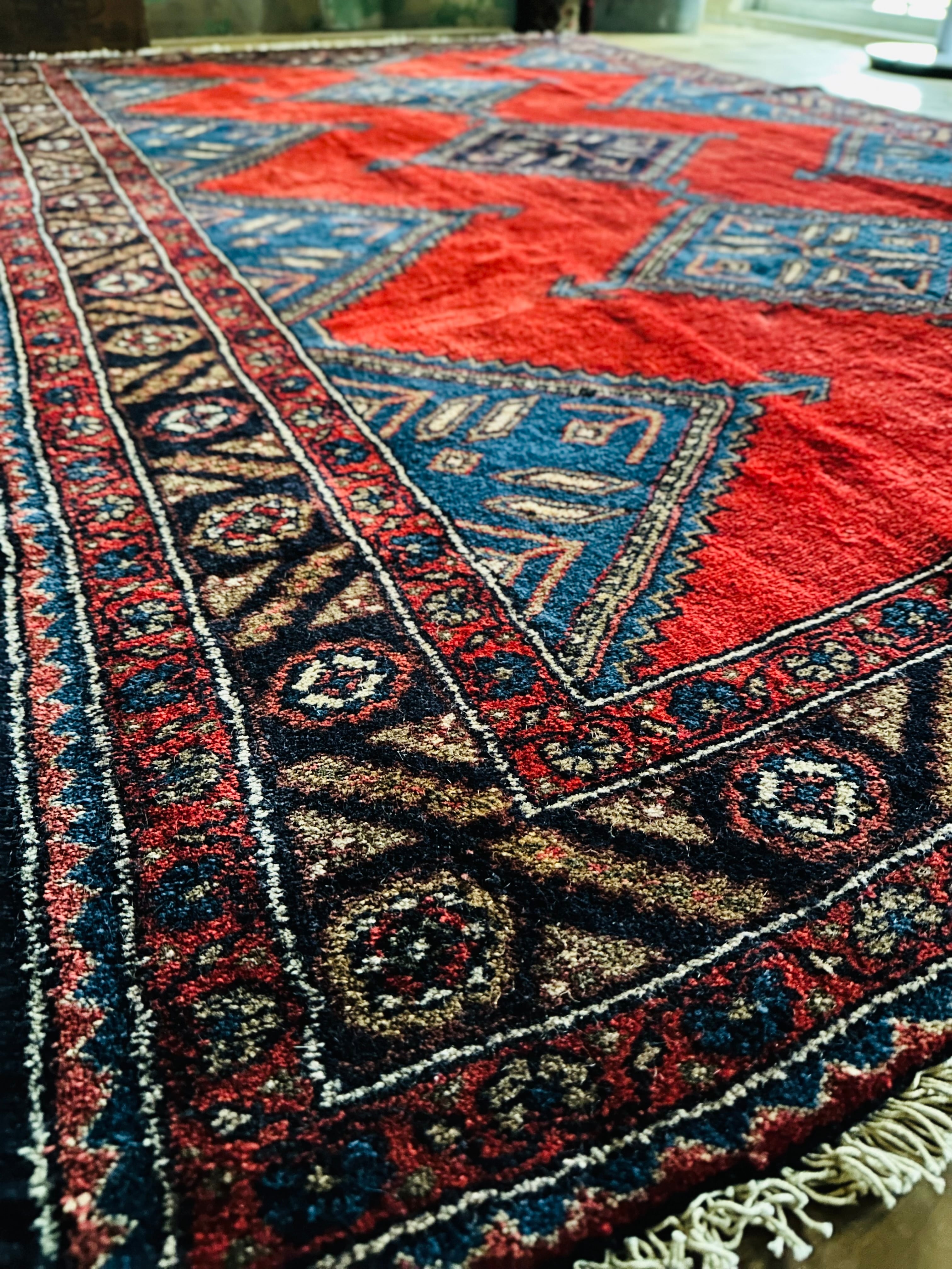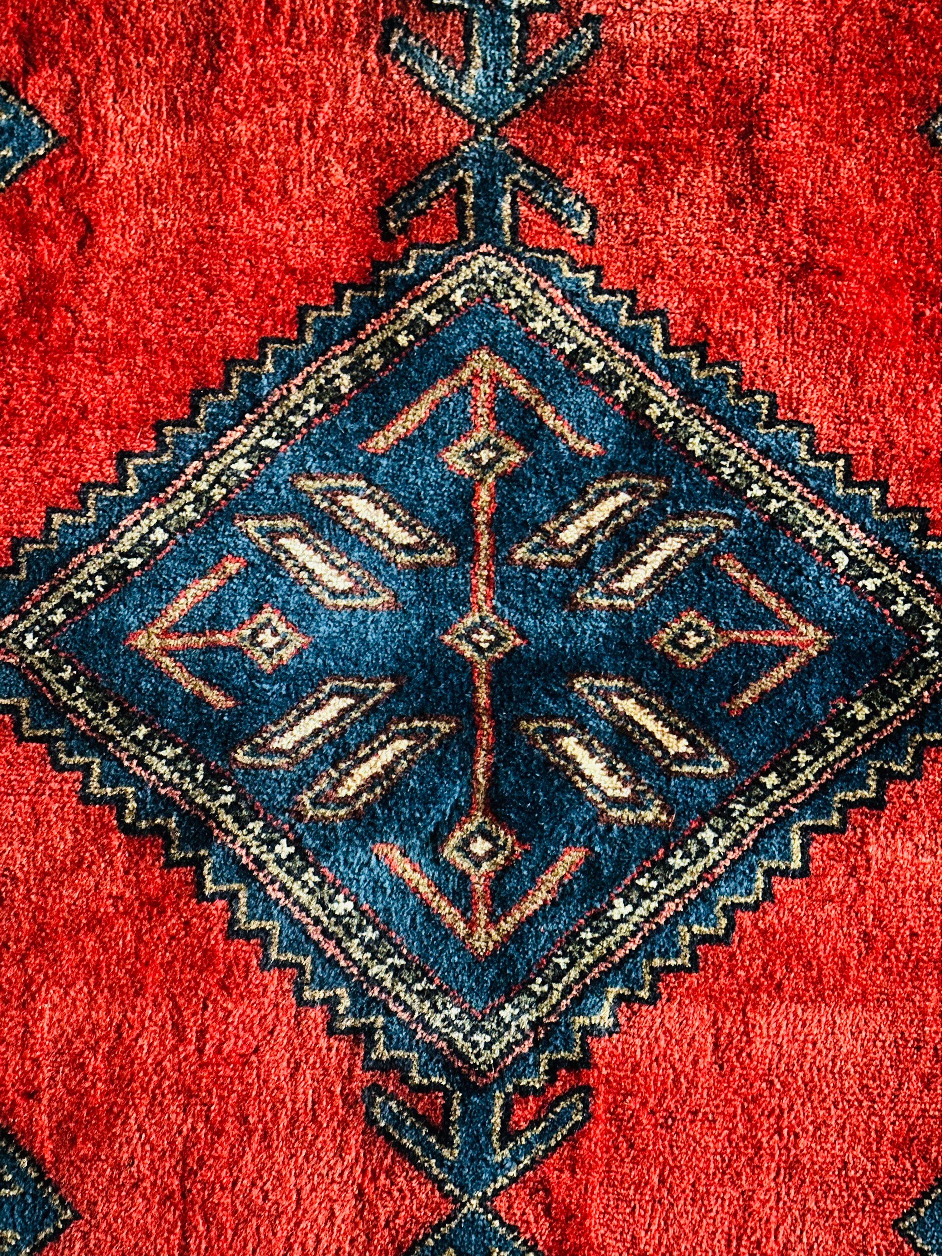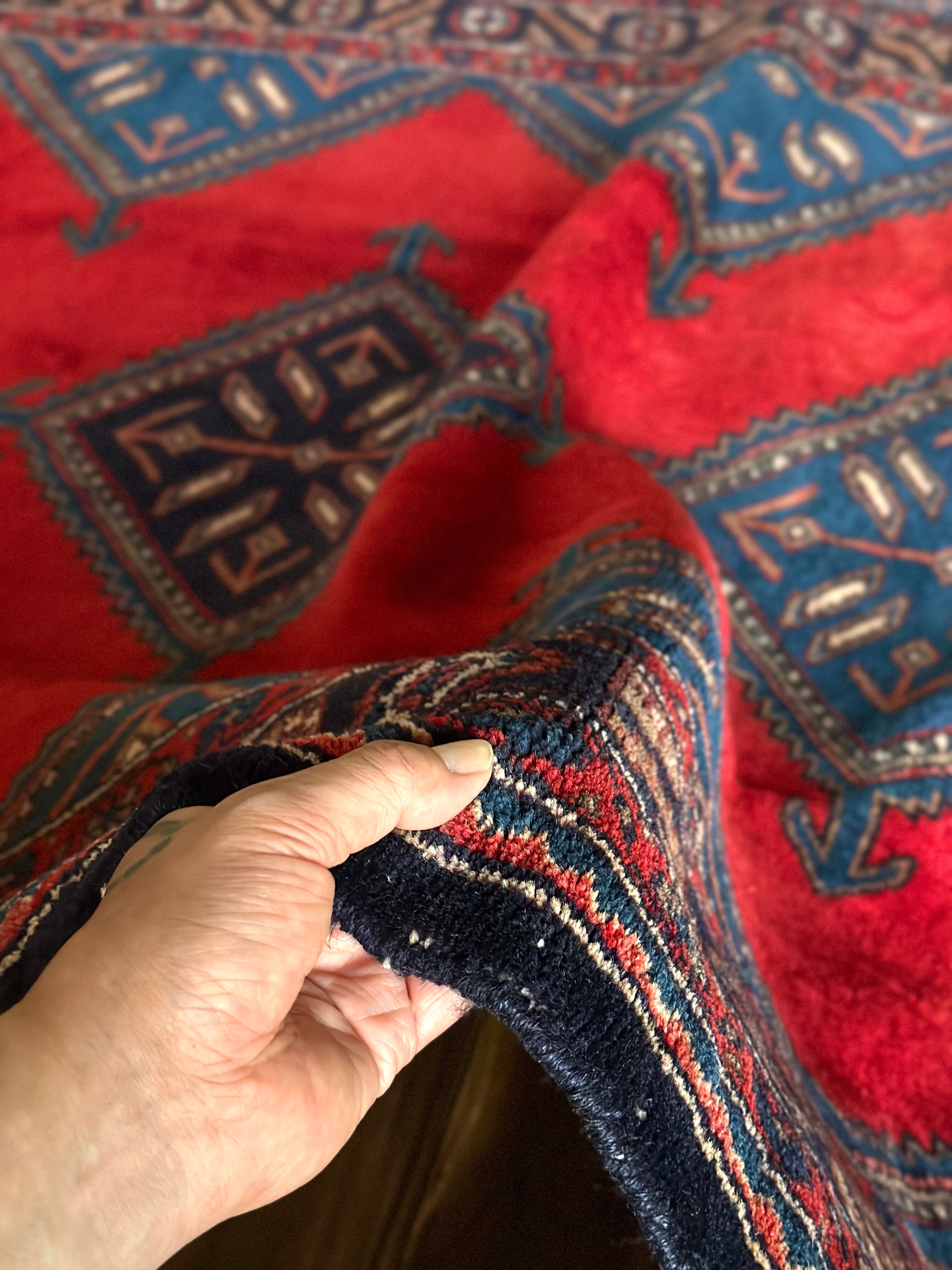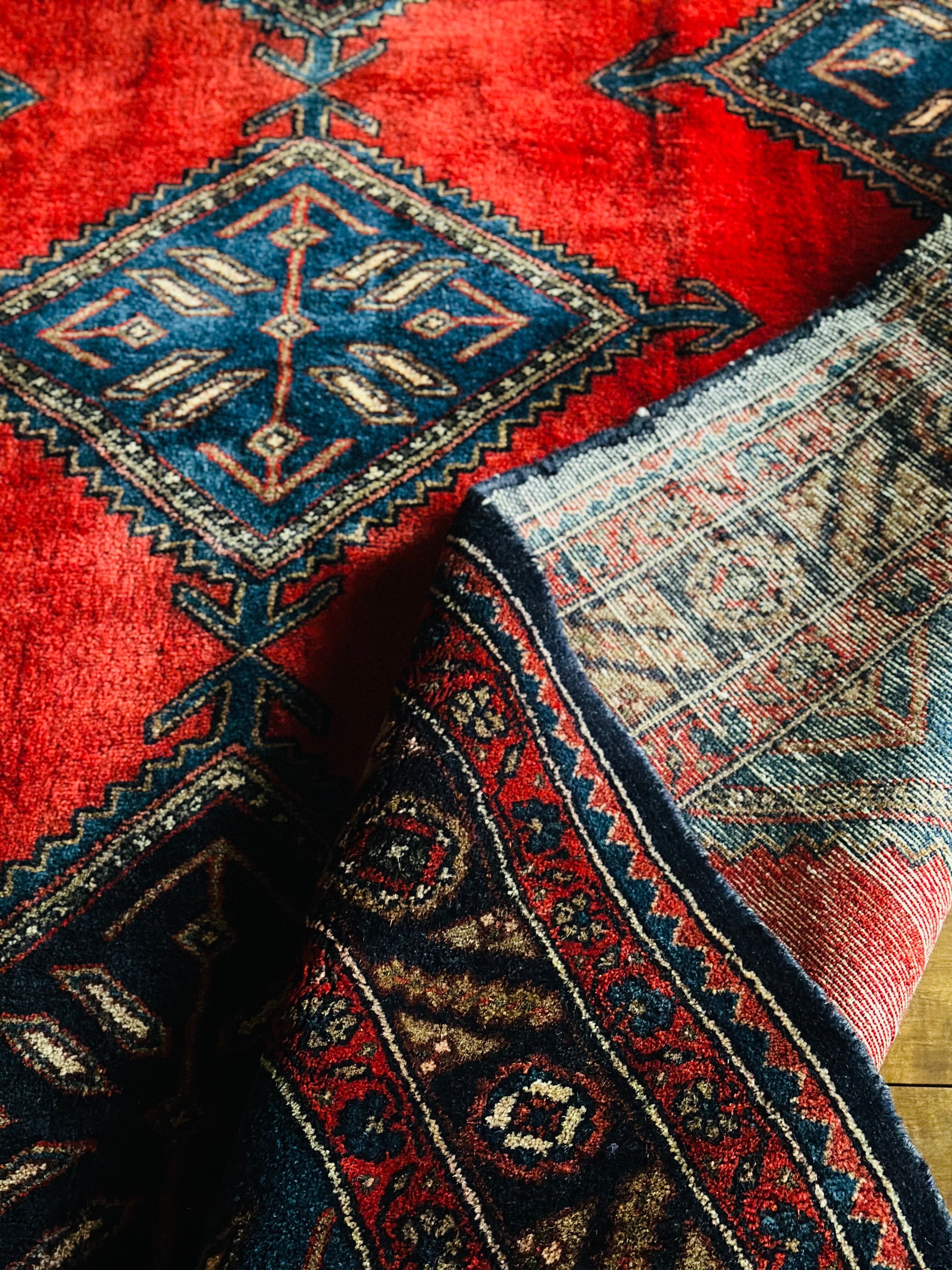 コーカサス地方のラグによく見られるアクスターファメダリオン※菱形紋様が特徴的な、イラン北西部に住むクルド民族のトライバルラグになります。