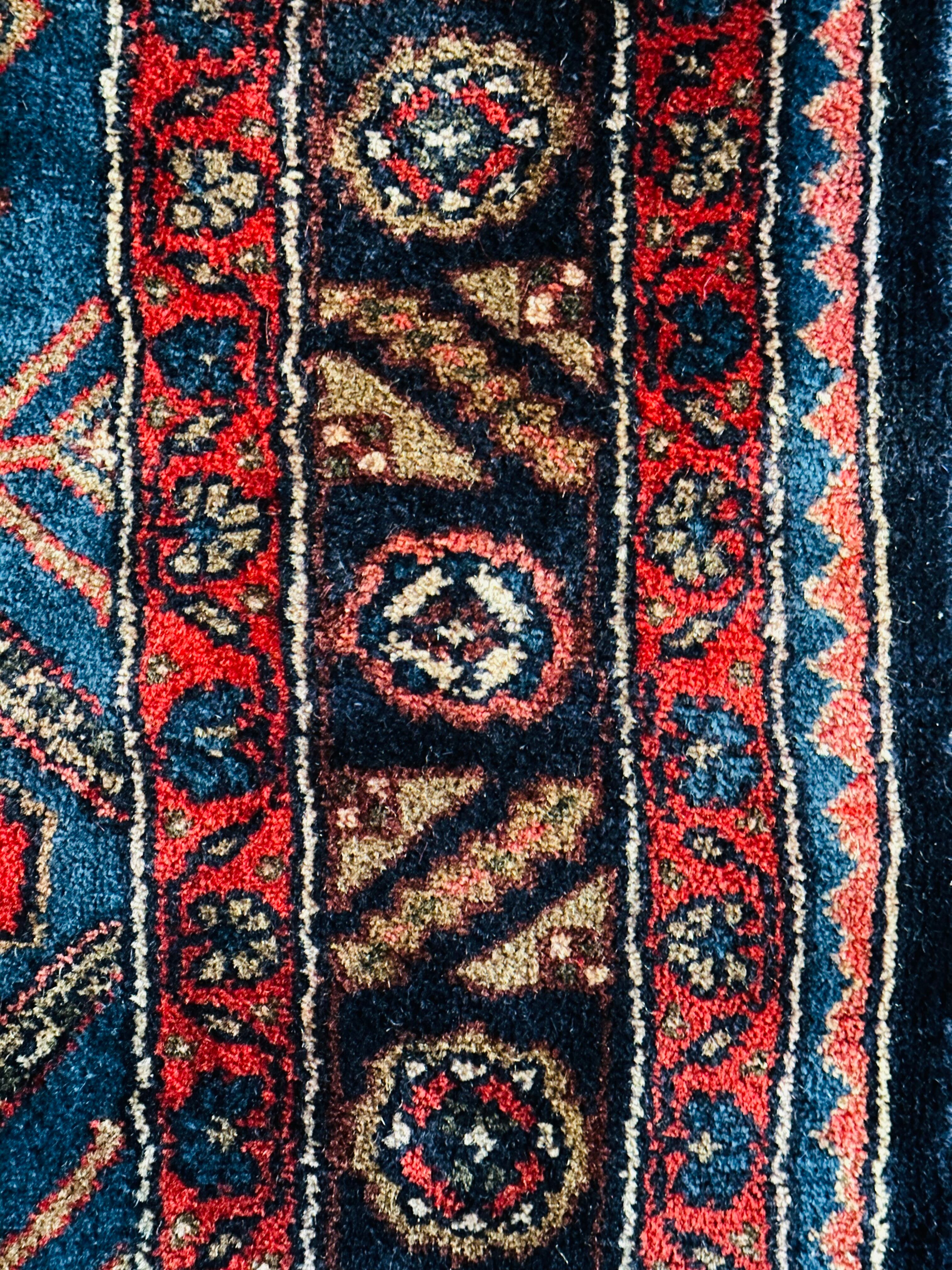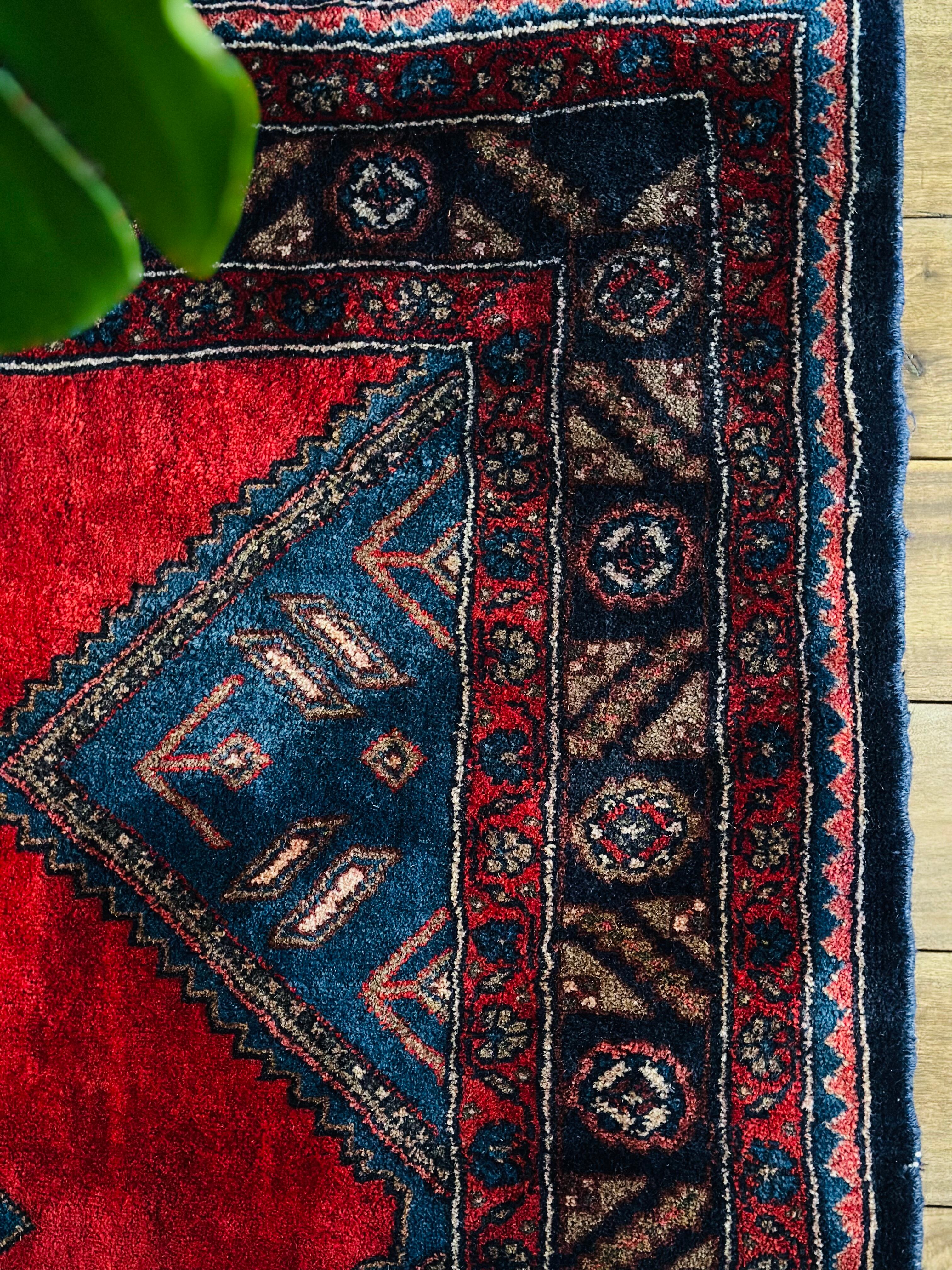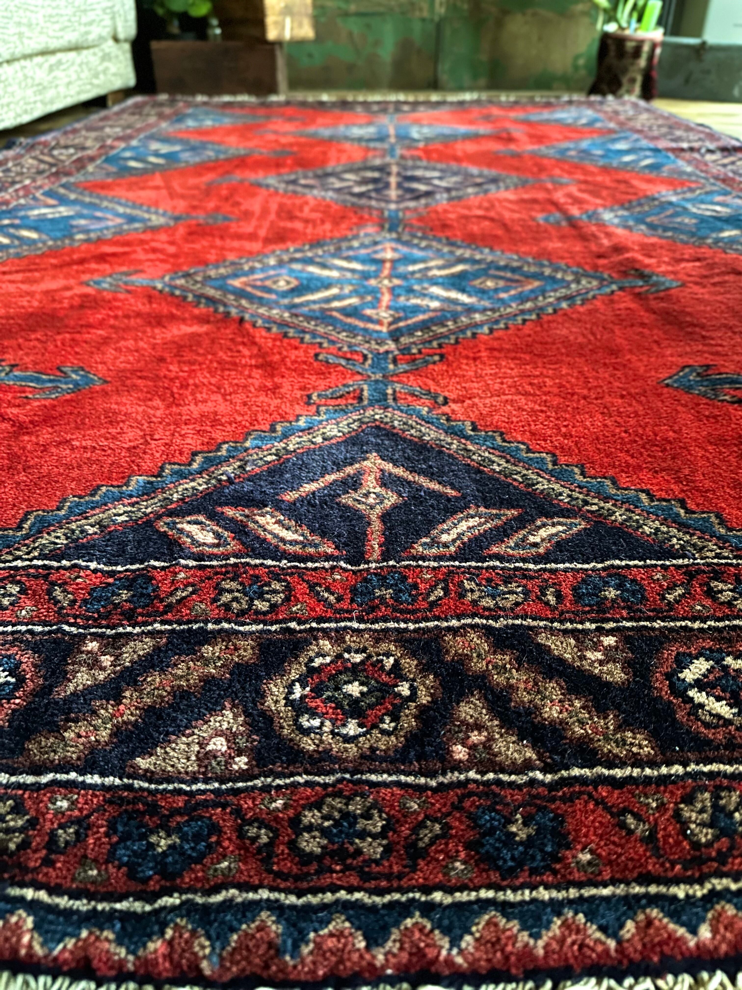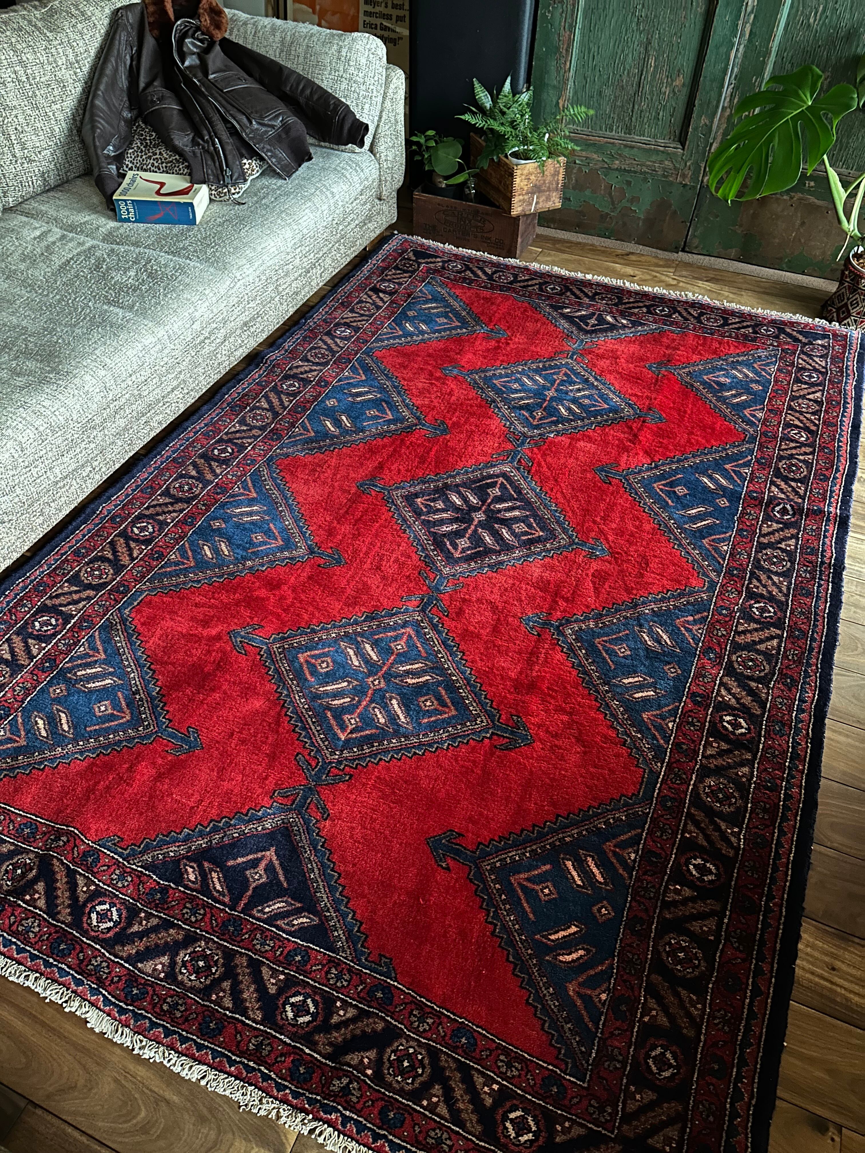 コーカサス地方のラグによく見られるアクスターファメダリオン※菱形紋様が特徴的な、イラン北西部に住むクルド民族のトライバルラグになります。