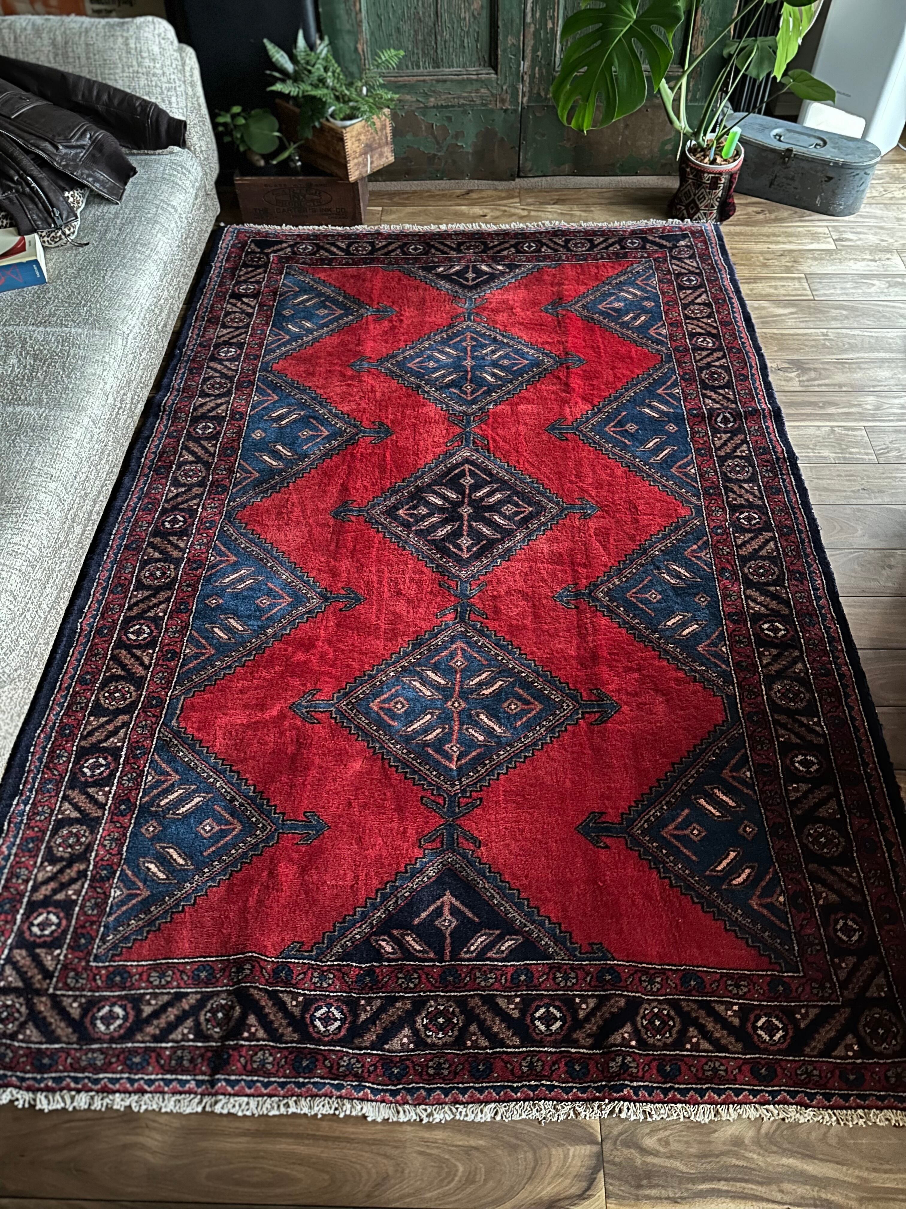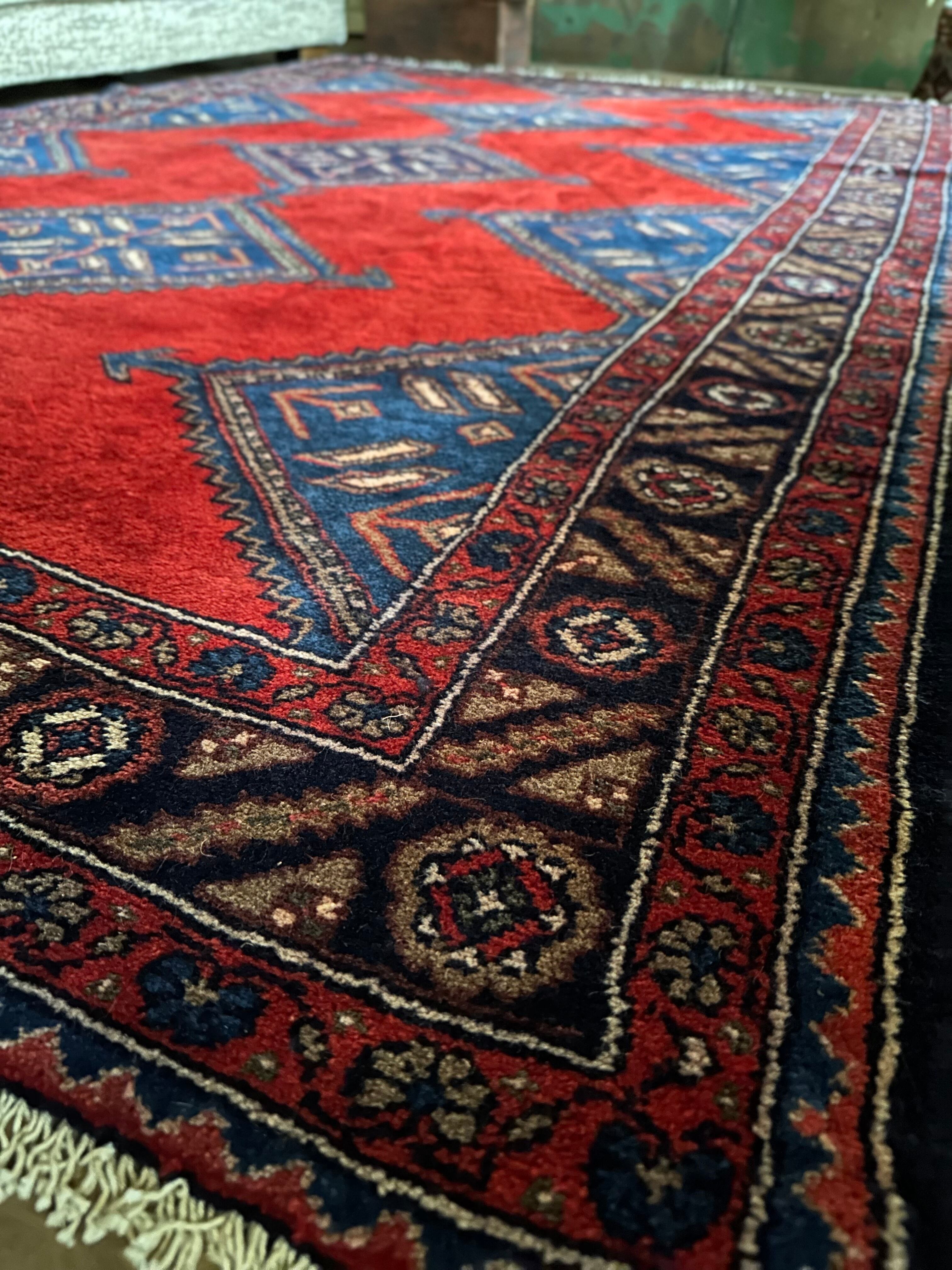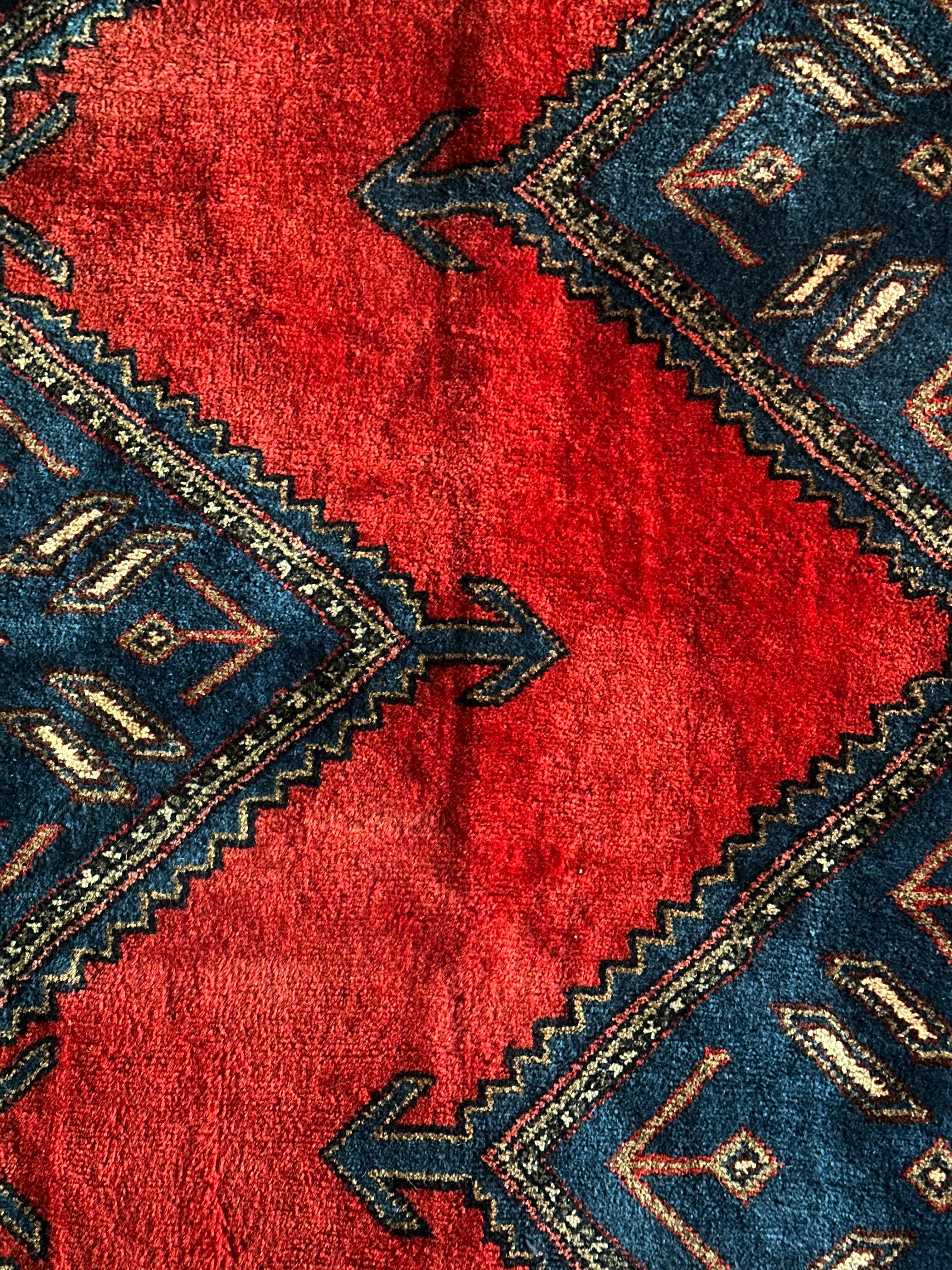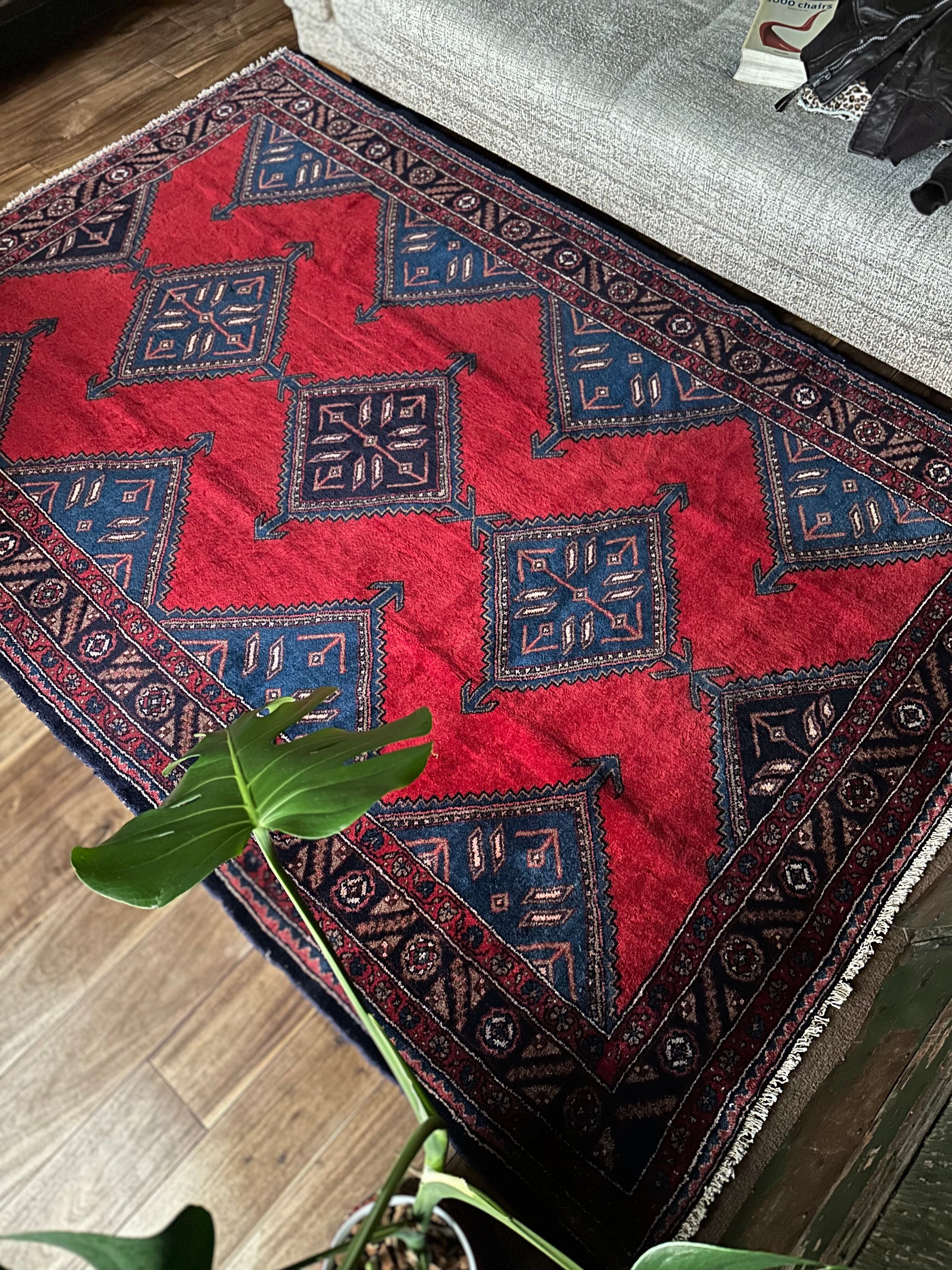 コーカサス地方のラグによく見られるアクスターファメダリオン※菱形紋様が特徴的な、イラン北西部に住むクルド民族のトライバルラグになります。