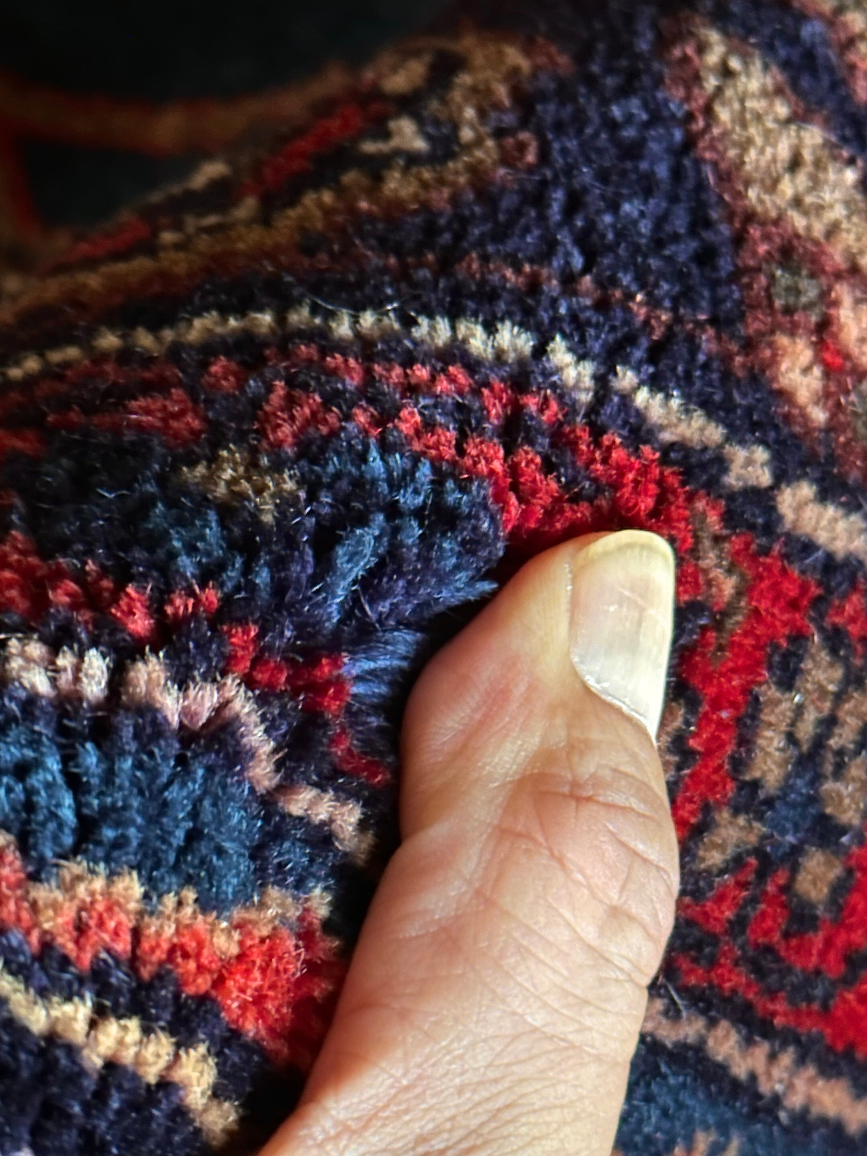 またラグそのものに関しては羊毛特有の匂いがあり手織りによる歪みや経年劣化、草木染めによる色ムラなどがありますが、それもまたトライバルラグの魅力かとご理解ください。
