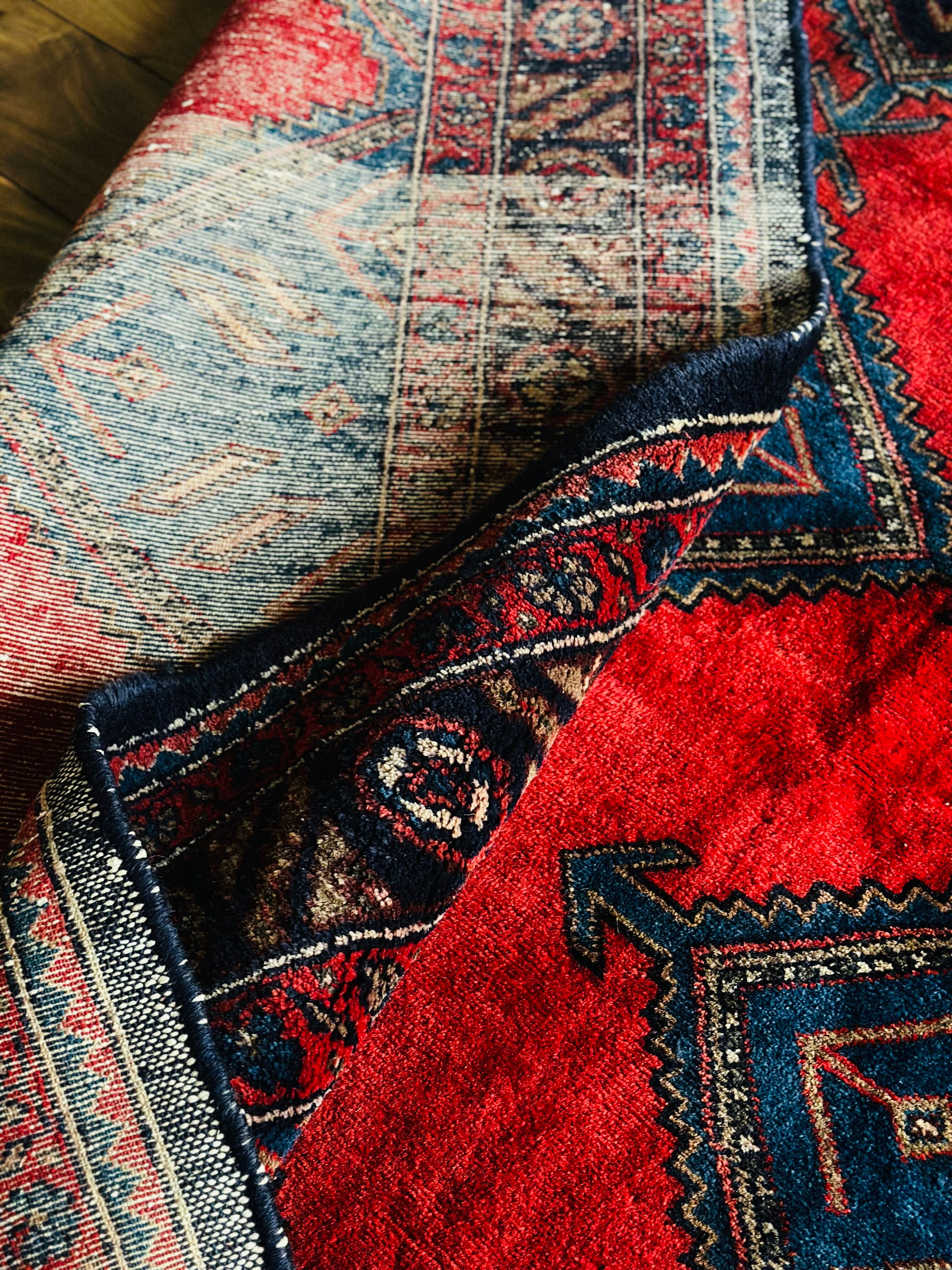 インパクト強めな目を奪われる赤にシャイニーなネイビーの色合いが絶妙な1枚で、なんと言ってもこの大判サイズが魅力的でしょうか。パイル自体もフカフカして厚みもありますので、ソファの前にゆったりと敷いてみたり、ダイニングテーブルの足元を彩ってみたりと超贅沢なザ・絨毯になります。