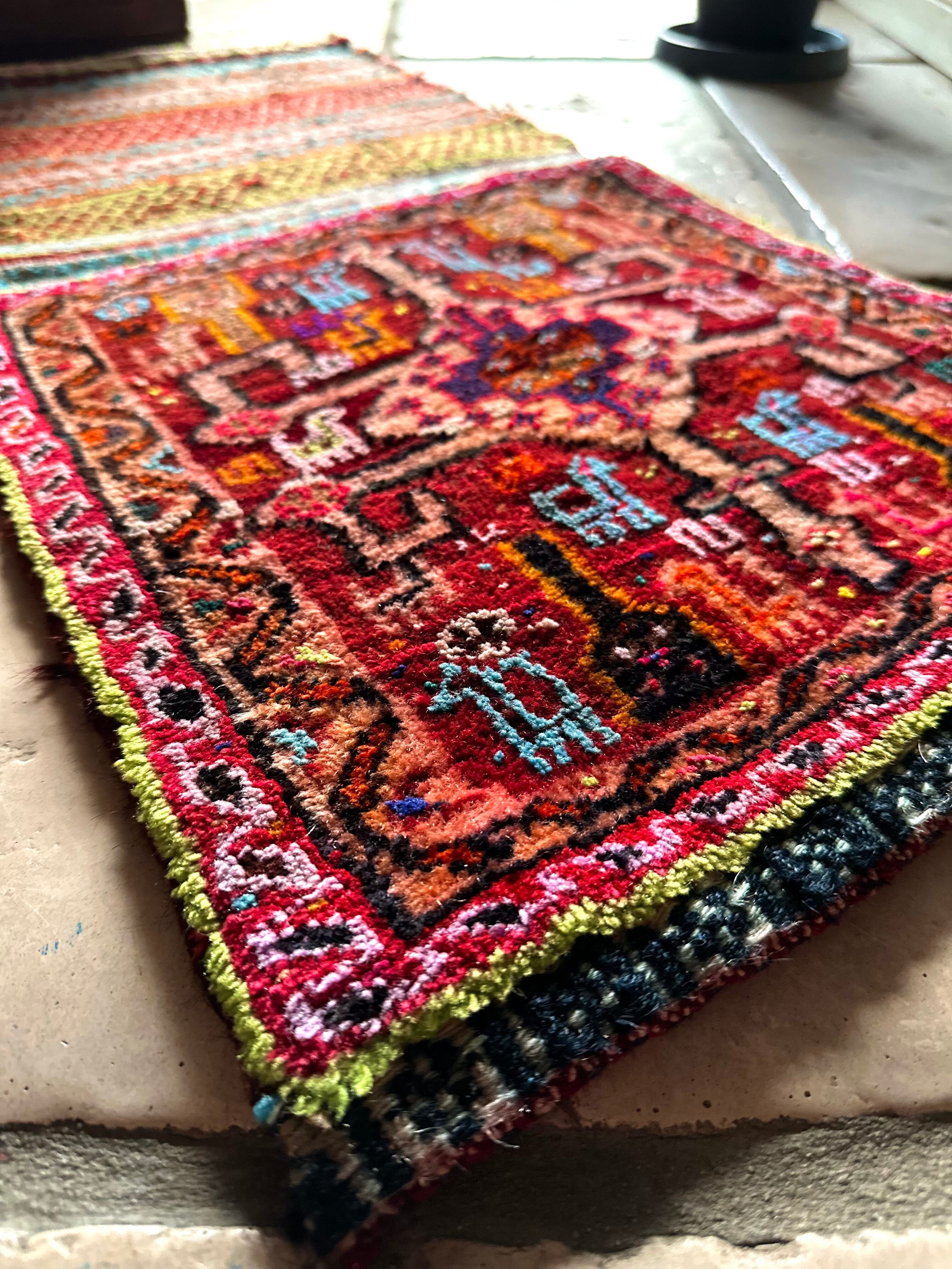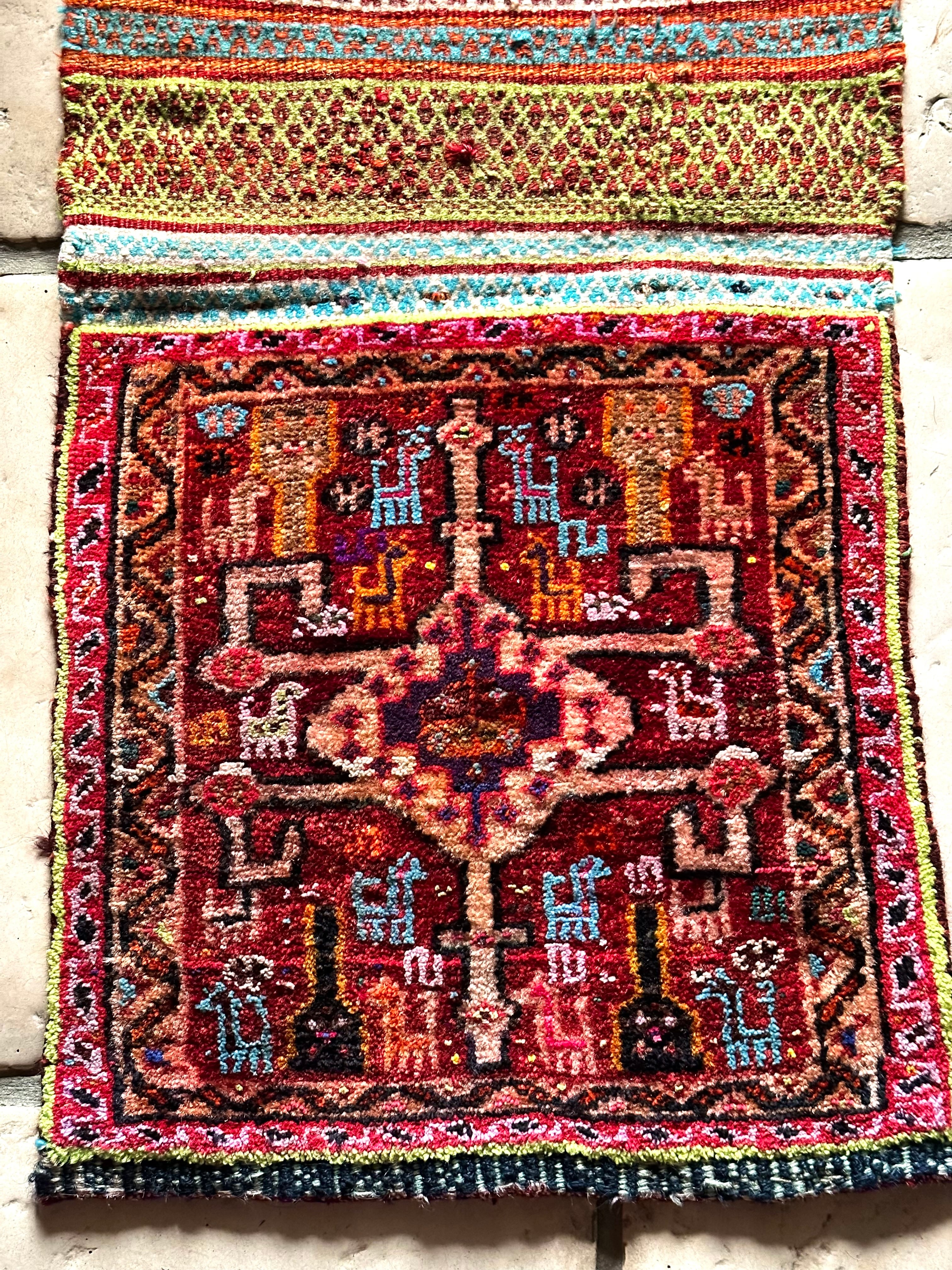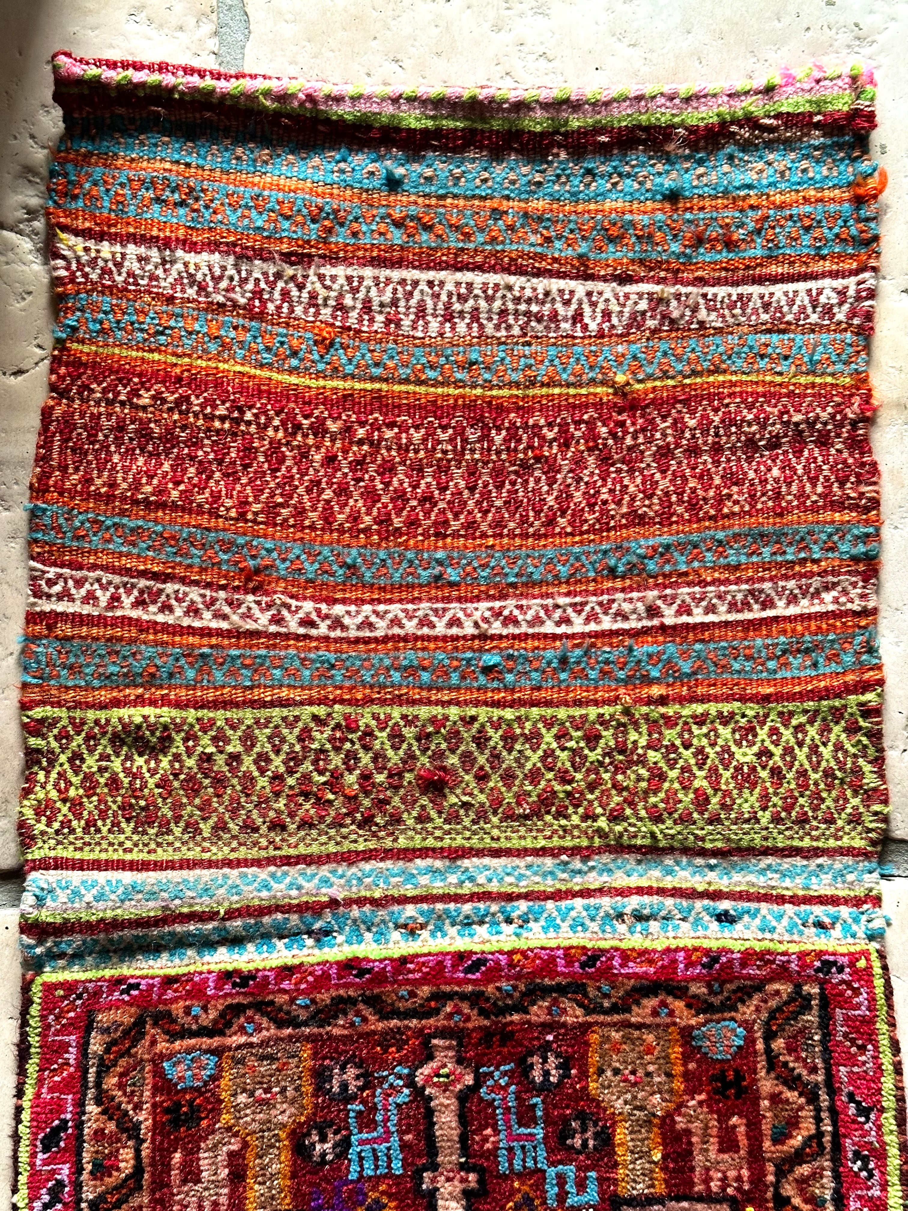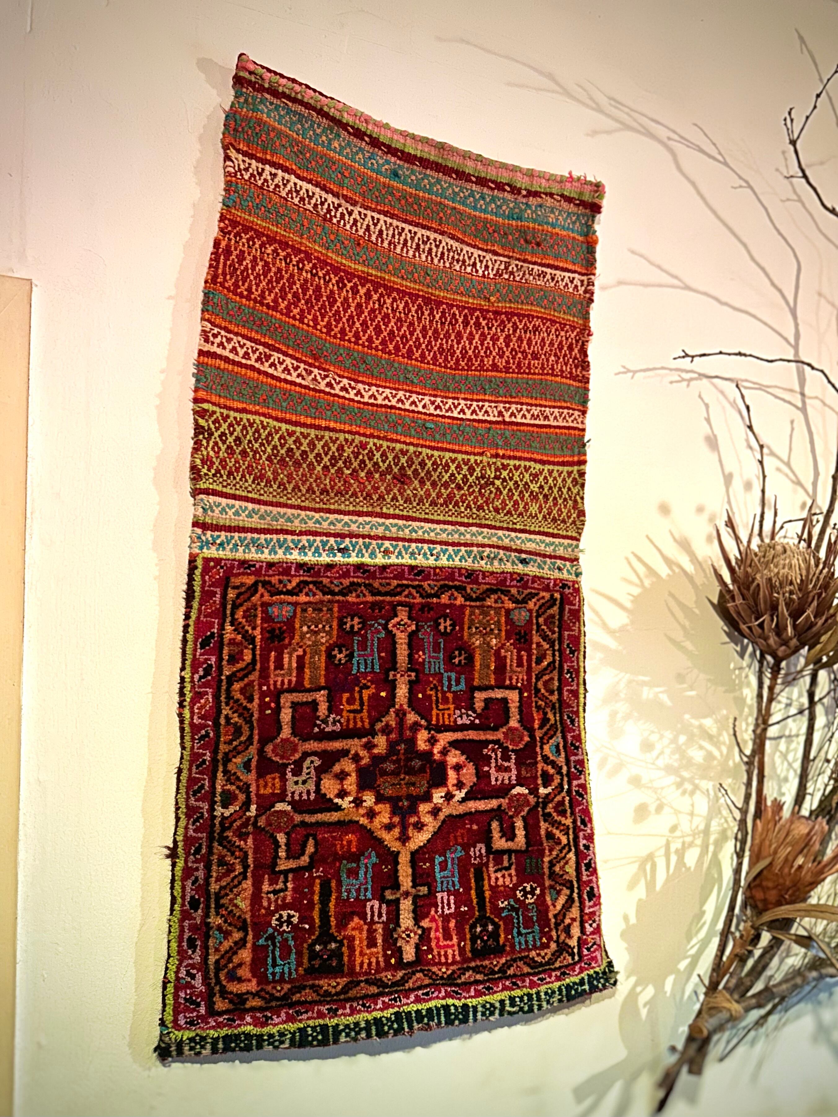 移動中の生活用品や家畜の飼い葉を入れる丈夫な袋ですが、マチがなく実用性に欠けるのが難点かと、大概は解体されてパイル部分だけをよく見かけますが、こちらは背面キリムの見事な出来栄えに現状維持として取っておきたいと思った1枚になります。