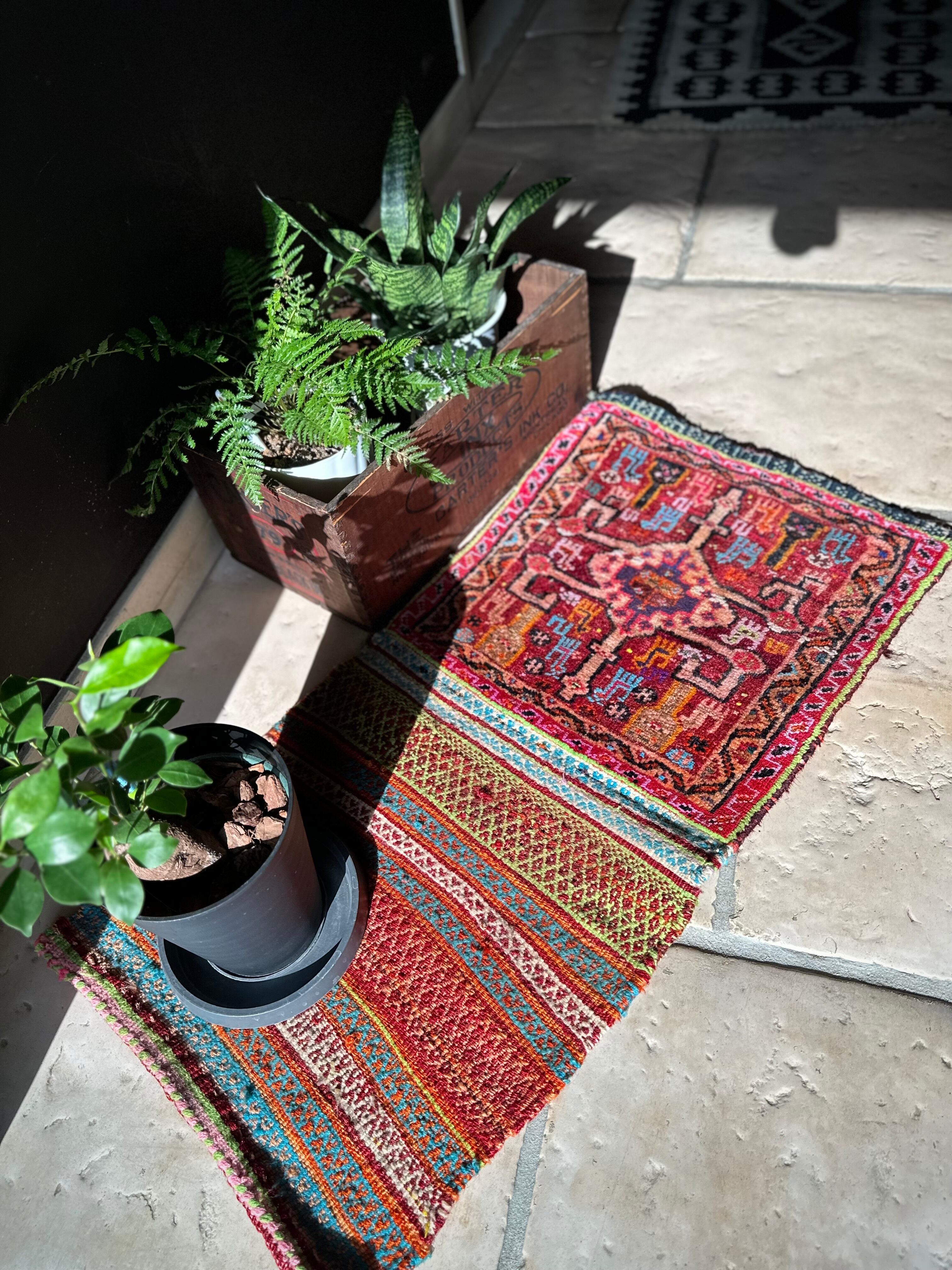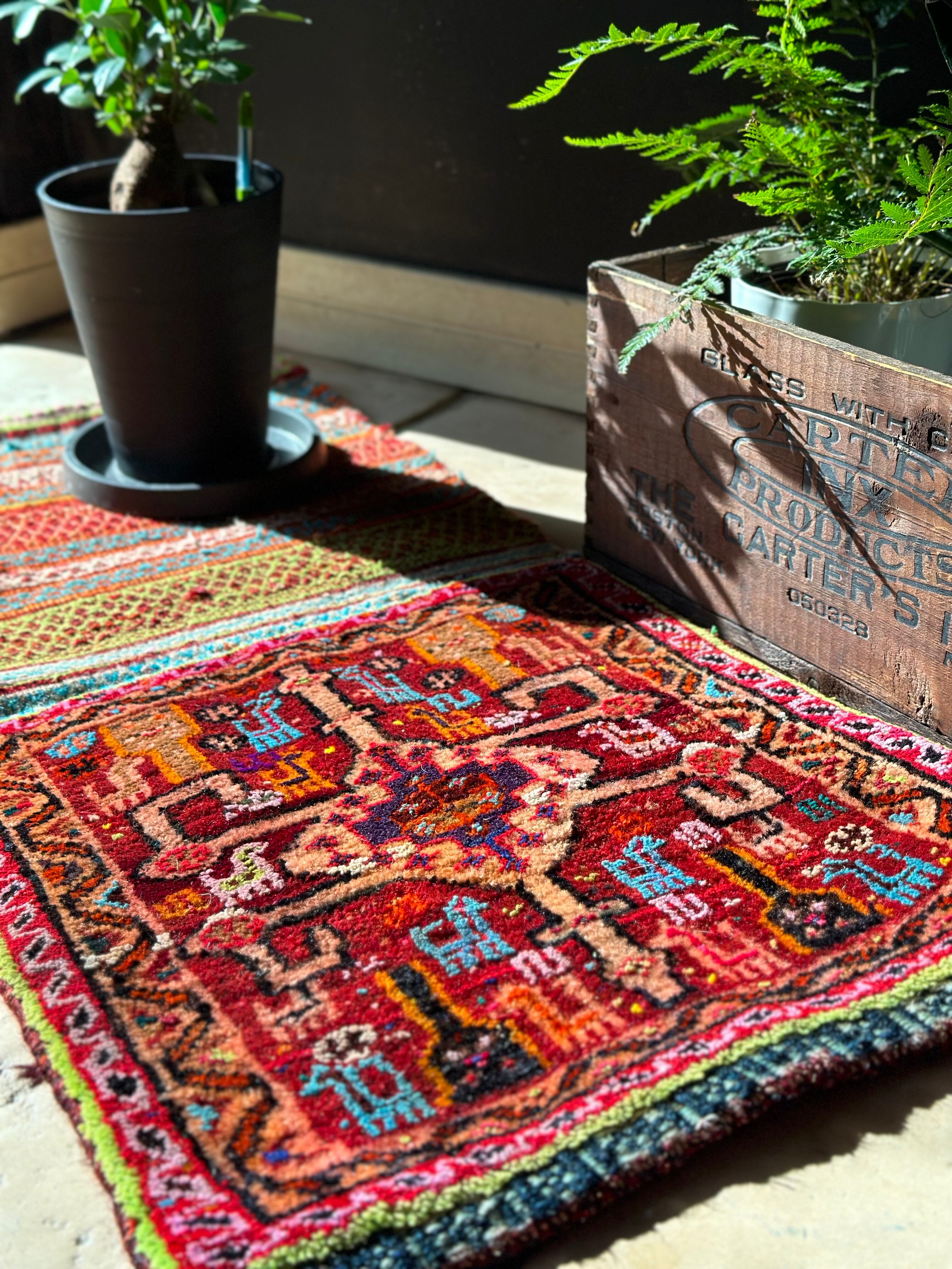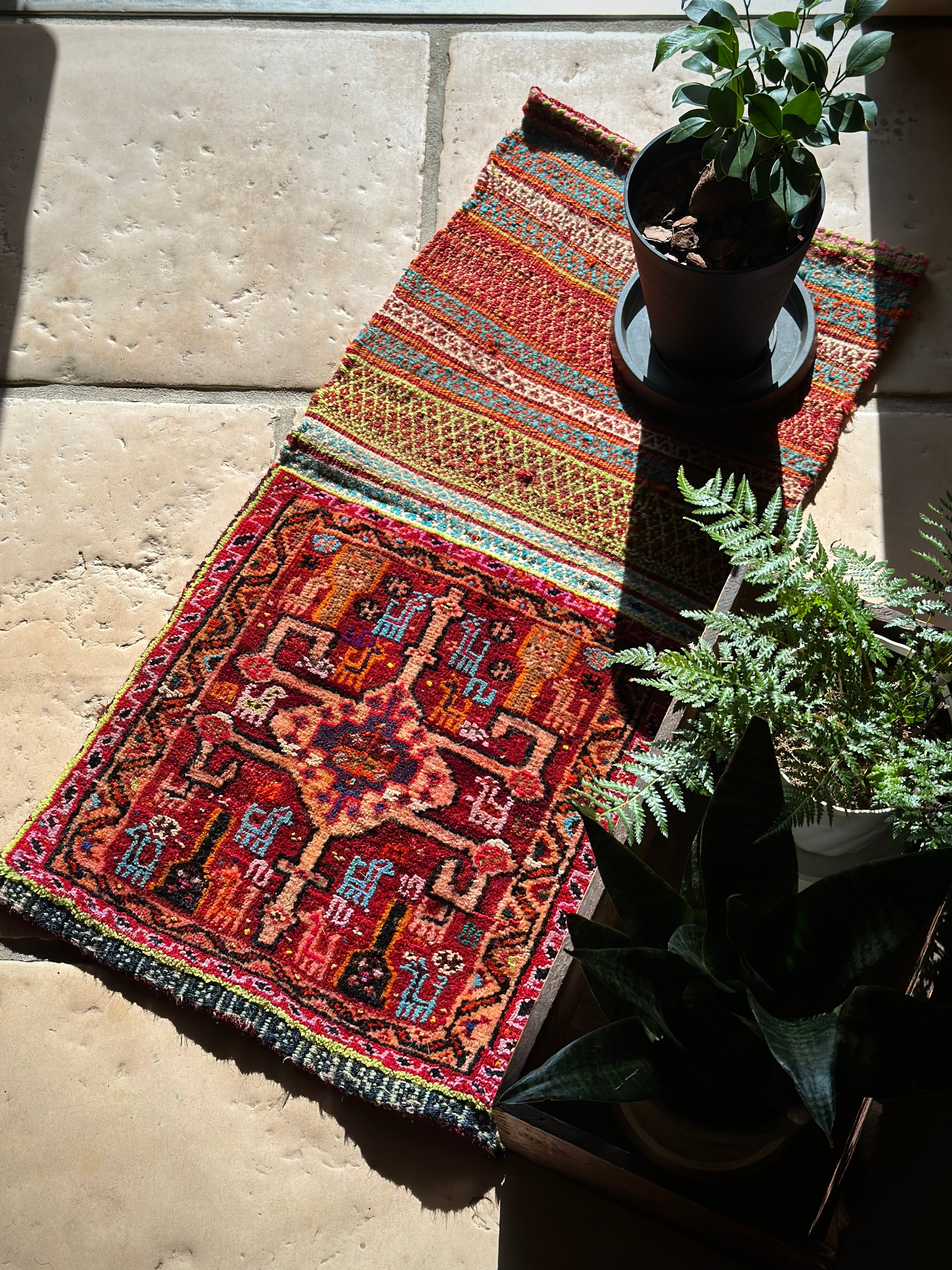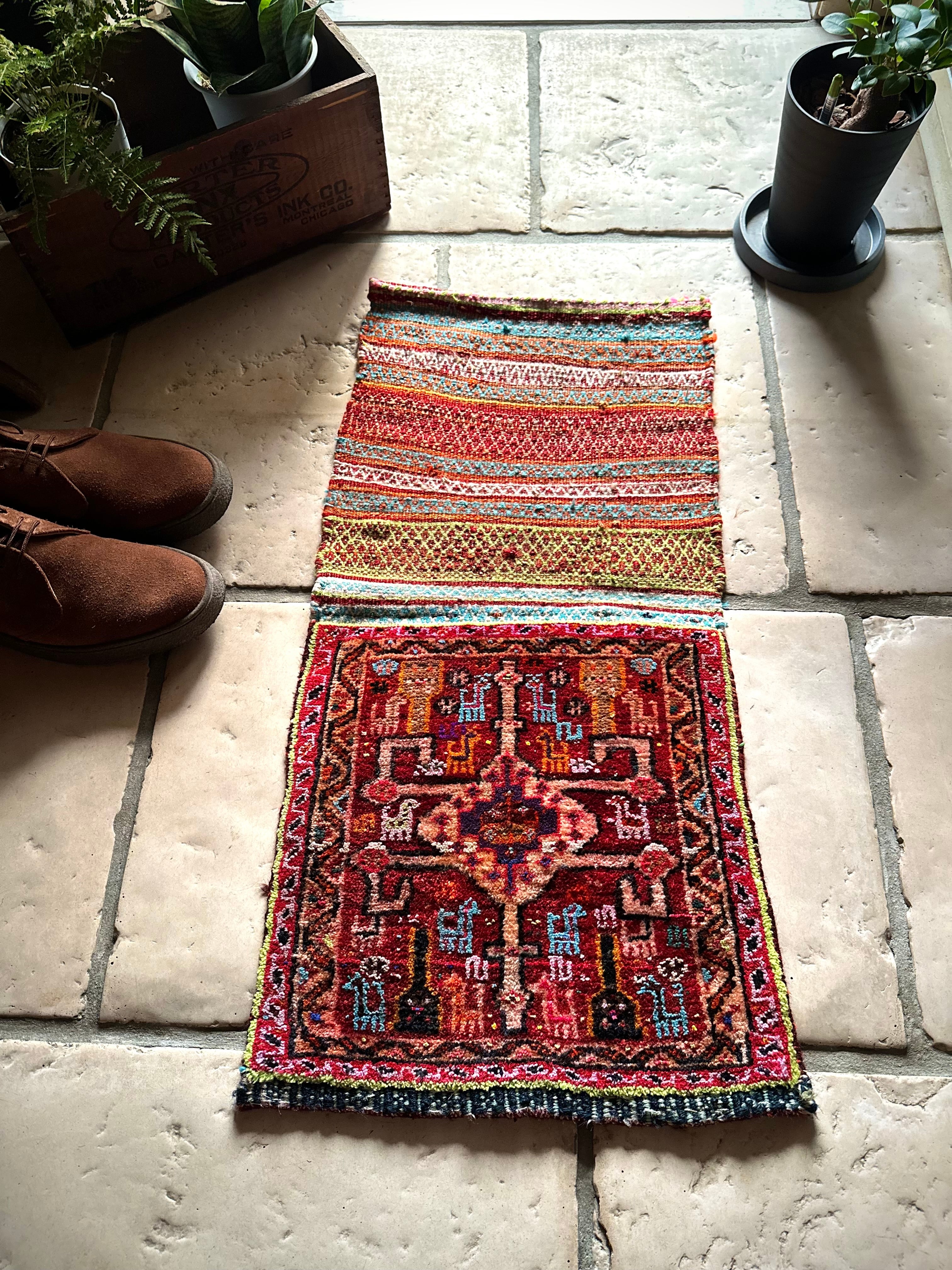 またラグそのものに関しては羊毛特有の匂いがあり手織りによる歪みや経年劣化、草木染めによる色ムラなどがありますが、それもまたトライバルラグの魅力かとご理解ください。