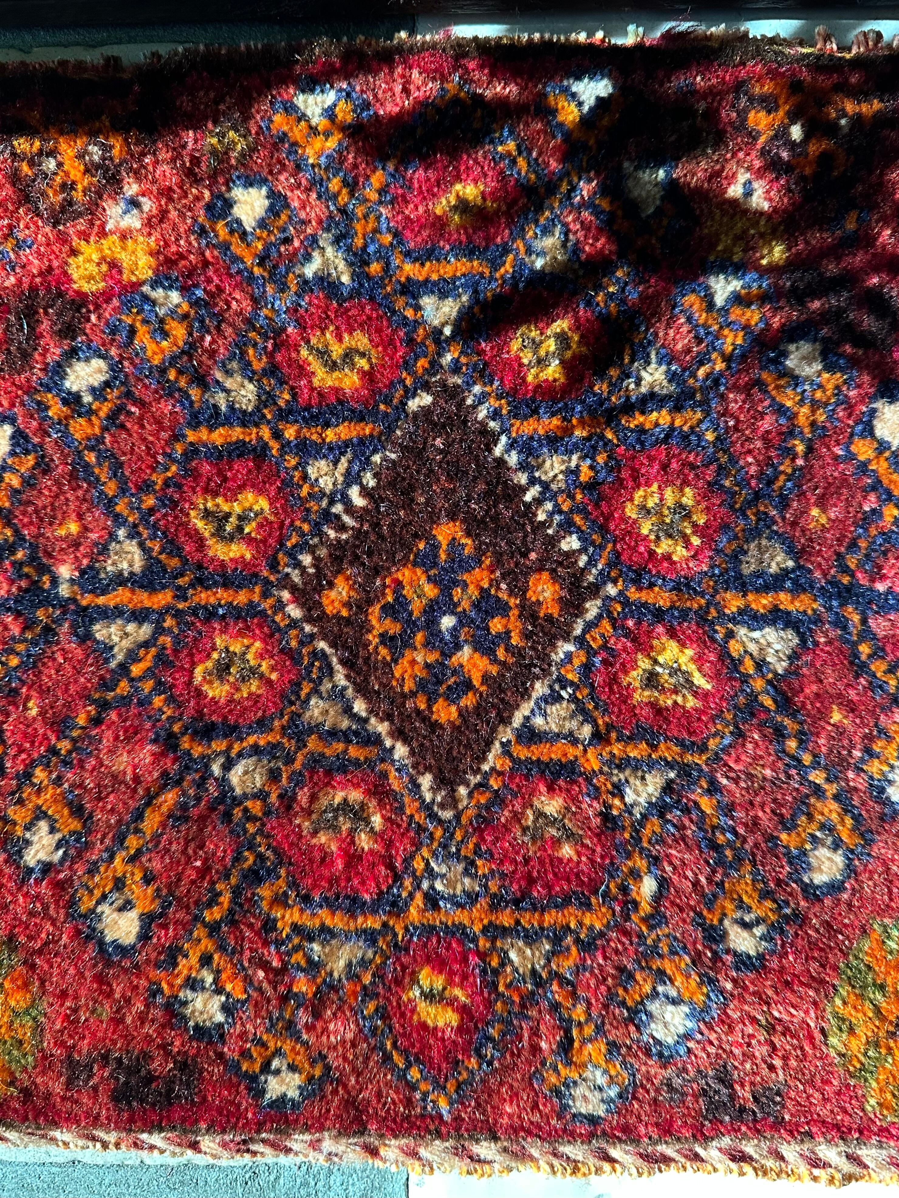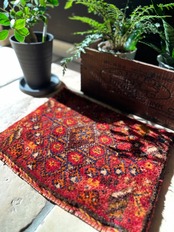 またラグそのものに関しては羊毛特有の匂いがあり手織りによる歪みや経年劣化、草木染めによる色ムラなどがありますが、それもまたトライバルラグの魅力かとご理解ください。