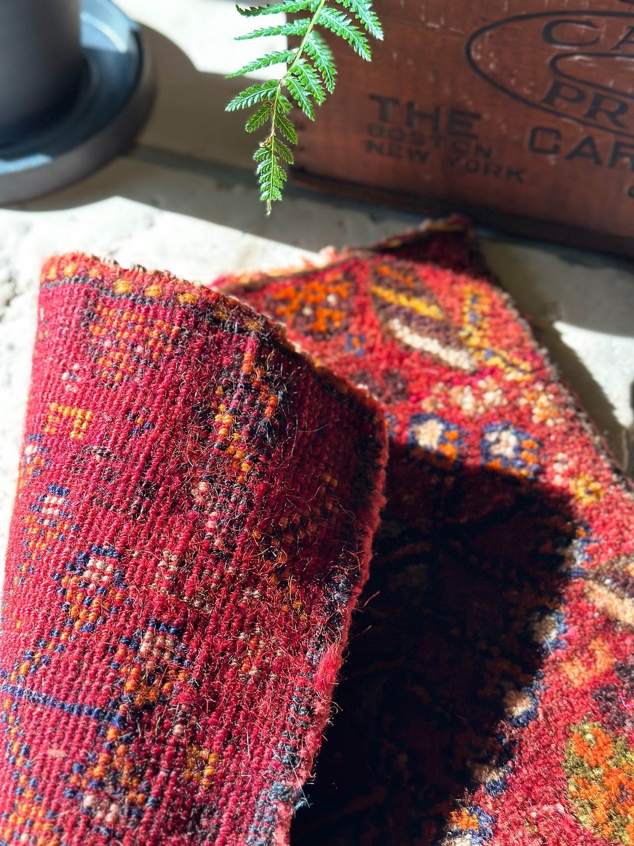 年代的には50年以上前のモノと古く、それなりの使用感はありますが、カシュガイ族ならではの分厚い織りに陽に当たった時の色合いがなんとも綺麗で、西陽が射すタイミングまで写真撮影を待ちぼうけしていました。