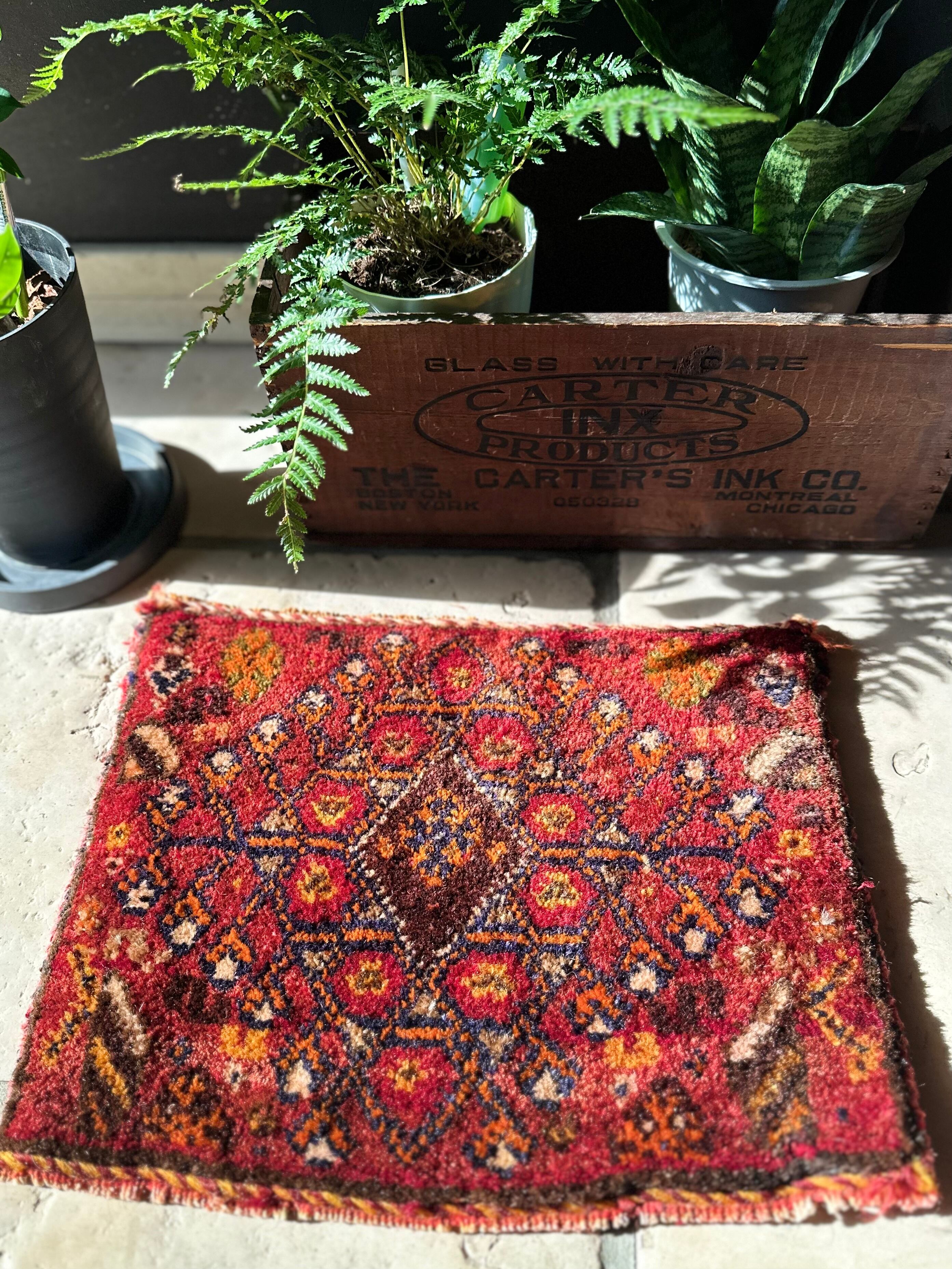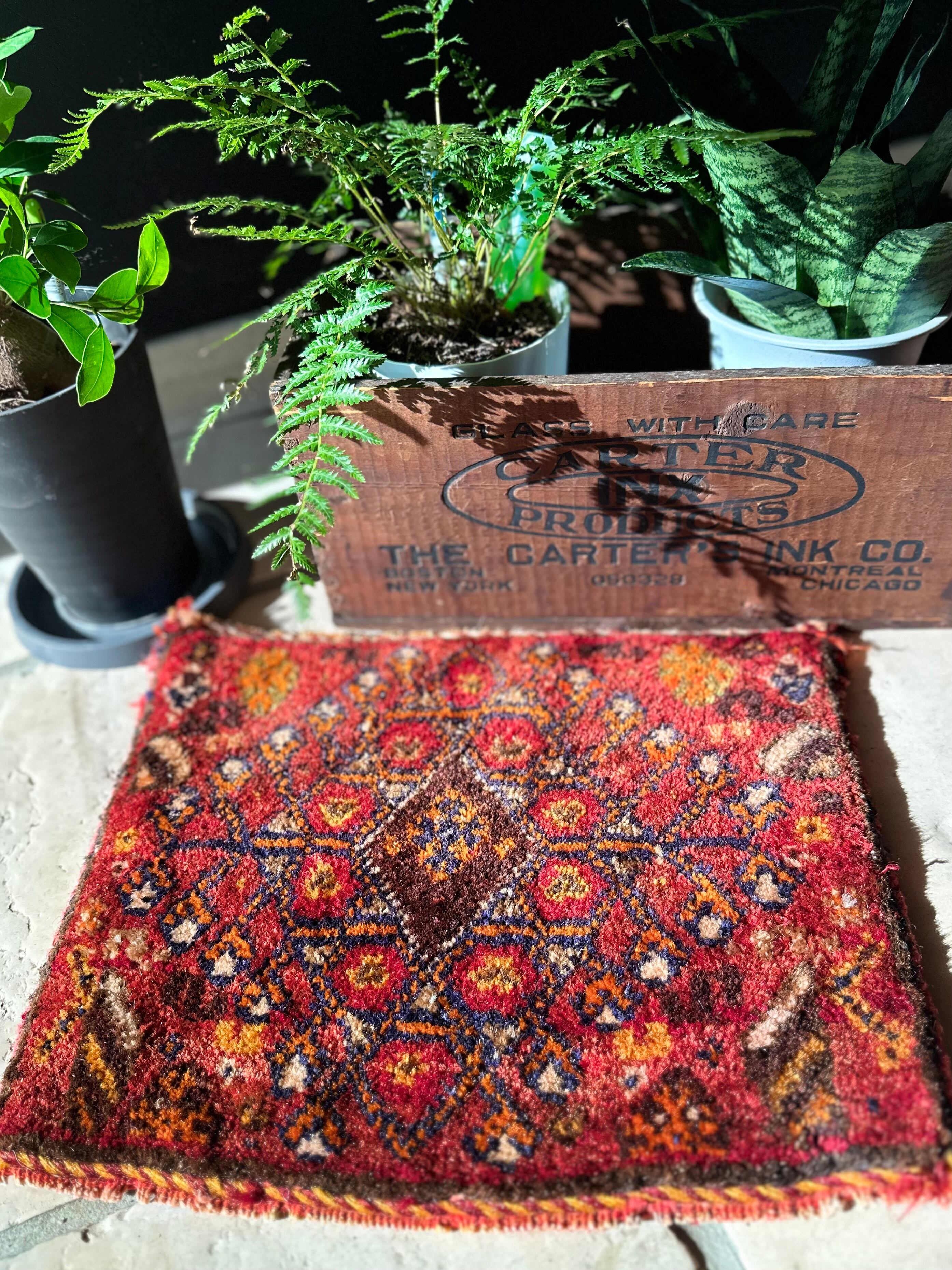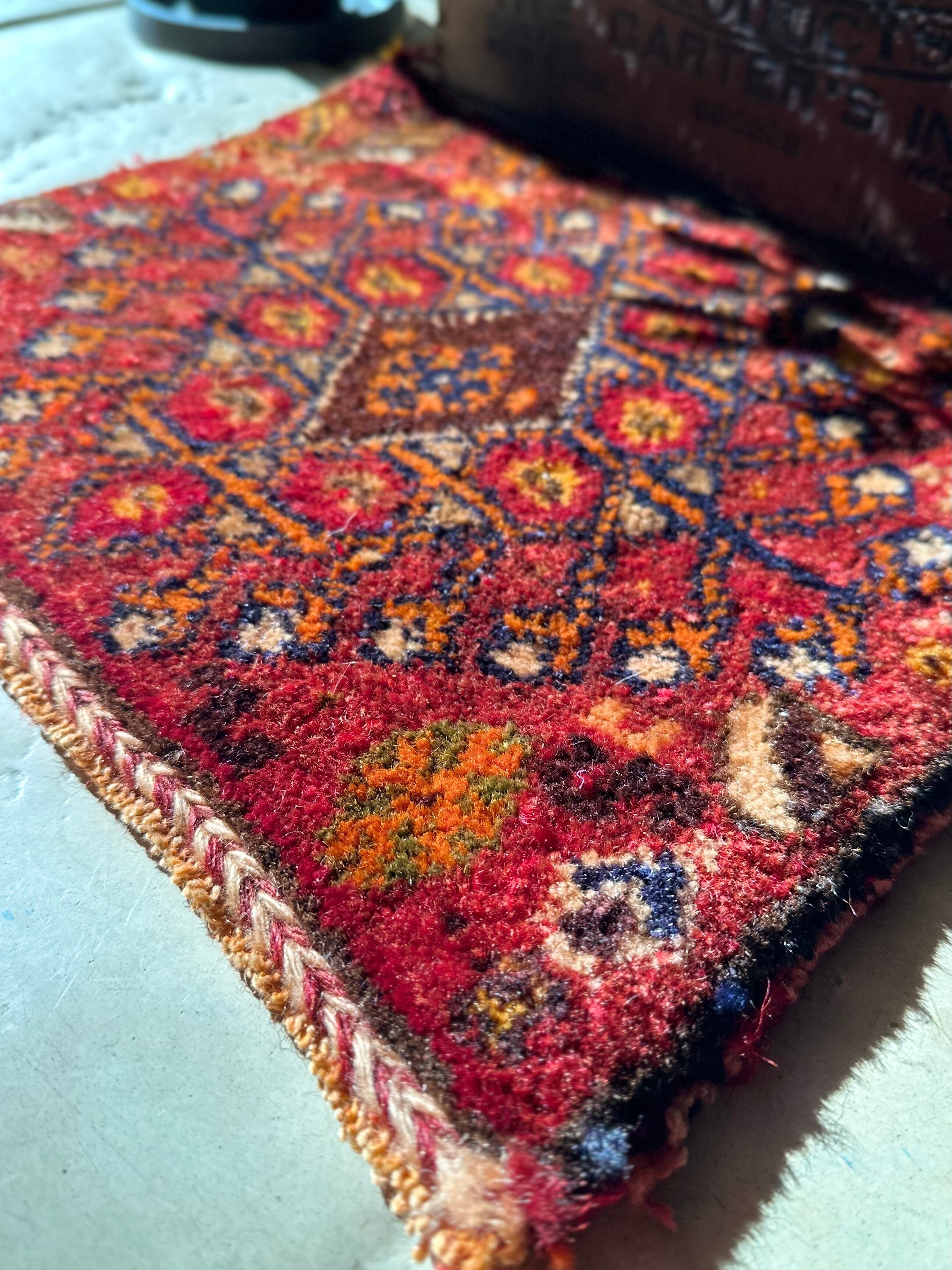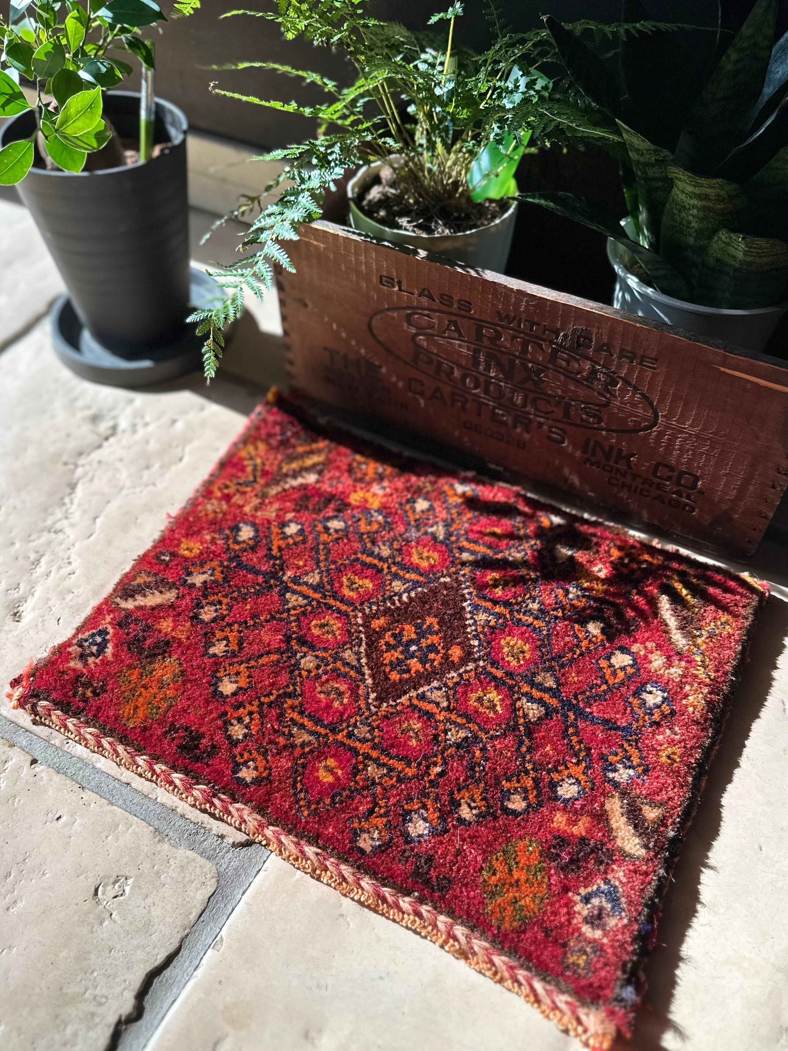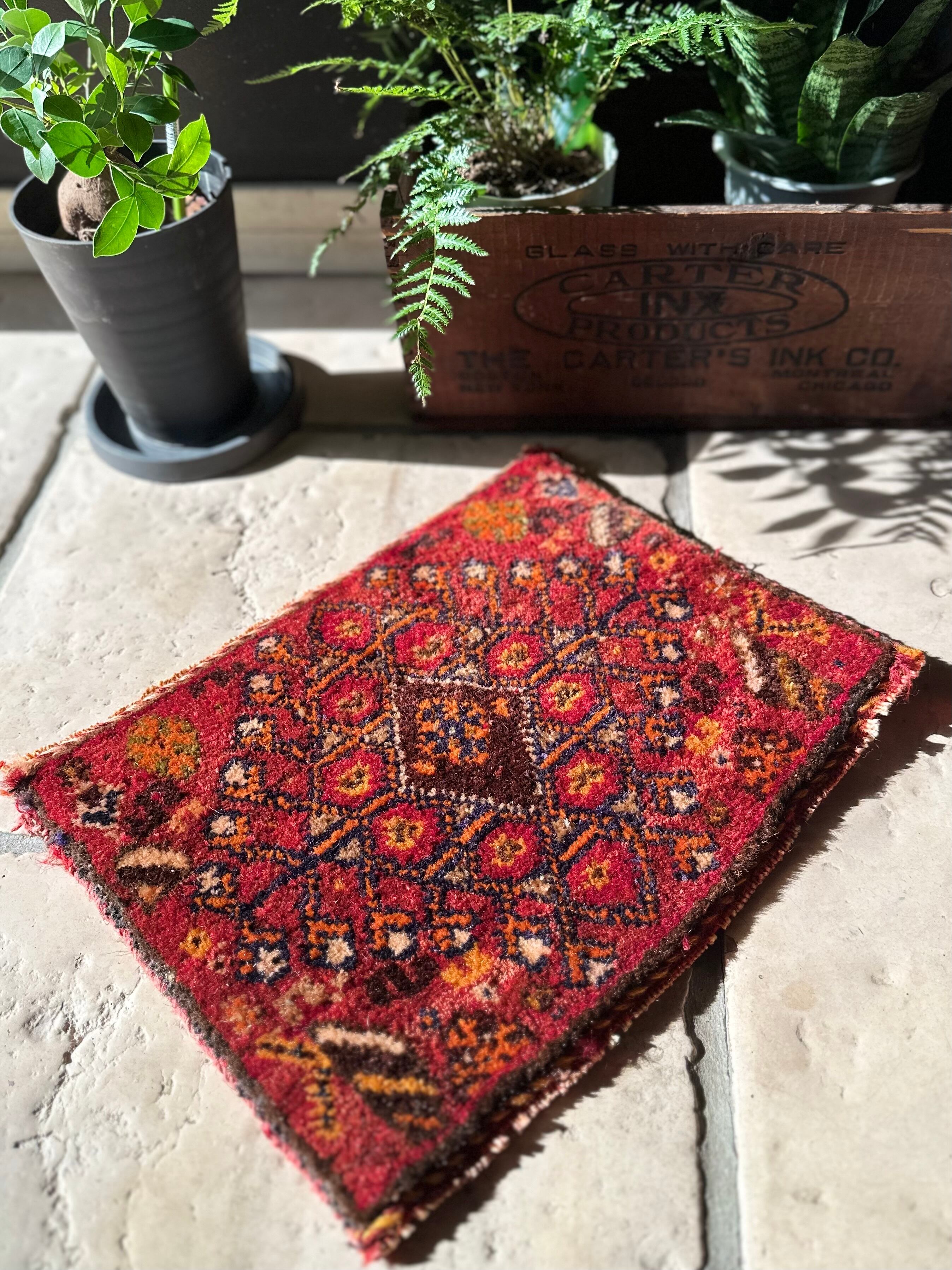 移動途中の生活用品や家畜の飼い葉を入れる丈夫な袋ですが、マチがなく実用性に欠けるのが難点で、こちらはパイル部分だけをカットした小さな敷物になります。