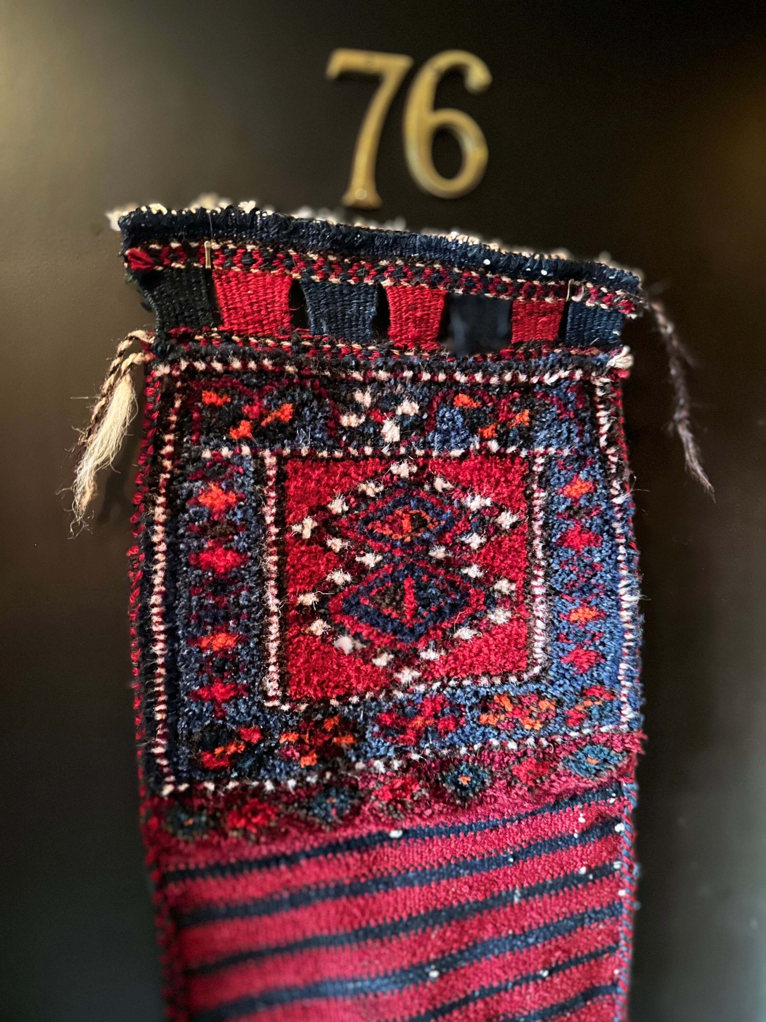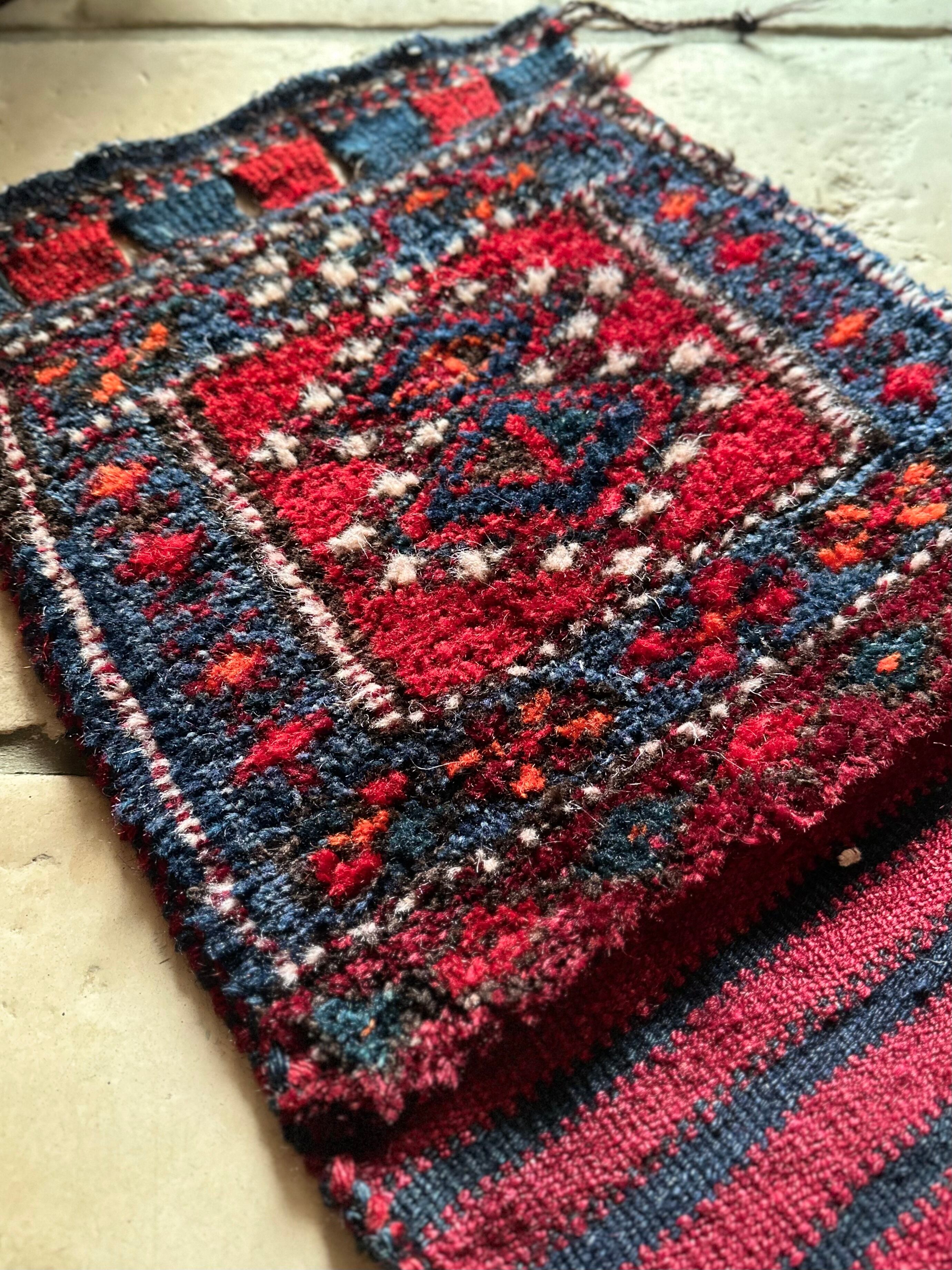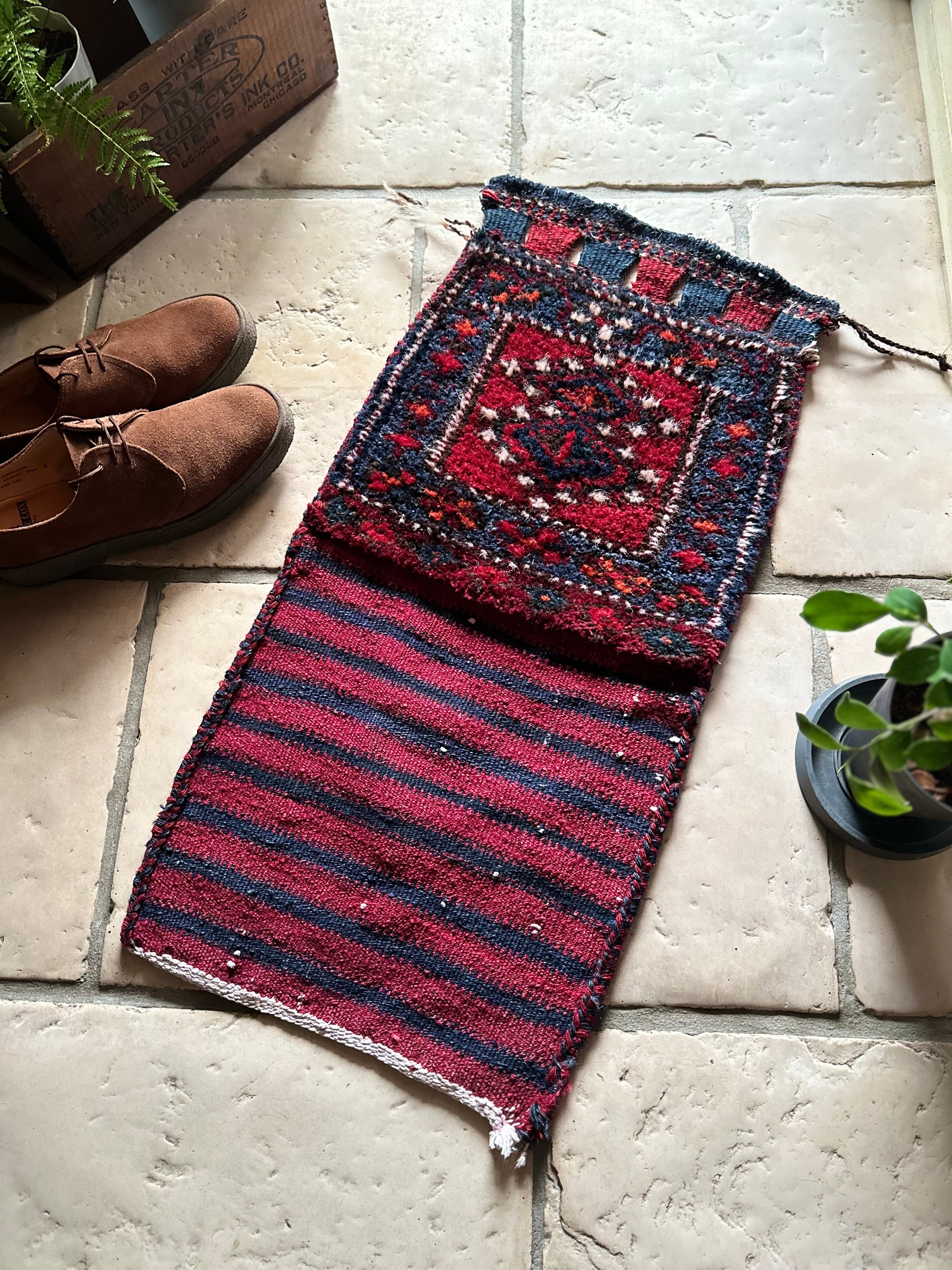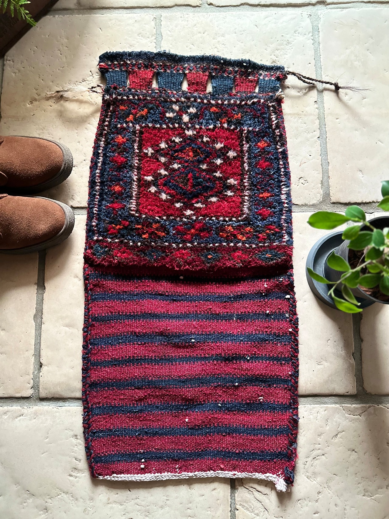 チャンテとは遊牧民が移動する際に用いる小振りな袋で、主に生活用品や家畜の飼い葉を収納する丈夫な手提げバッグになりますが、マチのない作り故に実用性がありませんので、大概は解体されたパイル部分のみを小さな敷物として販売されていますが、こちらはキリムの色合いに全体的な雰囲気もよく、ワインレッドとネイビーの色合いがカッコいいです。
