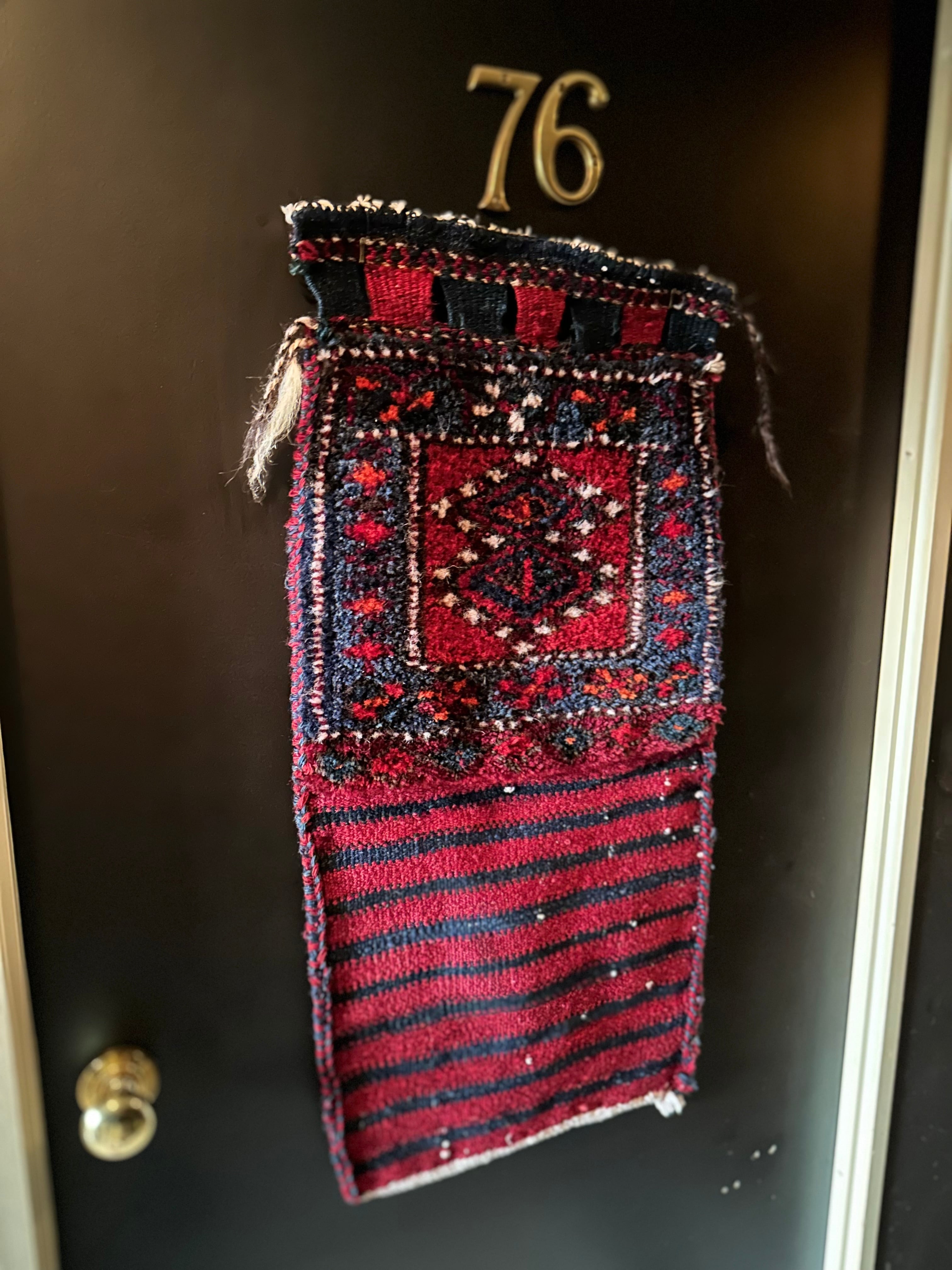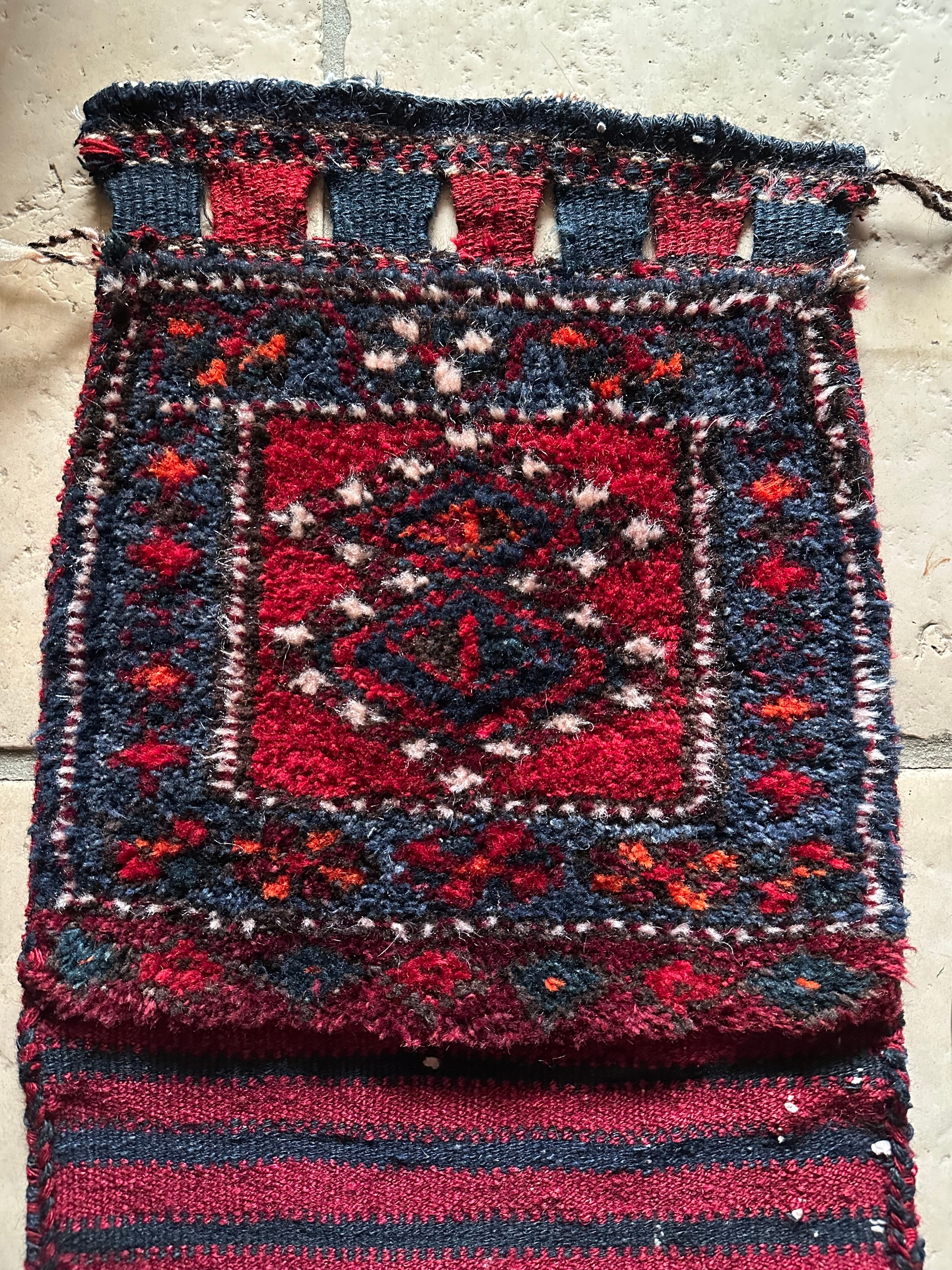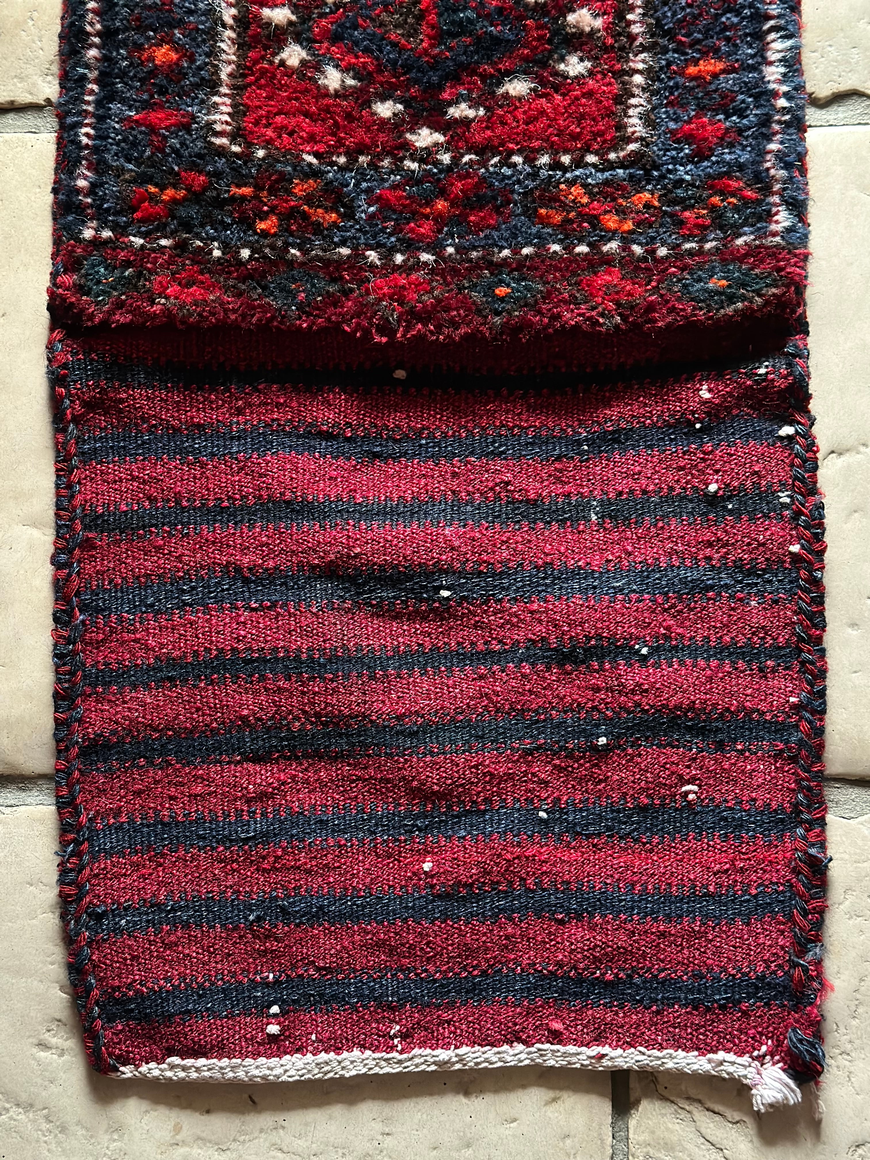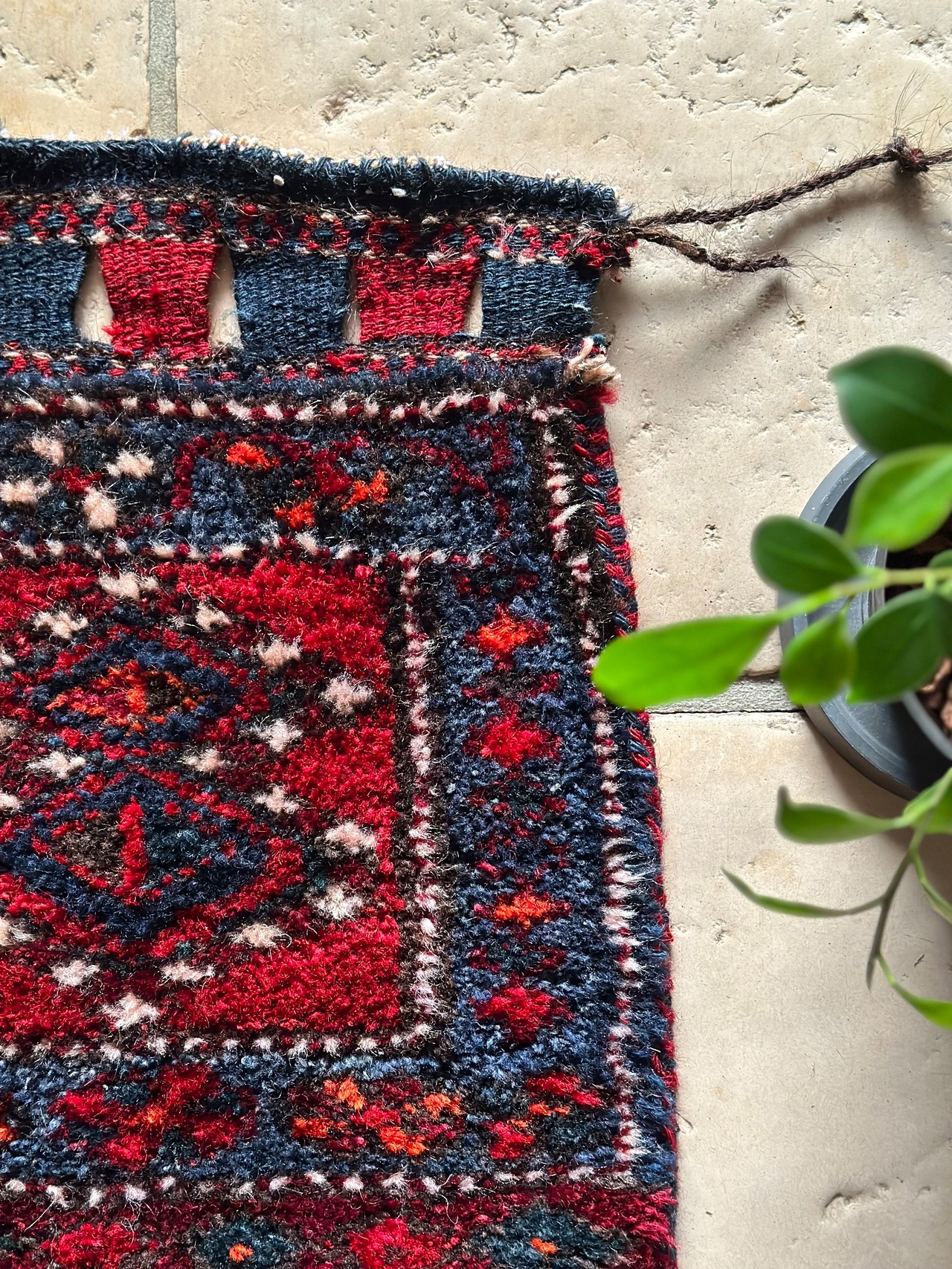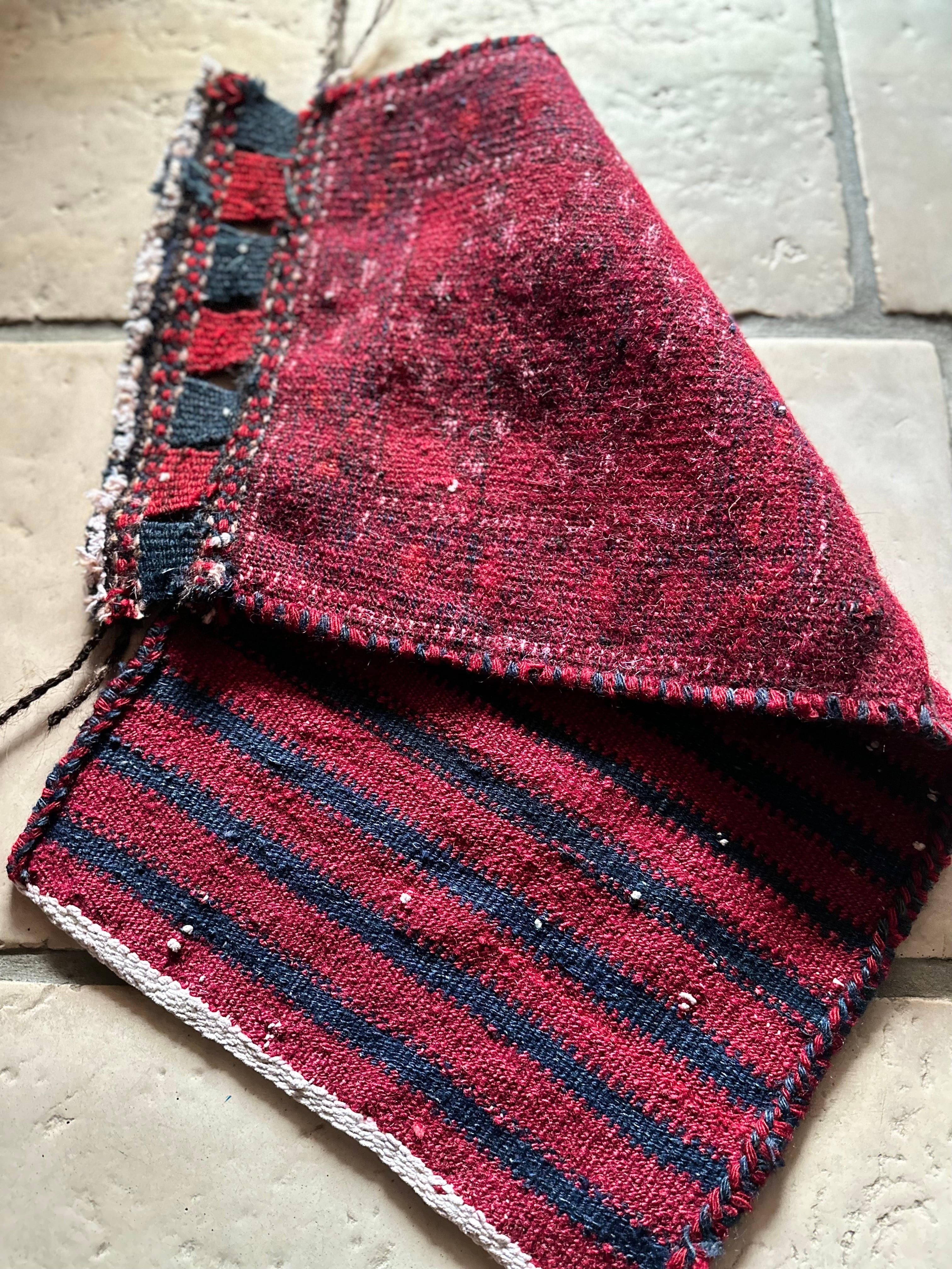 チャンテとは遊牧民が移動する際に用いる小振りな袋で、主に生活用品や家畜の飼い葉を収納する丈夫な手提げバッグになりますが、マチのない作り故に実用性がありませんので、大概は解体されたパイル部分のみを小さな敷物として販売されていますが、こちらはキリムの色合いに全体的な雰囲気もよく、ワインレッドとネイビーの色合いがカッコいいです。