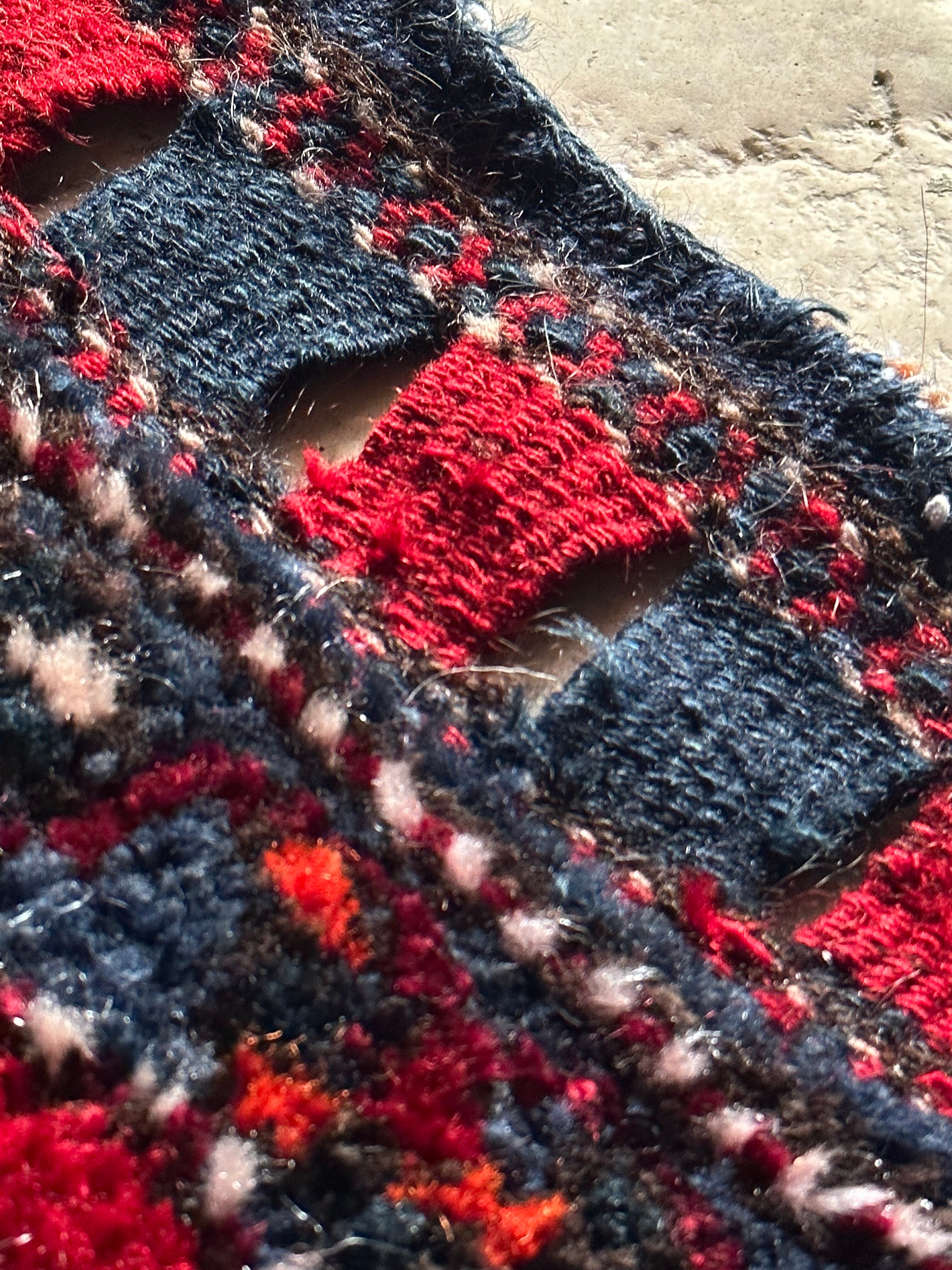 またラグそのものに関しては羊毛特有の匂いがあり手織りによる歪みや経年劣化、草木染めによる色ムラなどがありますが、それもまたトライバルラグの魅力かとご理解ください。