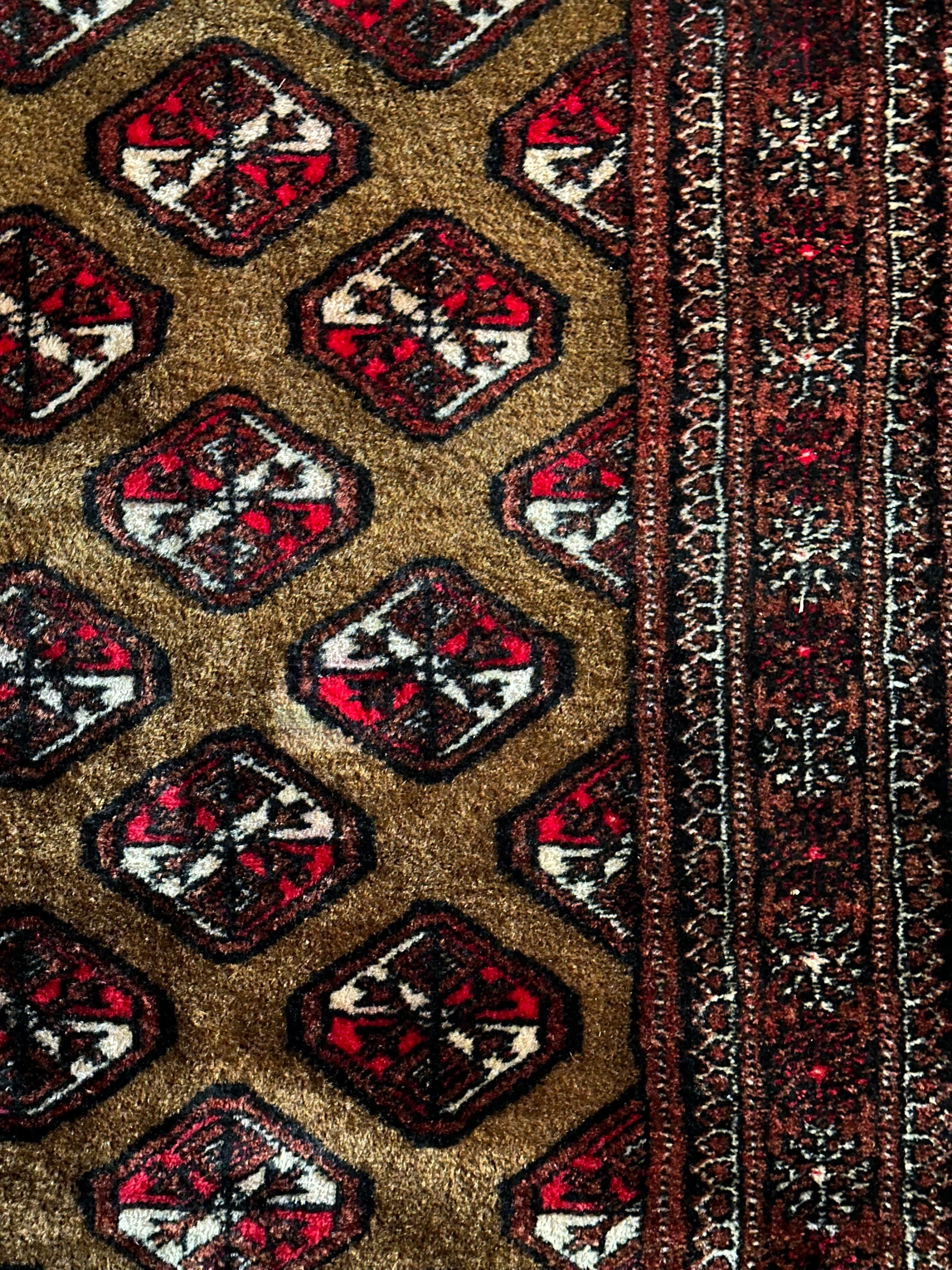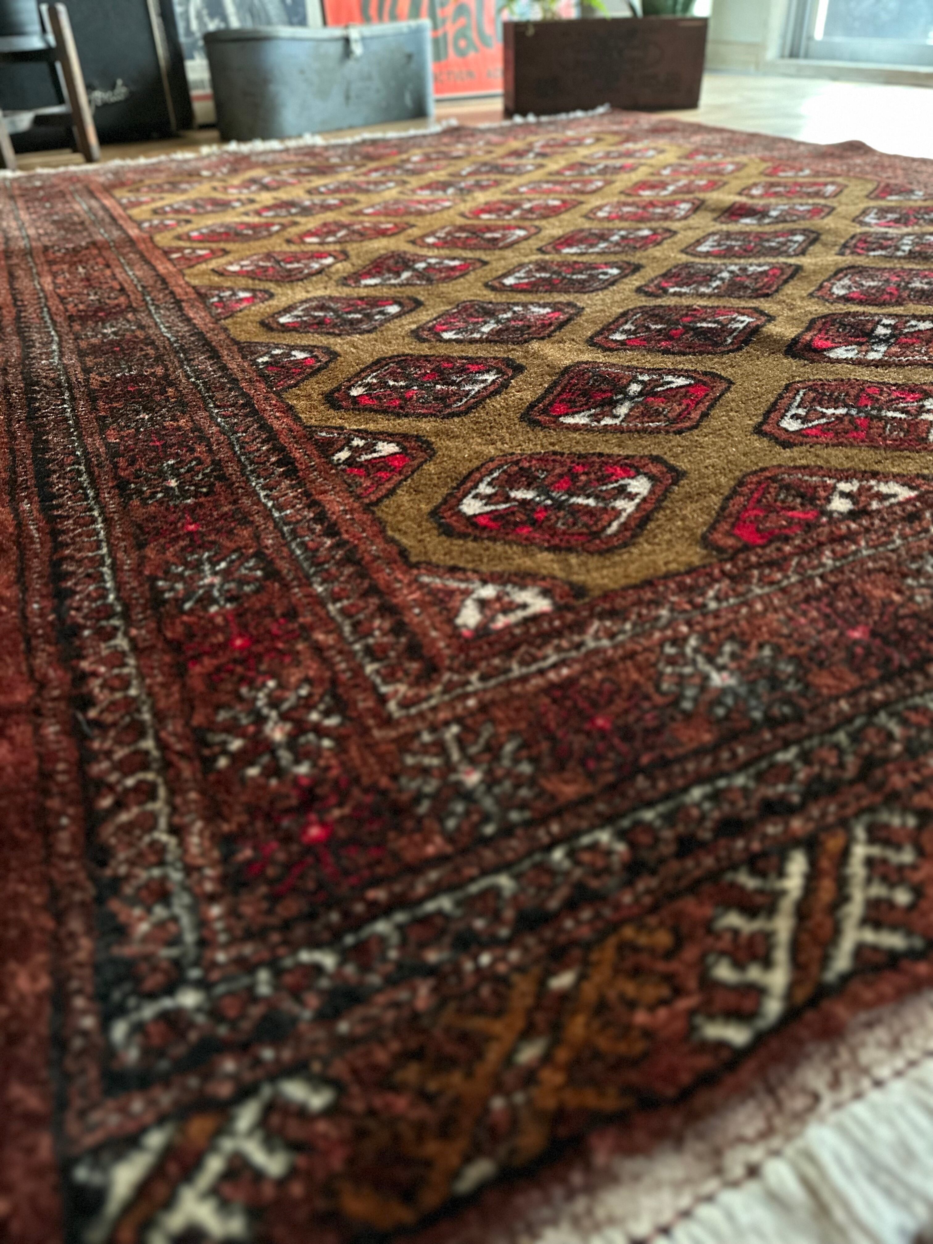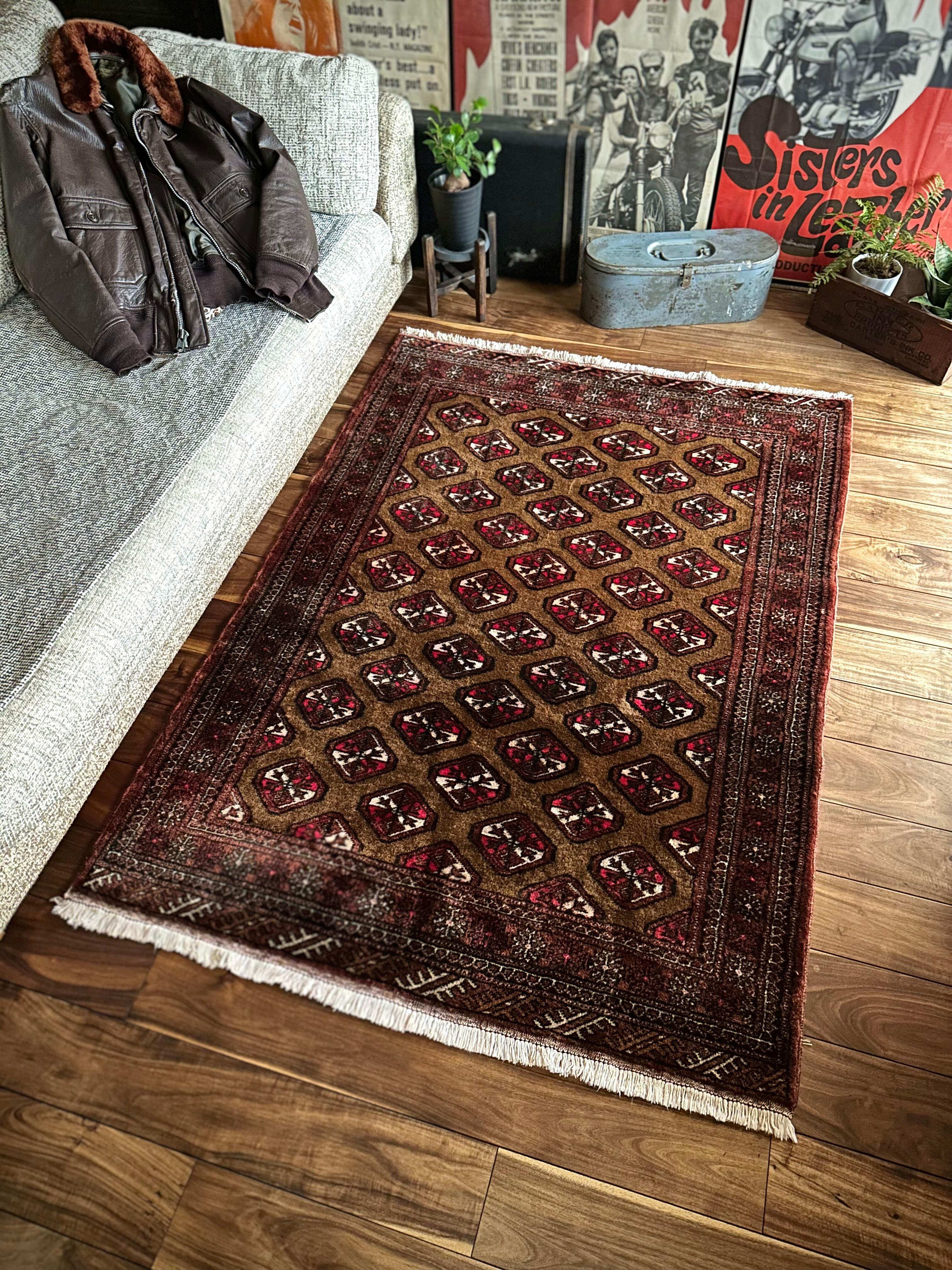 数多いトルクメンの中でも主要部族であるテッケ族の家紋をデフォルメした連続紋様が描かれながらも、全体的な雰囲気はヤムート族っぽいかなと、時の流れを経た異部族交流が生み出した1枚になるのでしょうか、艶のある油分を含んだウールの手触りがなんとも言えません。