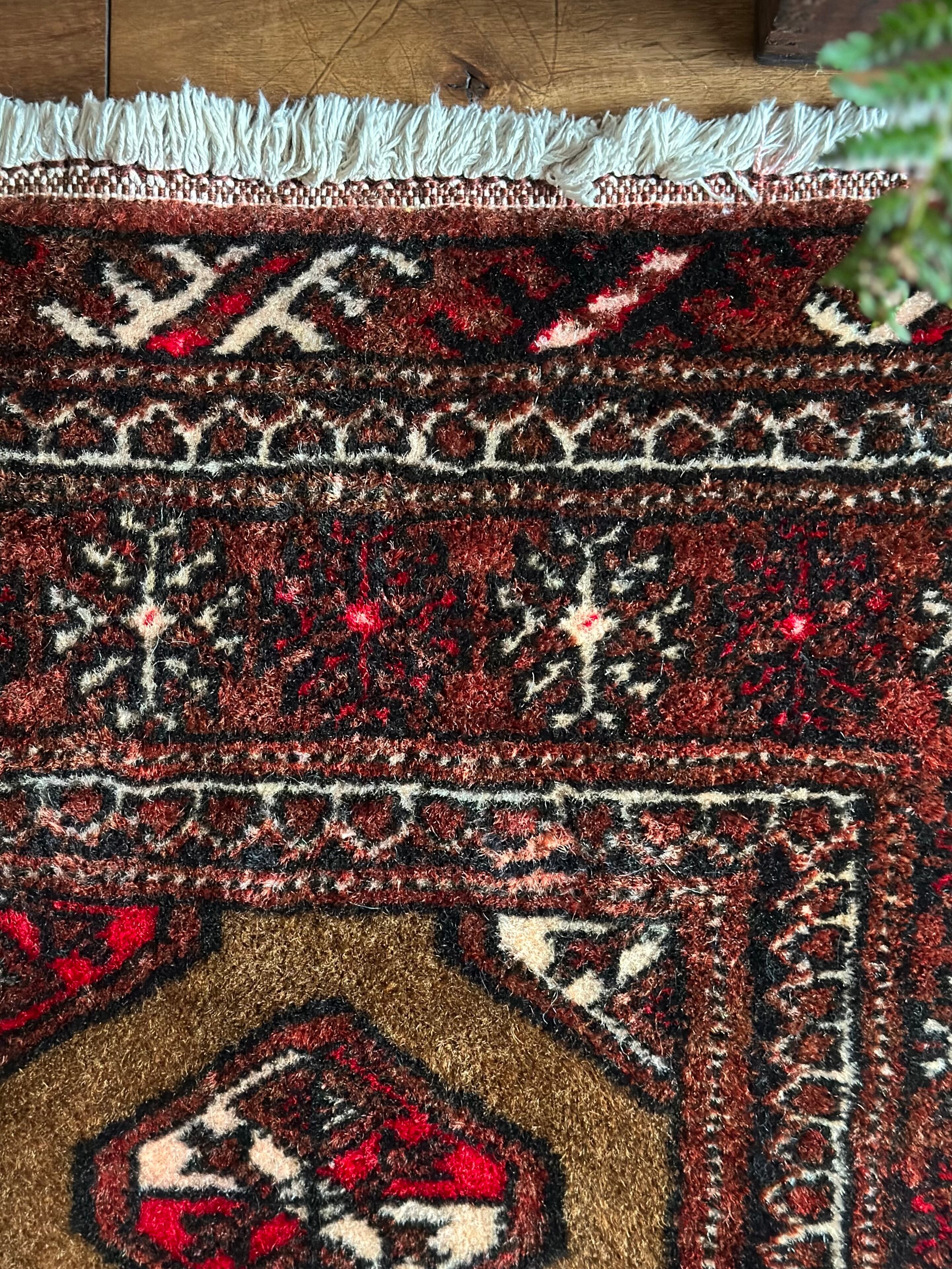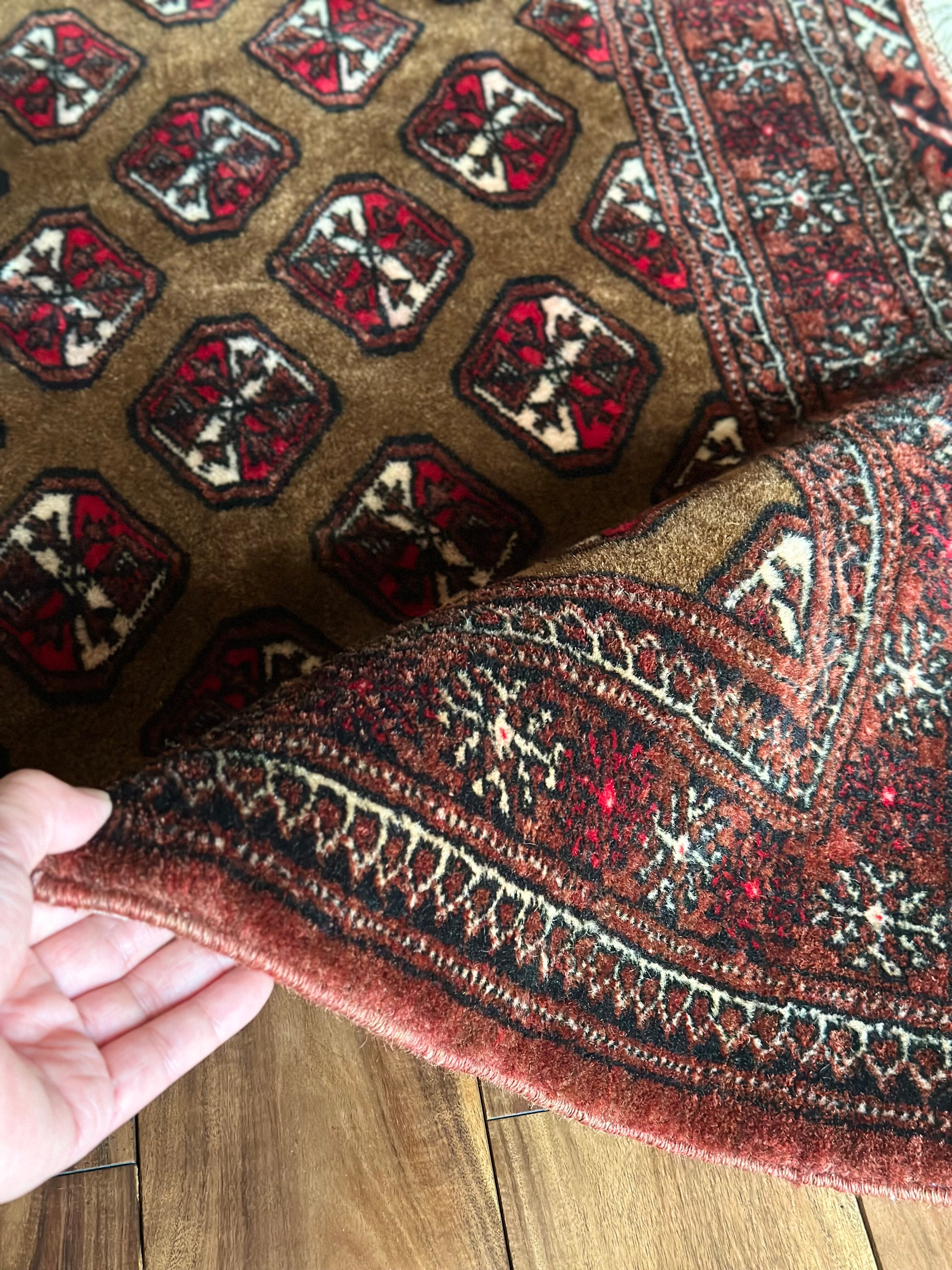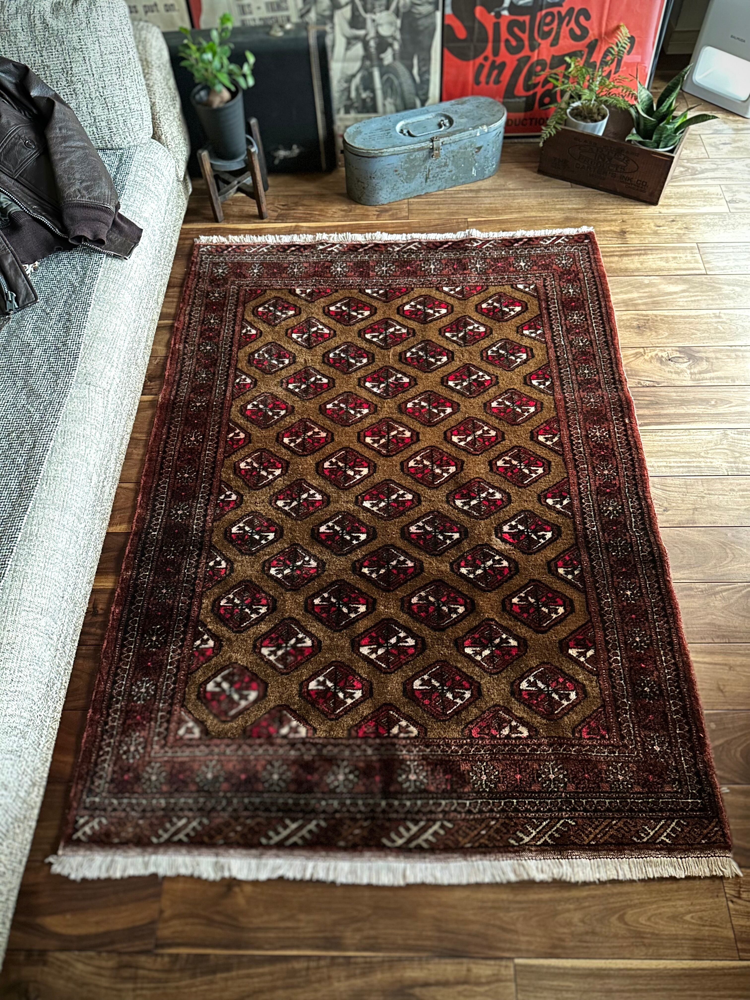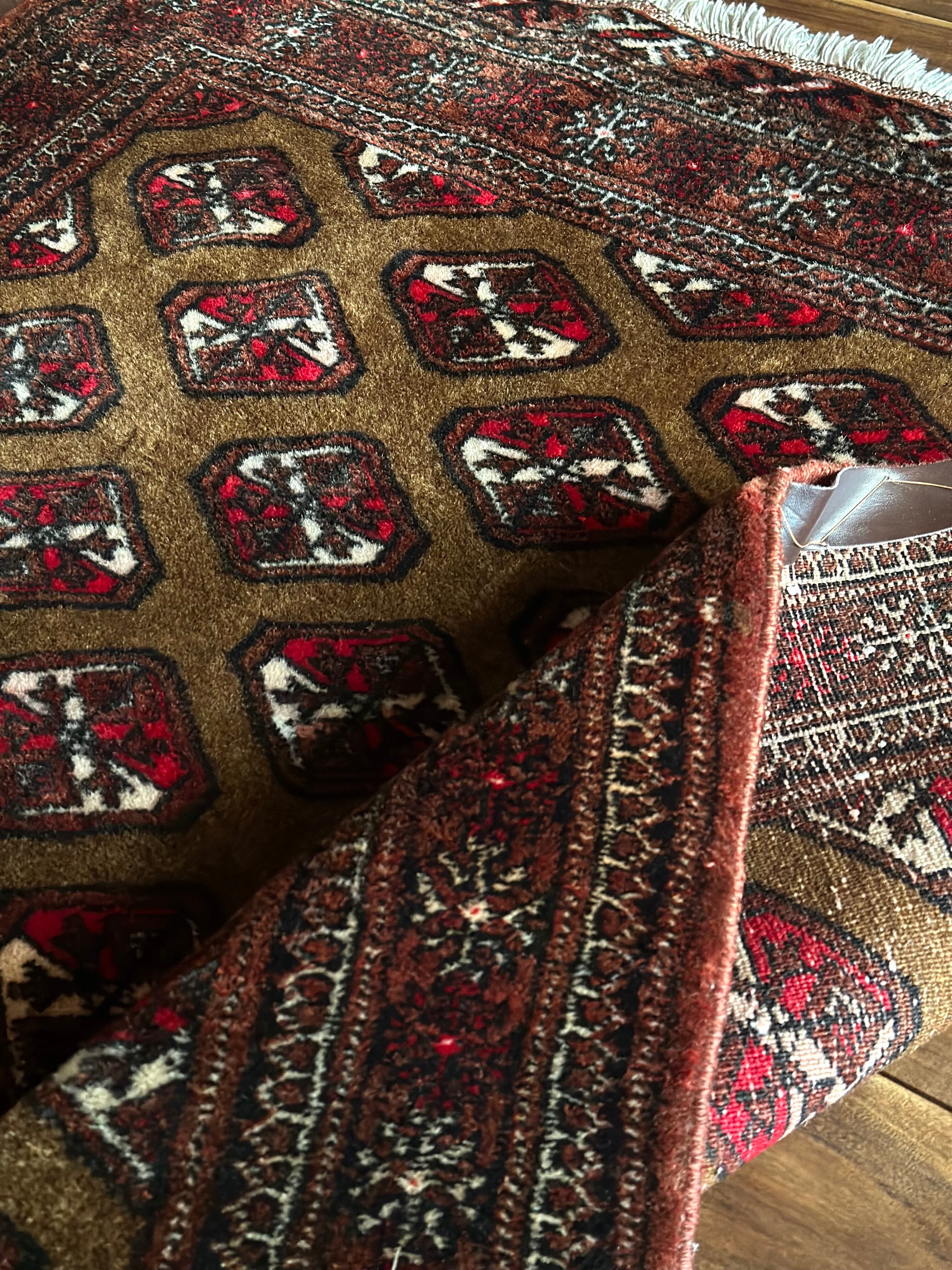 数多いトルクメンの中でも主要部族であるテッケ族の家紋をデフォルメした連続紋様が描かれながらも、全体的な雰囲気はヤムート族っぽいかなと、時の流れを経た異部族交流が生み出した1枚になるのでしょうか、艶のある油分を含んだウールの手触りがなんとも言えません。