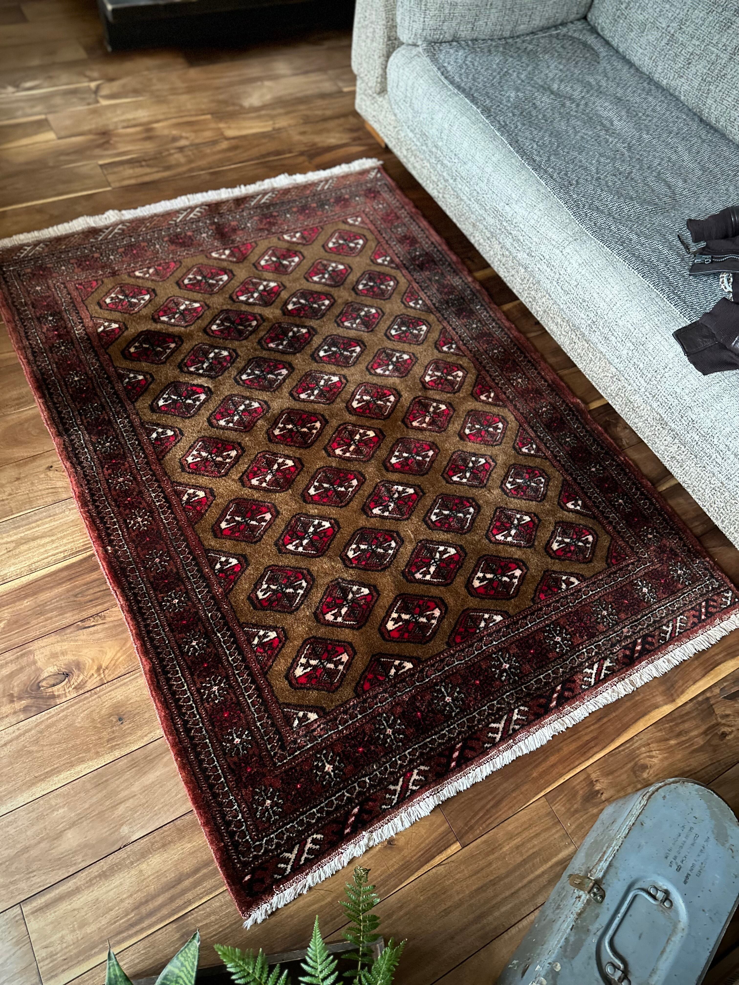 しっとりと落ち着いたカフェオレのベースカラーに赤味がかったブラウンの縁取りが冴えるトルクメンのトライバルラグになります。