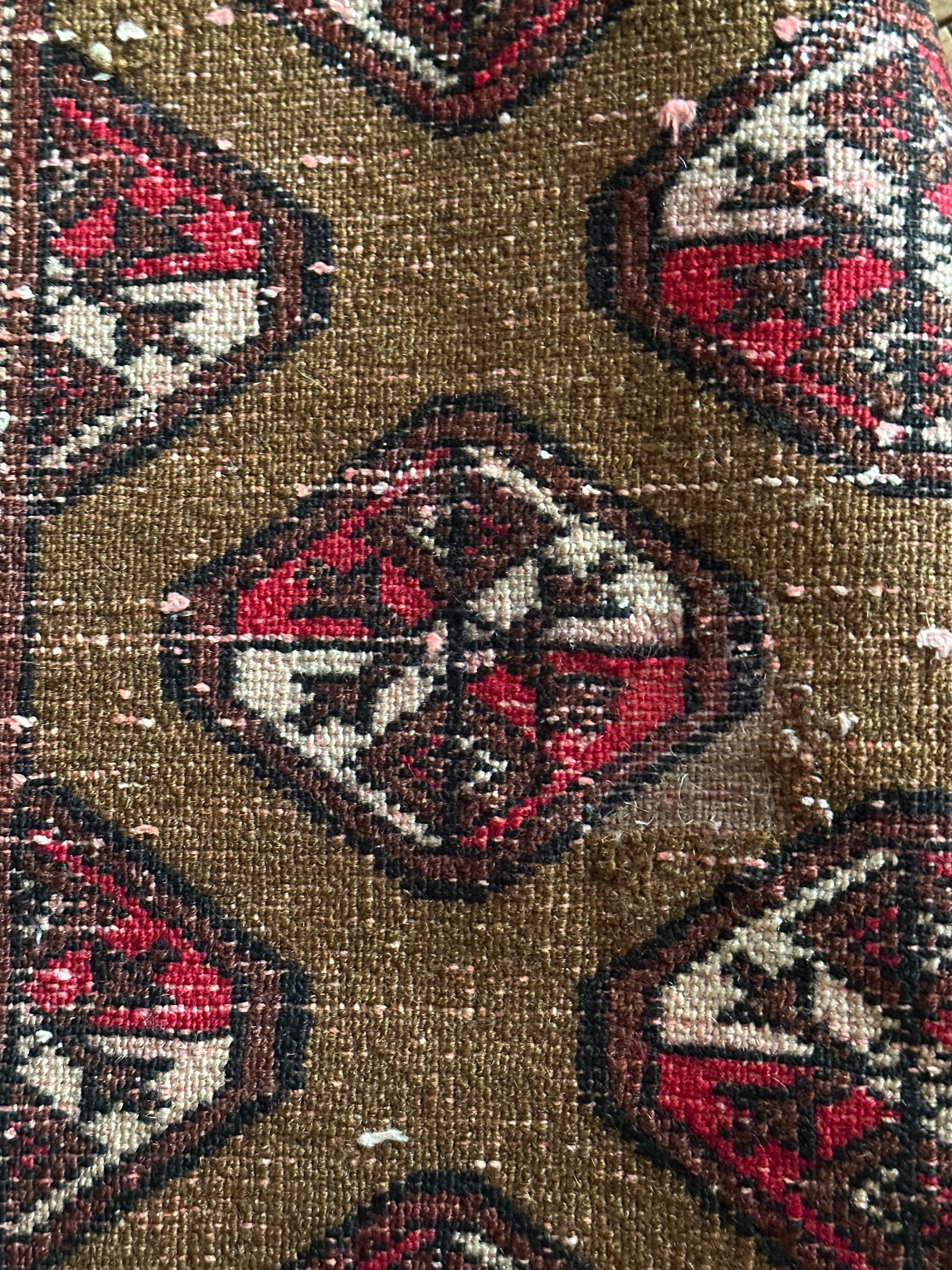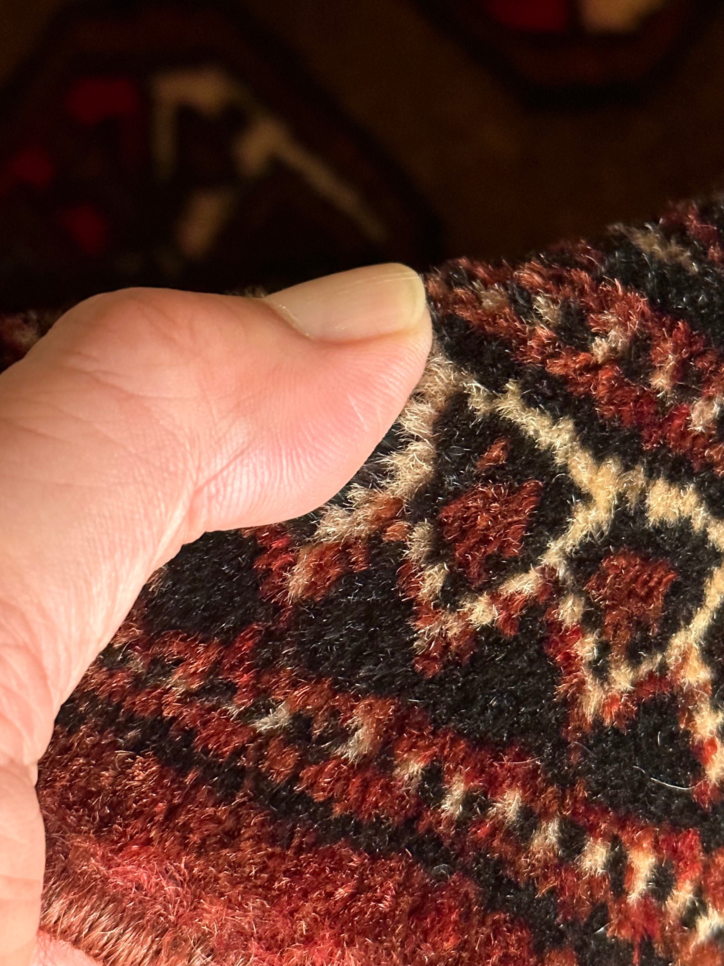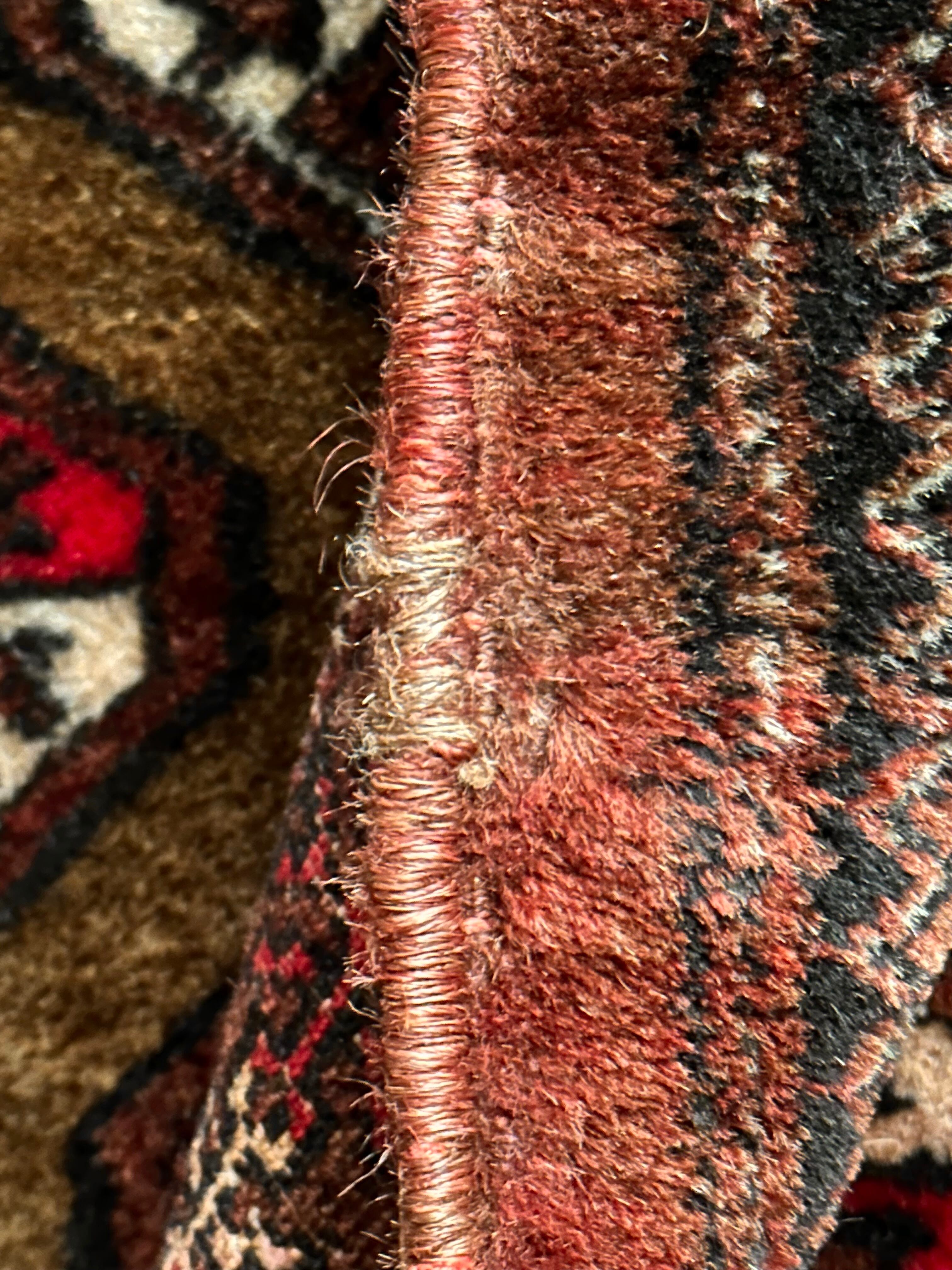 年代的には20年ほど前のモノとなり見た目に色焼けやリペアが数カ所施されていますが、パイル自体はフサフサとして気持ちよく、大きさ的にも長方形が多い中での正方形に近いサイズ感となり、ねじれ防止の為のウェイトテープが付いています。