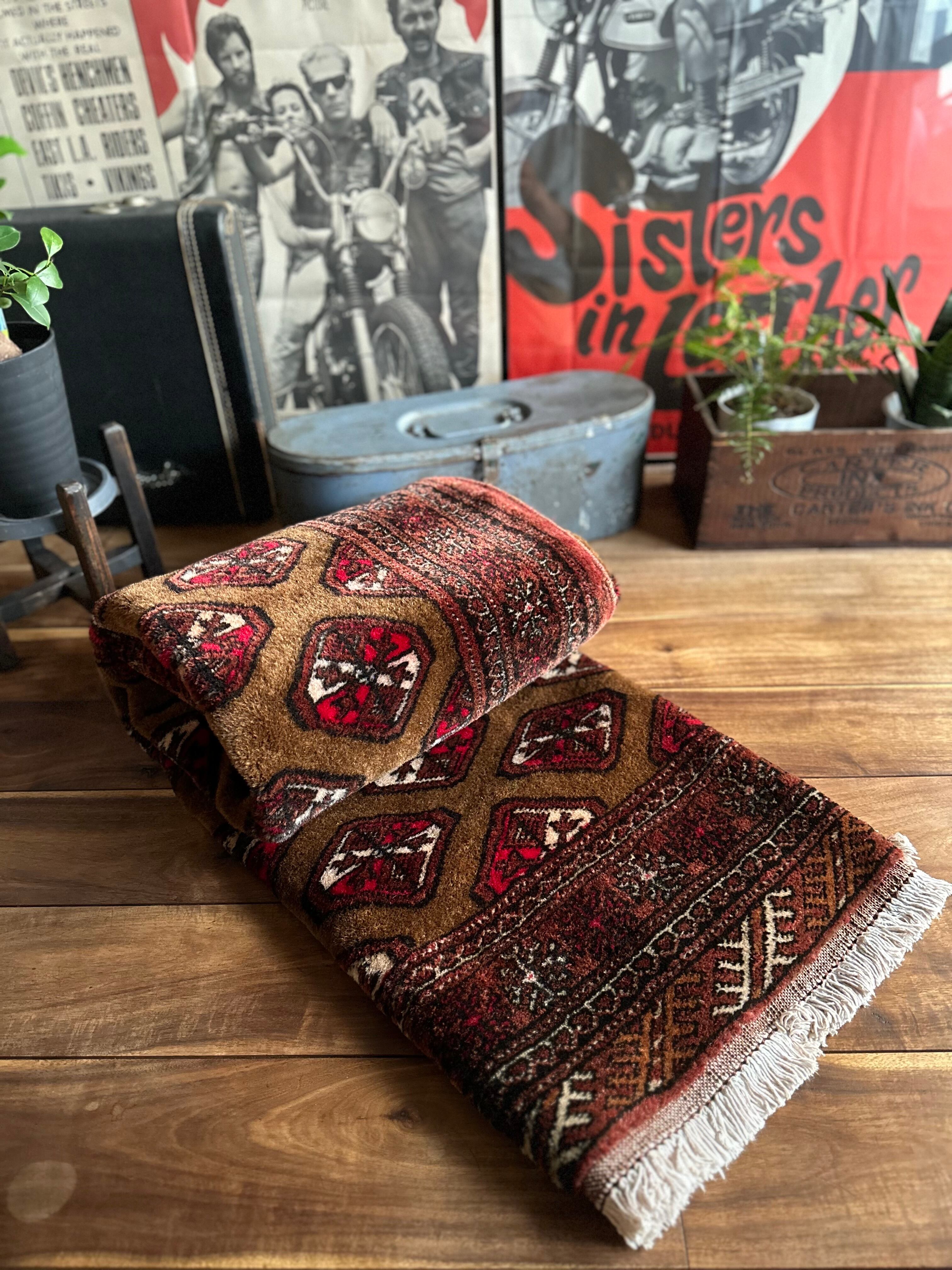 またラグそのものに関しては羊毛特有の匂いがあり手織りによる歪みや経年劣化、草木染めによる色ムラなどがありますが、それもまたトライバルラグの魅力かとご理解ください。