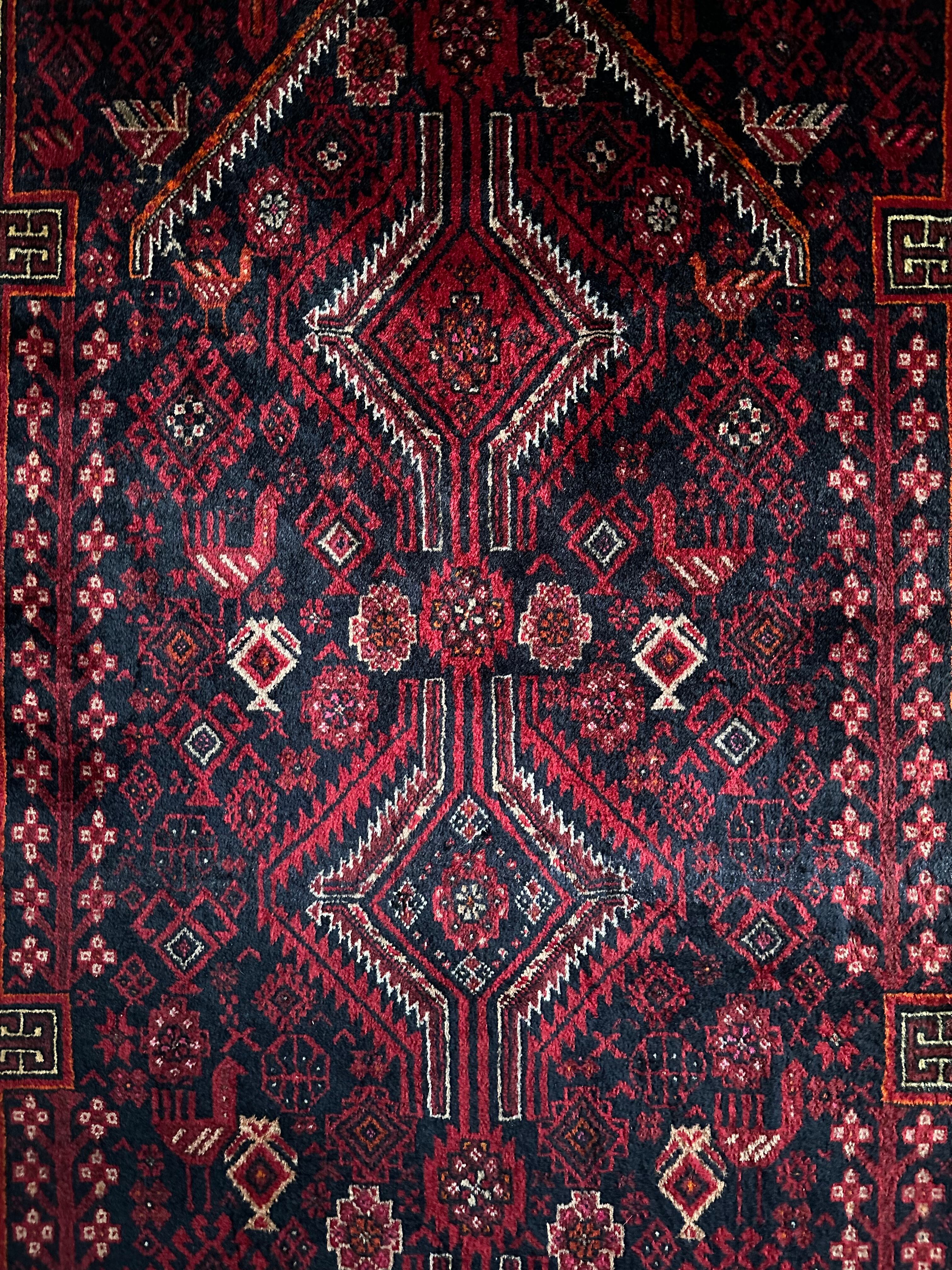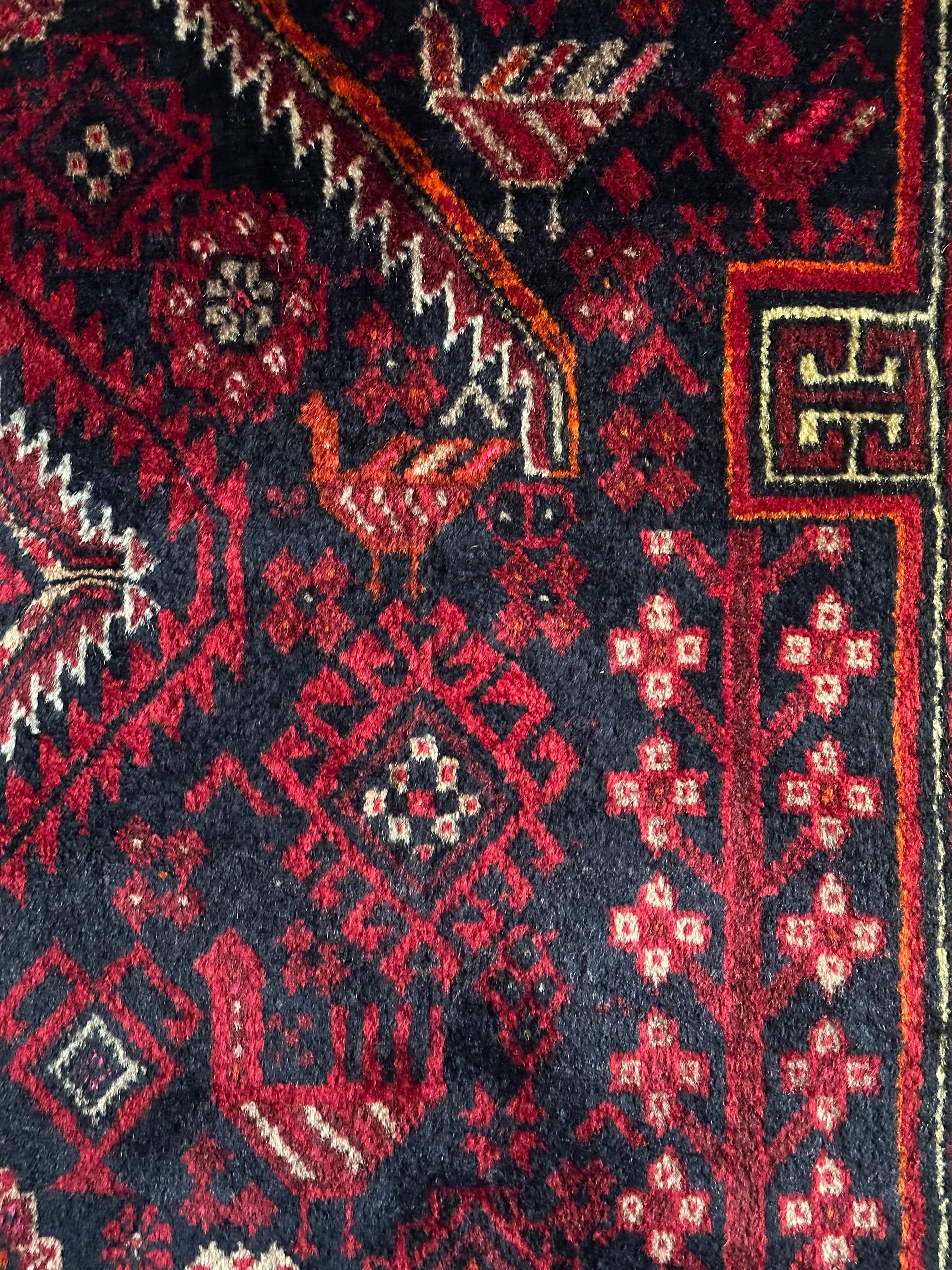 個人的にも大好きな白のラインが浮き出たカシミールデザインに、孔雀があちらこちらに散りばめられたバルーチ族のトライバルラグになります。