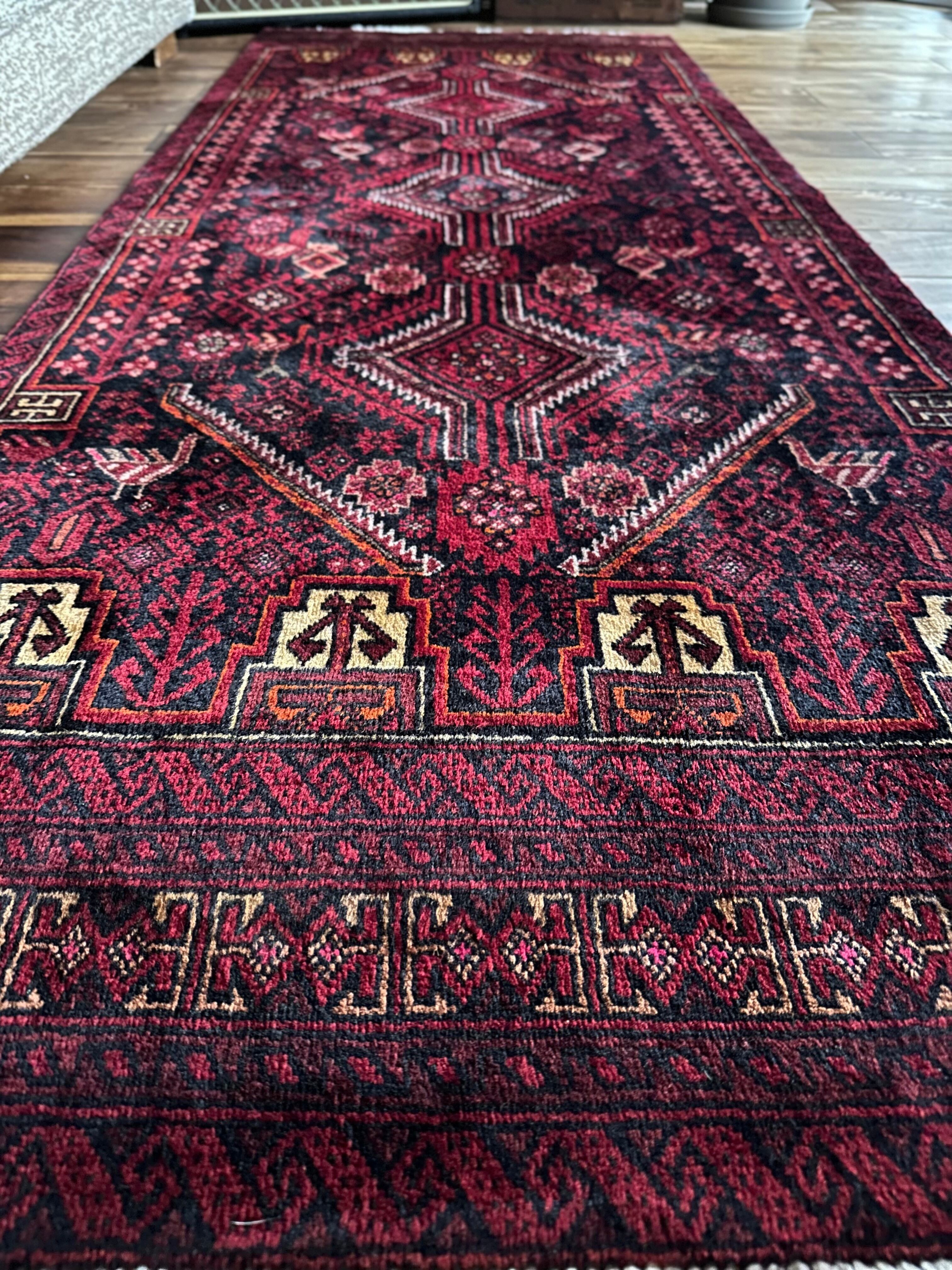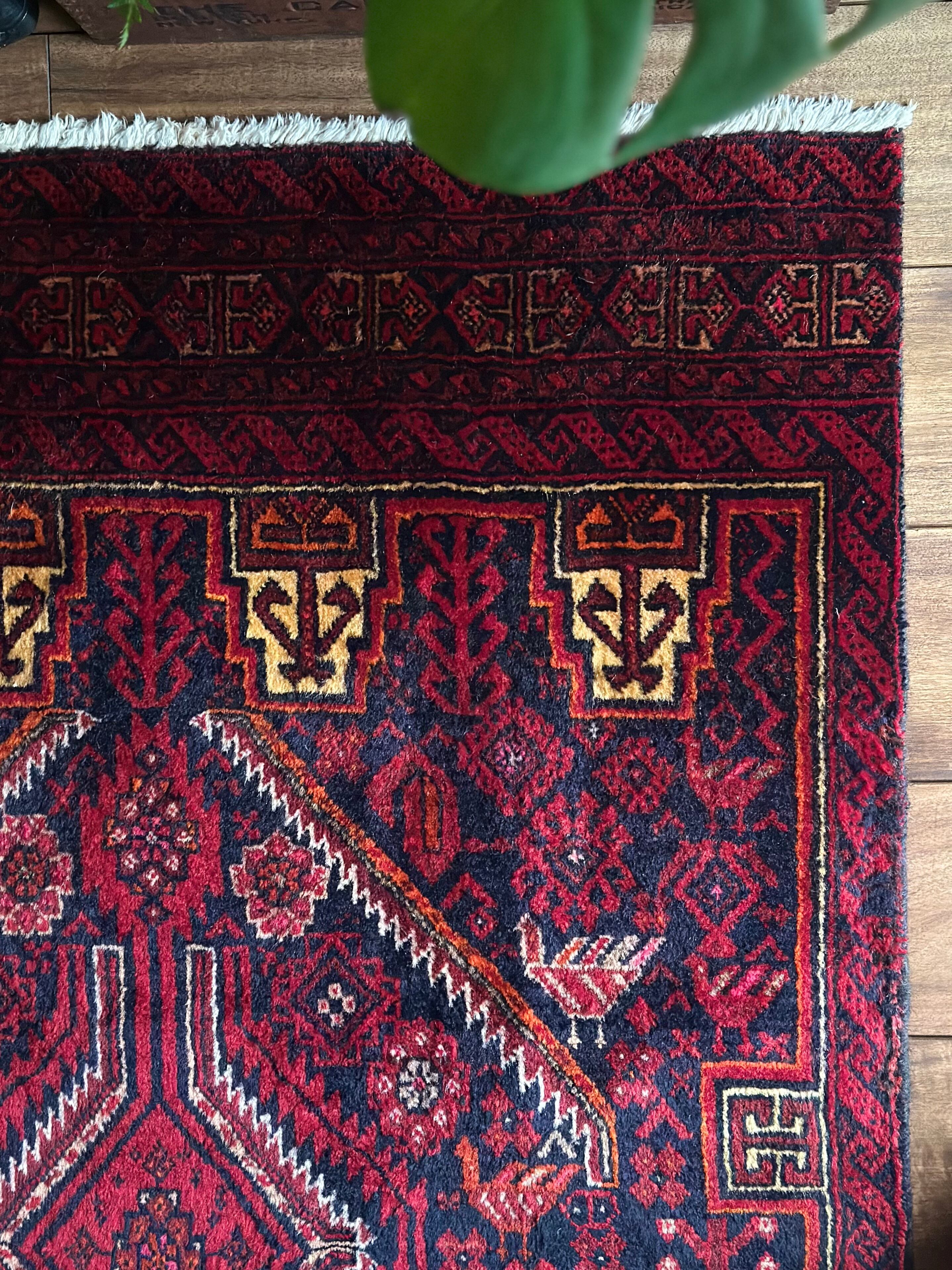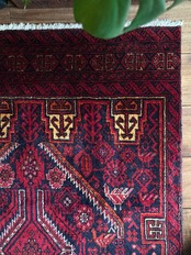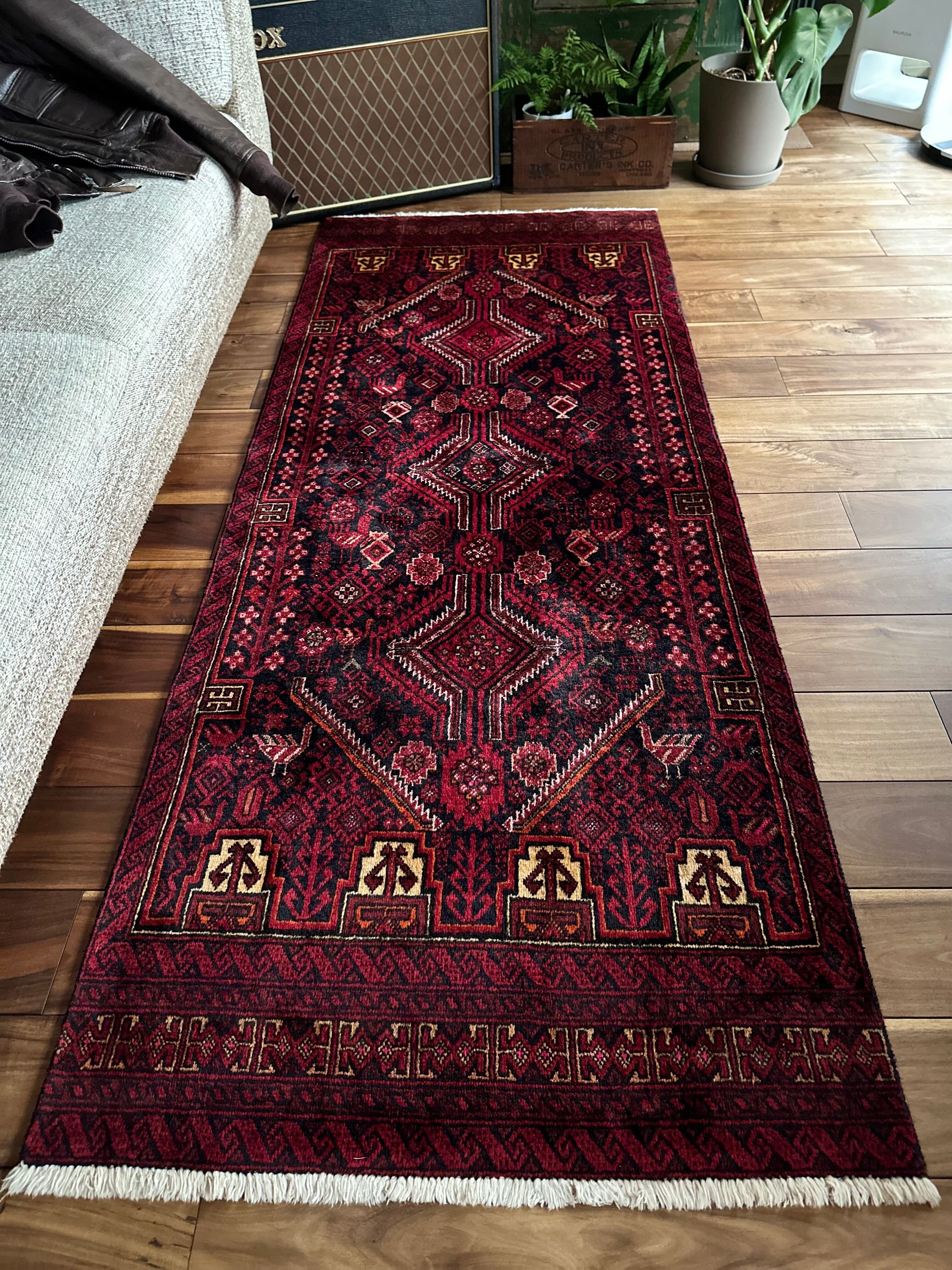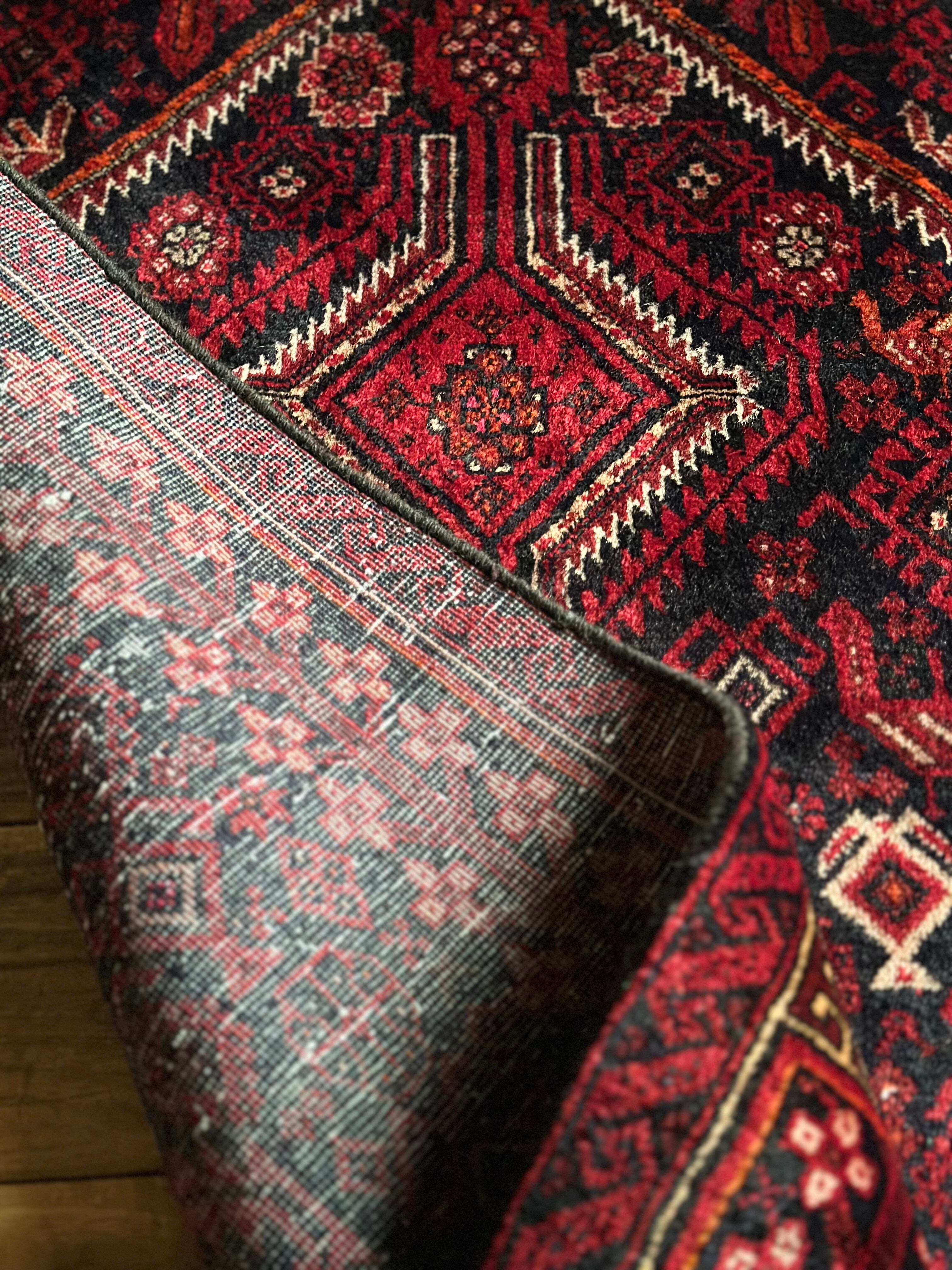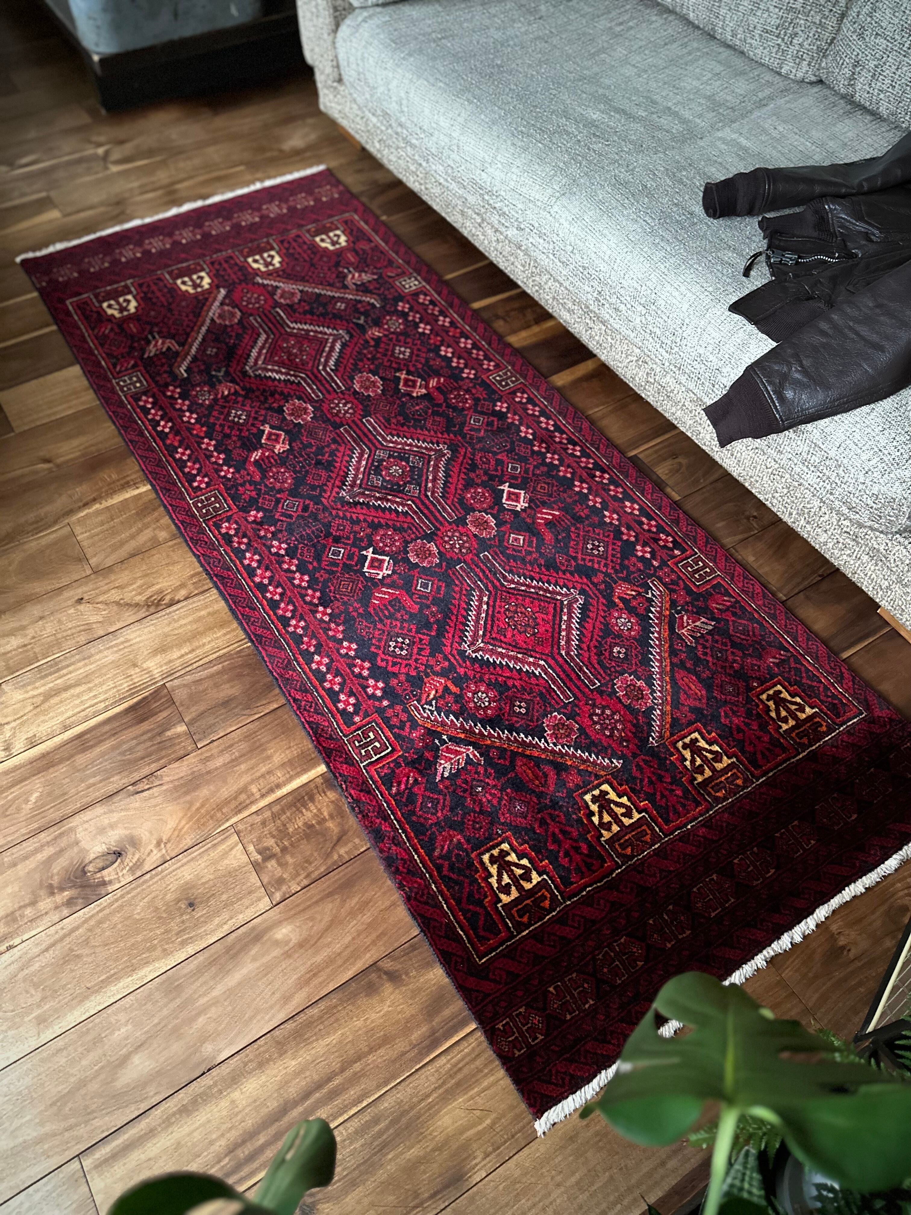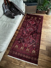 見た目にもカッコいい佇まいに凛々しさを感じますが、通常の幅よりも狭いバルーチでは珍しいランナーサイズで、日本の住宅では廊下やベッドサイドなど使い勝手の良いアクセントラグらしい1枚になります。