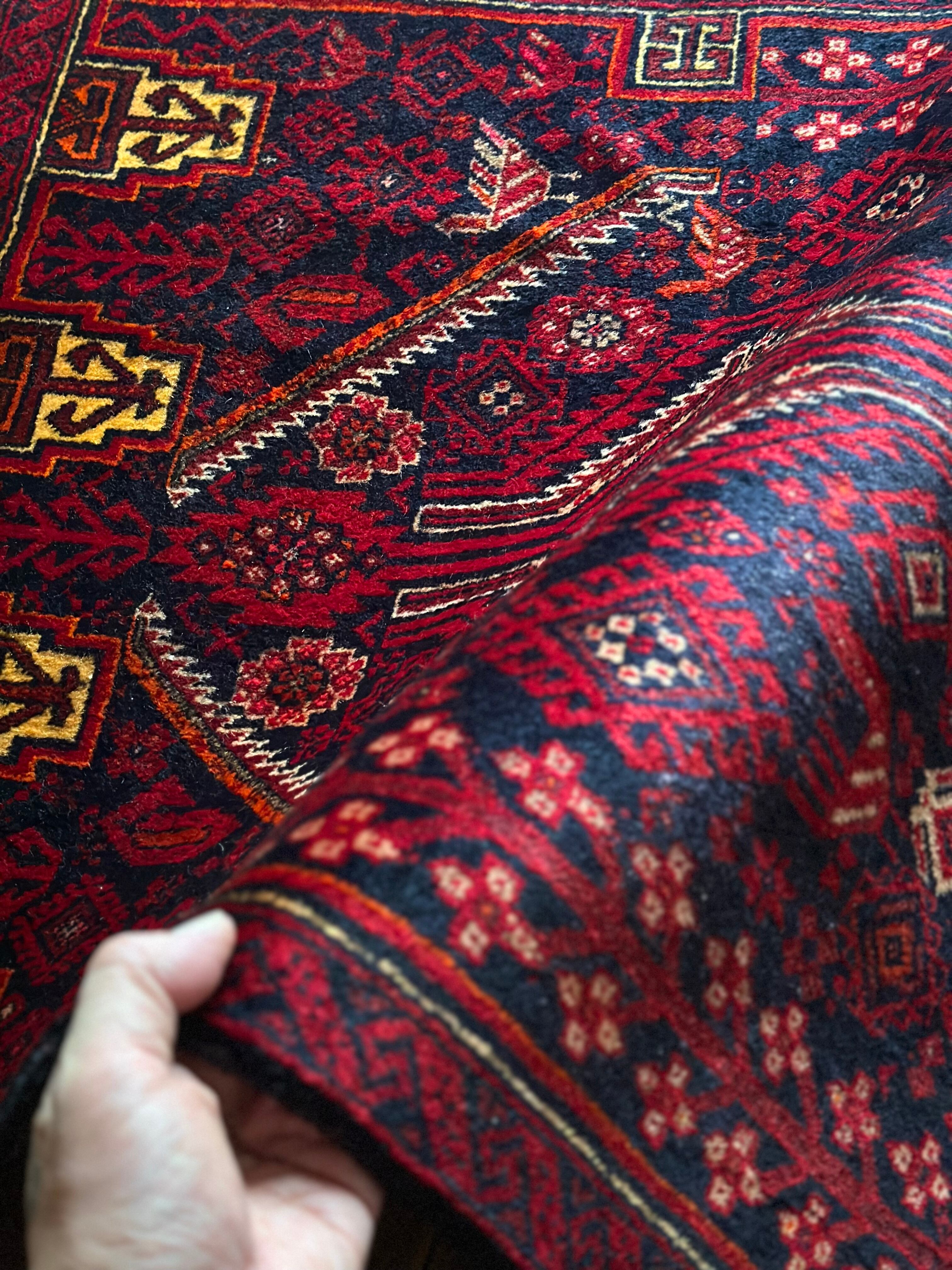 年代的には30年ほど前となりますがそれほど使い込まれた感じはなく、特に目立つようなリペアや汚れはありません。またパイル自体もバルーチらしい織りの密度で、毛足こそ長くはないですが油分を多く含んだしっとり感が堪りません。